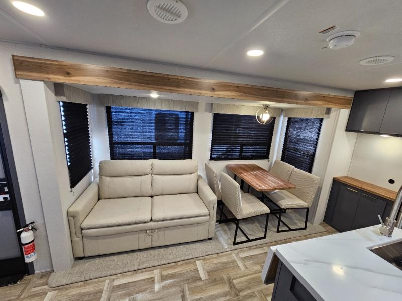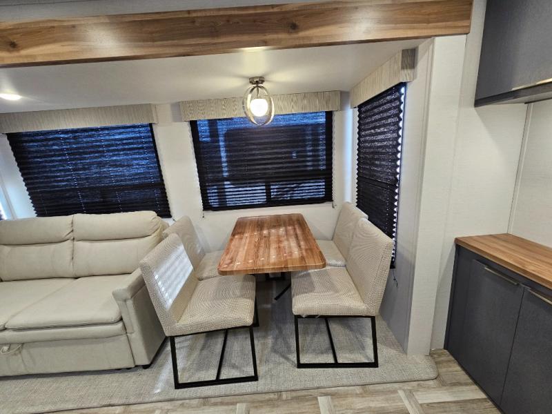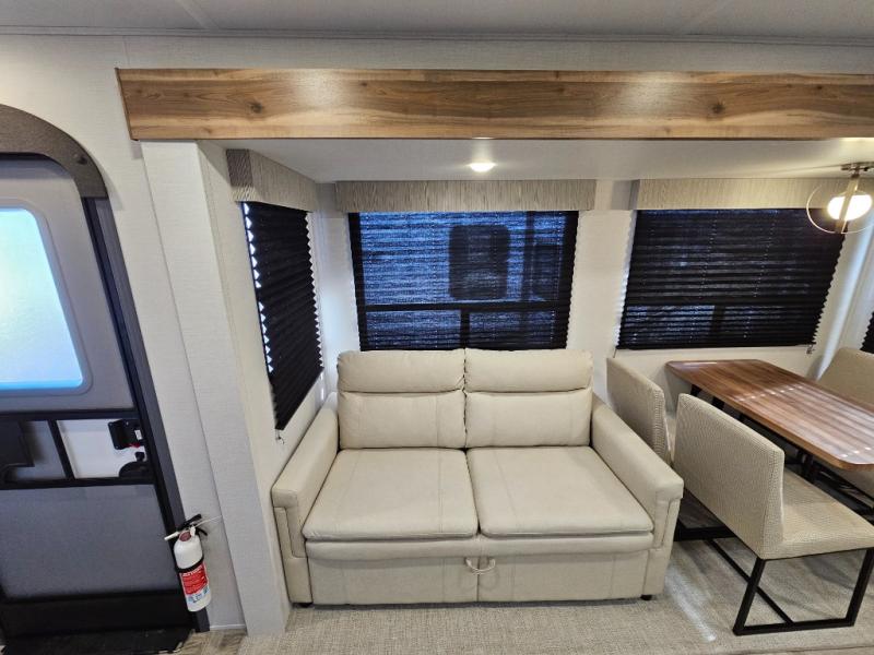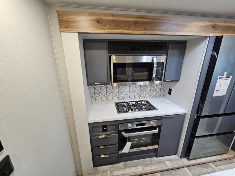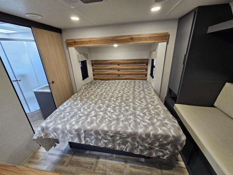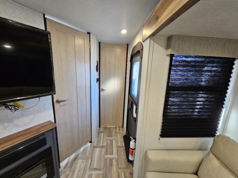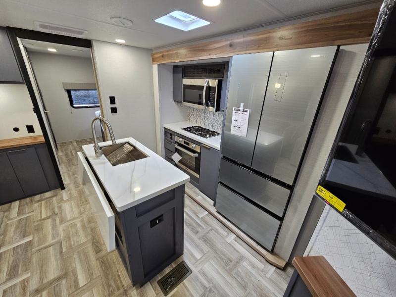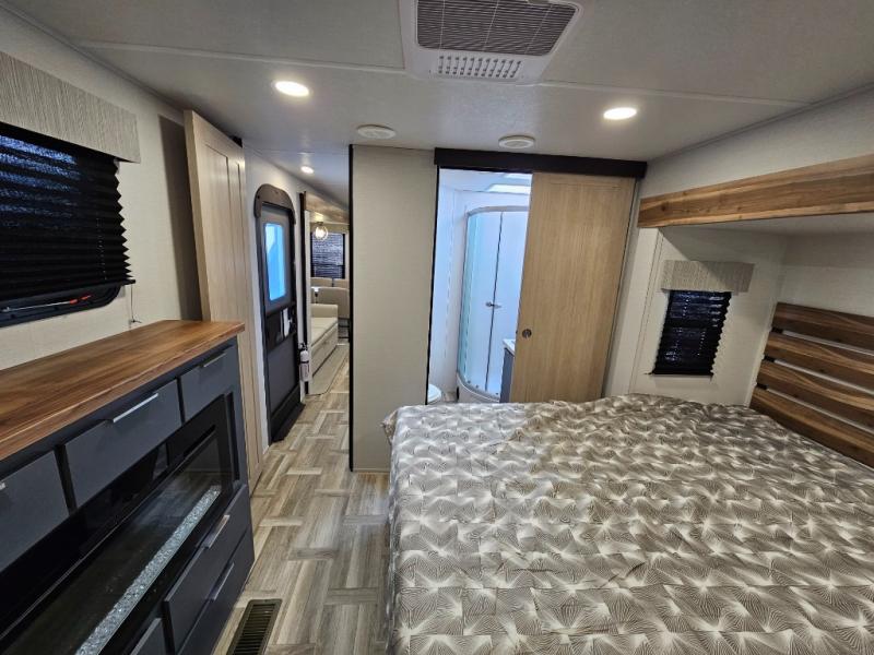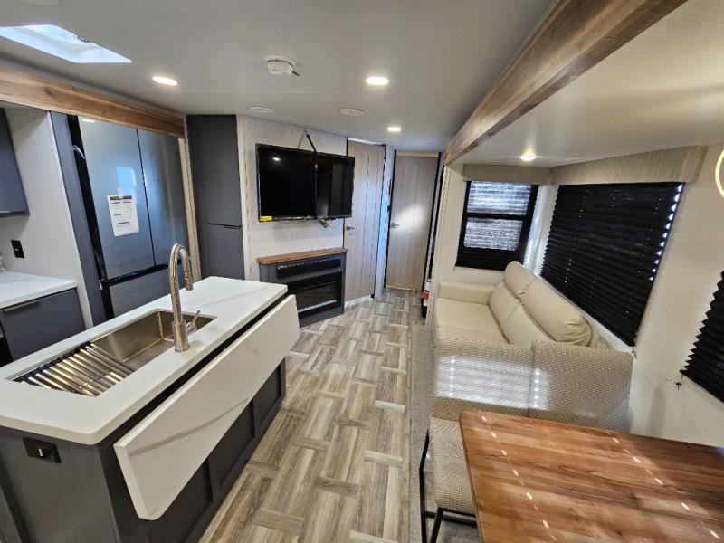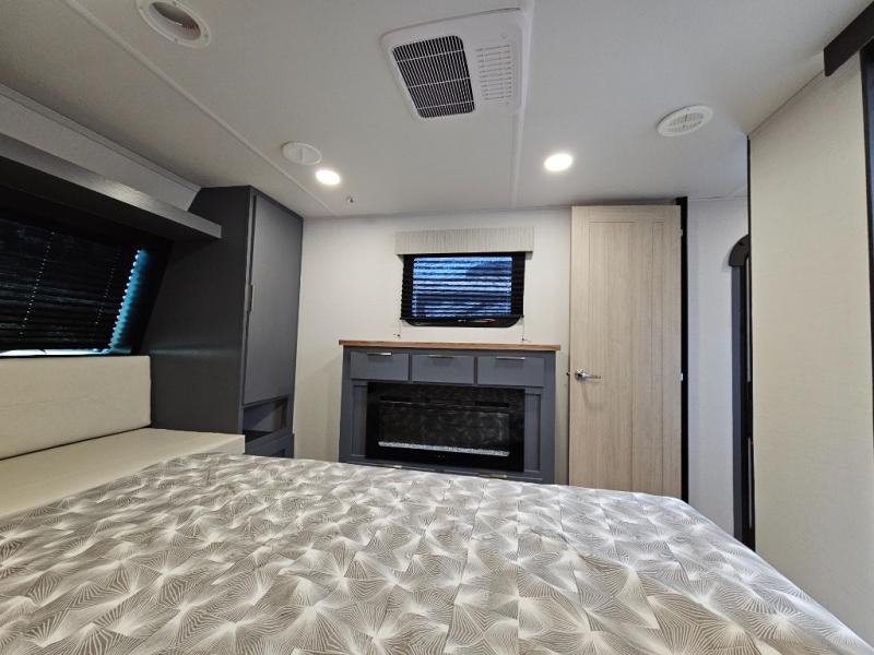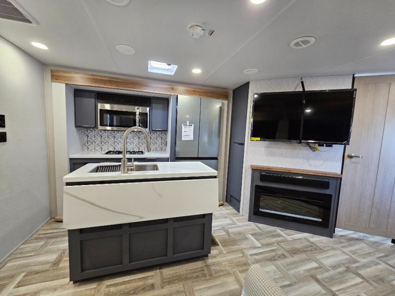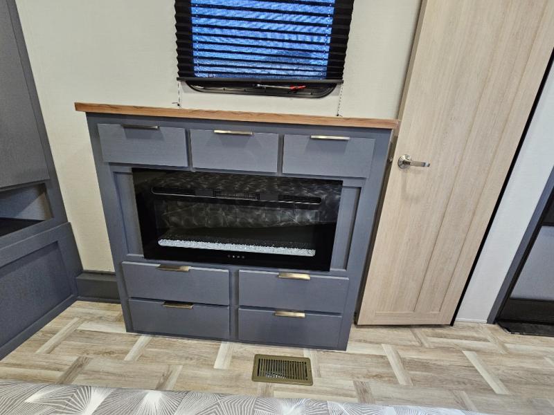 Privacy abounds in this travel trailer with a bedroom at each end! A king bed slide in the front has its own fireplace for cozy nights. Dual wardrobes frame the reading bench which looks out the front window for peaceful moments appreciating the view. At the rear, a second bedroom with queen bed has its own half bath. A pantry closet here also has prep for an optional washer/dryer for convenience on the road. In the center everyone can meet up in the spacious kitchen/living room. A hide-a-bed sofa has even more sleeping space, or relax there and watch the TV which is in the entertainment center along with another fireplace. The kitchen is well-equipped with a three-burner cooktop, microwave, and even an island where the sink is located for easy meal prep. Outside there are not one but two 10' power awnings for extra protection from the elements!