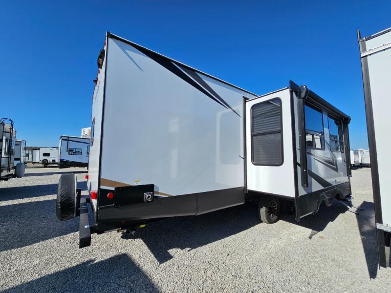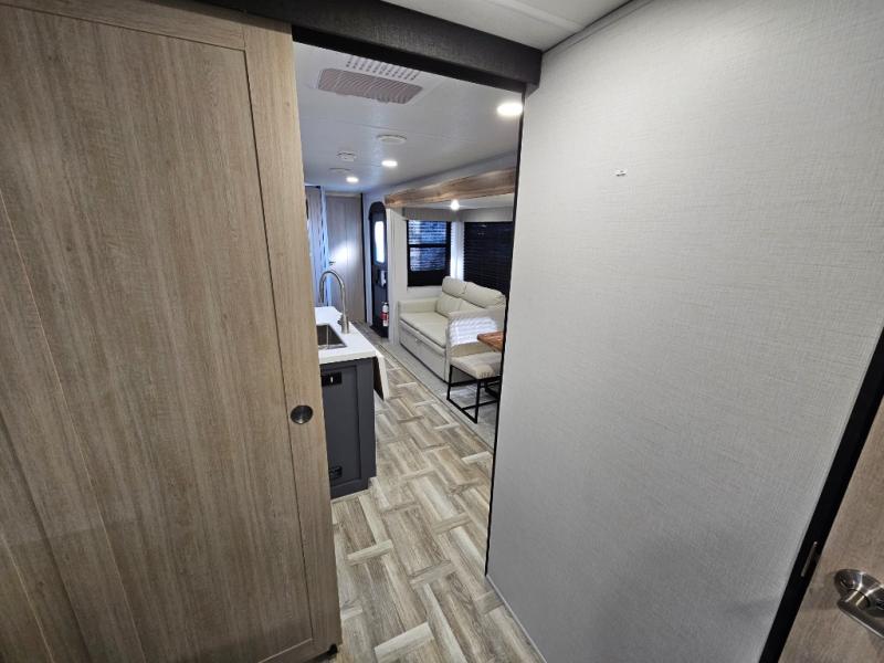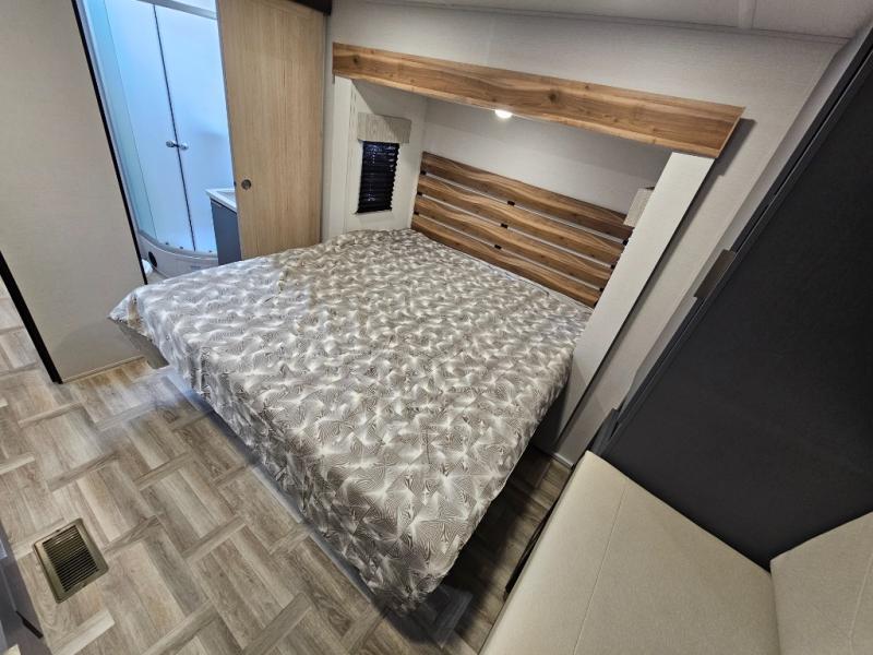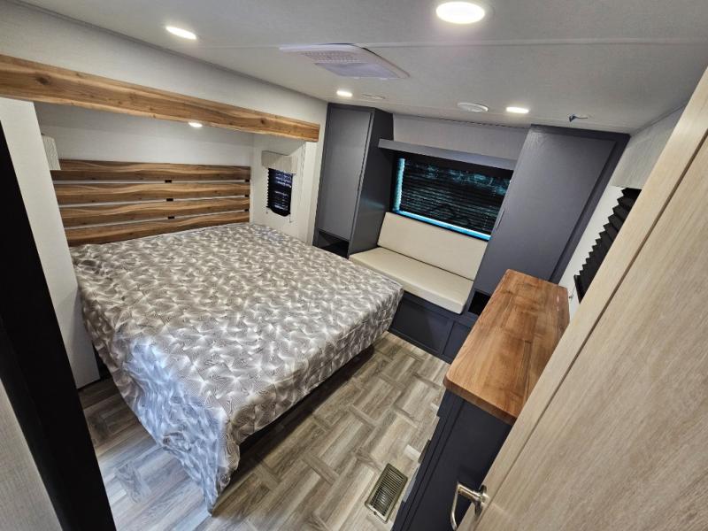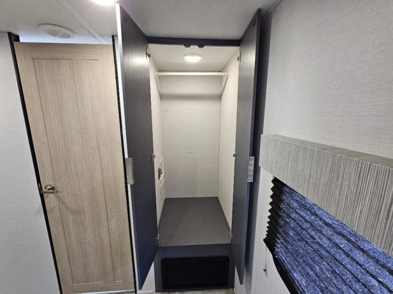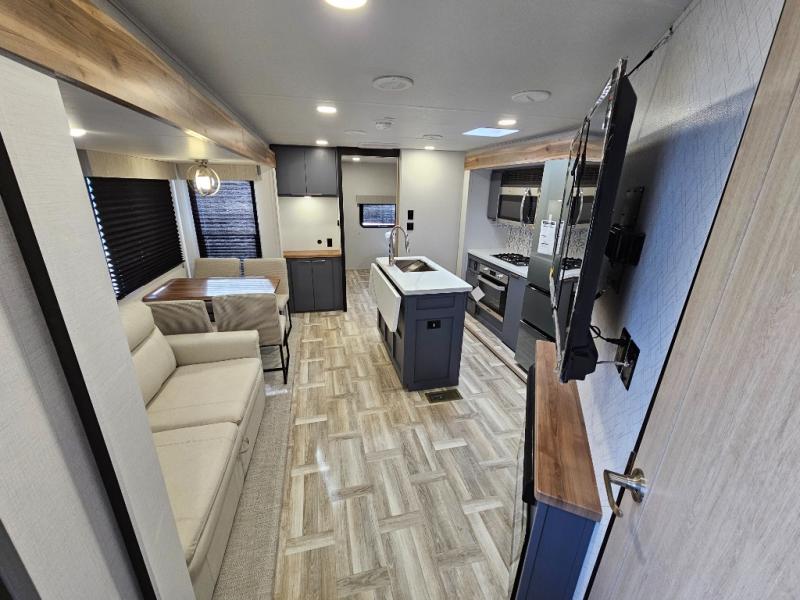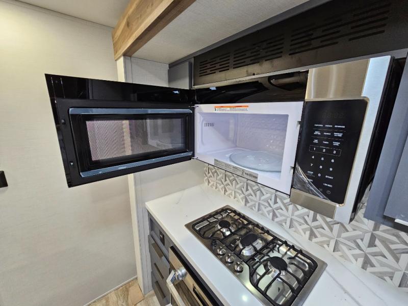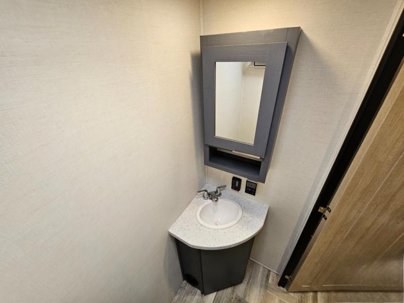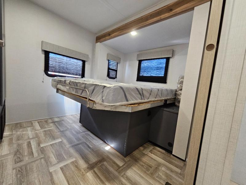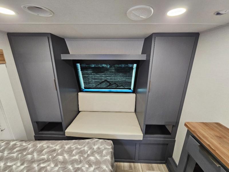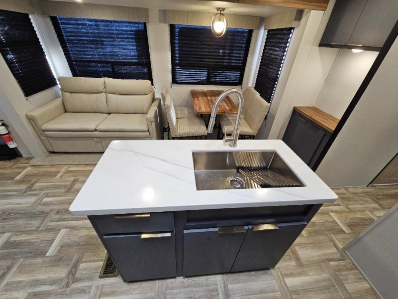 Privacy abounds in this travel trailer with a bedroom at each end! A king bed slide in the front has its own fireplace for cozy nights. Dual wardrobes frame the reading bench which looks out the front window for peaceful moments appreciating the view. At the rear, a second bedroom with queen bed has its own half bath. A pantry closet here also has prep for an optional washer/dryer for convenience on the road. In the center everyone can meet up in the spacious kitchen/living room. A hide-a-bed sofa has even more sleeping space, or relax there and watch the TV which is in the entertainment center along with another fireplace. The kitchen is well-equipped with a three-burner cooktop, microwave, and even an island where the sink is located for easy meal prep. Outside there are not one but two 10' power awnings for extra protection from the elements!