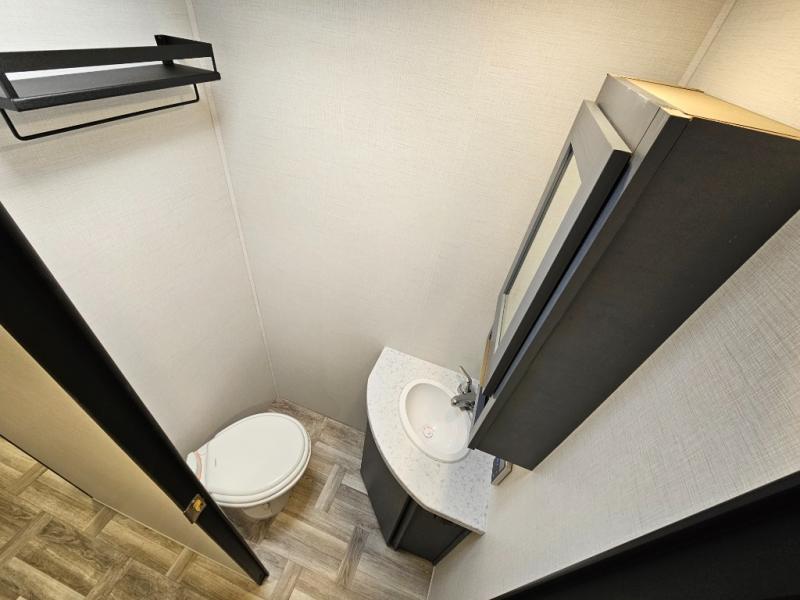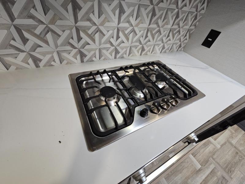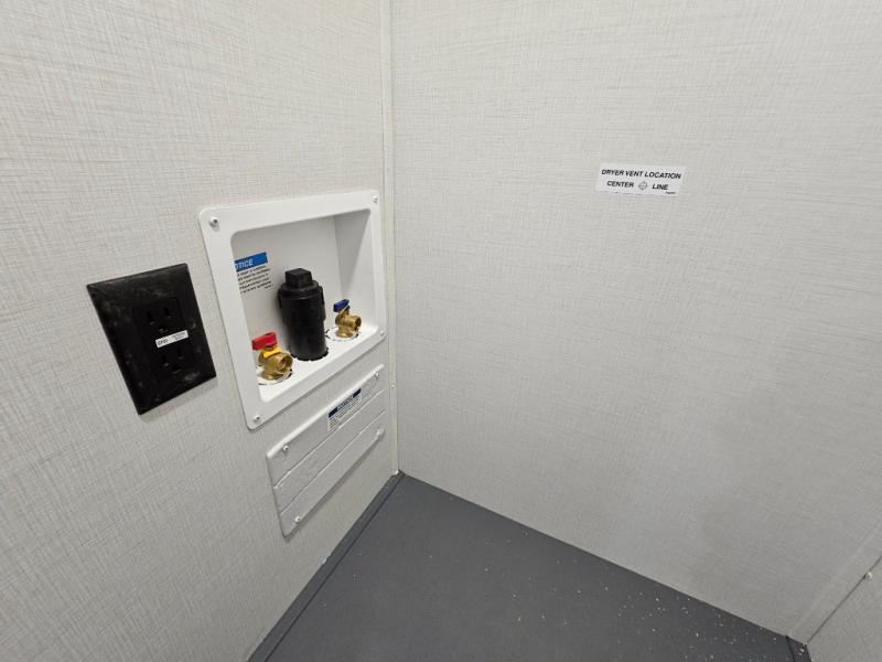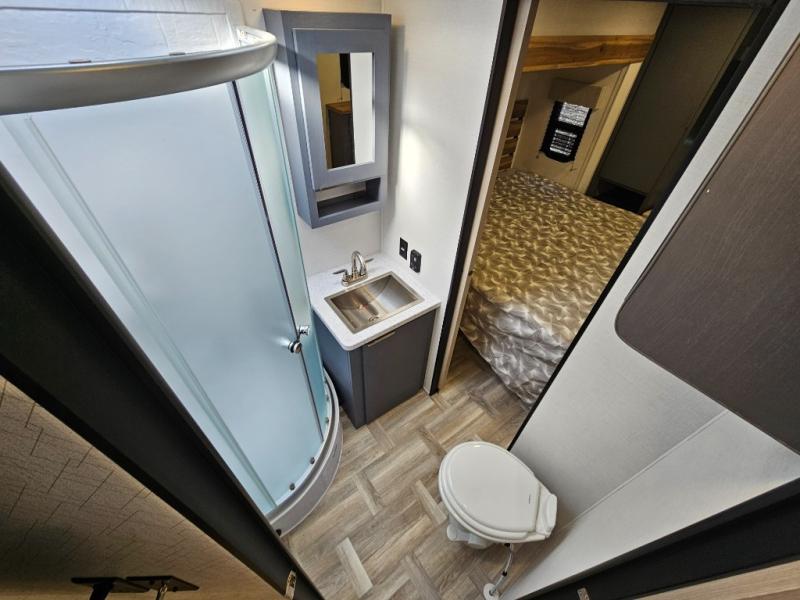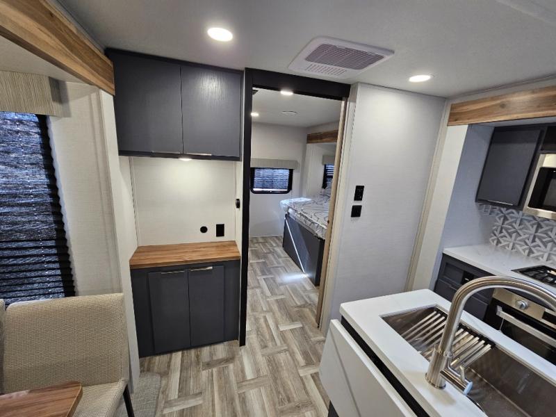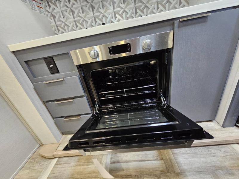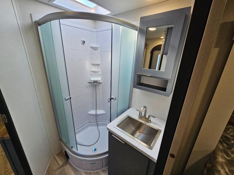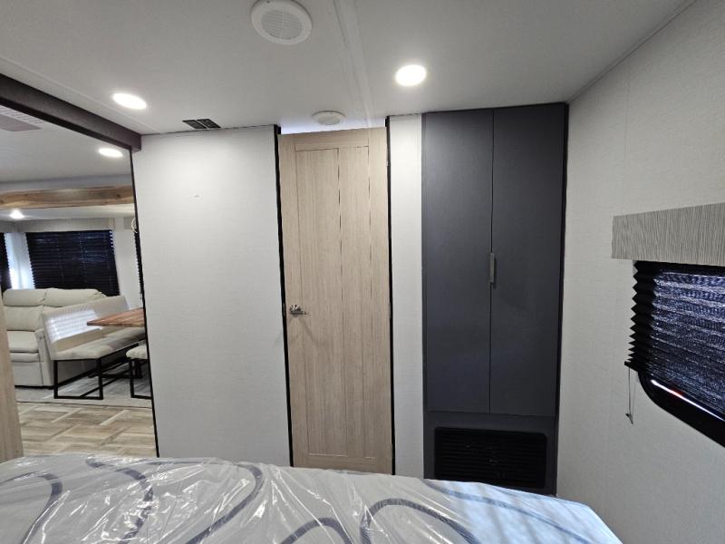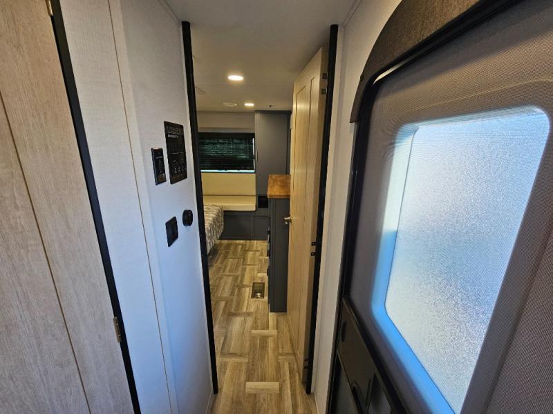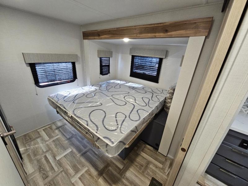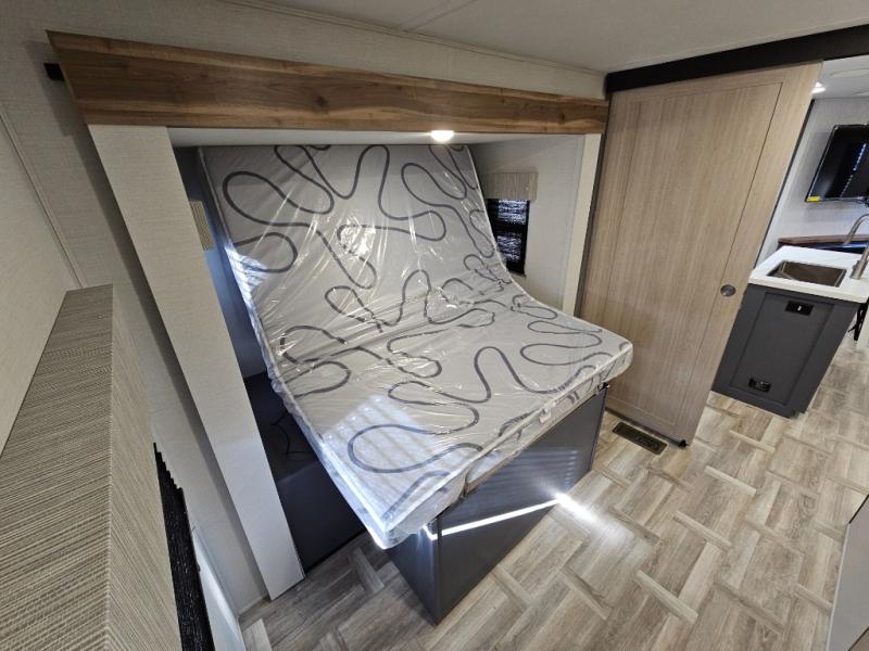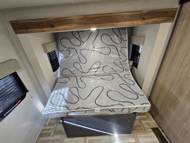 Privacy abounds in this travel trailer with a bedroom at each end! A king bed slide in the front has its own fireplace for cozy nights. Dual wardrobes frame the reading bench which looks out the front window for peaceful moments appreciating the view. At the rear, a second bedroom with queen bed has its own half bath. A pantry closet here also has prep for an optional washer/dryer for convenience on the road. In the center everyone can meet up in the spacious kitchen/living room. A hide-a-bed sofa has even more sleeping space, or relax there and watch the TV which is in the entertainment center along with another fireplace. The kitchen is well-equipped with a three-burner cooktop, microwave, and even an island where the sink is located for easy meal prep. Outside there are not one but two 10' power awnings for extra protection from the elements!