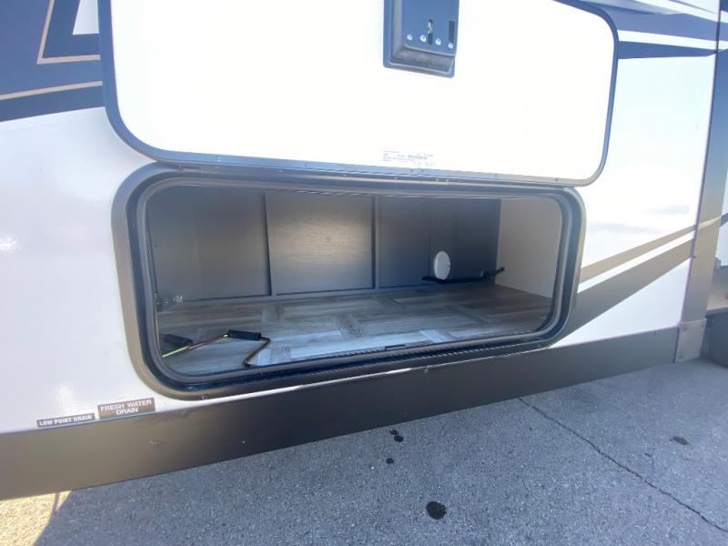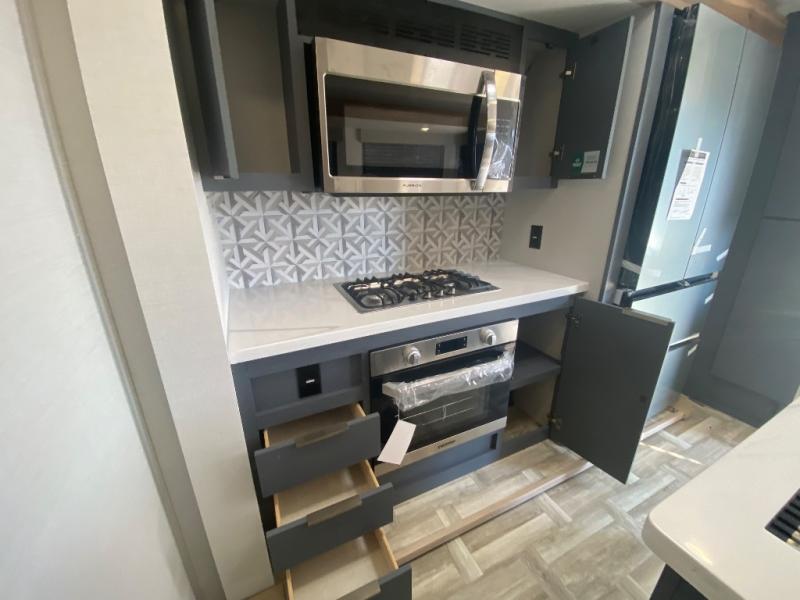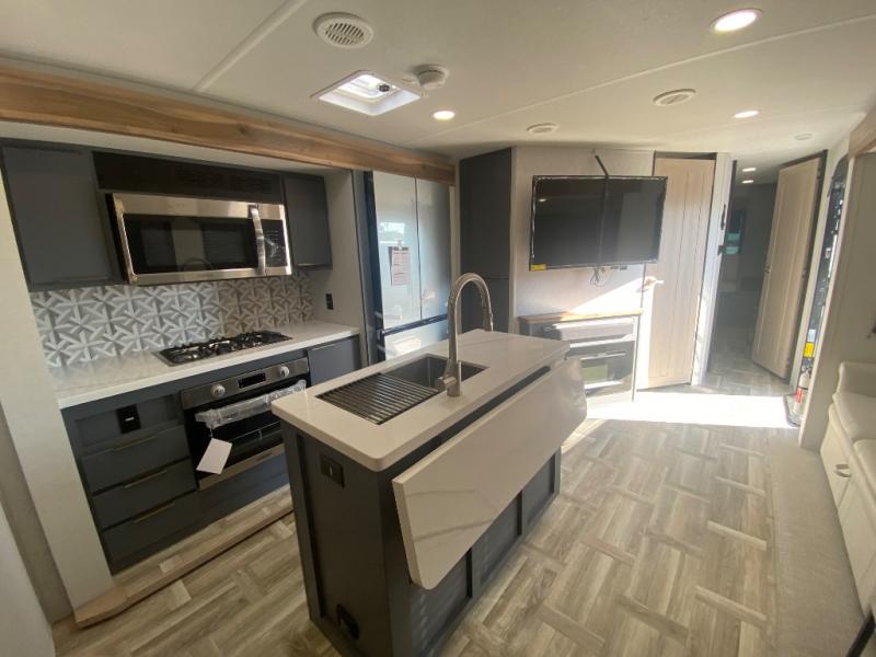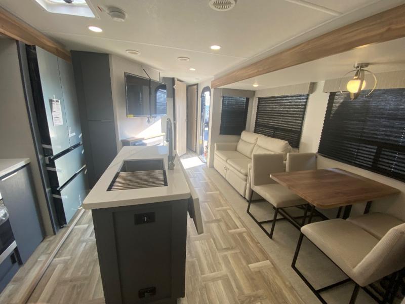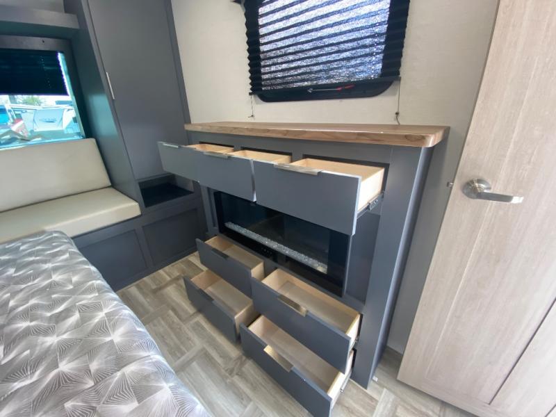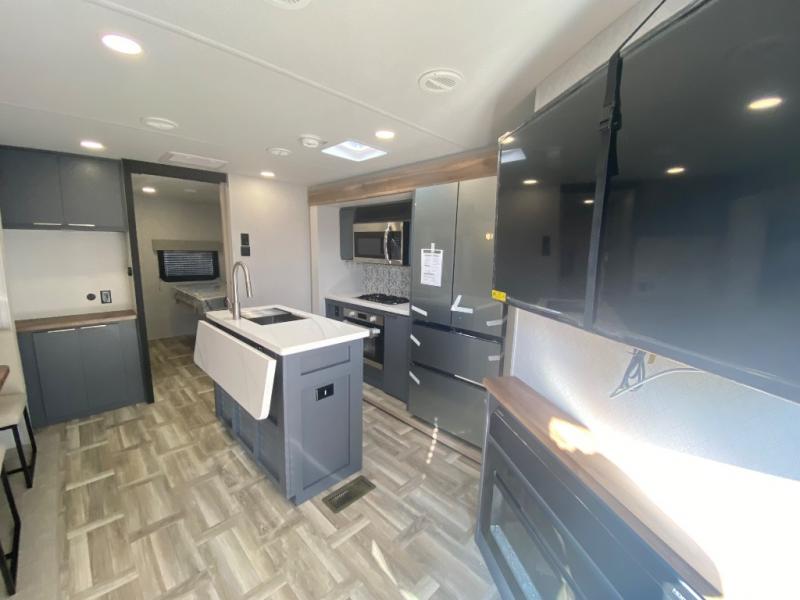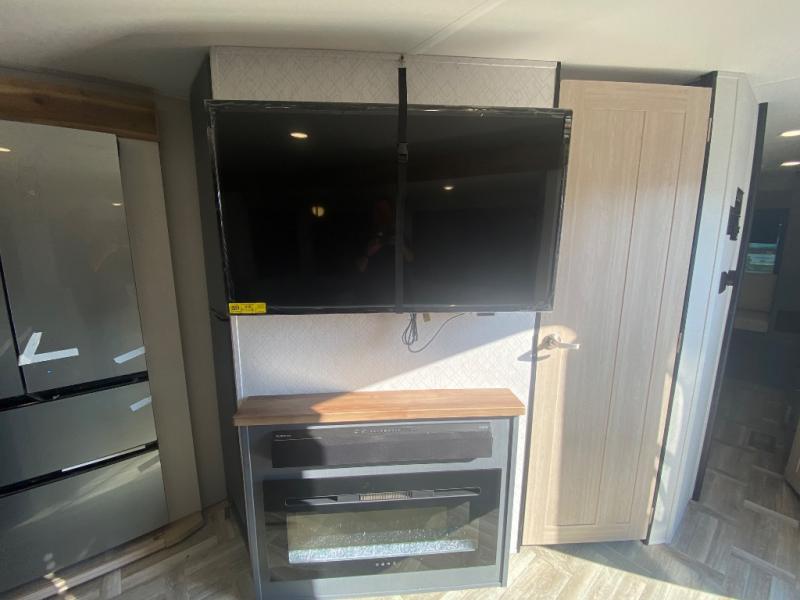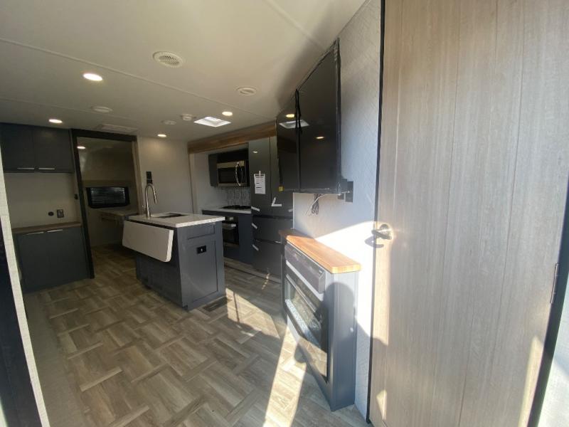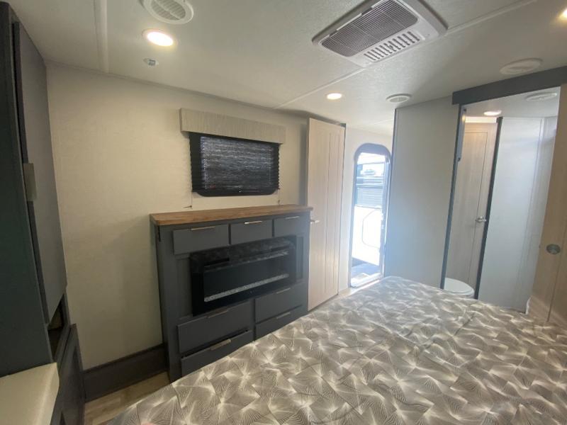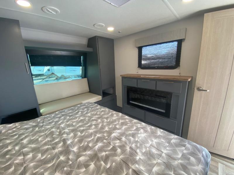 Privacy abounds in this travel trailer with a bedroom at each end! A king bed slide in the front has its own fireplace for cozy nights. Dual wardrobes frame the reading bench which looks out the front window for peaceful moments appreciating the view. At the rear, a second bedroom with queen bed has its own half bath. A pantry closet here also has prep for an optional washer/dryer for convenience on the road. In the center everyone can meet up in the spacious kitchen/living room. A hide-a-bed sofa has even more sleeping space, or relax there and watch the TV which is in the entertainment center along with another fireplace. The kitchen is well-equipped with a three-burner cooktop, microwave, and even an island where the sink is located for easy meal prep. Outside there are not one but two 10' power awnings for extra protection from the elements!