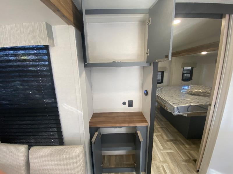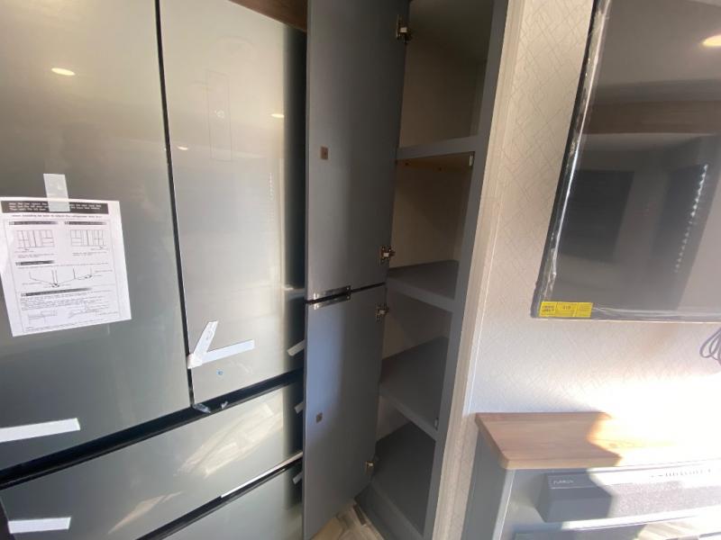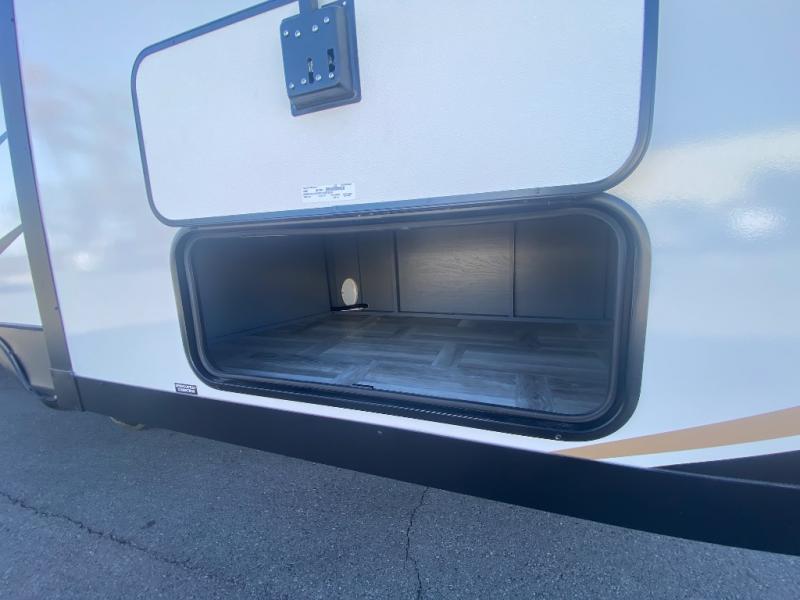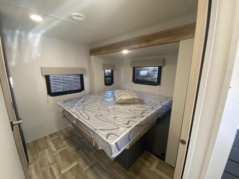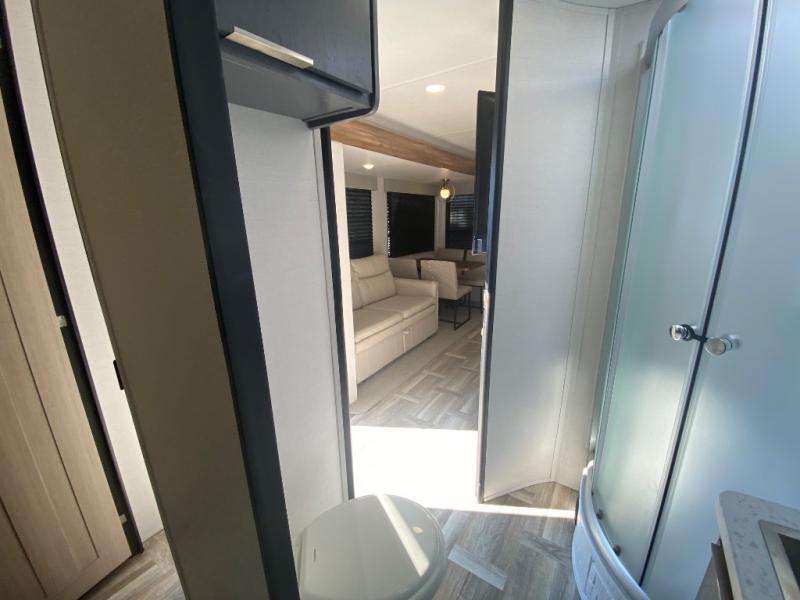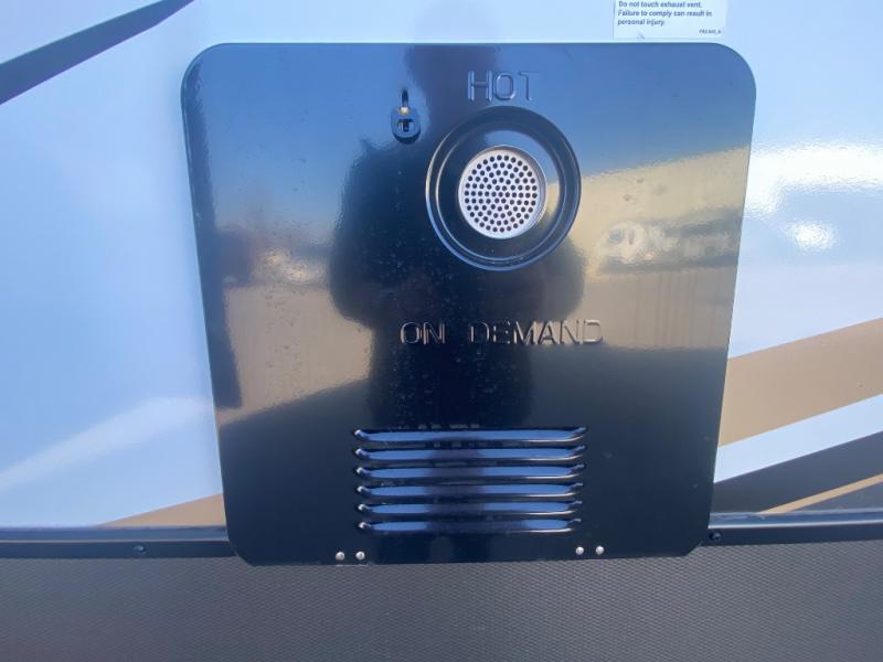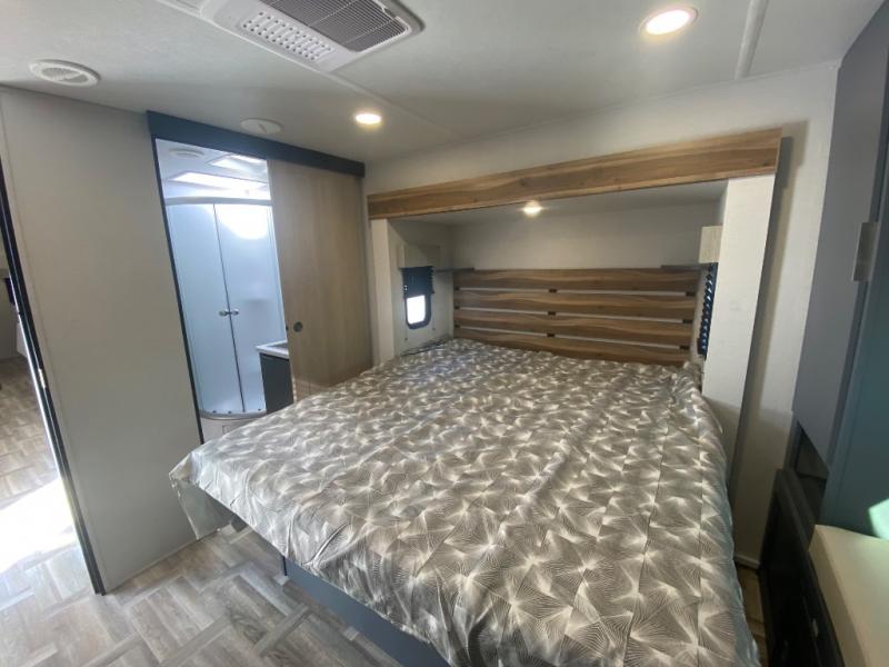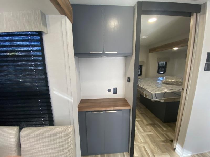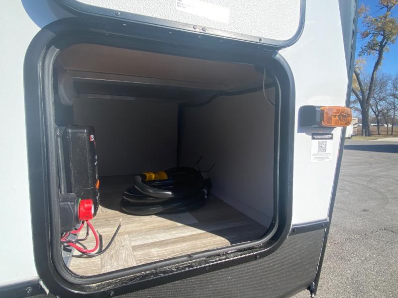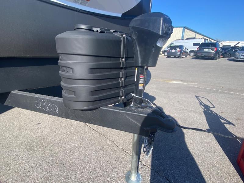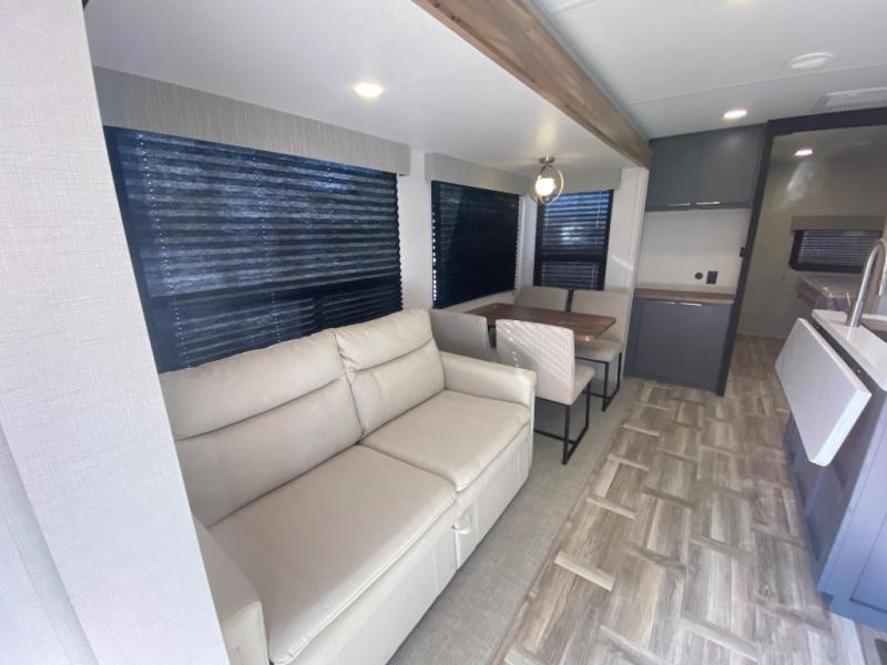 Privacy abounds in this travel trailer with a bedroom at each end! A king bed slide in the front has its own fireplace for cozy nights. Dual wardrobes frame the reading bench which looks out the front window for peaceful moments appreciating the view. At the rear, a second bedroom with queen bed has its own half bath. A pantry closet here also has prep for an optional washer/dryer for convenience on the road. In the center everyone can meet up in the spacious kitchen/living room. A hide-a-bed sofa has even more sleeping space, or relax there and watch the TV which is in the entertainment center along with another fireplace. The kitchen is well-equipped with a three-burner cooktop, microwave, and even an island where the sink is located for easy meal prep. Outside there are not one but two 10' power awnings for extra protection from the elements!