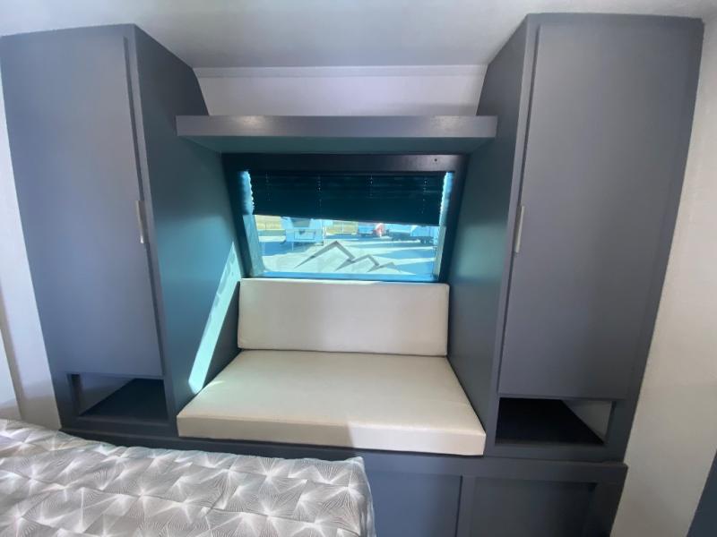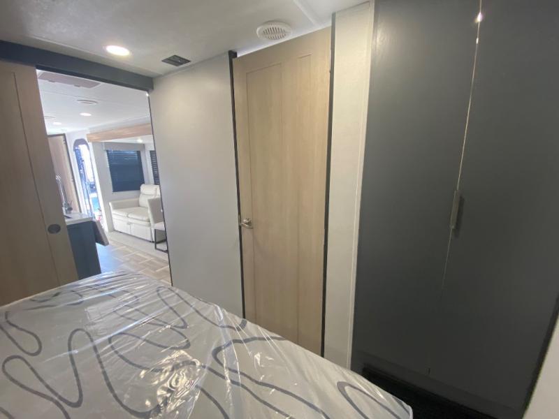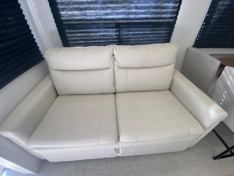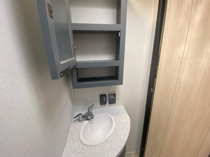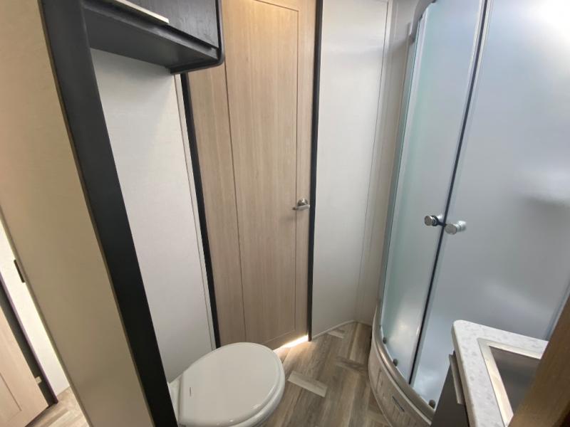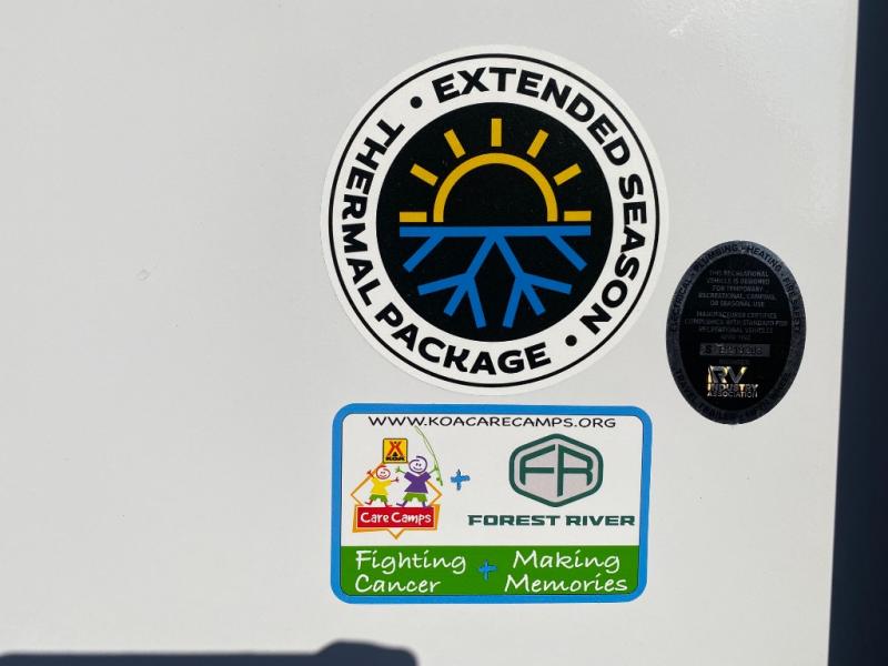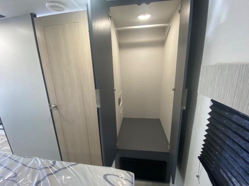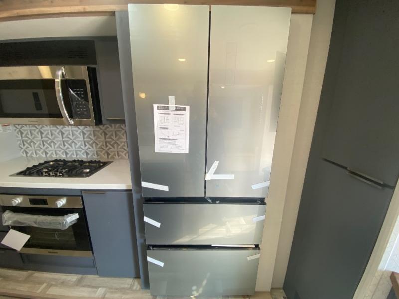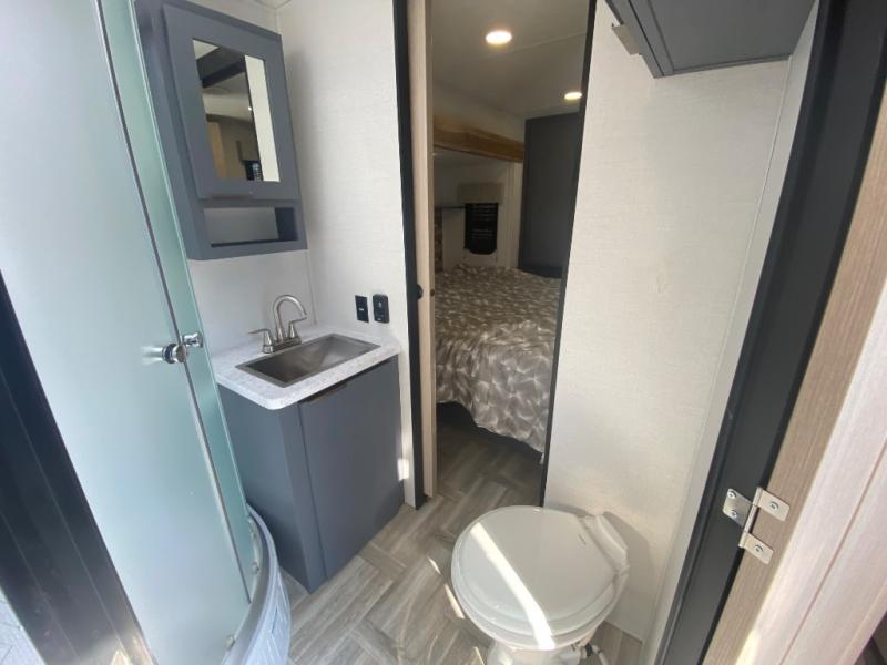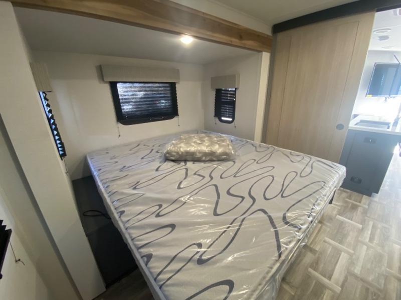 Privacy abounds in this travel trailer with a bedroom at each end! A king bed slide in the front has its own fireplace for cozy nights. Dual wardrobes frame the reading bench which looks out the front window for peaceful moments appreciating the view. At the rear, a second bedroom with queen bed has its own half bath. A pantry closet here also has prep for an optional washer/dryer for convenience on the road. In the center everyone can meet up in the spacious kitchen/living room. A hide-a-bed sofa has even more sleeping space, or relax there and watch the TV which is in the entertainment center along with another fireplace. The kitchen is well-equipped with a three-burner cooktop, microwave, and even an island where the sink is located for easy meal prep. Outside there are not one but two 10' power awnings for extra protection from the elements!