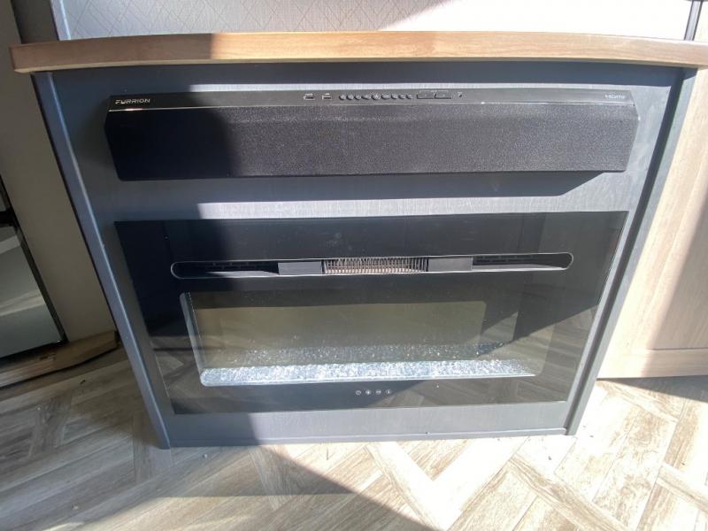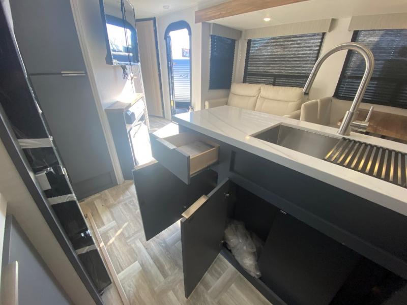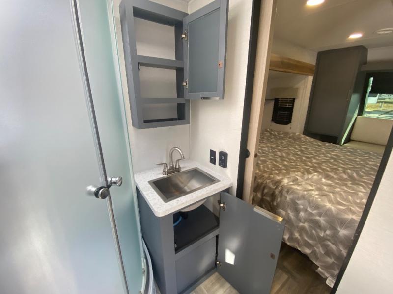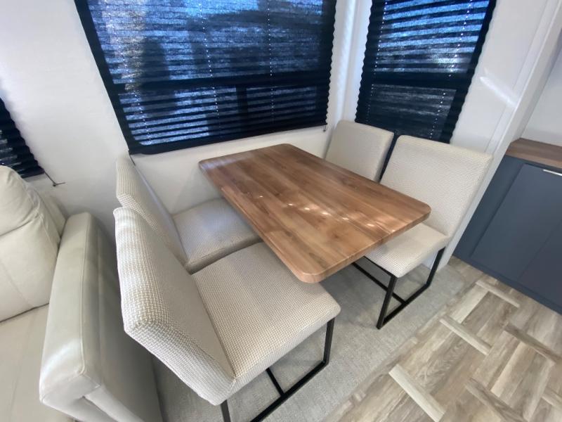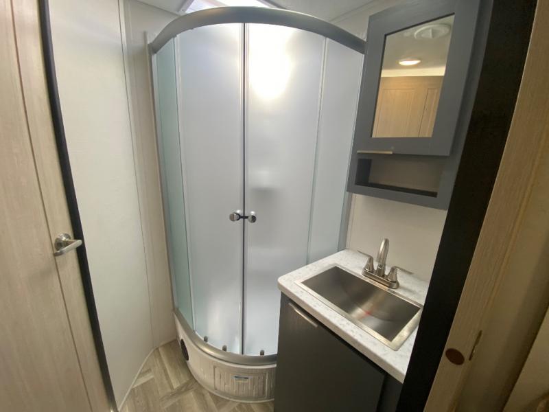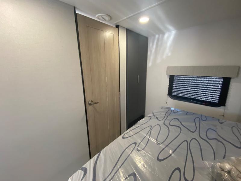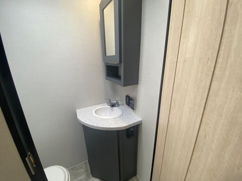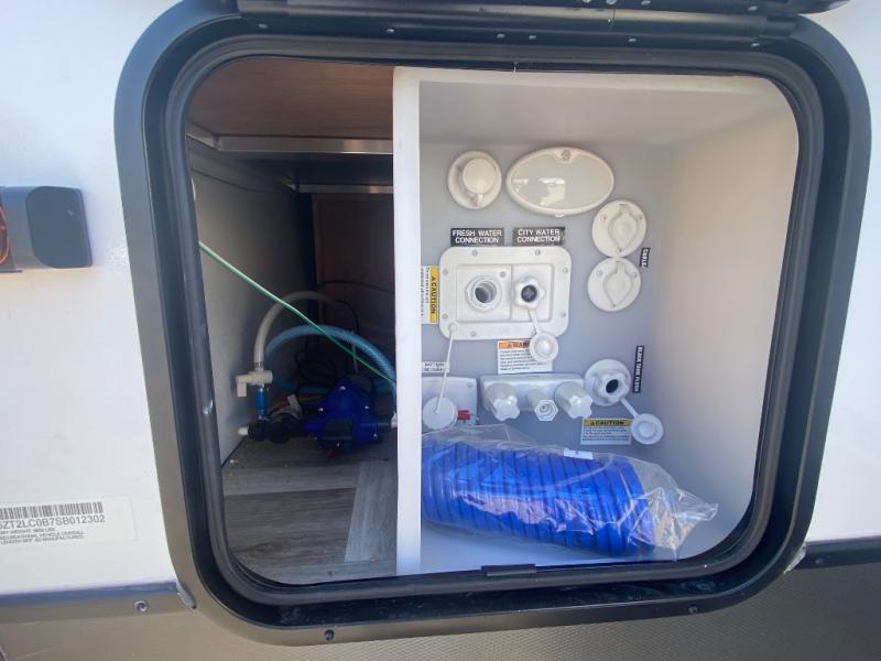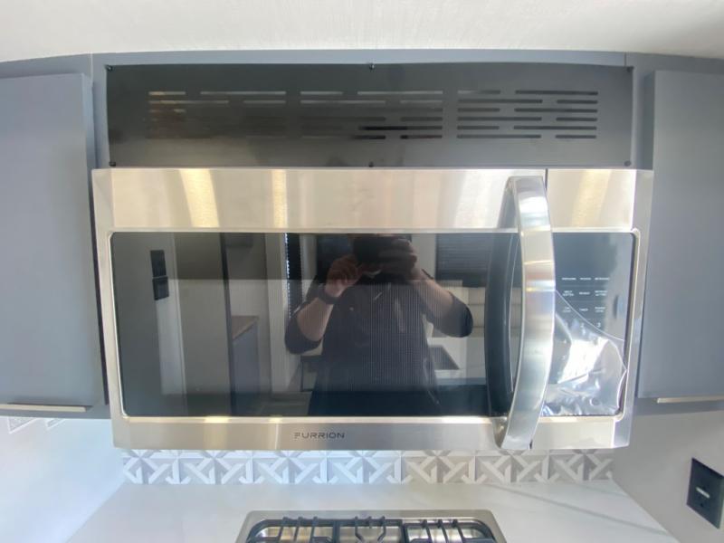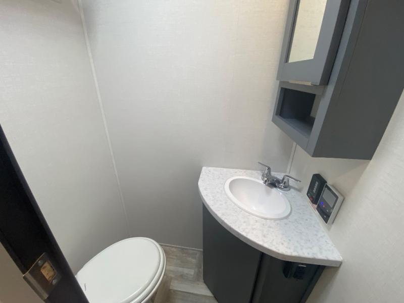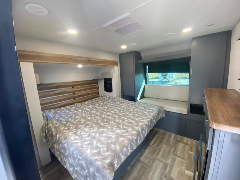Privacy abounds in this travel trailer with a bedroom at each end! A king bed slide in the front has its own fireplace for cozy nights. Dual wardrobes frame the reading bench which looks out the front window for peaceful moments appreciating the view. At the rear, a second bedroom with queen bed has its own half bath. A pantry closet here also has prep for an optional washer/dryer for convenience on the road. In the center everyone can meet up in the spacious kitchen/living room. A hide-a-bed sofa has even more sleeping space, or relax there and watch the TV which is in the entertainment center along with another fireplace. The kitchen is well-equipped with a three-burner cooktop, microwave, and even an island where the sink is located for easy meal prep. Outside there are not one but two 10' power awnings for extra protection from the elements!