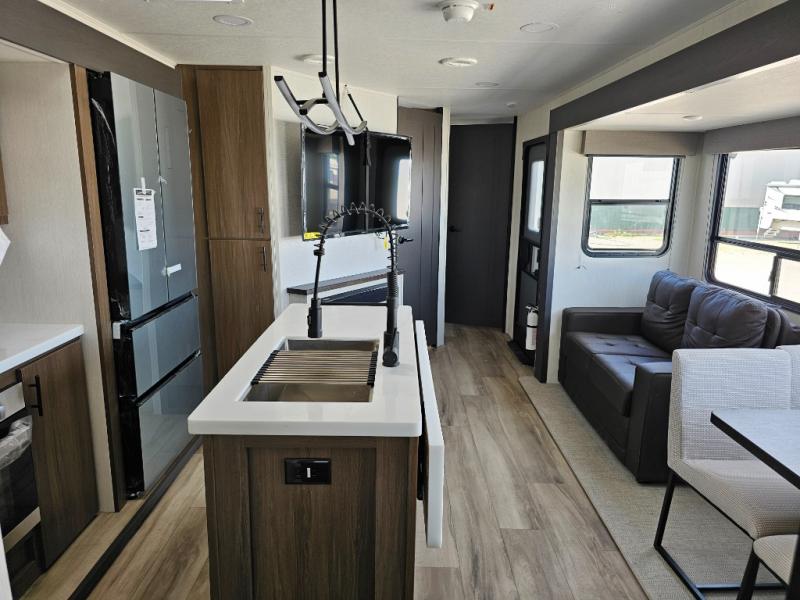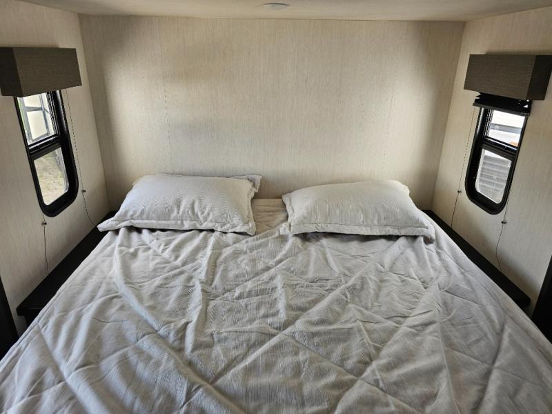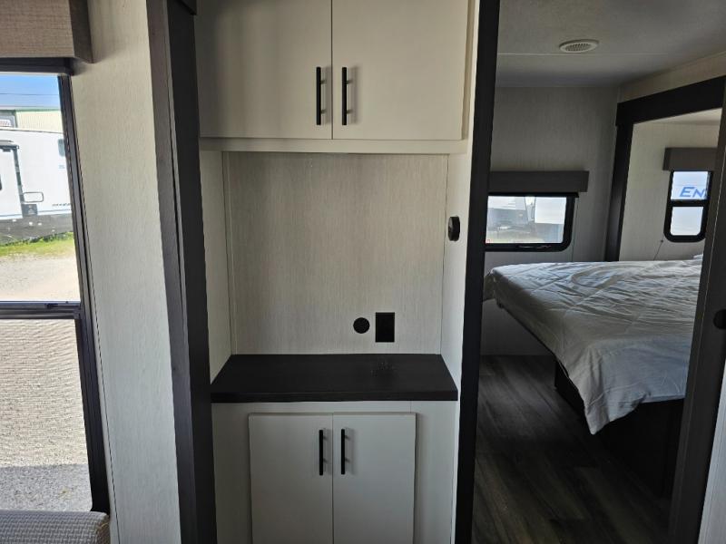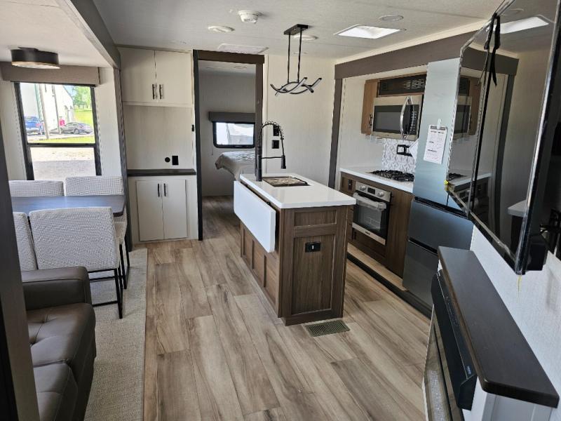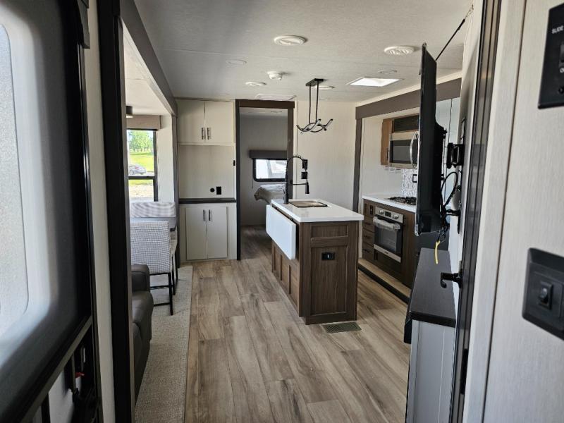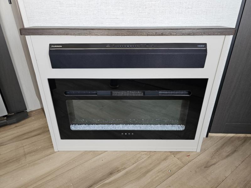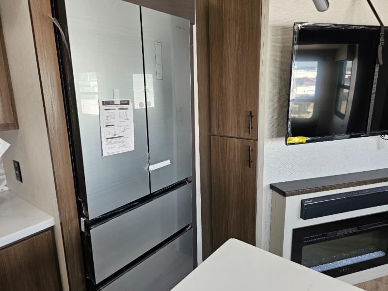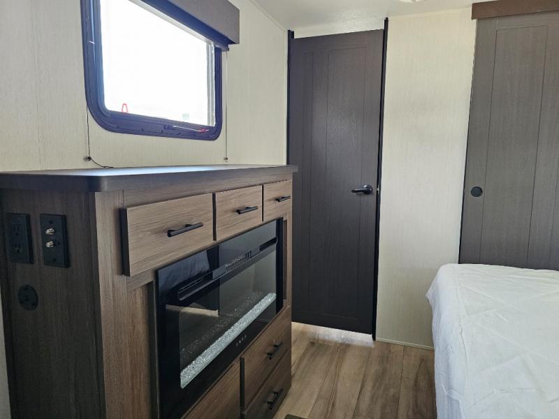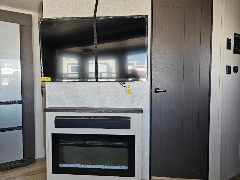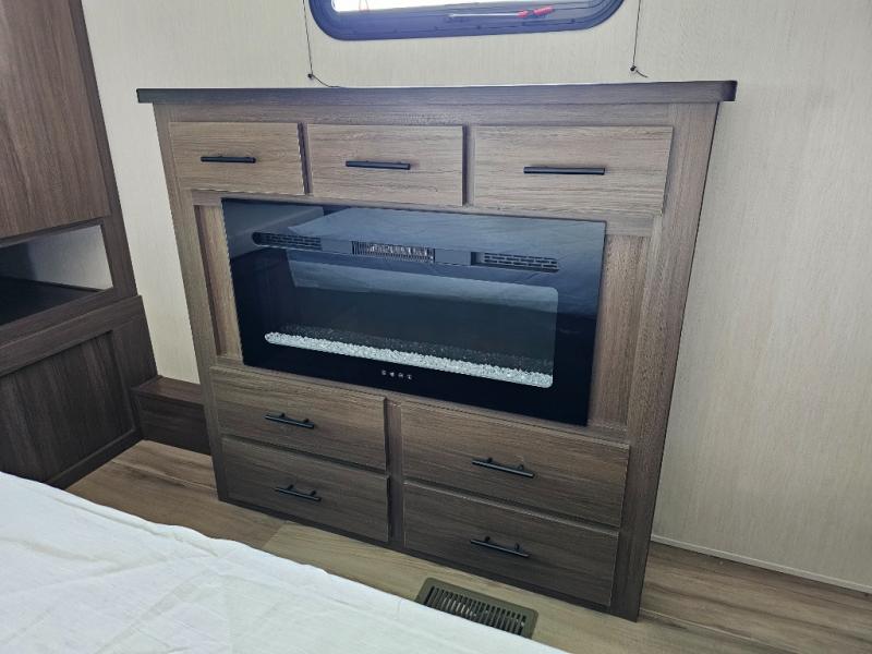 Privacy abounds in this travel trailer with a bedroom at each end! A king bed slide in the front has its own fireplace for cozy nights. Dual wardrobes frame the reading bench which looks out the front window for peaceful moments appreciating the view. At the rear, a second bedroom with queen bed has its own half bath. A pantry closet here also has prep for an optional washer/dryer for convenience on the road. In the center everyone can meet up in the spacious kitchen/living room. A hide-a-bed sofa has even more sleeping space, or relax there and watch the TV which is in the entertainment center along with another fireplace. The kitchen is well-equipped with a three-burner cooktop, microwave, and even an island where the sink is located for easy meal prep. Outside there are not one but two 10' power awnings for extra protection from the elements!