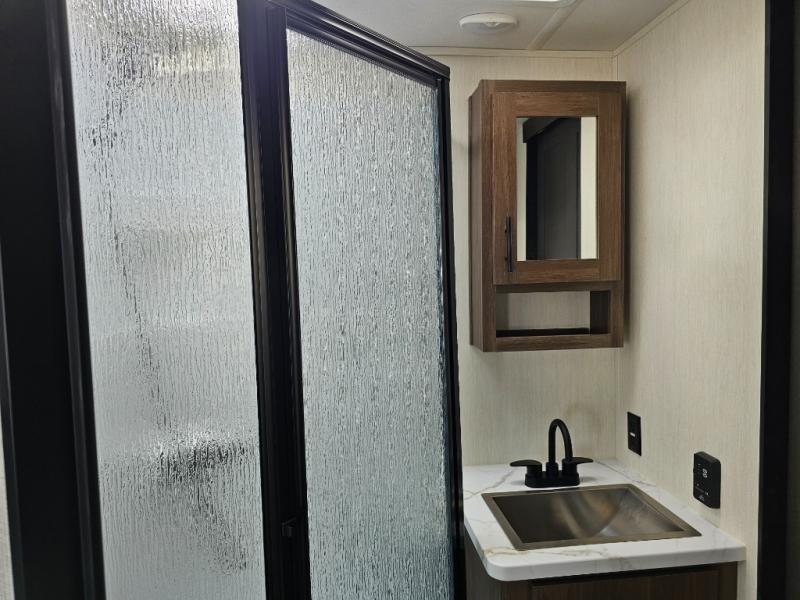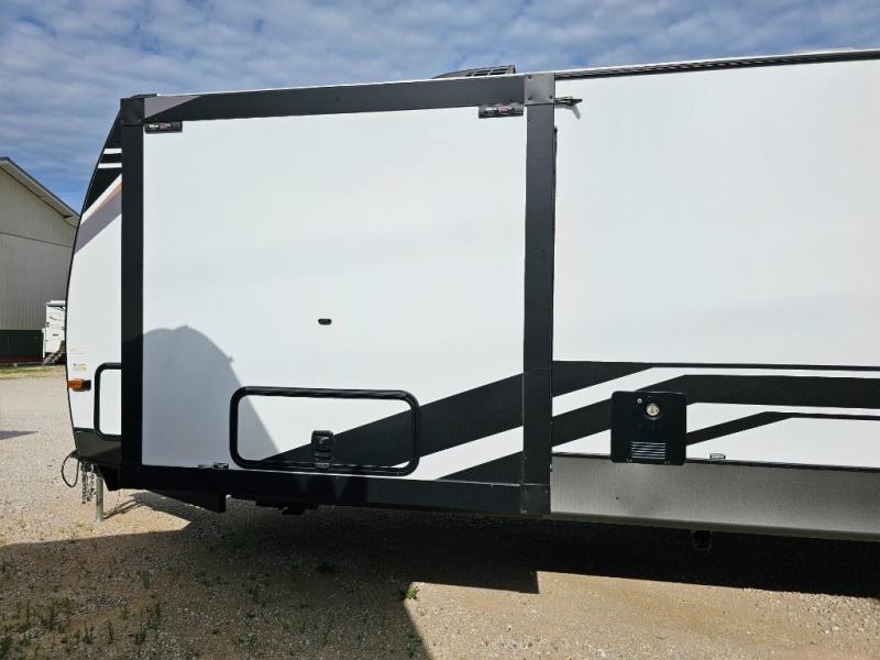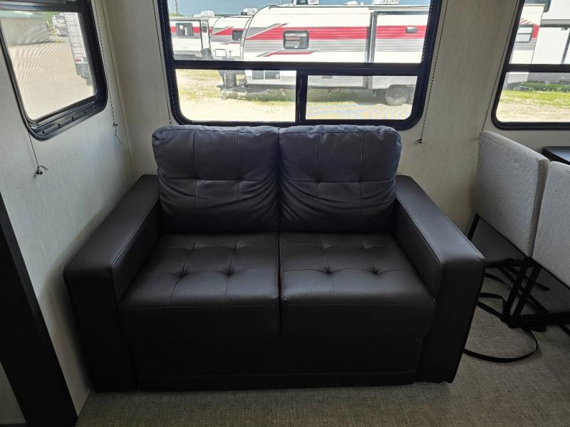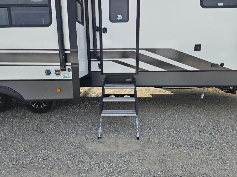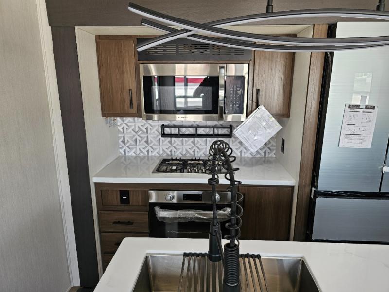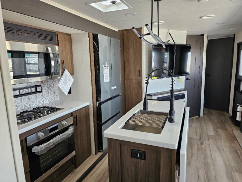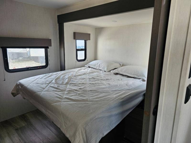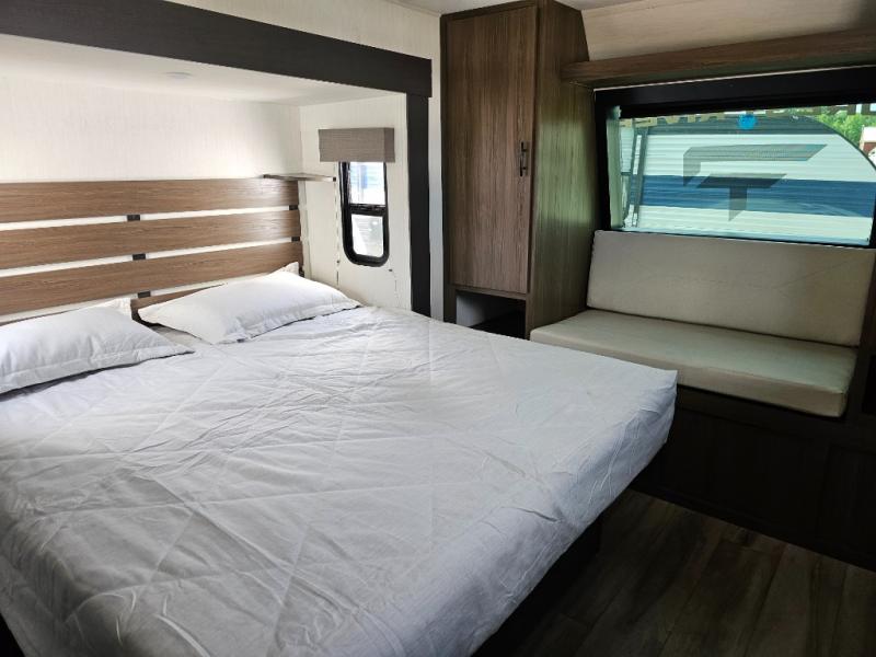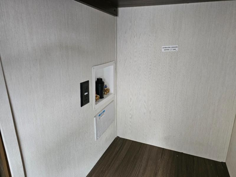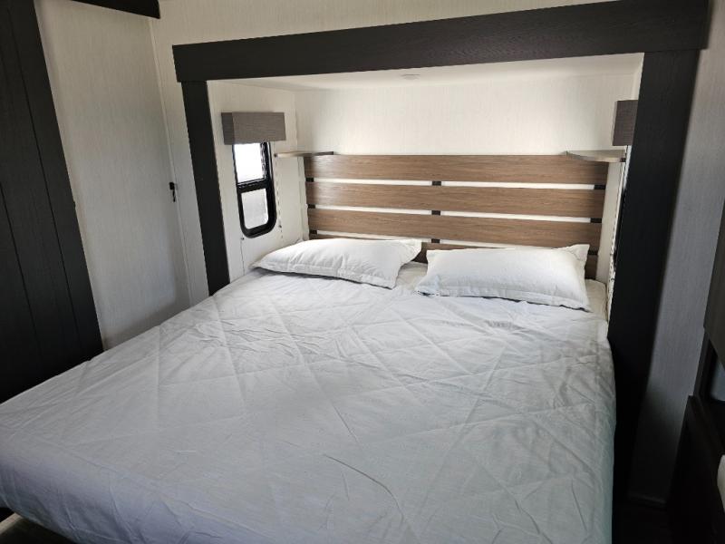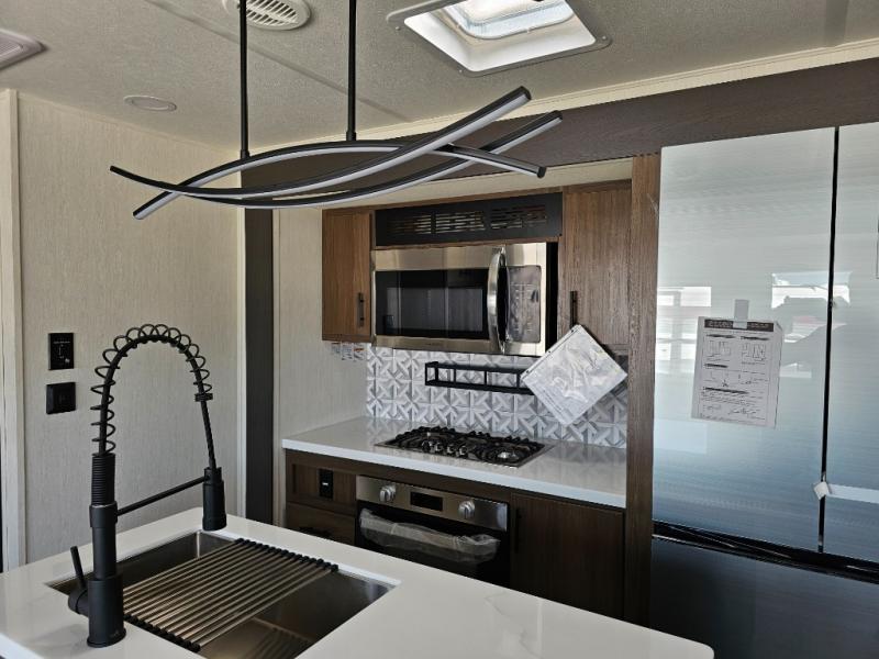 Privacy abounds in this travel trailer with a bedroom at each end! A king bed slide in the front has its own fireplace for cozy nights. Dual wardrobes frame the reading bench which looks out the front window for peaceful moments appreciating the view. At the rear, a second bedroom with queen bed has its own half bath. A pantry closet here also has prep for an optional washer/dryer for convenience on the road. In the center everyone can meet up in the spacious kitchen/living room. A hide-a-bed sofa has even more sleeping space, or relax there and watch the TV which is in the entertainment center along with another fireplace. The kitchen is well-equipped with a three-burner cooktop, microwave, and even an island where the sink is located for easy meal prep. Outside there are not one but two 10' power awnings for extra protection from the elements!