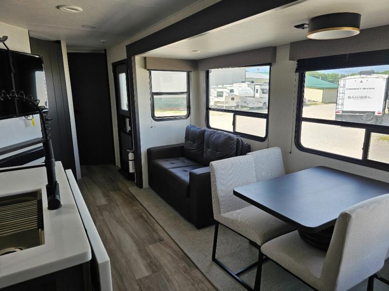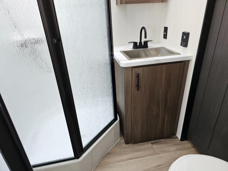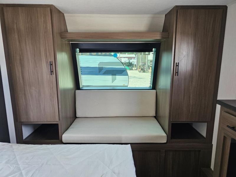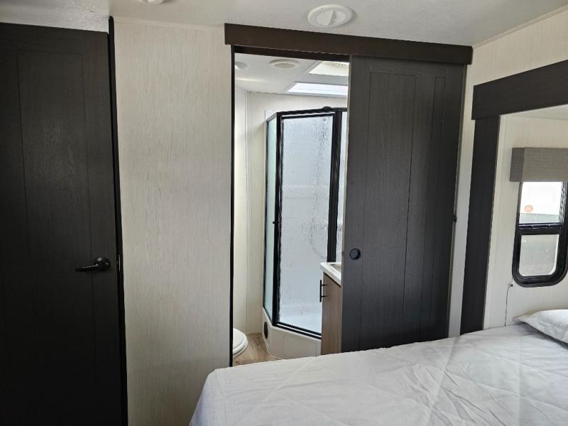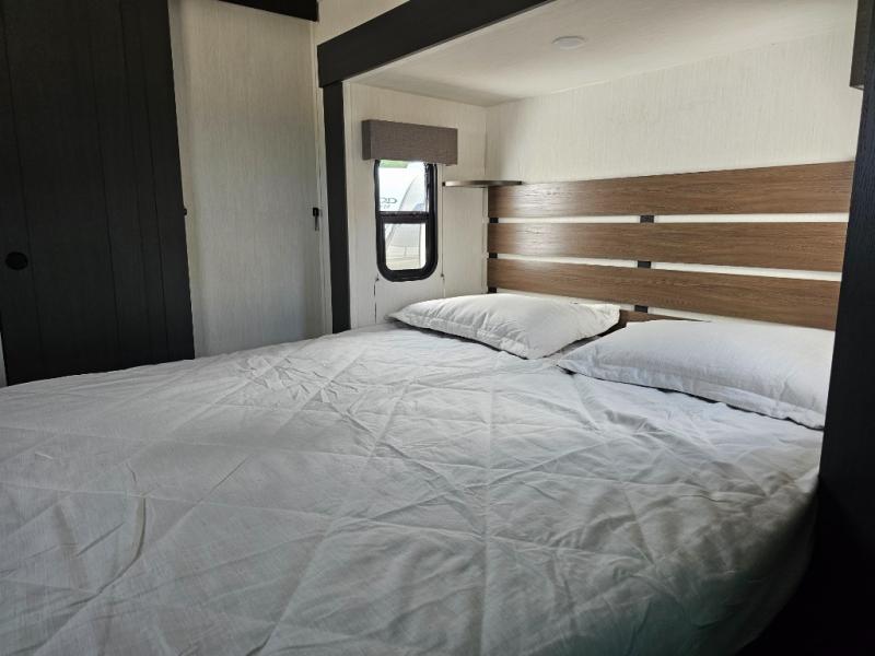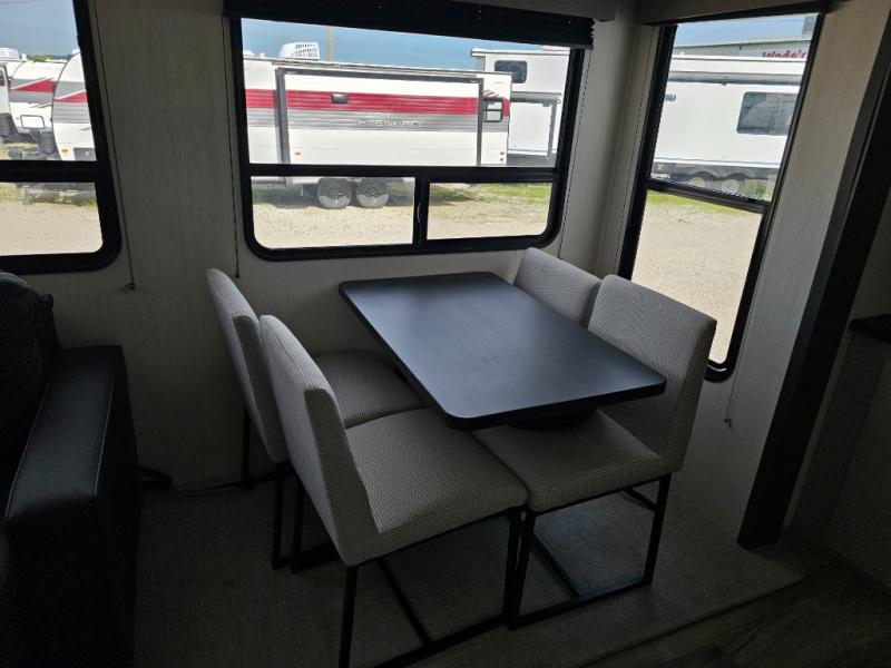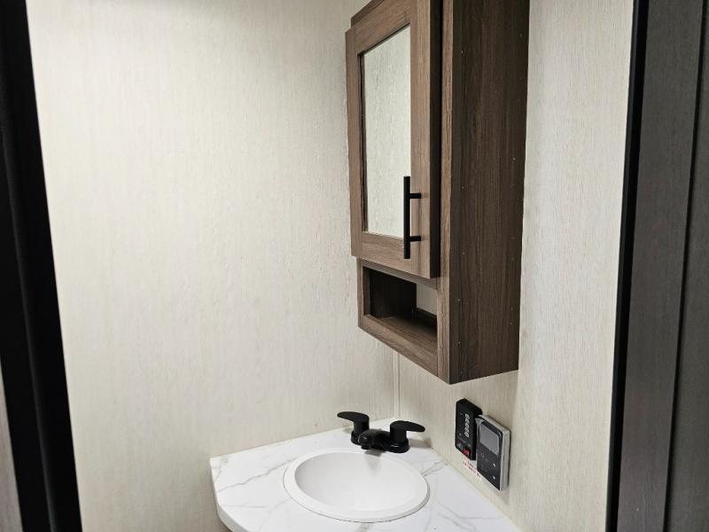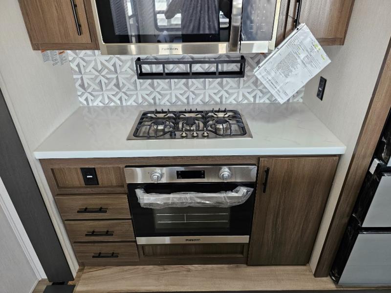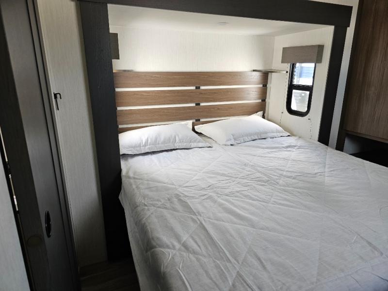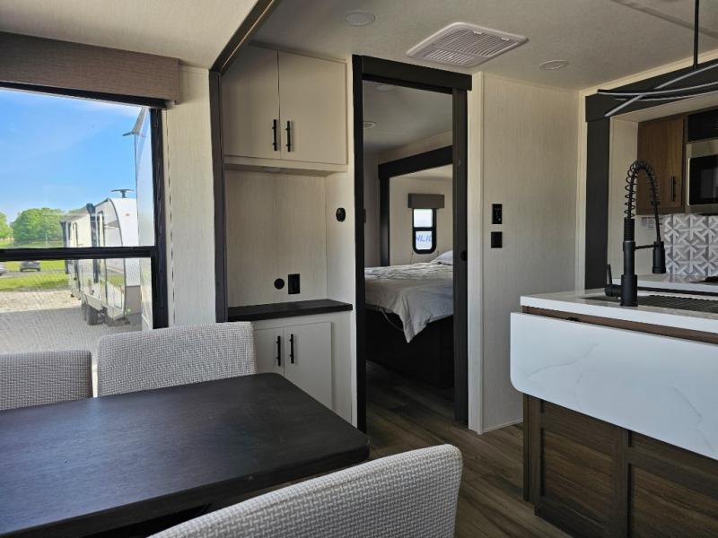 Privacy abounds in this travel trailer with a bedroom at each end! A king bed slide in the front has its own fireplace for cozy nights. Dual wardrobes frame the reading bench which looks out the front window for peaceful moments appreciating the view. At the rear, a second bedroom with queen bed has its own half bath. A pantry closet here also has prep for an optional washer/dryer for convenience on the road. In the center everyone can meet up in the spacious kitchen/living room. A hide-a-bed sofa has even more sleeping space, or relax there and watch the TV which is in the entertainment center along with another fireplace. The kitchen is well-equipped with a three-burner cooktop, microwave, and even an island where the sink is located for easy meal prep. Outside there are not one but two 10' power awnings for extra protection from the elements!