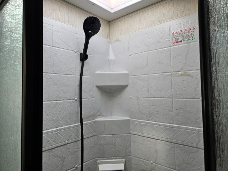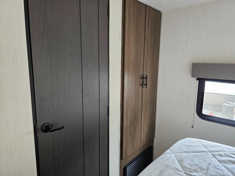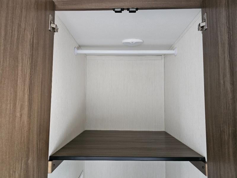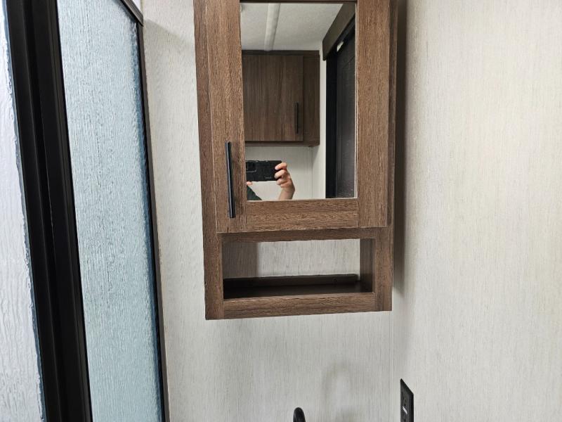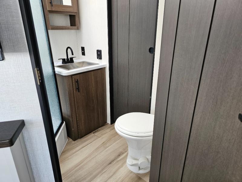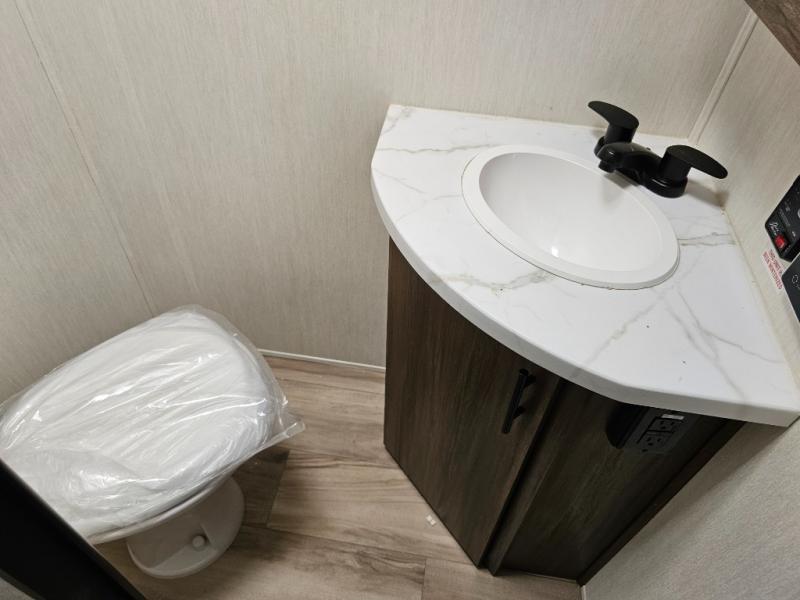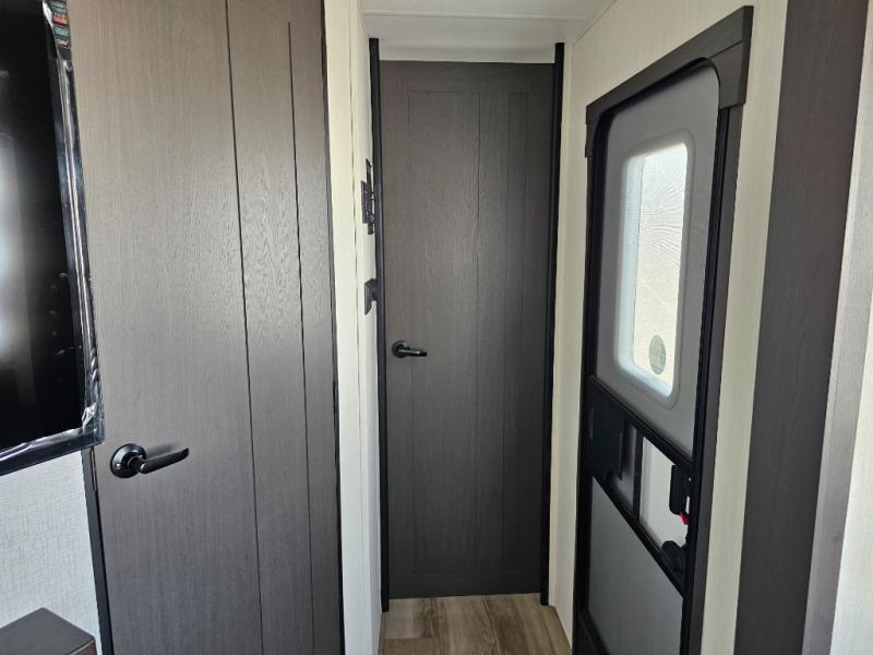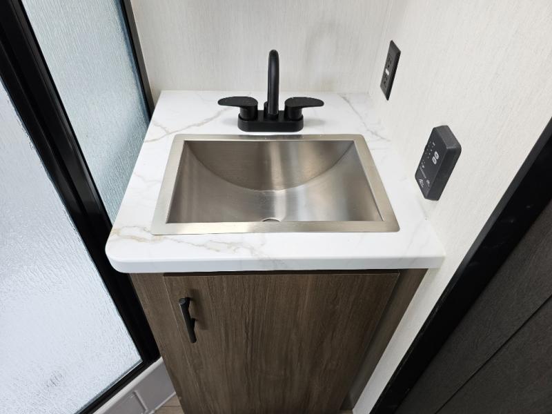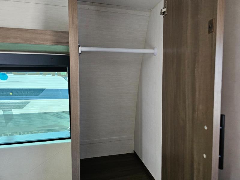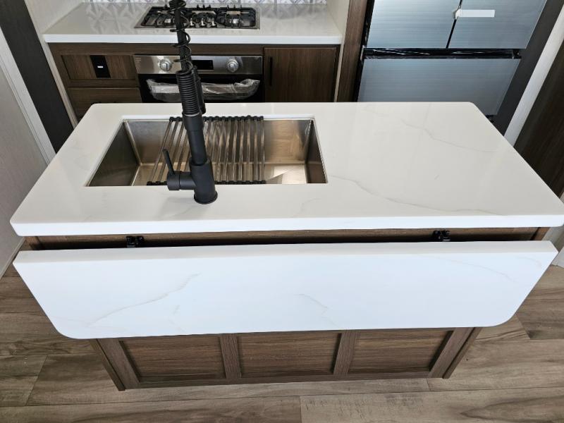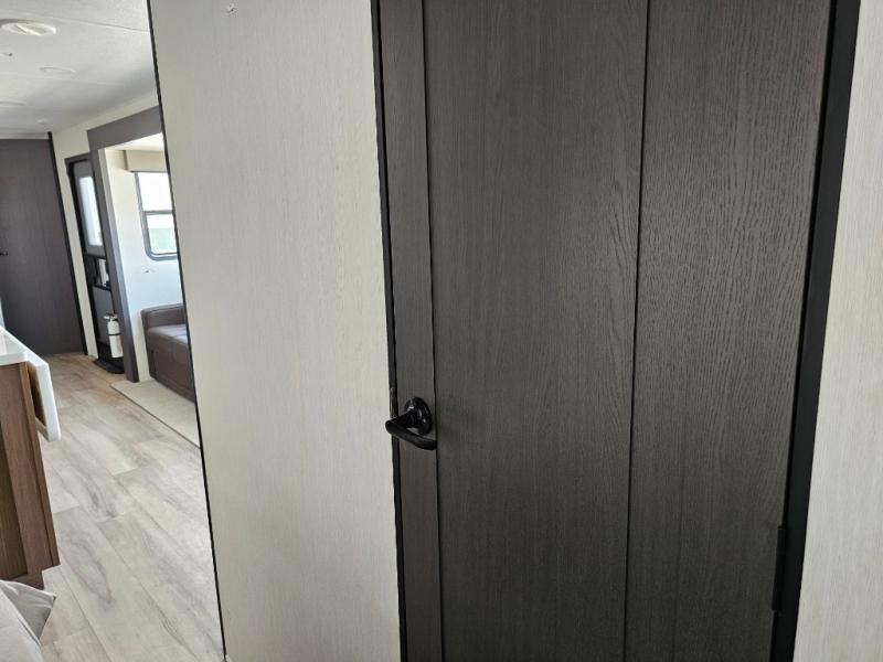 Privacy abounds in this travel trailer with a bedroom at each end! A king bed slide in the front has its own fireplace for cozy nights. Dual wardrobes frame the reading bench which looks out the front window for peaceful moments appreciating the view. At the rear, a second bedroom with queen bed has its own half bath. A pantry closet here also has prep for an optional washer/dryer for convenience on the road. In the center everyone can meet up in the spacious kitchen/living room. A hide-a-bed sofa has even more sleeping space, or relax there and watch the TV which is in the entertainment center along with another fireplace. The kitchen is well-equipped with a three-burner cooktop, microwave, and even an island where the sink is located for easy meal prep. Outside there are not one but two 10' power awnings for extra protection from the elements!