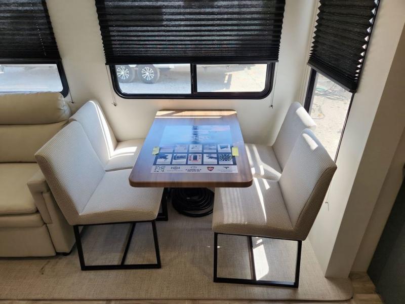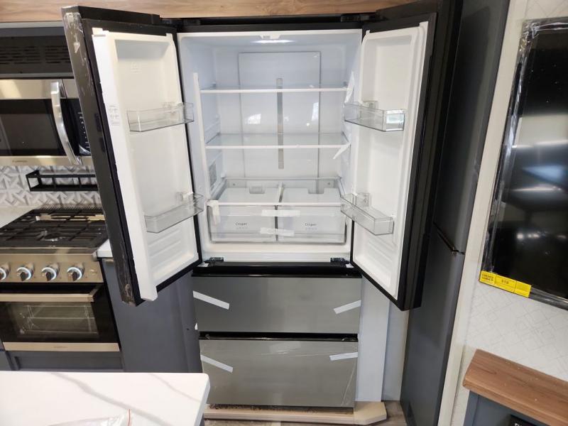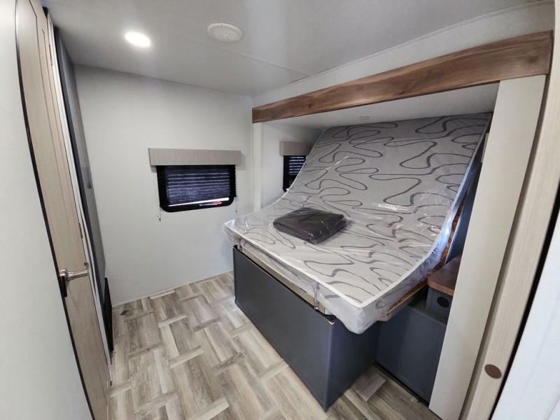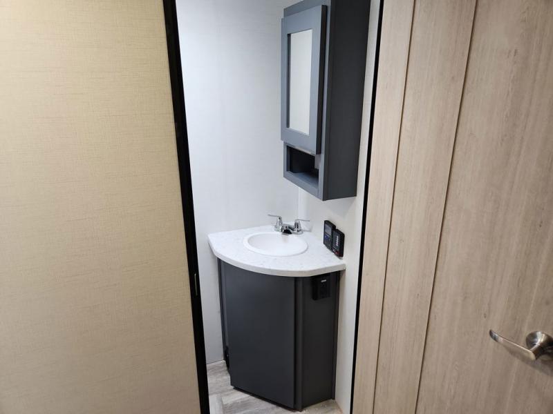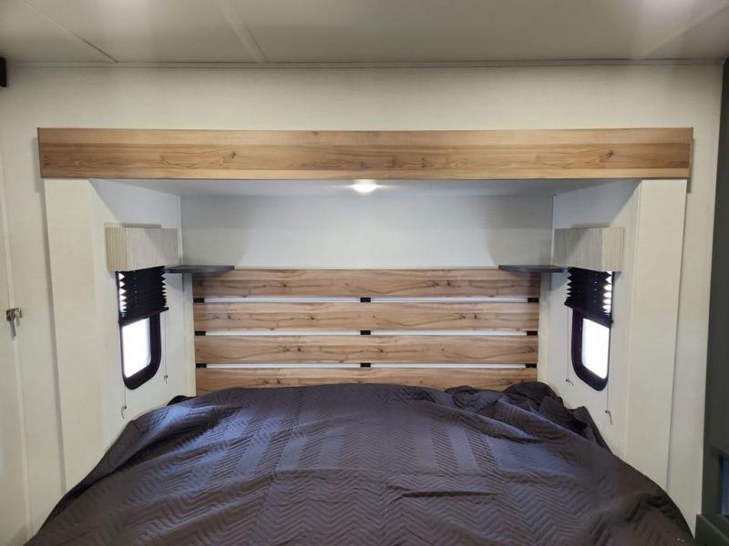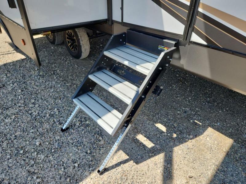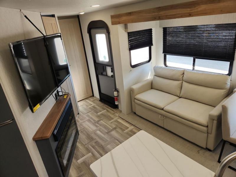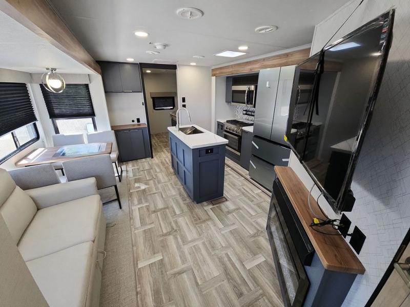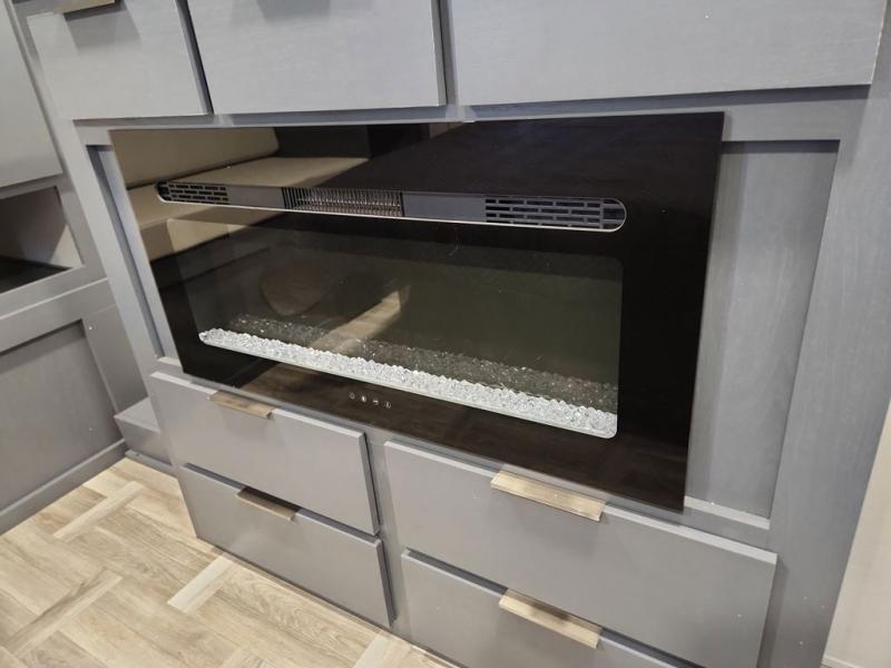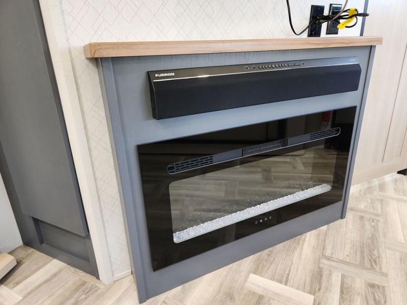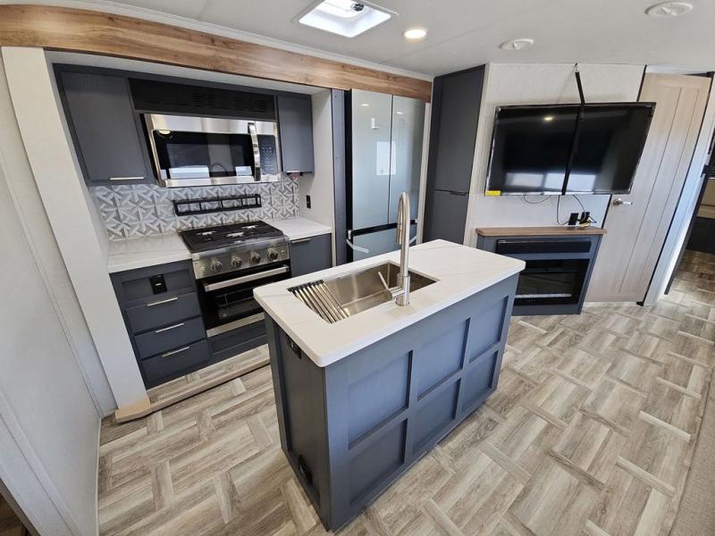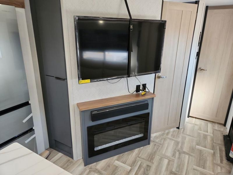Privacy abounds in this travel trailer with a bedroom at each end! A king bed slide in the front has its own fireplace for cozy nights. Dual wardrobes frame the reading bench which looks out the front window for peaceful moments appreciating the view. At the rear, a second bedroom with queen bed has its own half bath. A pantry closet here also has prep for an optional washer/dryer for convenience on the road. In the center everyone can meet up in the spacious kitchen/living room. A hide-a-bed sofa has even more sleeping space, or relax there and watch the TV which is in the entertainment center along with another fireplace. The kitchen is well-equipped with a three-burner cooktop, microwave, and even an island where the sink is located for easy meal prep. Outside there are not one but two 10' power awnings for extra protection from the elements!