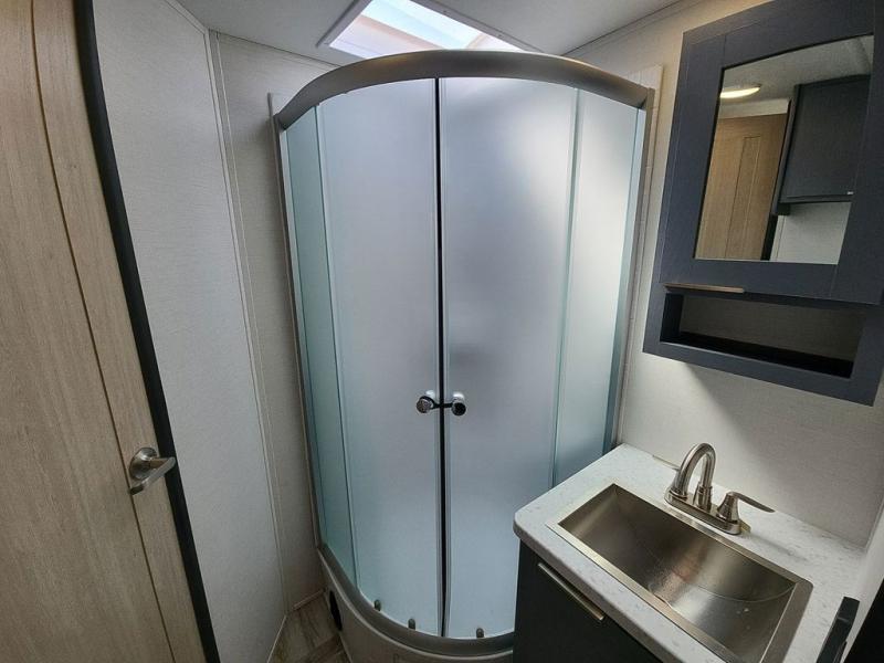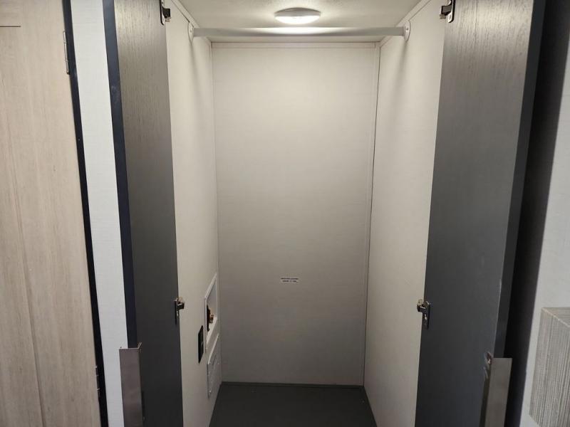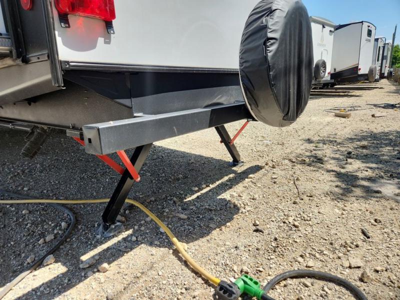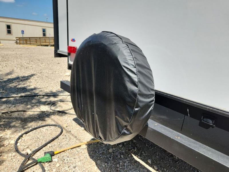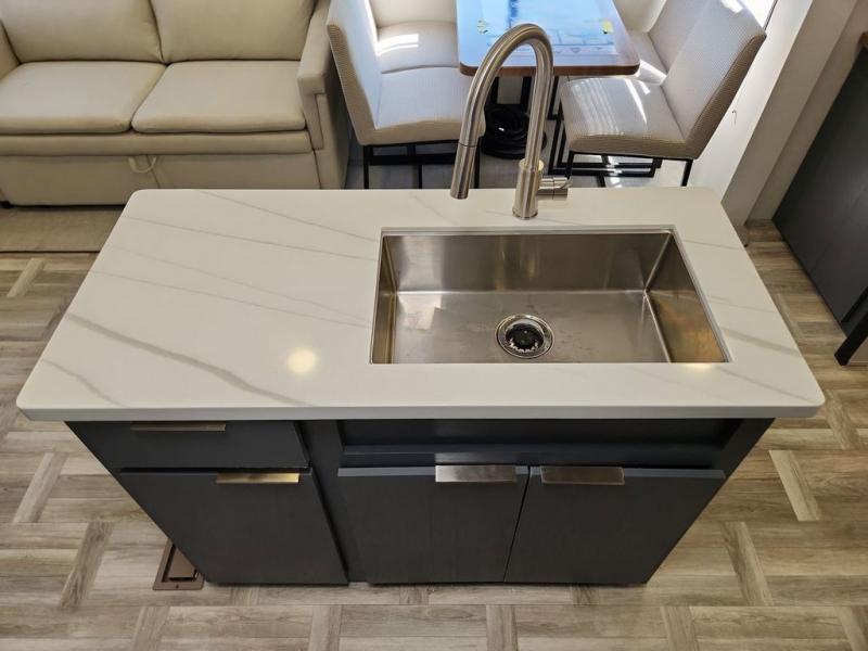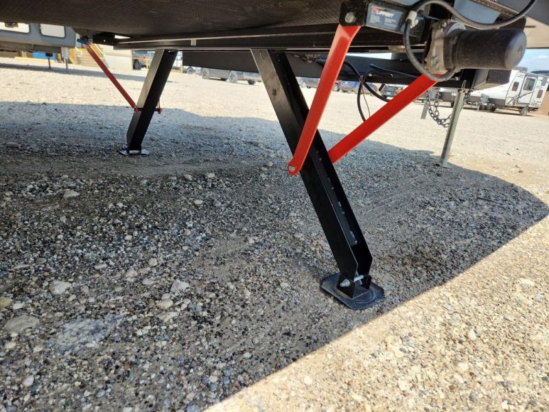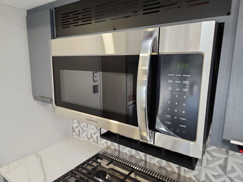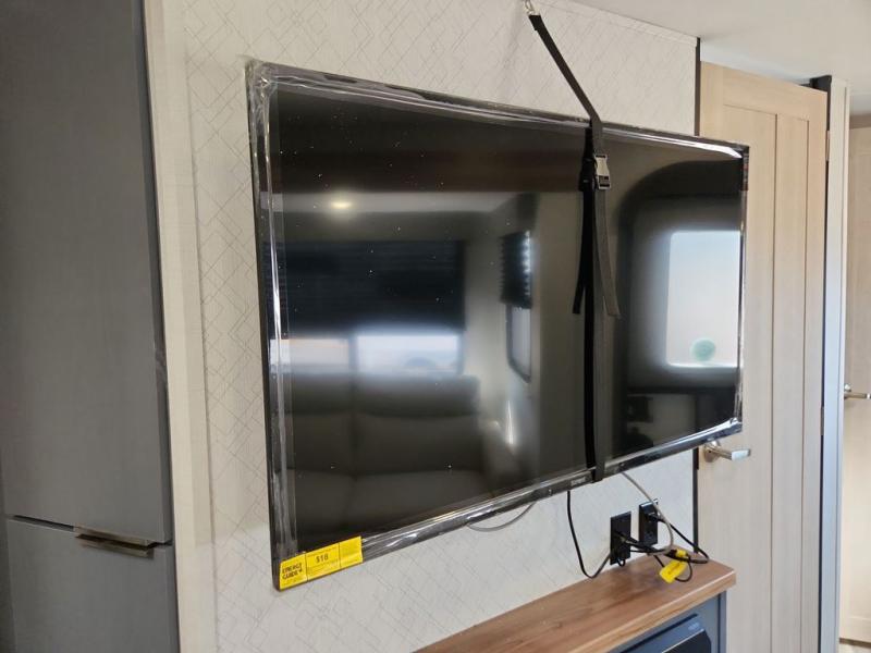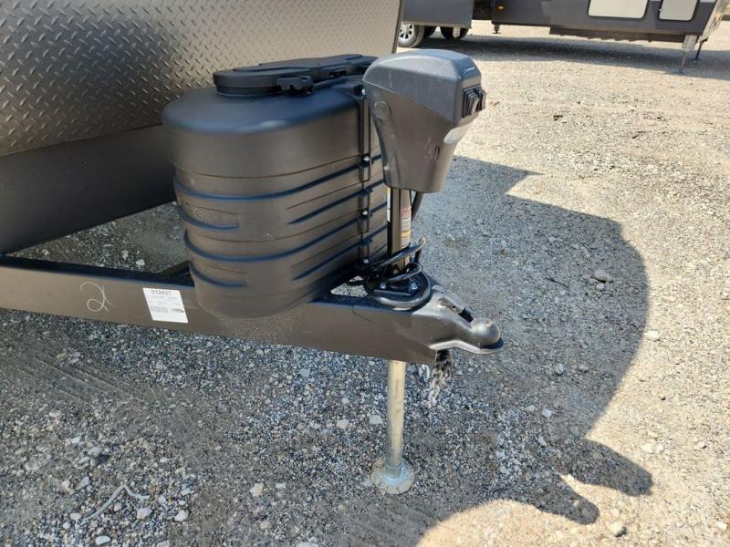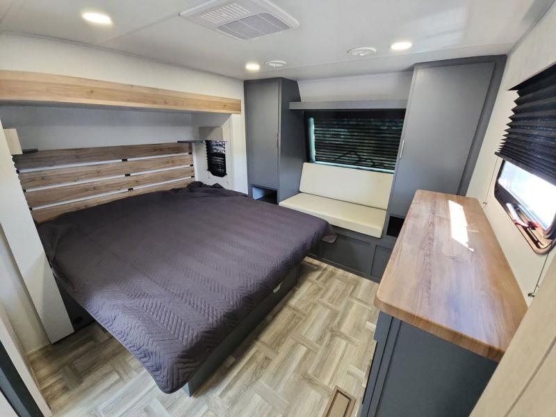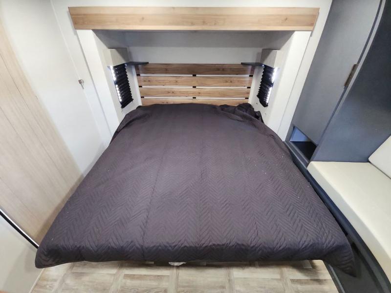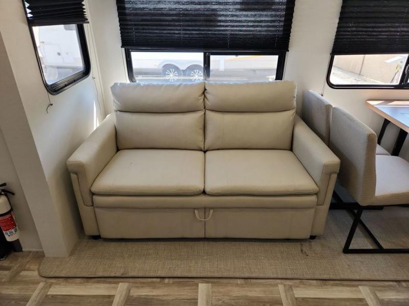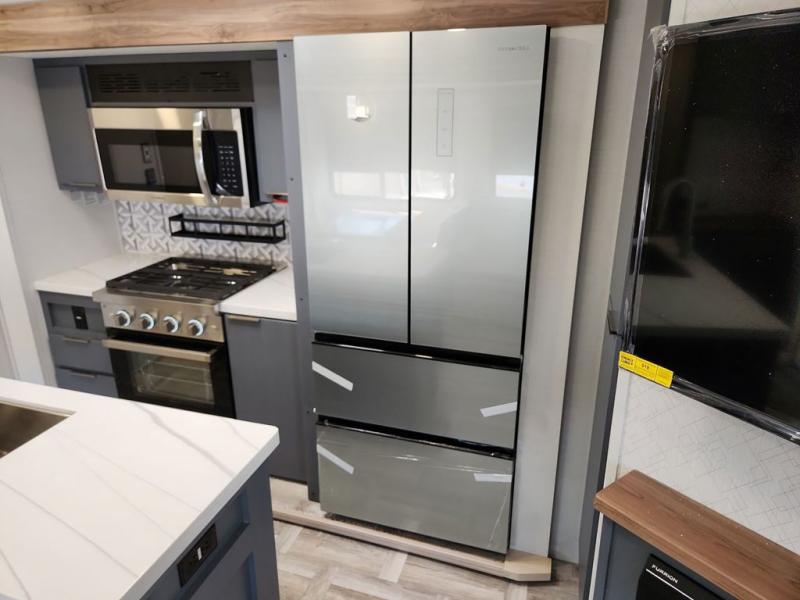 Privacy abounds in this travel trailer with a bedroom at each end! A king bed slide in the front has its own fireplace for cozy nights. Dual wardrobes frame the reading bench which looks out the front window for peaceful moments appreciating the view. At the rear, a second bedroom with queen bed has its own half bath. A pantry closet here also has prep for an optional washer/dryer for convenience on the road. In the center everyone can meet up in the spacious kitchen/living room. A hide-a-bed sofa has even more sleeping space, or relax there and watch the TV which is in the entertainment center along with another fireplace. The kitchen is well-equipped with a three-burner cooktop, microwave, and even an island where the sink is located for easy meal prep. Outside there are not one but two 10' power awnings for extra protection from the elements!