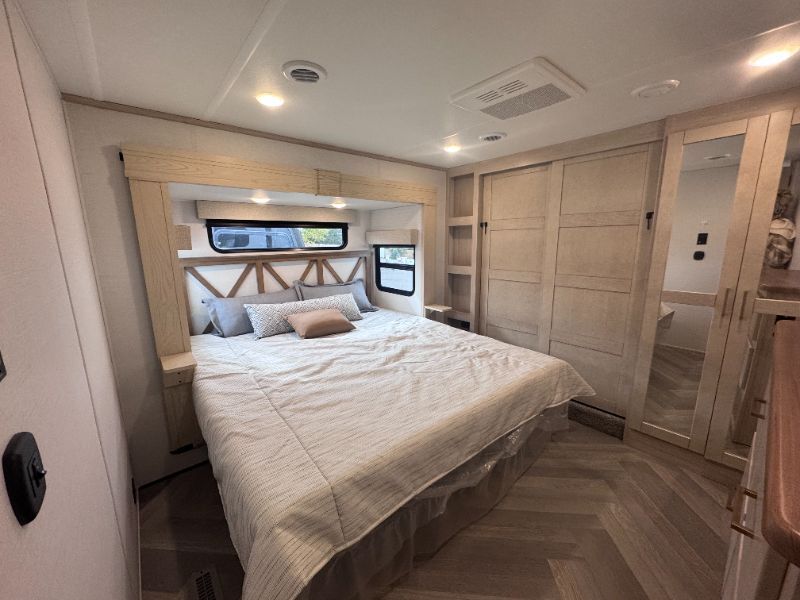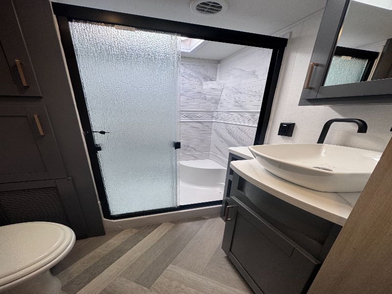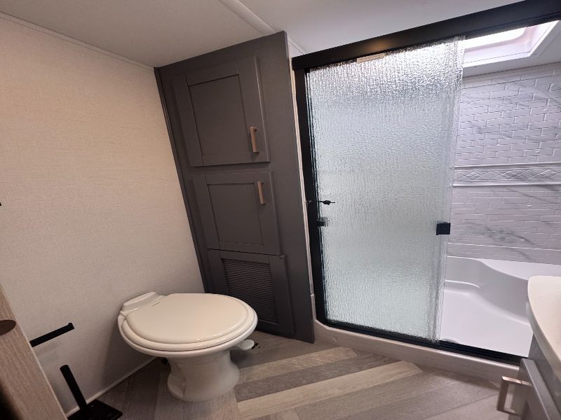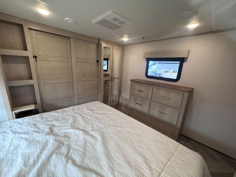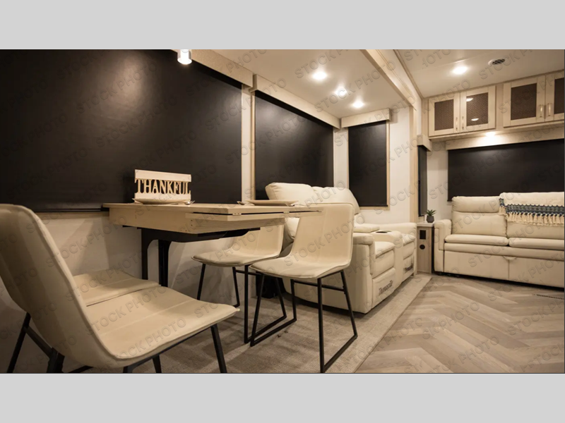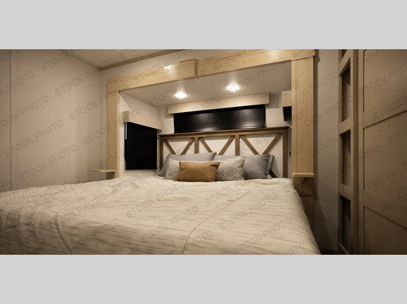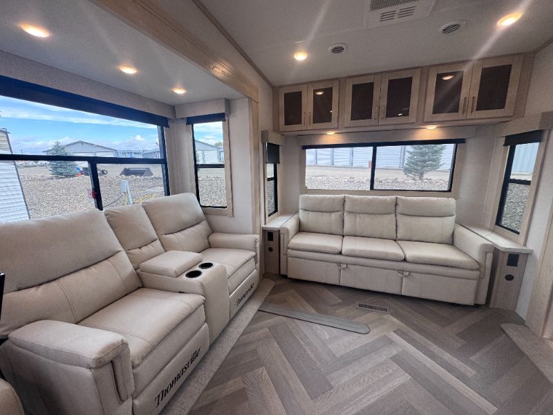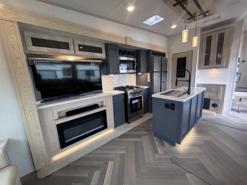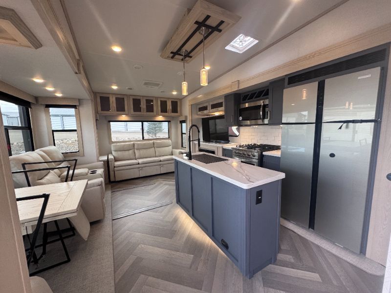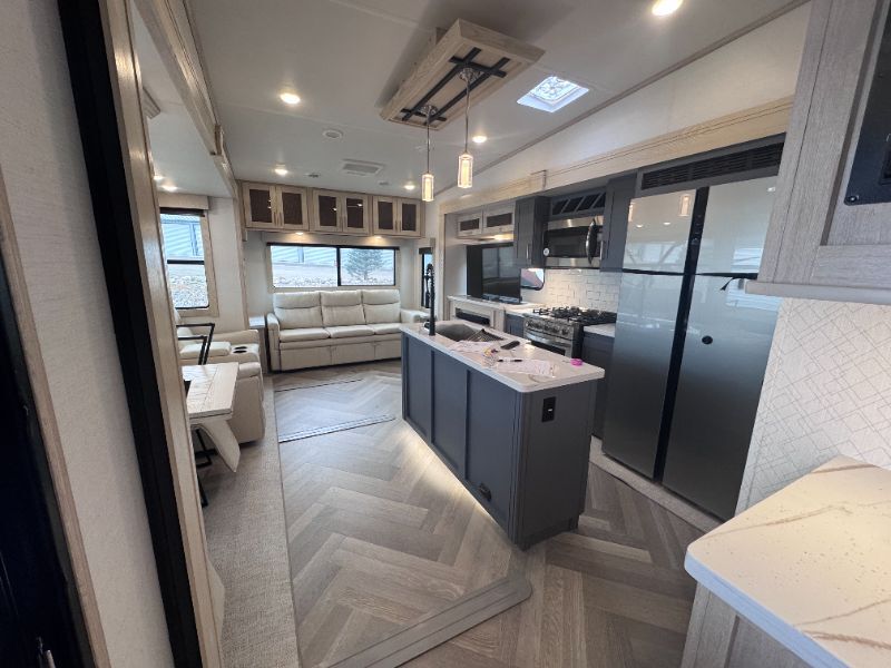 This fifth wheel is perfect for two people looking to escape the routine of everyday life! It features a front private bedroom with a 72" x 80" king bed slide across from a dresser with a TV prep above it and a front wardrobe with shelves plus washer/dryer prep. The full bathroom has a linen closet next to the king-size shower with a seat for you to easily grab a towel. Store your favorite snacks in the large pantry, your nice dishes in the hutch, and keep your beverages cold in the 16 cu. ft. French door refrigerator. The kitchen island will make meal prep and cleaning up a breeze with a stainless steel sink with an extra deep bowl. When mother nature rains on your parade, relax inside on either the EZ glide couch or the 65" theater seating across from the entertainment center with a fireplace and a large LED Smart pop-up TV!
