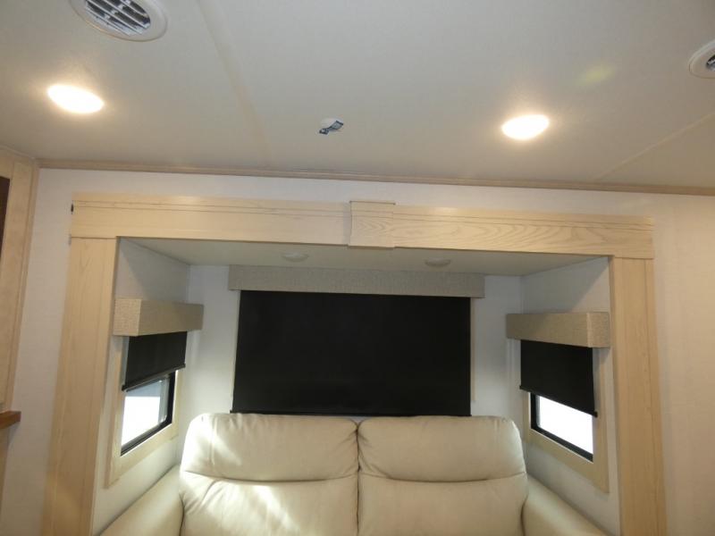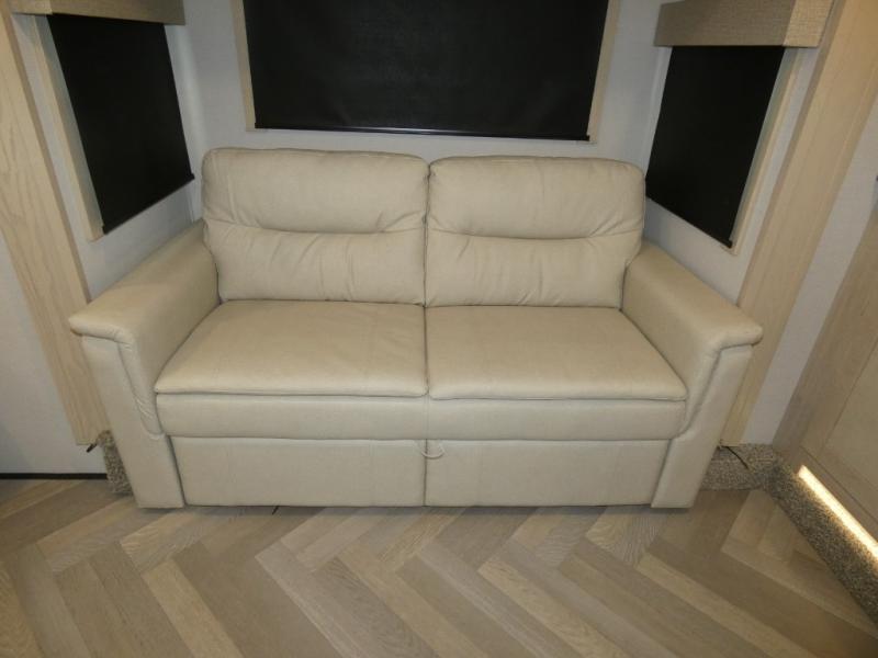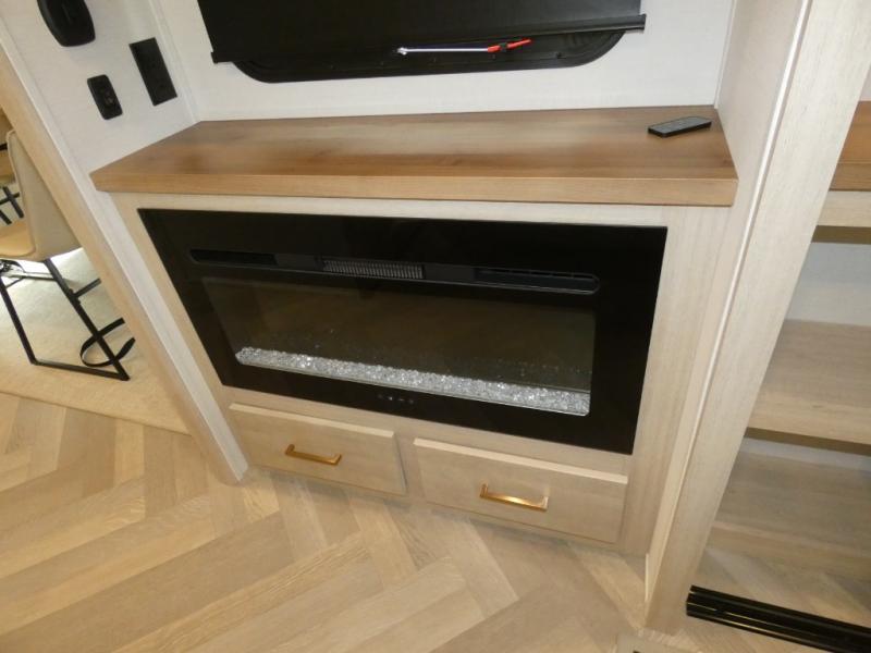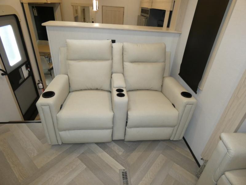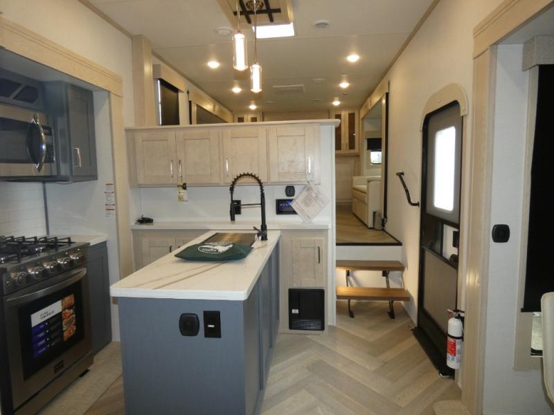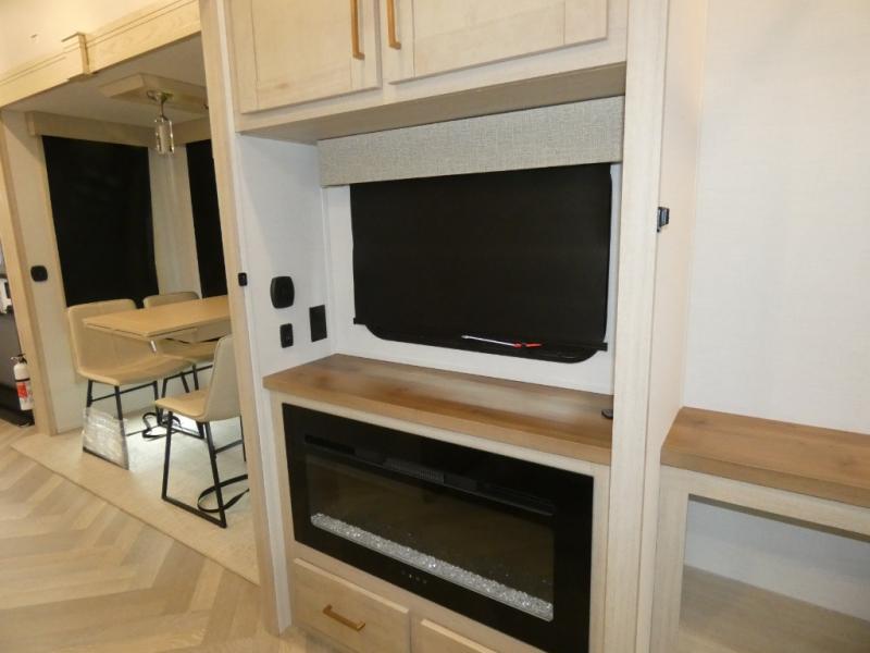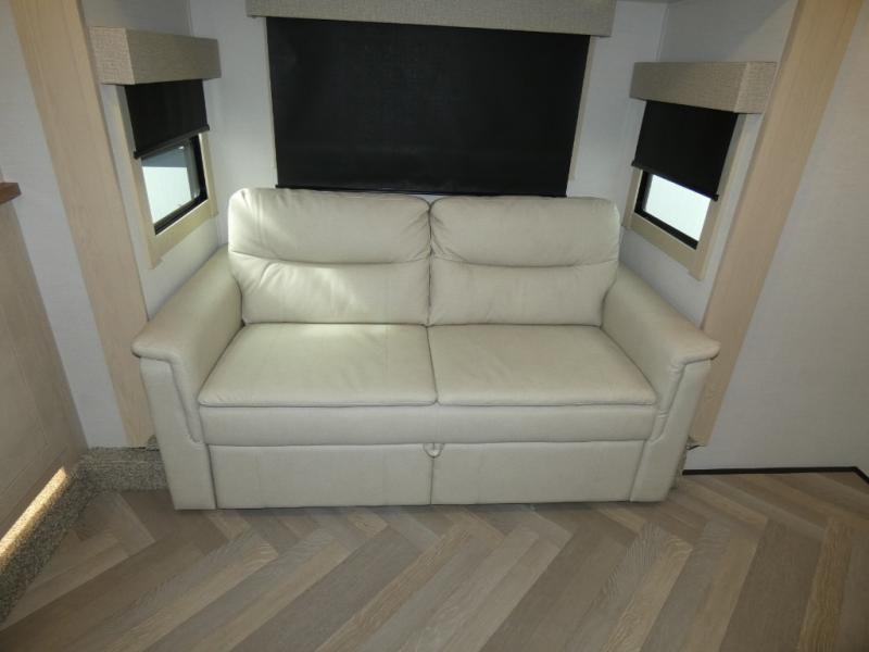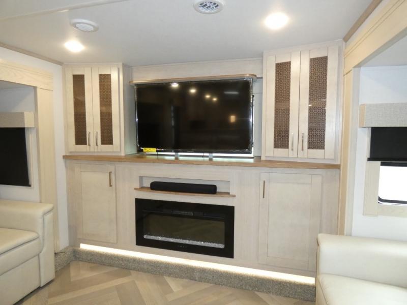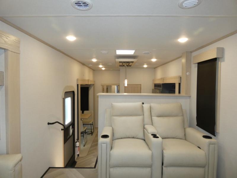 It's a clean decision with a bath and a half to take this fifth wheel on your next adventure! The front living area includes opposing EZ glide couches, 65" theater seating, and a front entertainment with a Smart LED pop up TV and fireplace for a cozy evening indoors. Prepare meals on the four burner cooktop, and leftovers can go in the 16 cu. ft. French door 12V refrigerator. You and your spouse will love the master suite that includes a king bed slide, plenty of storage space, and an entrance into the full rear bathroom with a dual sink vanity. There is even a linen closet with washer and dryer prep if you want to add those appliances!