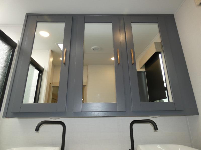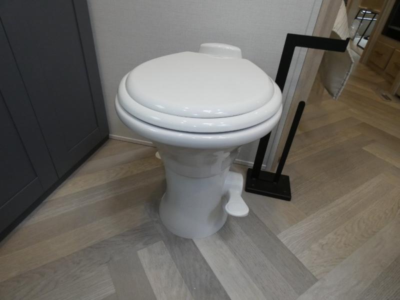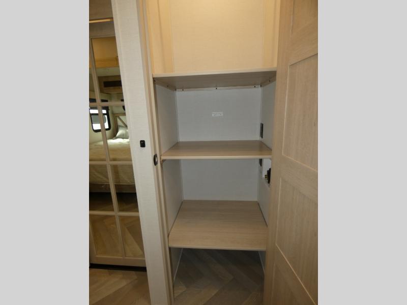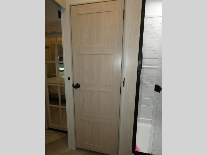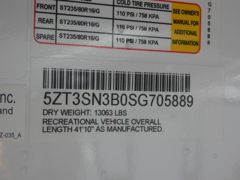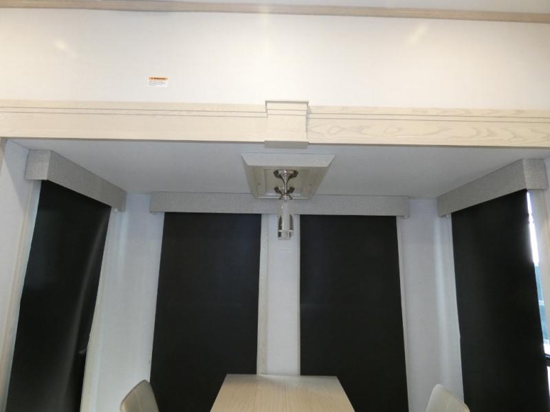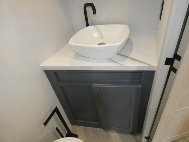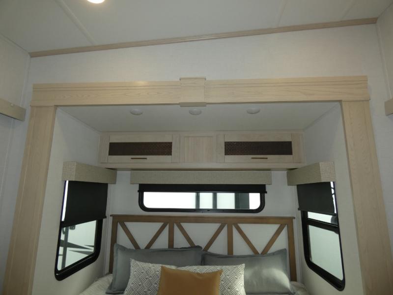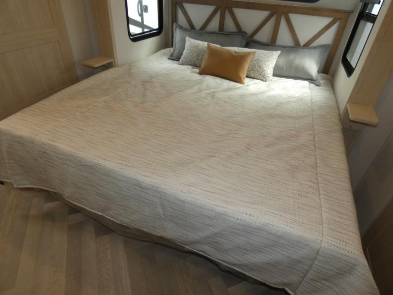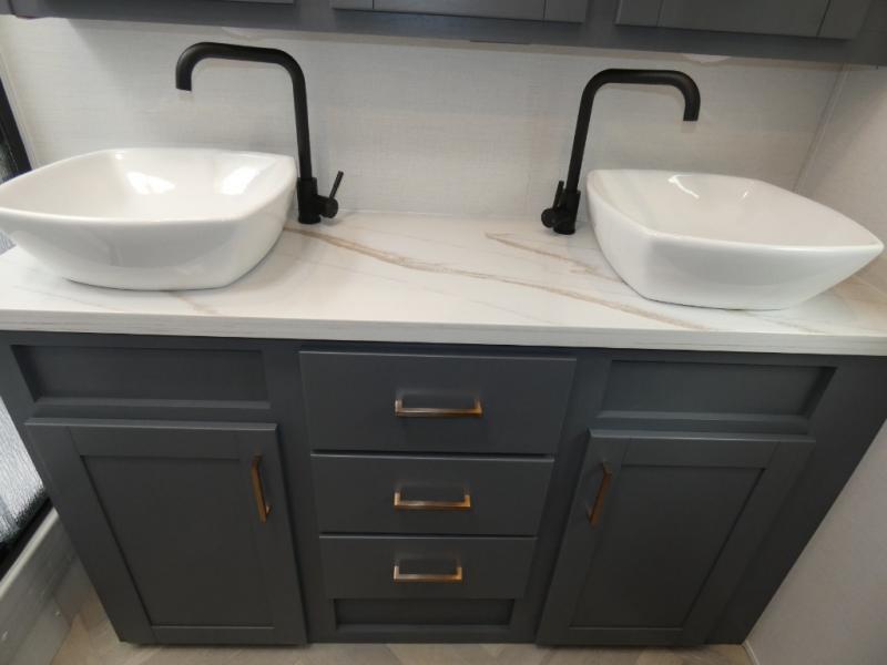 It's a clean decision with a bath and a half to take this fifth wheel on your next adventure! The front living area includes opposing EZ glide couches, 65" theater seating, and a front entertainment with a Smart LED pop up TV and fireplace for a cozy evening indoors. Prepare meals on the four burner cooktop, and leftovers can go in the 16 cu. ft. French door 12V refrigerator. You and your spouse will love the master suite that includes a king bed slide, plenty of storage space, and an entrance into the full rear bathroom with a dual sink vanity. There is even a linen closet with washer and dryer prep if you want to add those appliances!