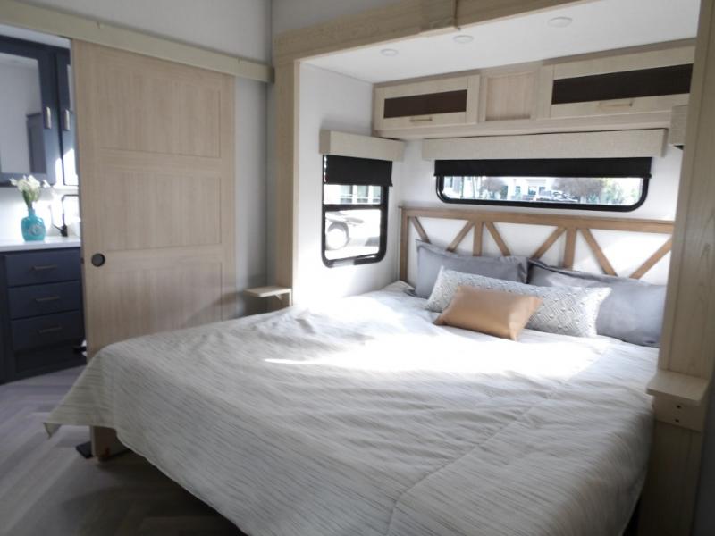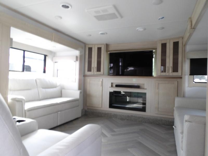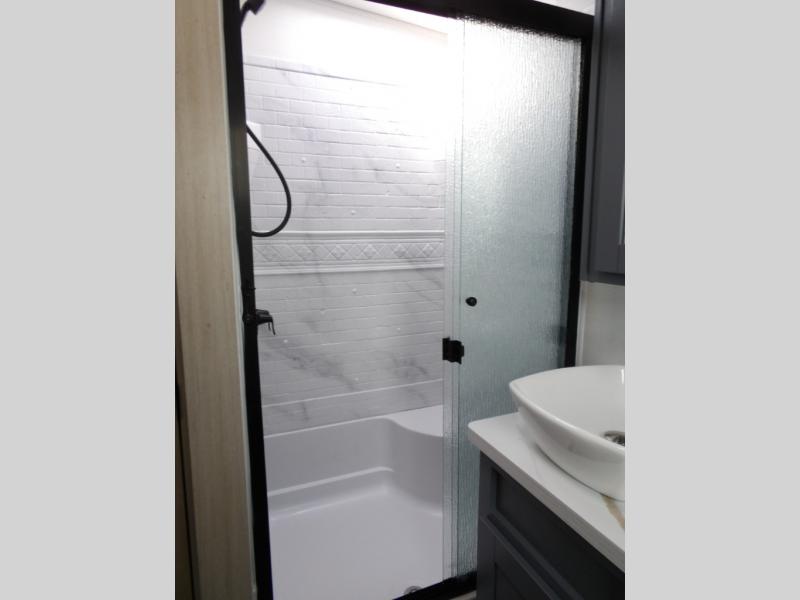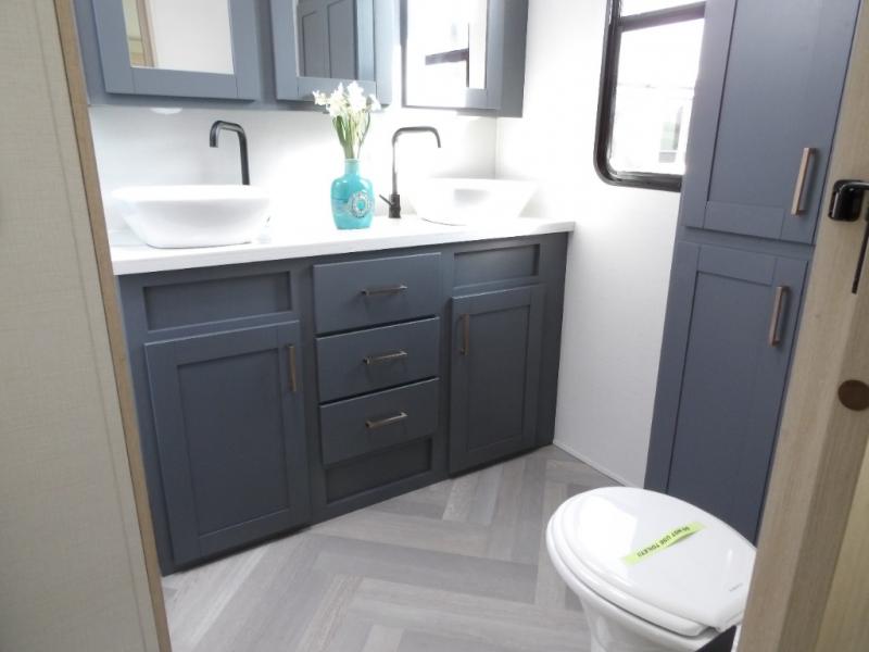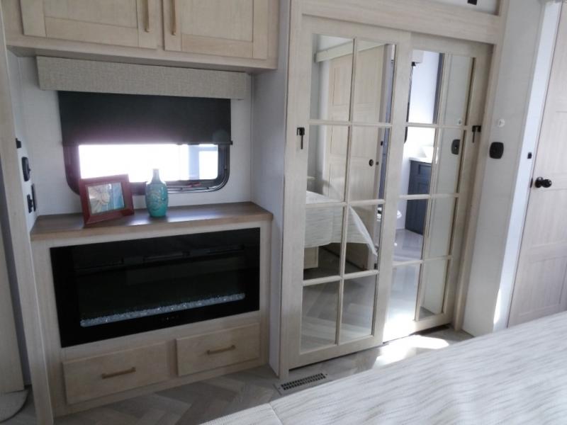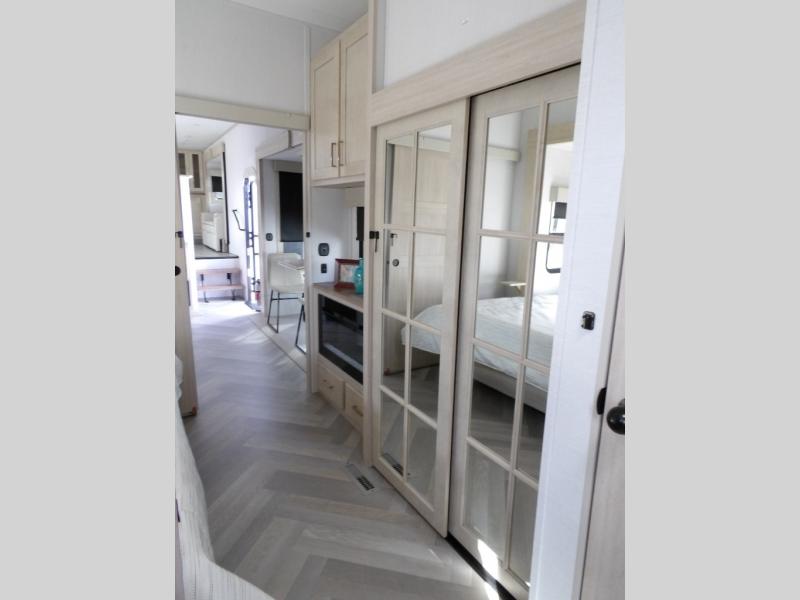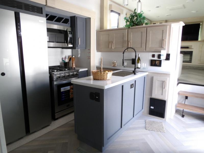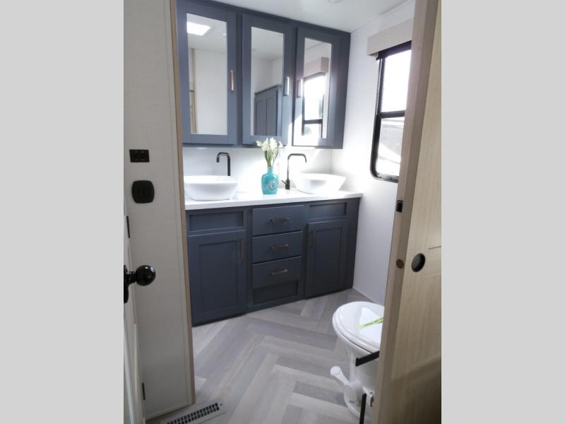 It's a clean decision with a bath and a half to take this fifth wheel on your next adventure! The front living area includes opposing EZ glide couches, 65" theater seating, and a front entertainment with a Smart LED pop up TV and fireplace for a cozy evening indoors. Prepare meals on the four burner cooktop, and leftovers can go in the 16 cu. ft. French door 12V refrigerator. You and your spouse will love the master suite that includes a king bed slide, plenty of storage space, and an entrance into the full rear bathroom with a dual sink vanity. There is even a linen closet with washer and dryer prep if you want to add those appliances!