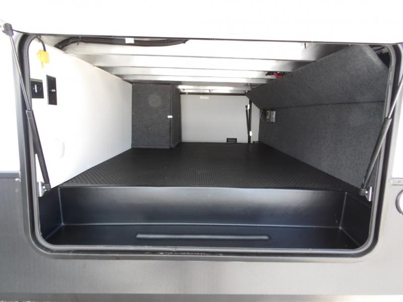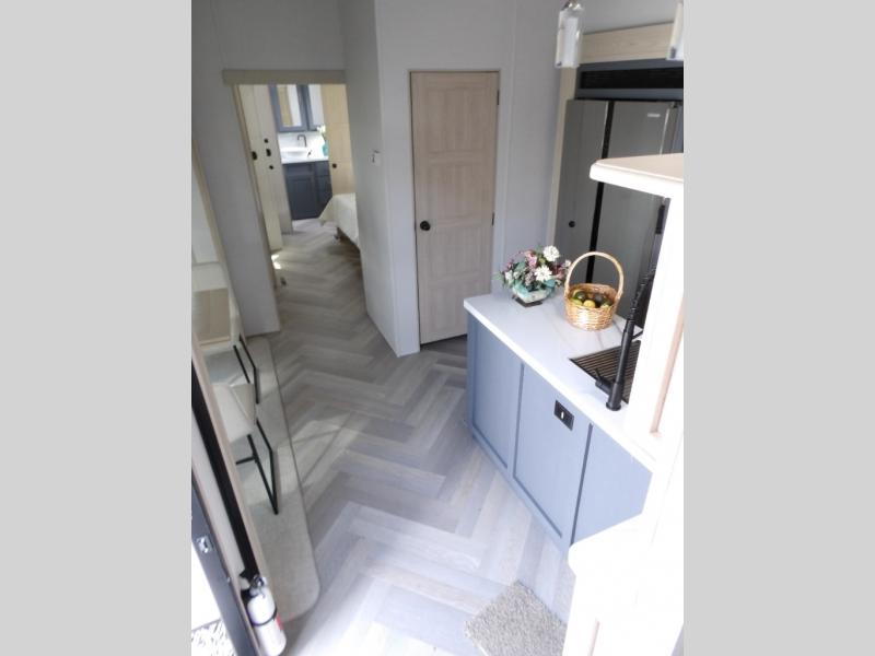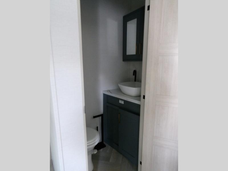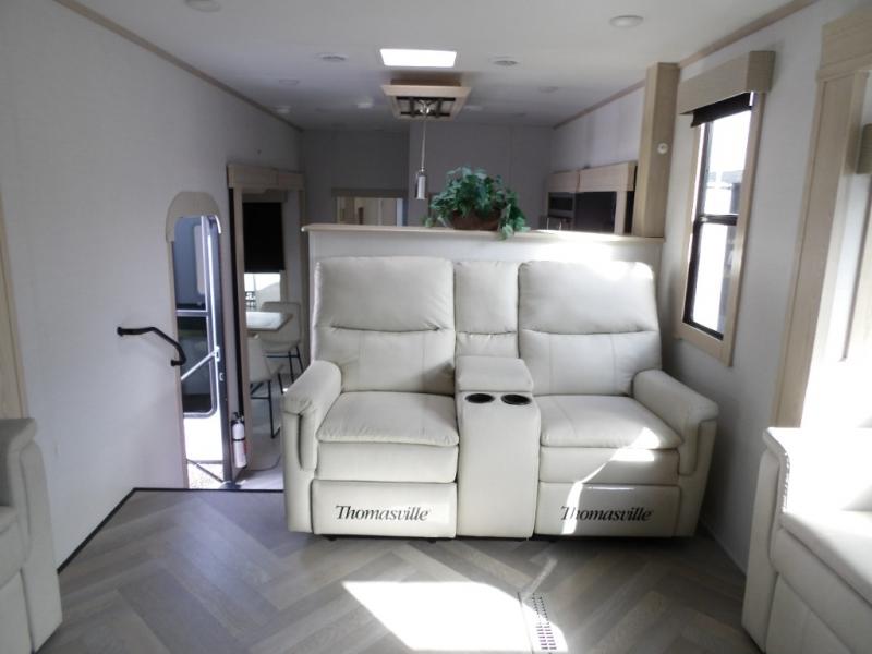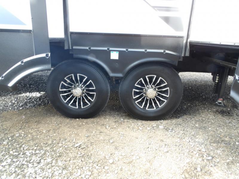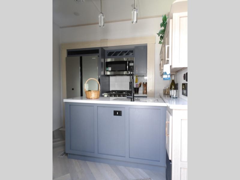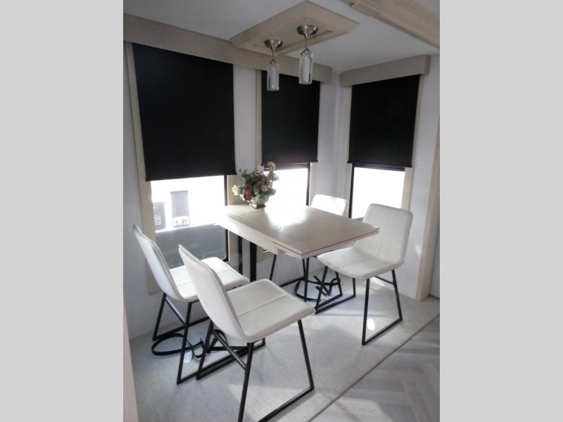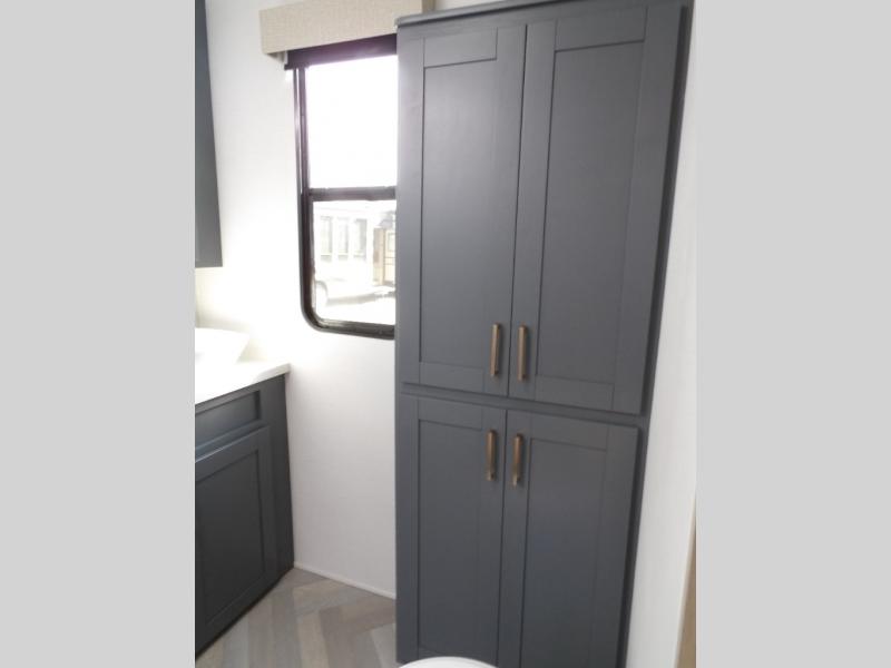 It's a clean decision with a bath and a half to take this fifth wheel on your next adventure! The front living area includes opposing EZ glide couches, 65" theater seating, and a front entertainment with a Smart LED pop up TV and fireplace for a cozy evening indoors. Prepare meals on the four burner cooktop, and leftovers can go in the 16 cu. ft. French door 12V refrigerator. You and your spouse will love the master suite that includes a king bed slide, plenty of storage space, and an entrance into the full rear bathroom with a dual sink vanity. There is even a linen closet with washer and dryer prep if you want to add those appliances!