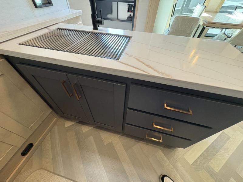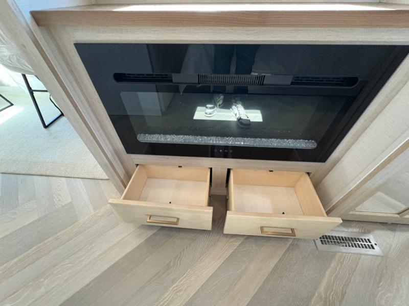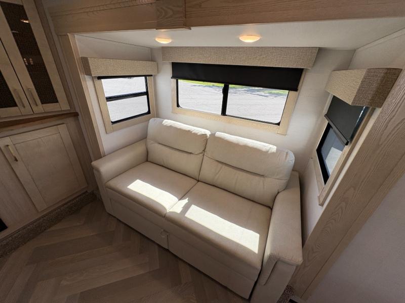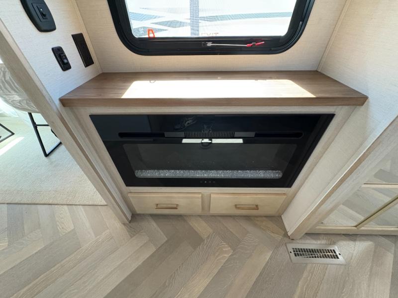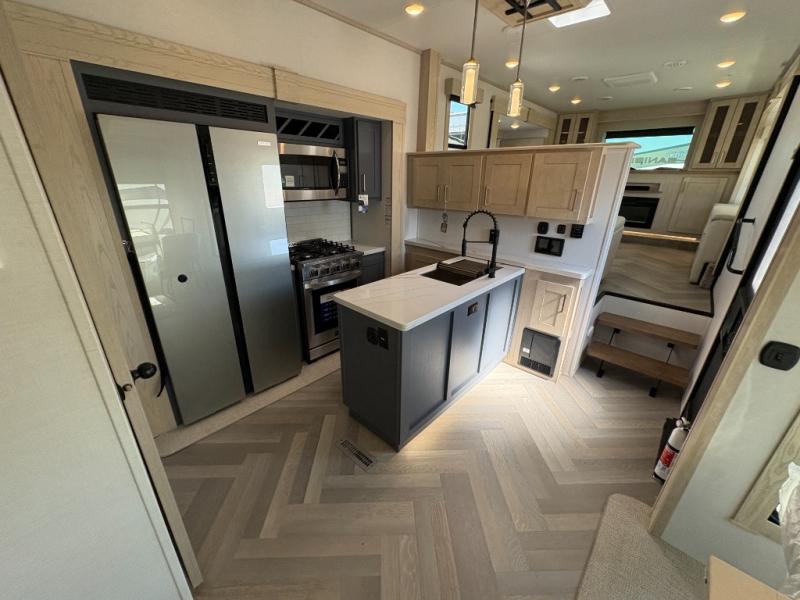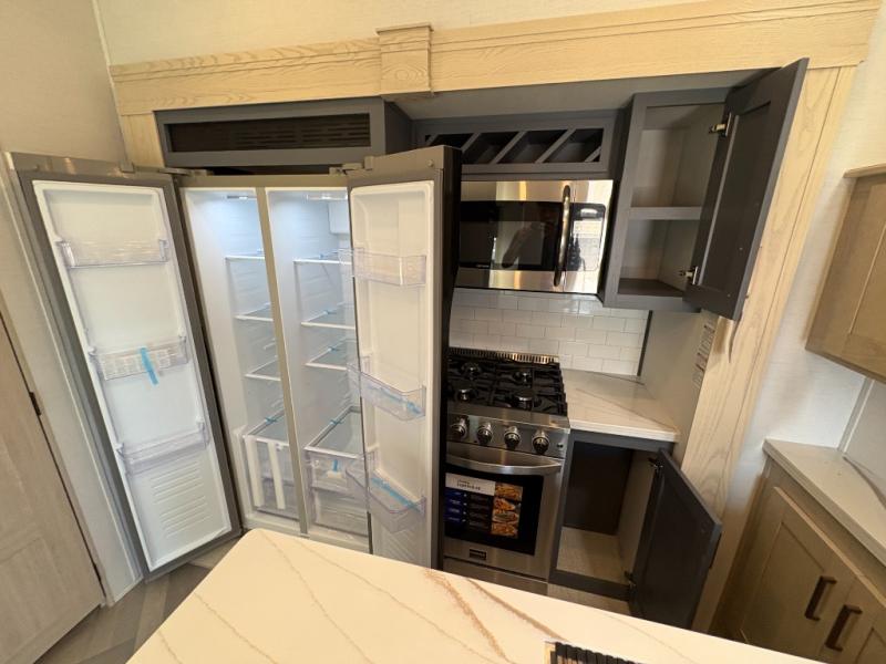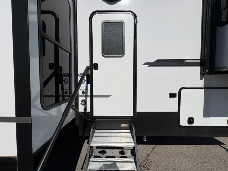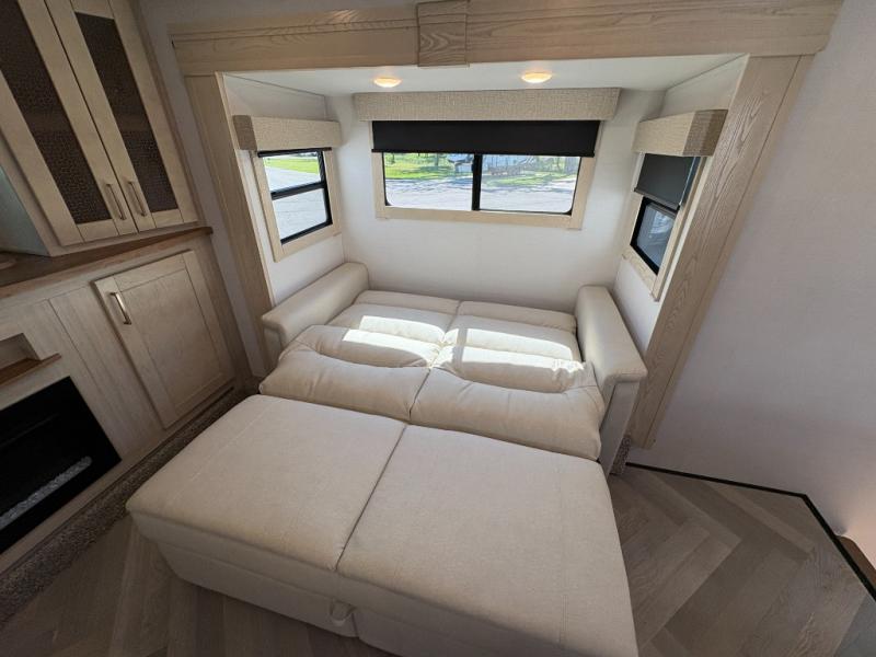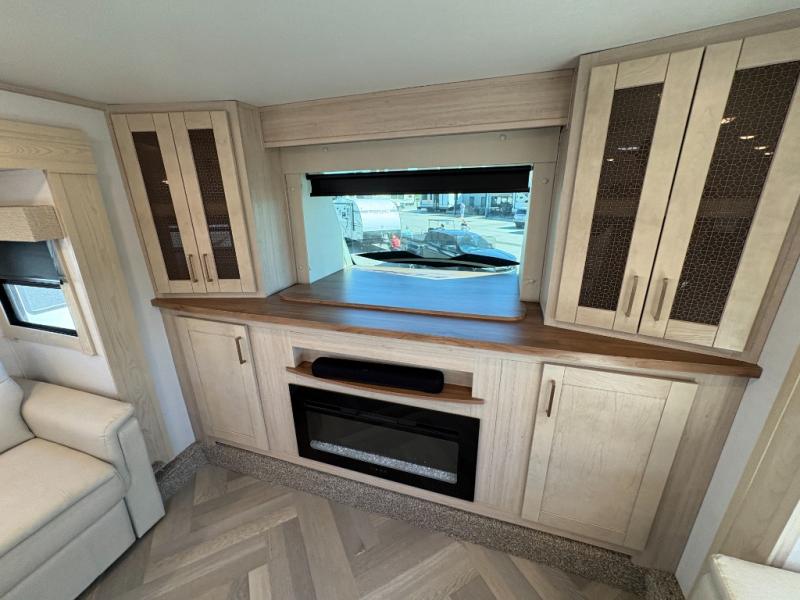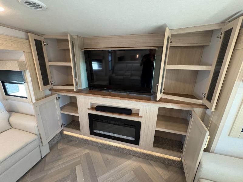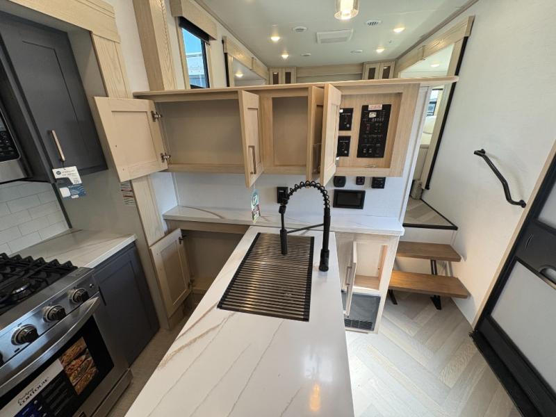 It's a clean decision with a bath and a half to take this fifth wheel on your next adventure! The front living area includes opposing EZ glide couches, 65" theater seating, and a front entertainment with a Smart LED pop up TV and fireplace for a cozy evening indoors. Prepare meals on the four burner cooktop, and leftovers can go in the 16 cu. ft. French door 12V refrigerator. You and your spouse will love the master suite that includes a king bed slide, plenty of storage space, and an entrance into the full rear bathroom with a dual sink vanity. There is even a linen closet with washer and dryer prep if you want to add those appliances!