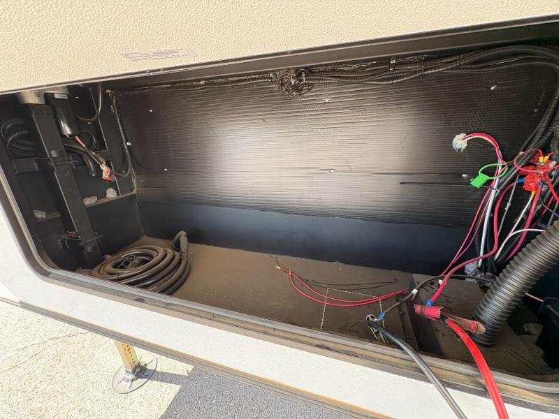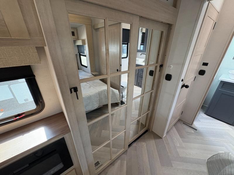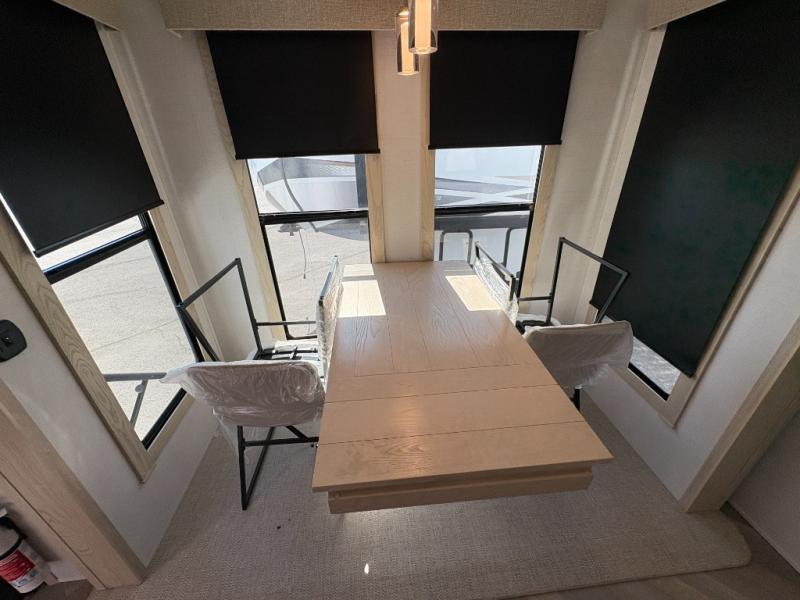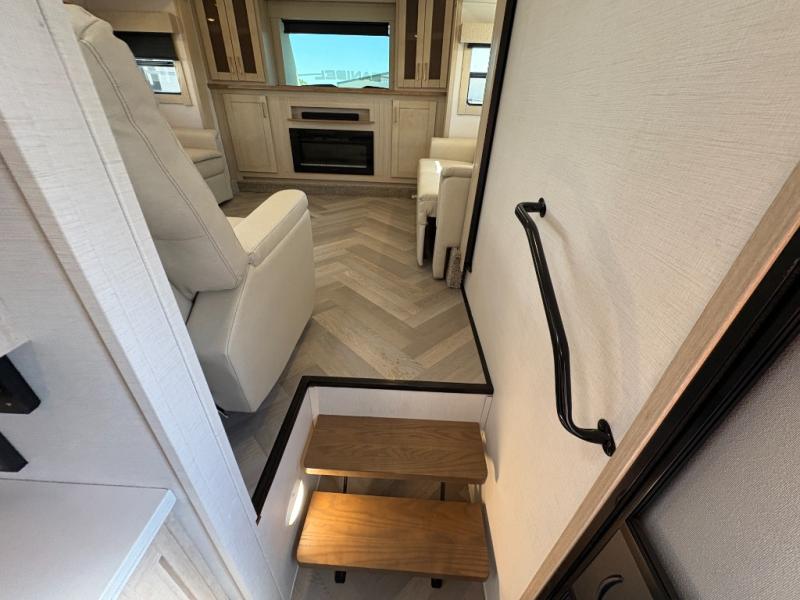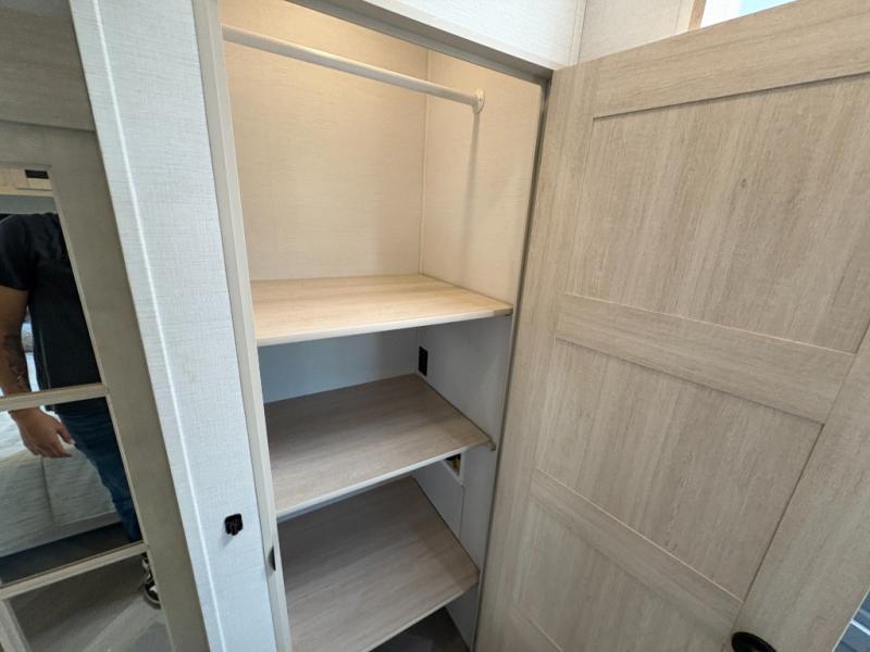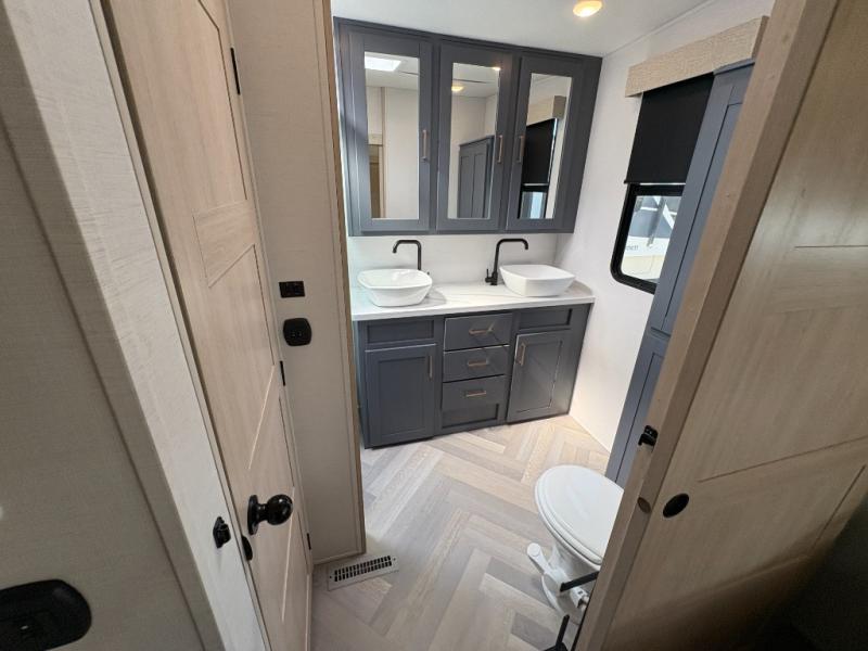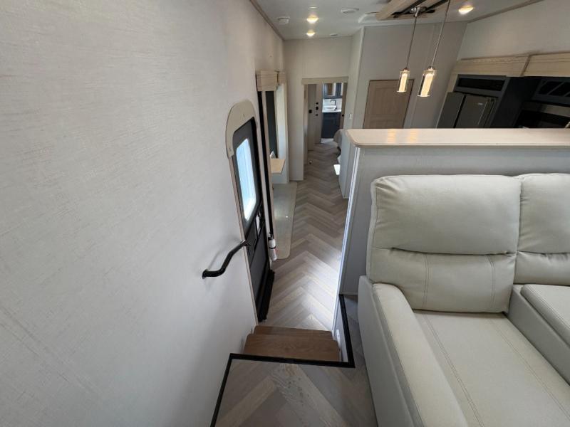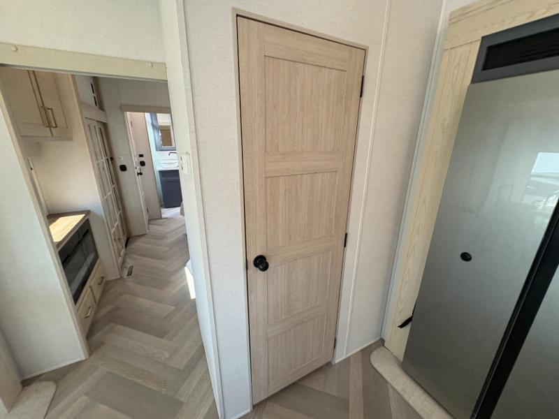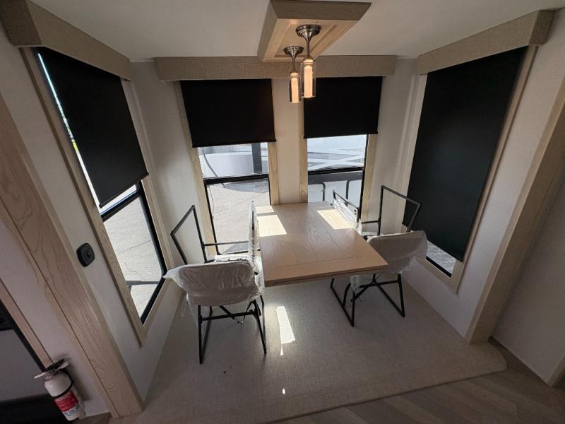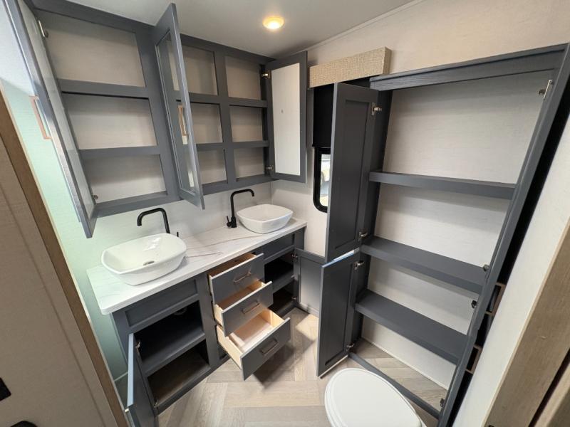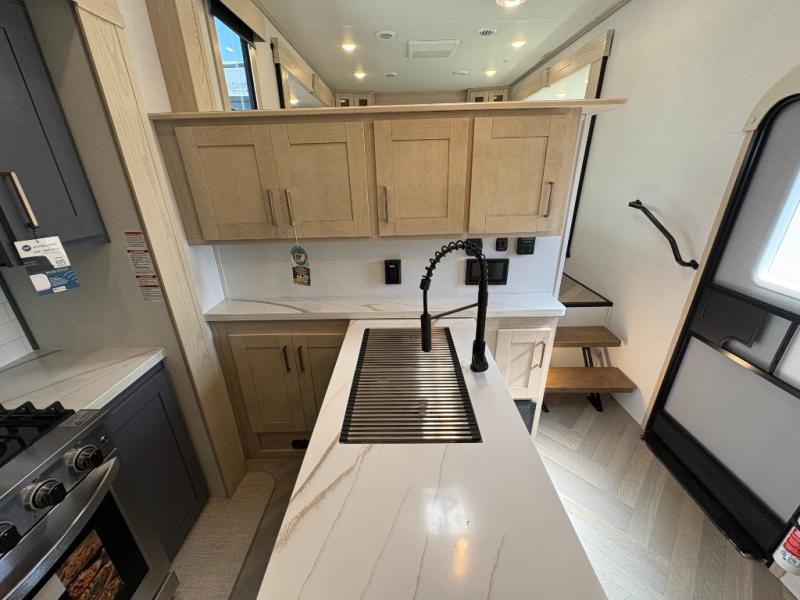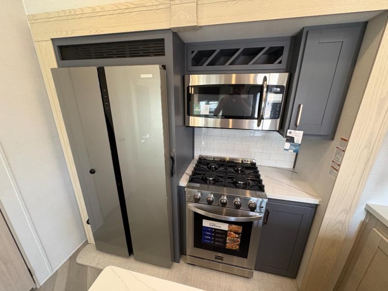 It's a clean decision with a bath and a half to take this fifth wheel on your next adventure! The front living area includes opposing EZ glide couches, 65" theater seating, and a front entertainment with a Smart LED pop up TV and fireplace for a cozy evening indoors. Prepare meals on the four burner cooktop, and leftovers can go in the 16 cu. ft. French door 12V refrigerator. You and your spouse will love the master suite that includes a king bed slide, plenty of storage space, and an entrance into the full rear bathroom with a dual sink vanity. There is even a linen closet with washer and dryer prep if you want to add those appliances!