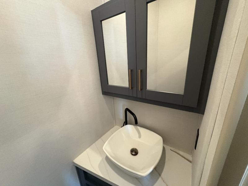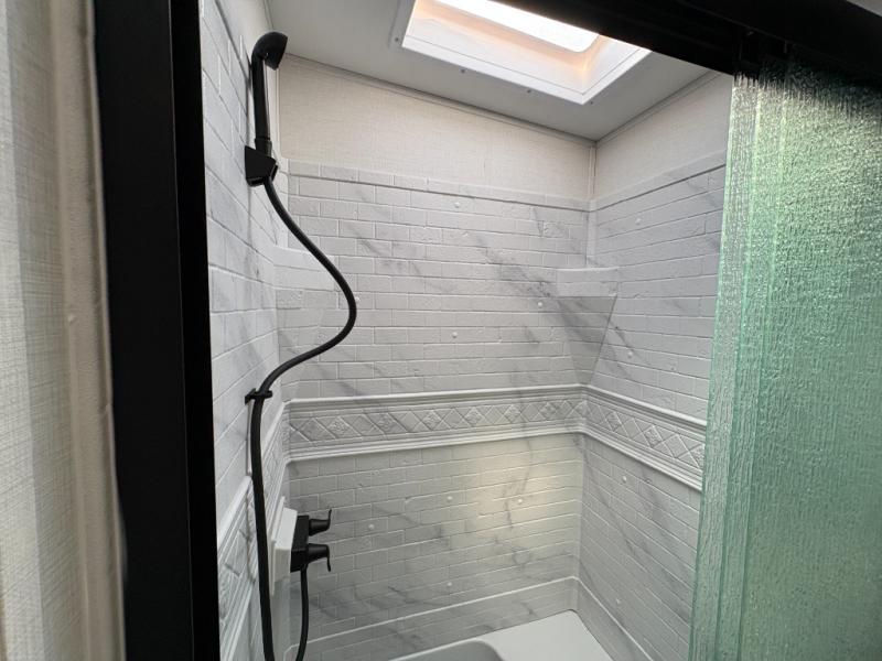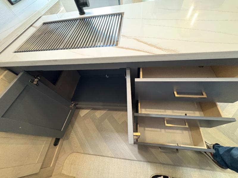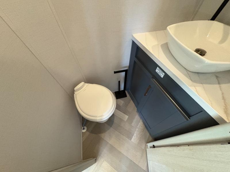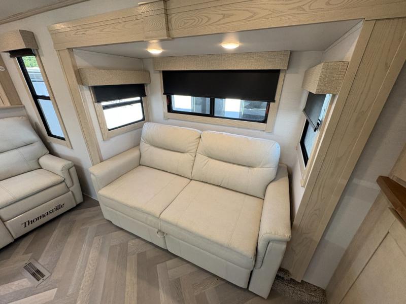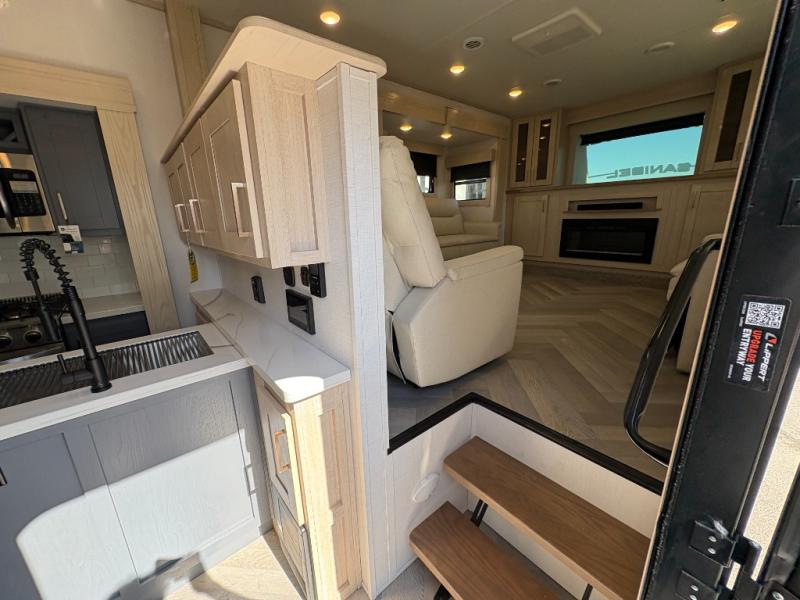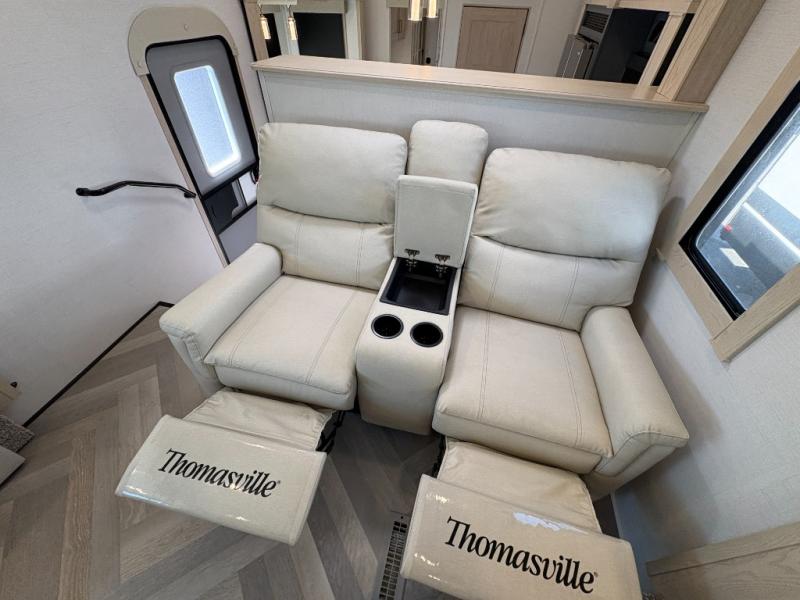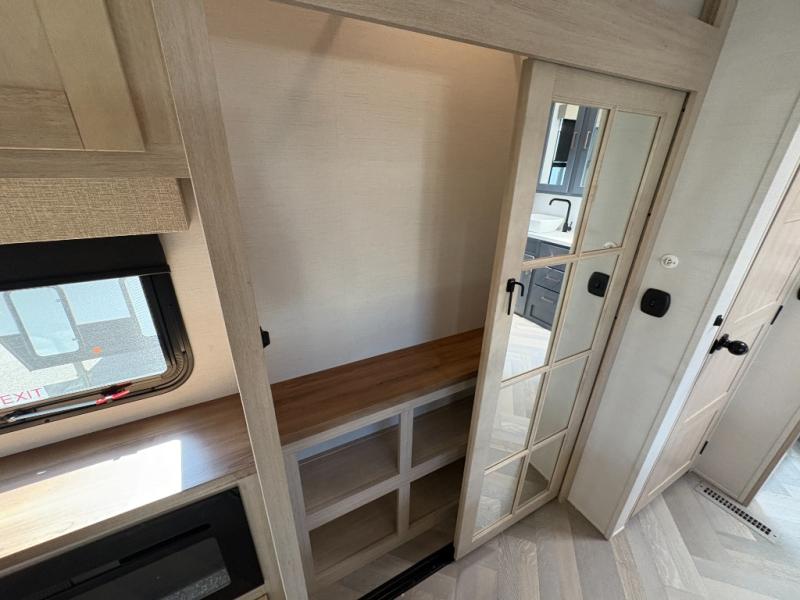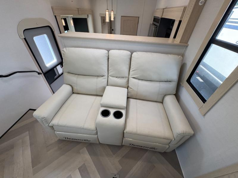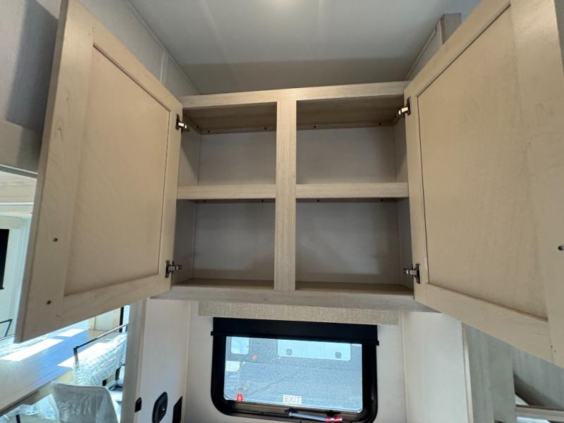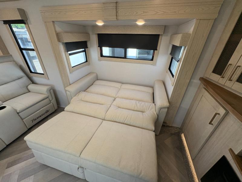 It's a clean decision with a bath and a half to take this fifth wheel on your next adventure! The front living area includes opposing EZ glide couches, 65" theater seating, and a front entertainment with a Smart LED pop up TV and fireplace for a cozy evening indoors. Prepare meals on the four burner cooktop, and leftovers can go in the 16 cu. ft. French door 12V refrigerator. You and your spouse will love the master suite that includes a king bed slide, plenty of storage space, and an entrance into the full rear bathroom with a dual sink vanity. There is even a linen closet with washer and dryer prep if you want to add those appliances!