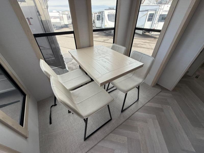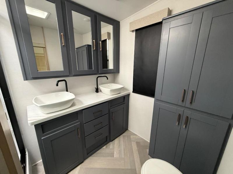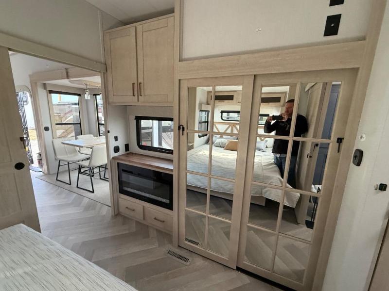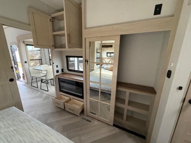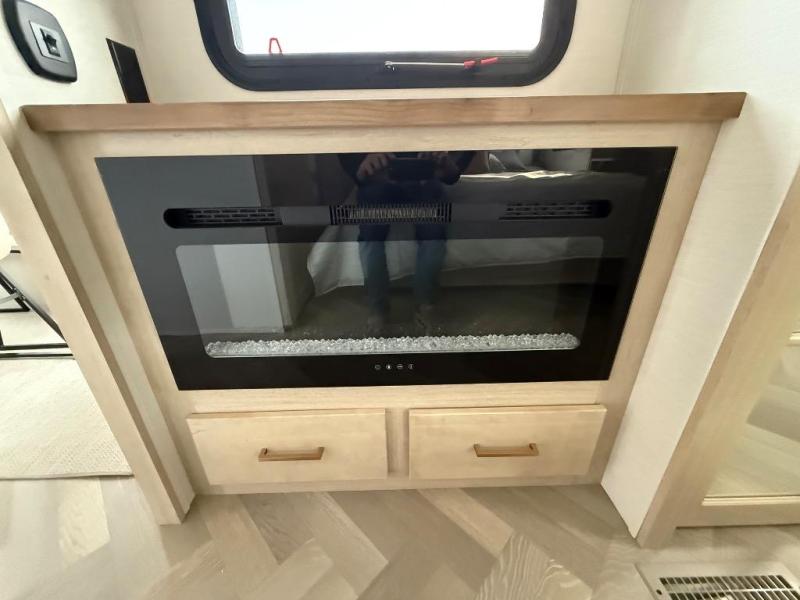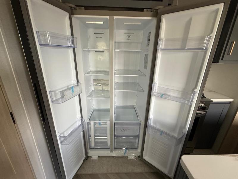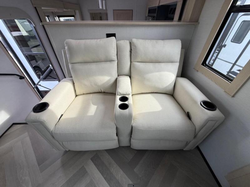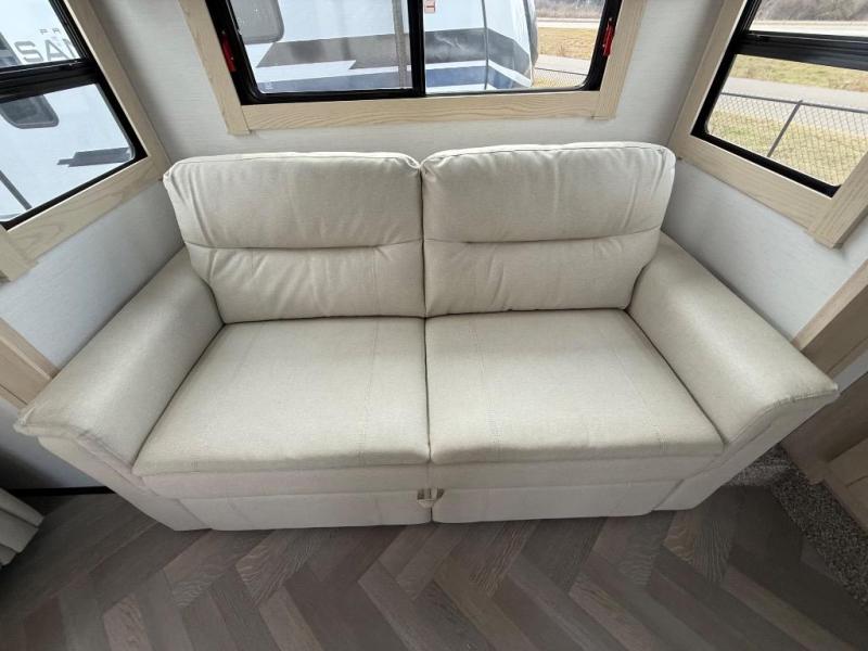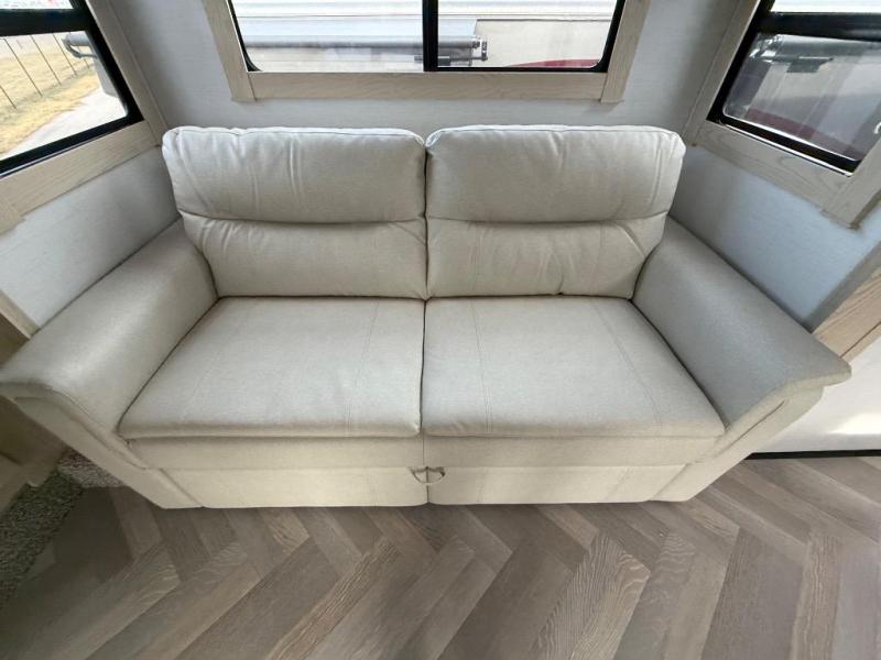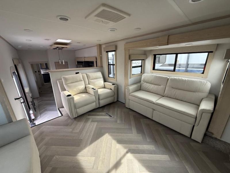 It's a clean decision with a bath and a half to take this fifth wheel on your next adventure! The front living area includes opposing EZ glide couches, 65" theater seating, and a front entertainment with a Smart LED pop up TV and fireplace for a cozy evening indoors. Prepare meals on the four burner cooktop, and leftovers can go in the 16 cu. ft. French door 12V refrigerator. You and your spouse will love the master suite that includes a king bed slide, plenty of storage space, and an entrance into the full rear bathroom with a dual sink vanity. There is even a linen closet with washer and dryer prep if you want to add those appliances!