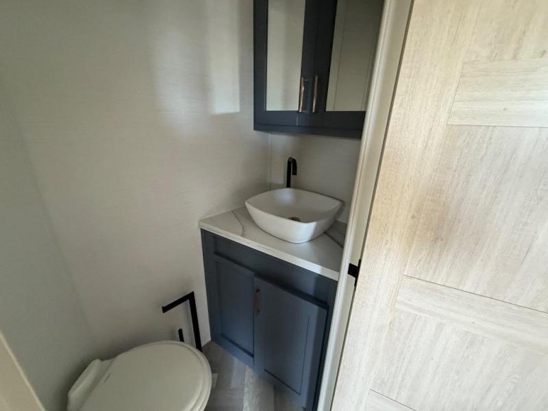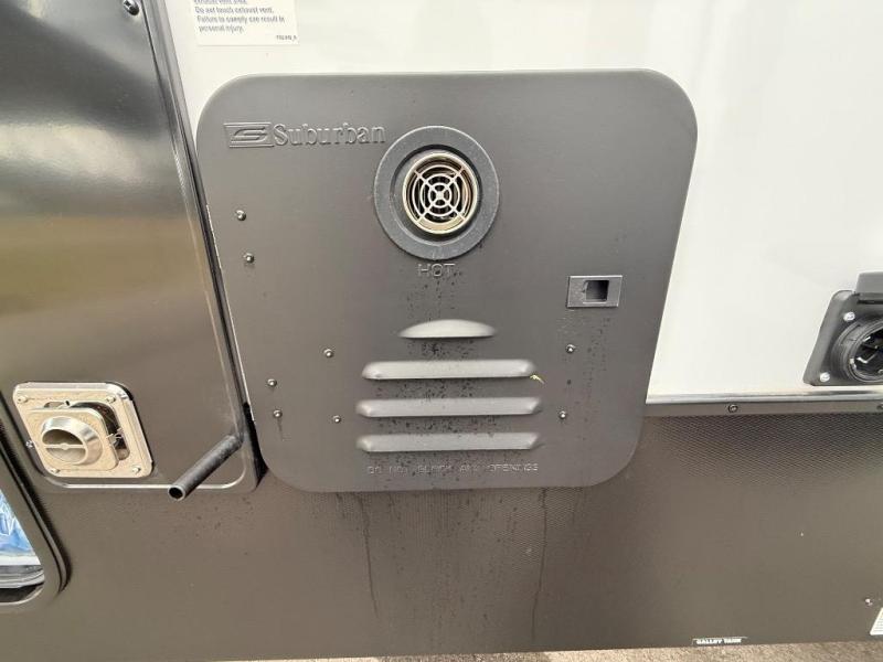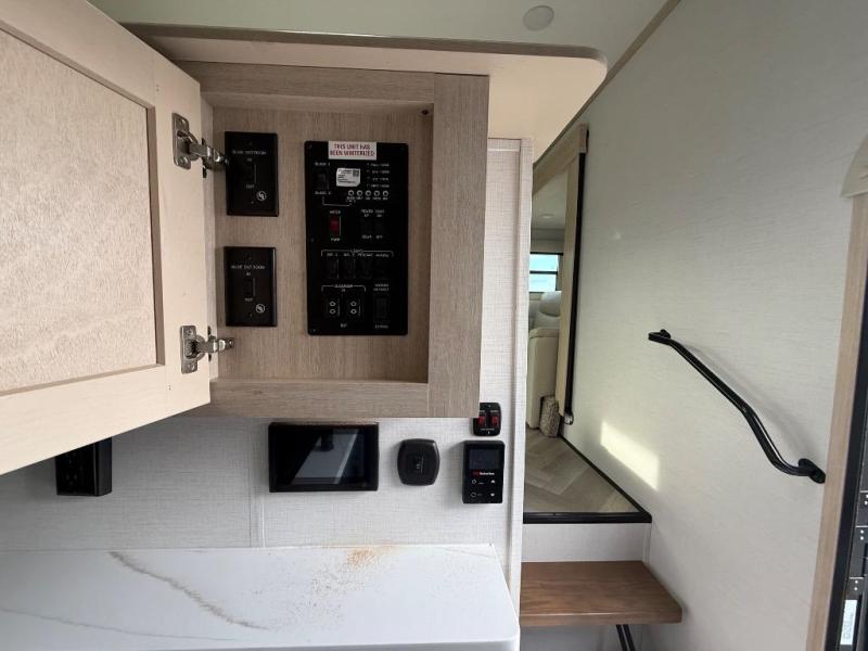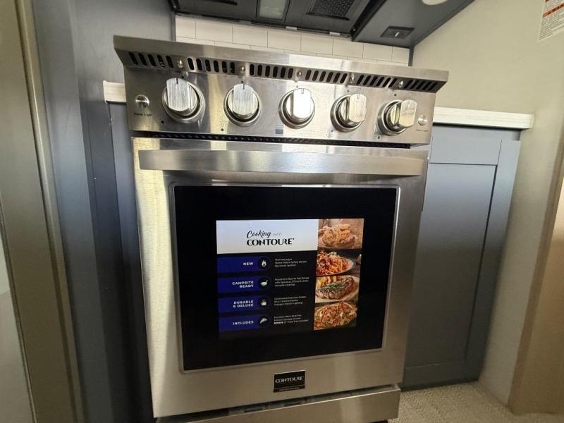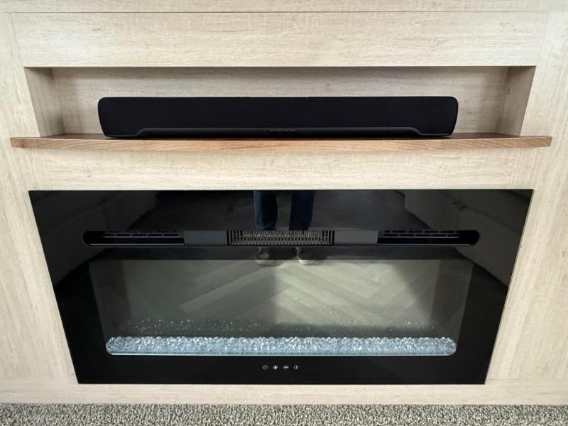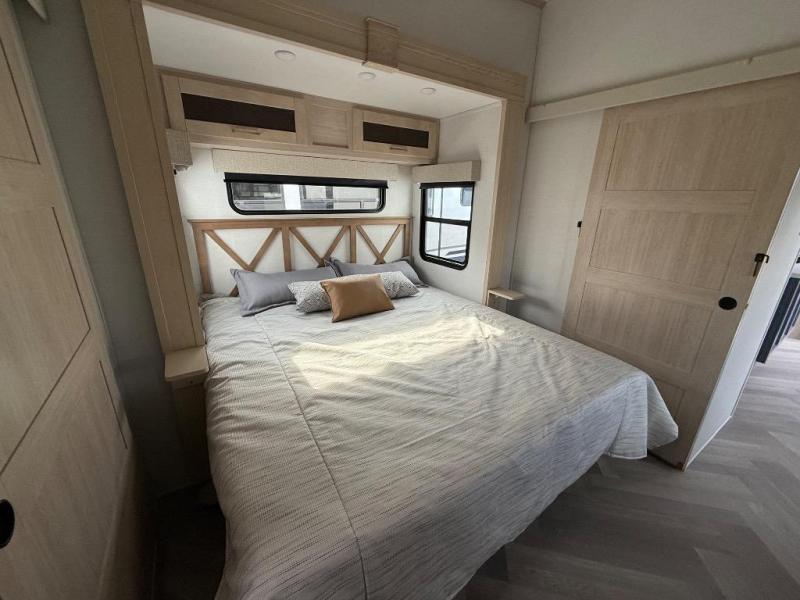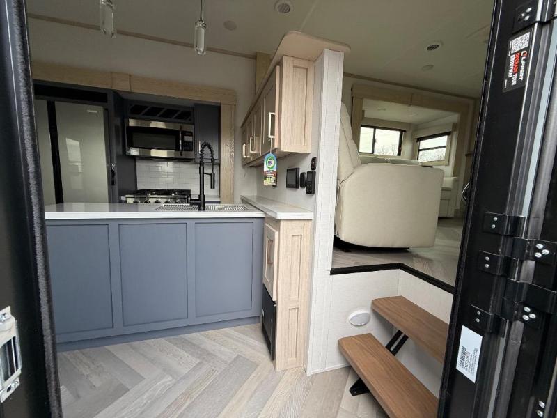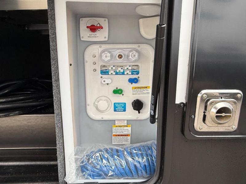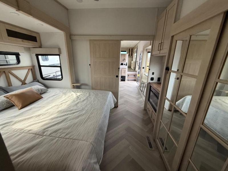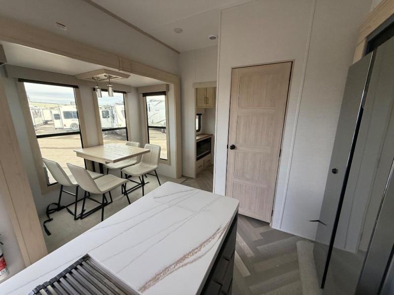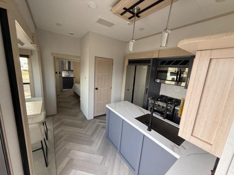 It's a clean decision with a bath and a half to take this fifth wheel on your next adventure! The front living area includes opposing EZ glide couches, 65" theater seating, and a front entertainment with a Smart LED pop up TV and fireplace for a cozy evening indoors. Prepare meals on the four burner cooktop, and leftovers can go in the 16 cu. ft. French door 12V refrigerator. You and your spouse will love the master suite that includes a king bed slide, plenty of storage space, and an entrance into the full rear bathroom with a dual sink vanity. There is even a linen closet with washer and dryer prep if you want to add those appliances!