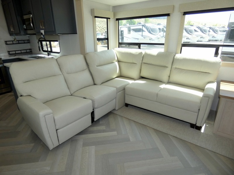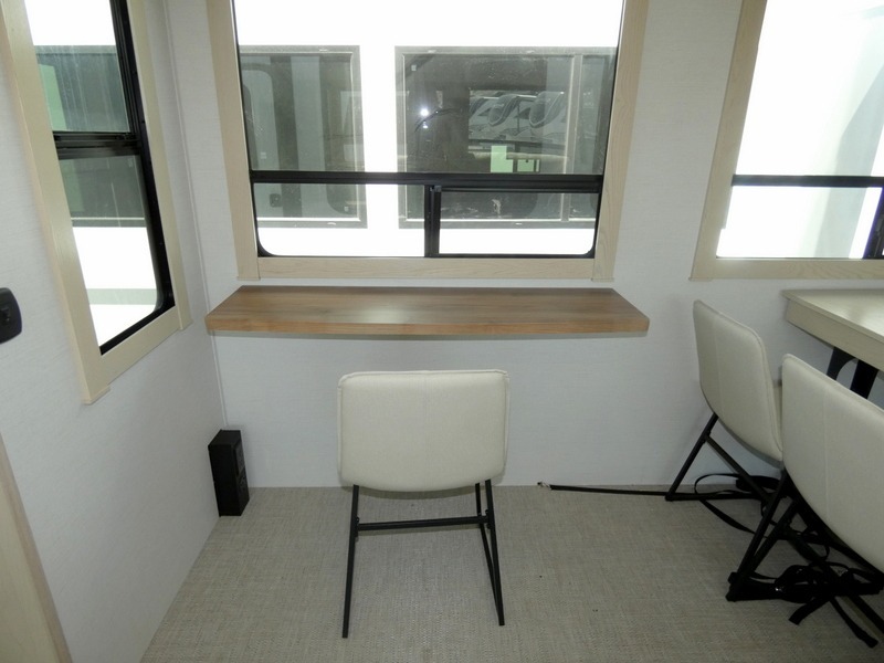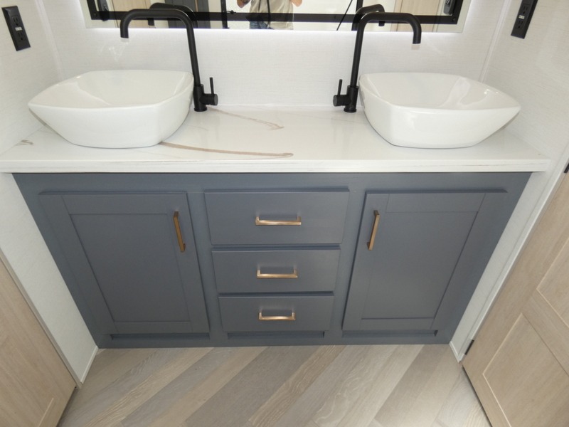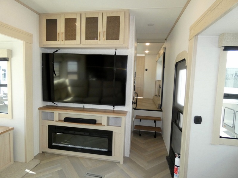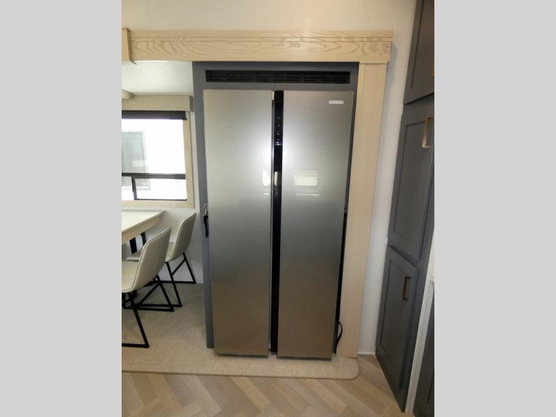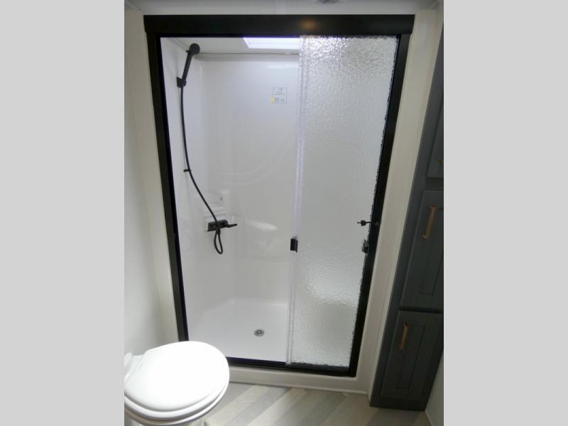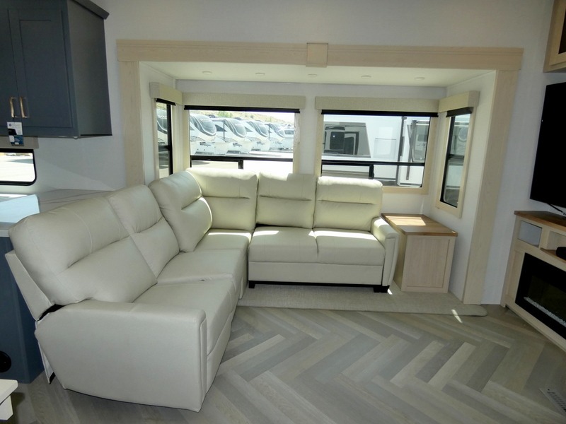 It will be so easy to enjoy extended stays or weekend trips in this spacious fifth wheel. You will love waking up in your private master bedroom that includes a king bed slide, bedroom wardrobe, and 40" TV. The front full bath includes dual bath sinks for added convenience and a large walk-in closet with clothes bars. If you have any guests stay over, they can sleep on the L-shaped easy glide sofa with a theater seat on one end. There is also a free-standing dinette with four chairs and a desk with a chair if you need to get some work done. The chef of your group will love the rear kitchen with a u-shaped counter, two kitchen pantries, and a 16 cu. ft. refrigerator for food storage. This model also includes a mid-coach half bath with washer and dryer prep if you choose to add those appliances!