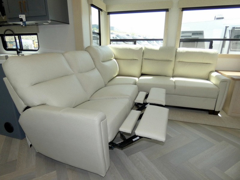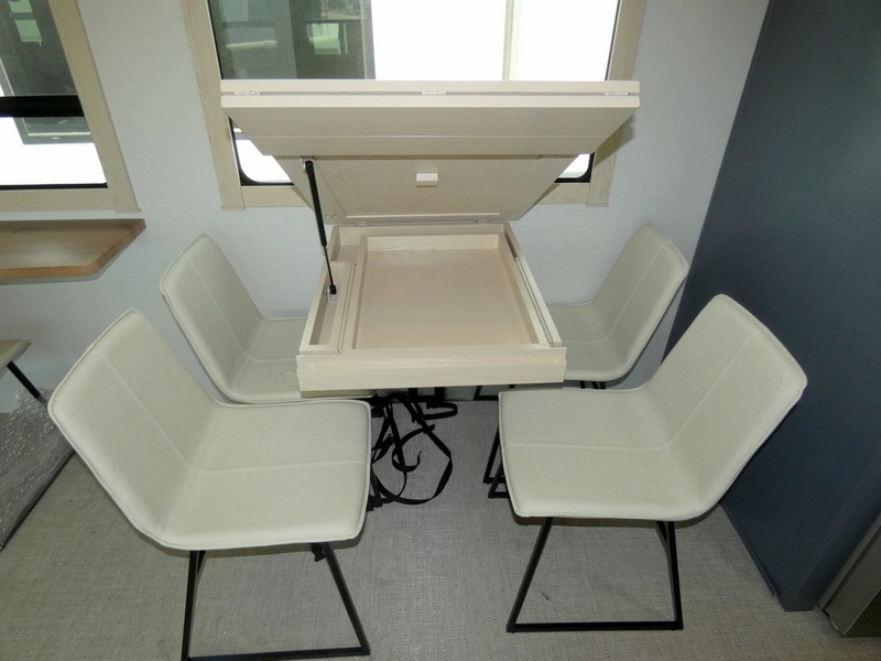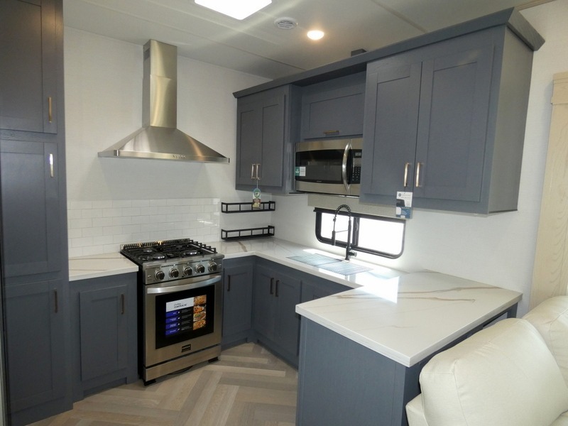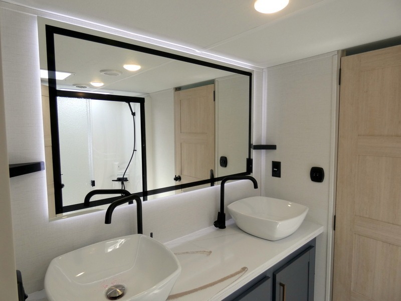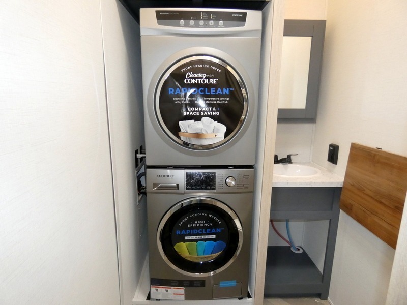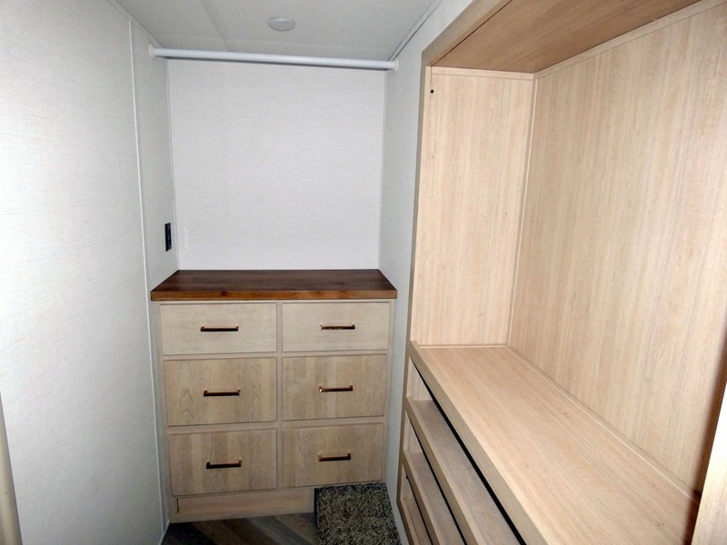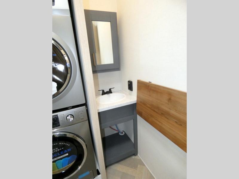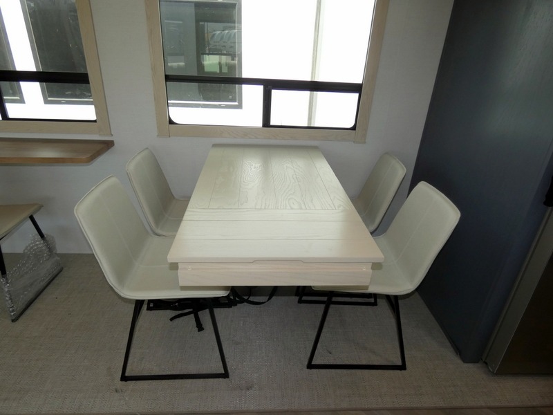 It will be so easy to enjoy extended stays or weekend trips in this spacious fifth wheel. You will love waking up in your private master bedroom that includes a king bed slide, bedroom wardrobe, and 40" TV. The front full bath includes dual bath sinks for added convenience and a large walk-in closet with clothes bars. If you have any guests stay over, they can sleep on the L-shaped easy glide sofa with a theater seat on one end. There is also a free-standing dinette with four chairs and a desk with a chair if you need to get some work done. The chef of your group will love the rear kitchen with a u-shaped counter, two kitchen pantries, and a 16 cu. ft. refrigerator for food storage. This model also includes a mid-coach half bath with washer and dryer prep if you choose to add those appliances!
