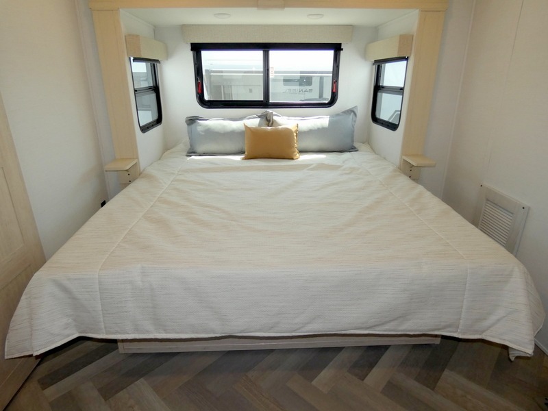 More luxury and more value is what you will find in each one of these Prime Time RV Sanibel fifth wheels! The Extreme Thermal package allows you to extend your camping season by including high density block foam insulation throughout, heated basement storage, and 12V heating pads on tanks. You can keep the party going with the electric awning with LED lighting and high-output exterior speaker, plus there is a Doggy D-Ring and bottle opener for added convenience. Each model also includes Dexter E-Z FLEX rubberized suspension to provide smooth towing on tougher roads, thick insulated pass-through baggage doors, and a high gloss gel coated exterior fiberglass for a more sleek look. Inside, you will enjoy residentially inspired kitchen appliances, real wood cabinet doors, designer Carefree linoleum with Scotchgard Technology, and many more luxurious features!