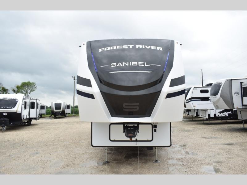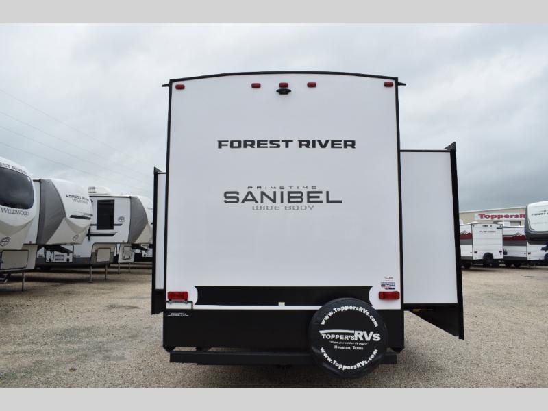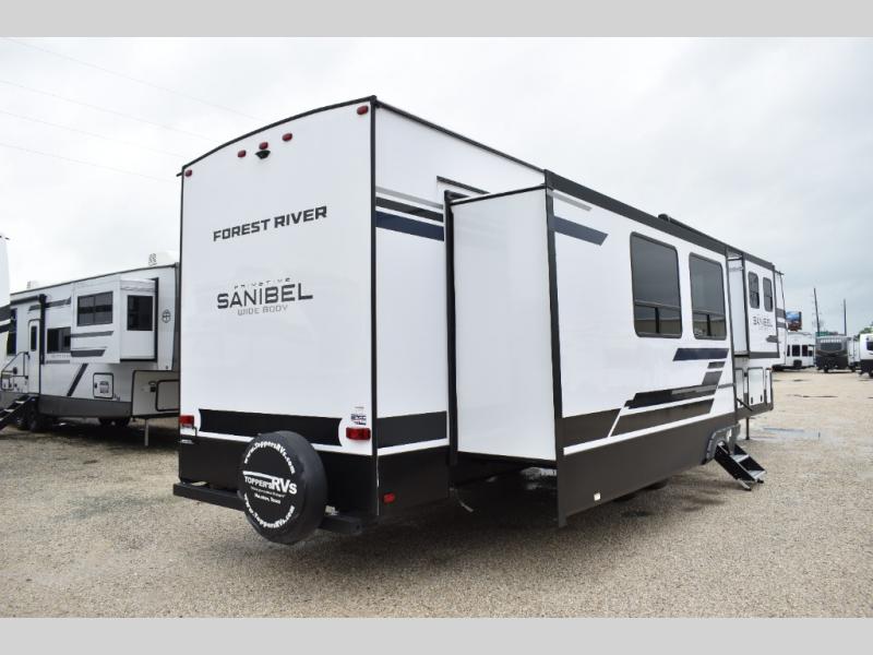 More luxury and more value is what you will find in each one of these Prime Time RV Sanibel fifth wheels! The Extreme Thermal package allows you to extend your camping season by including high density block foam insulation throughout, heated basement storage, and 12V heating pads on tanks. You can keep the party going with the electric awning with LED lighting and high-output exterior speaker, plus there is a Doggy D-Ring and bottle opener for added convenience. Each model also includes Dexter E-Z FLEX rubberized suspension to provide smooth towing on tougher roads, thick insulated pass-through baggage doors, and a high gloss gel coated exterior fiberglass for a more sleek look. Inside, you will enjoy residentially inspired kitchen appliances, real wood cabinet doors, designer Carefree linoleum with Scotchgard Technology, and many more luxurious features!
