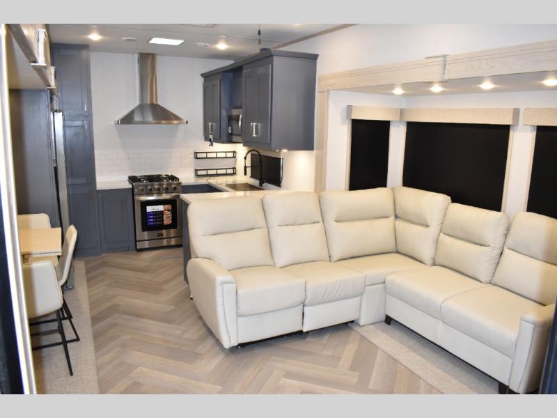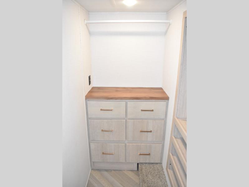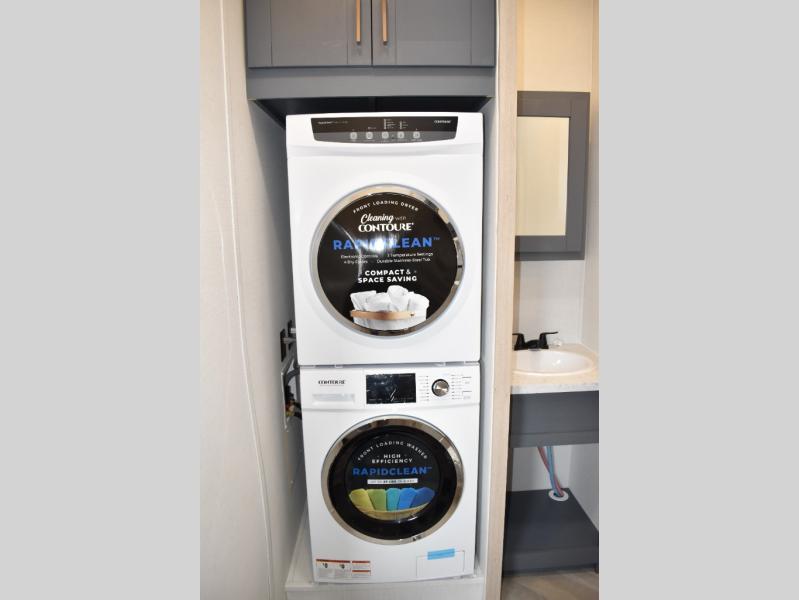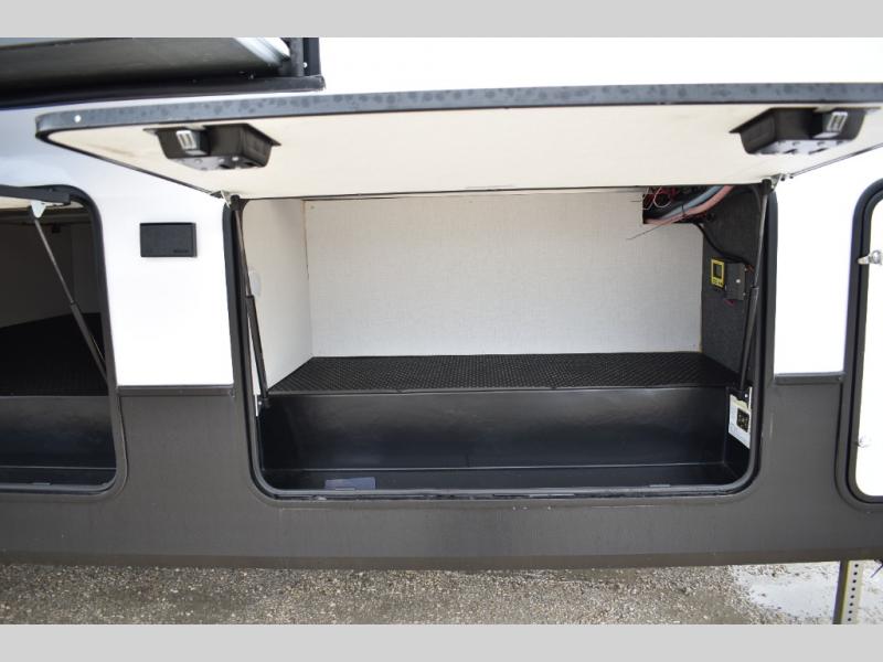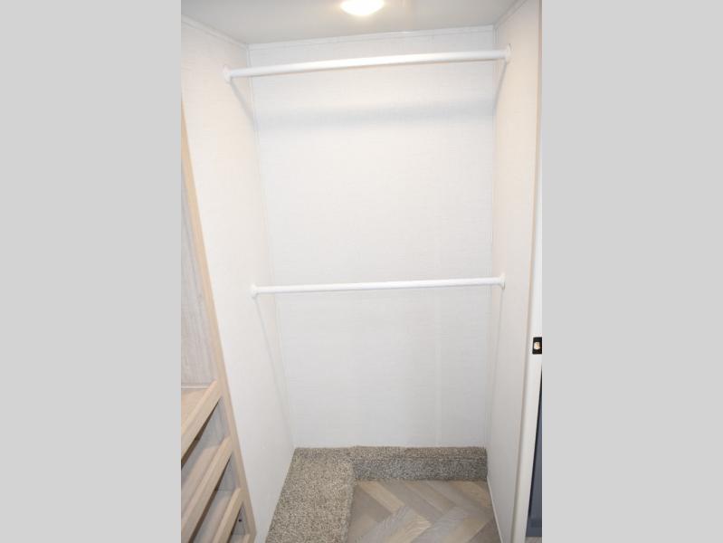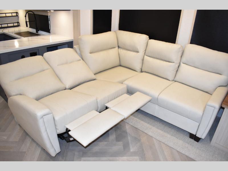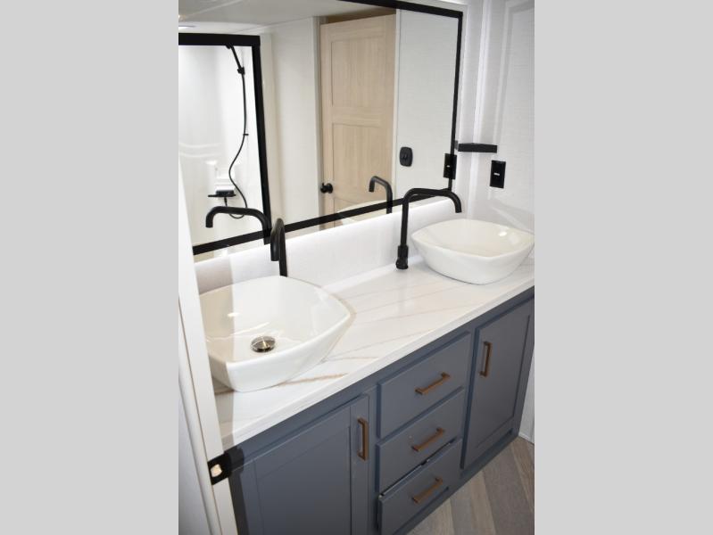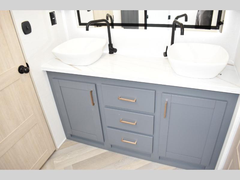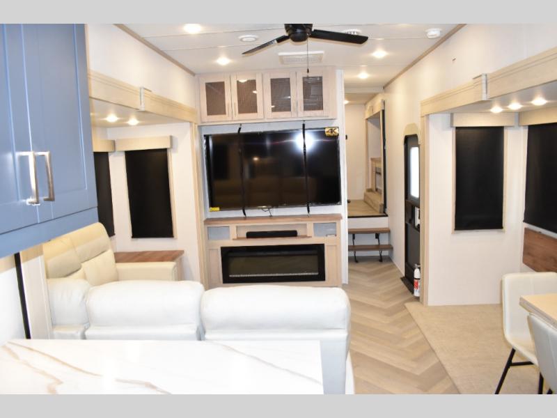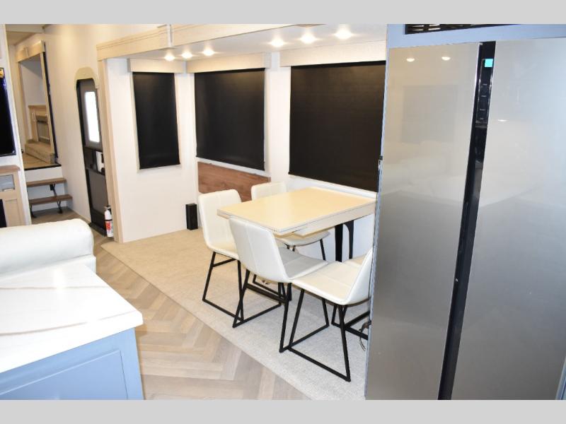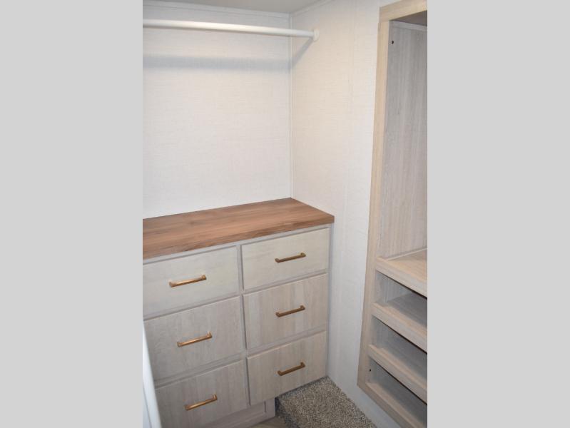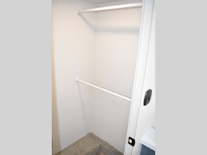 It will be so easy to enjoy extended stays or weekend trips in this spacious fifth wheel. You will love waking up in your private master bedroom that includes a king bed slide, bedroom wardrobe, and 40" TV. The front full bath includes dual bath sinks for added convenience and a large walk-in closet with clothes bars. If you have any guests stay over, they can sleep on the L-shaped easy glide sofa with a theater seat on one end. There is also a free-standing dinette with four chairs and a desk with a chair if you need to get some work done. The chef of your group will love the rear kitchen with a u-shaped counter, two kitchen pantries, and a 16 cu. ft. refrigerator for food storage. This model also includes a mid-coach half bath with washer and dryer prep if you choose to add those appliances!