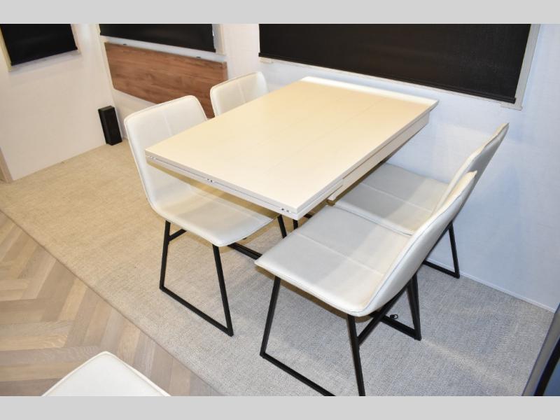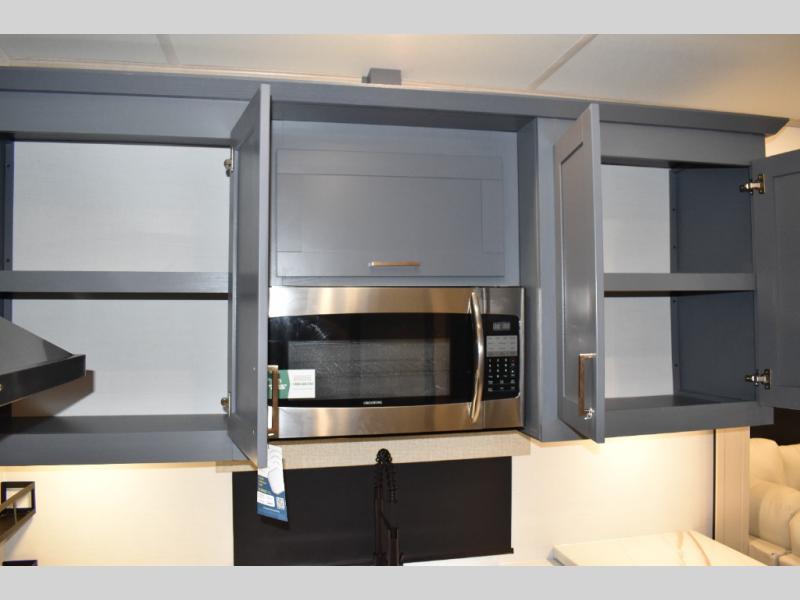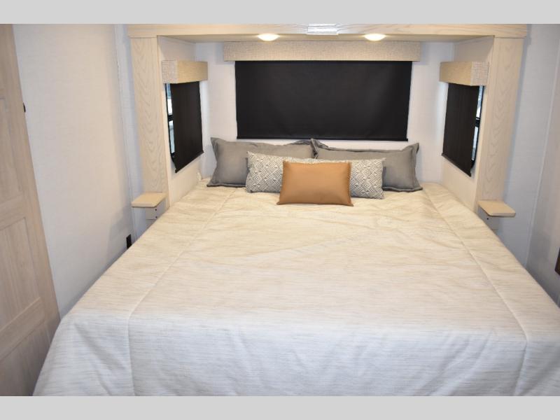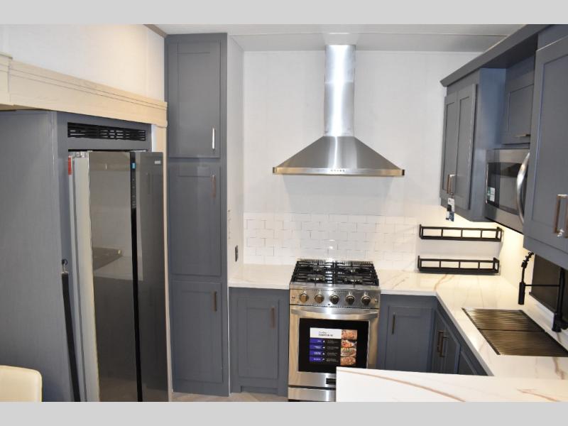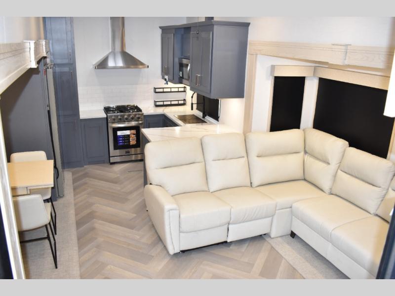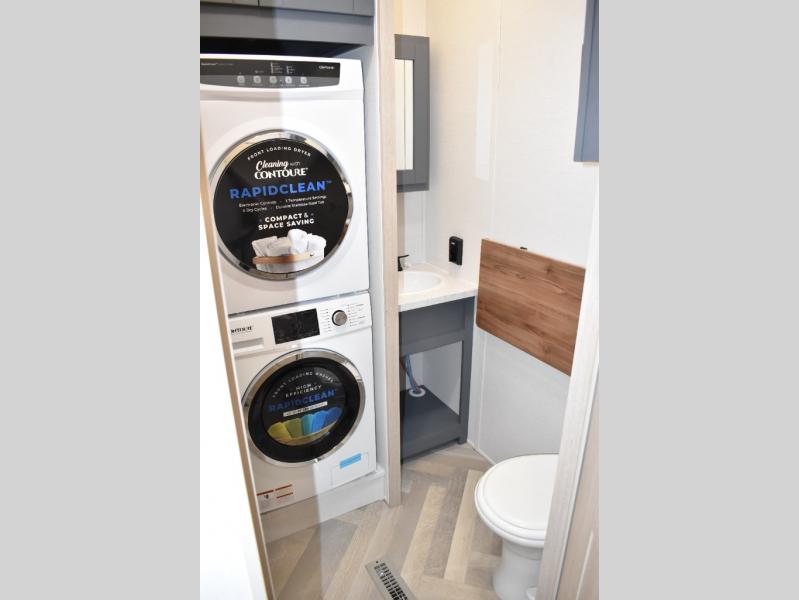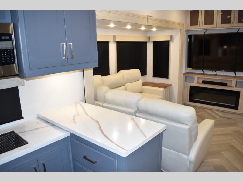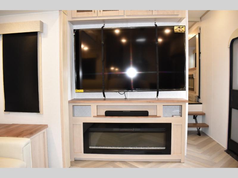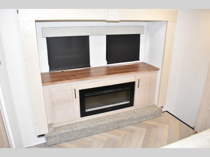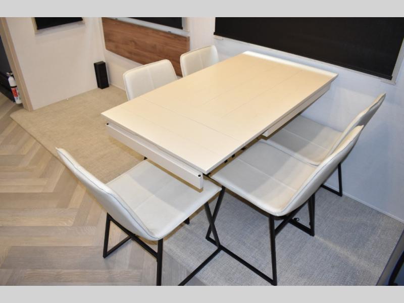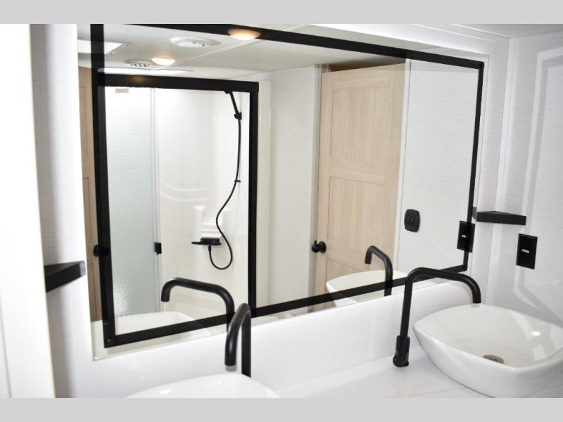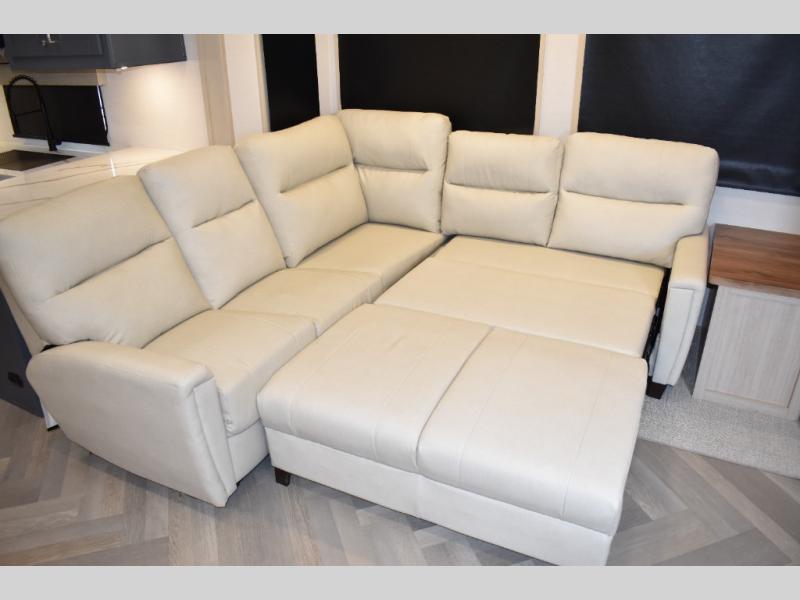 It will be so easy to enjoy extended stays or weekend trips in this spacious fifth wheel. You will love waking up in your private master bedroom that includes a king bed slide, bedroom wardrobe, and 40" TV. The front full bath includes dual bath sinks for added convenience and a large walk-in closet with clothes bars. If you have any guests stay over, they can sleep on the L-shaped easy glide sofa with a theater seat on one end. There is also a free-standing dinette with four chairs and a desk with a chair if you need to get some work done. The chef of your group will love the rear kitchen with a u-shaped counter, two kitchen pantries, and a 16 cu. ft. refrigerator for food storage. This model also includes a mid-coach half bath with washer and dryer prep if you choose to add those appliances!