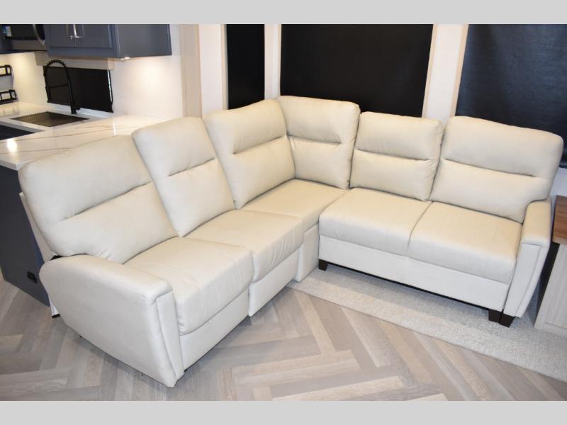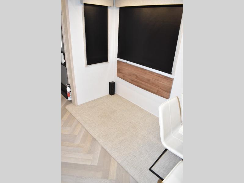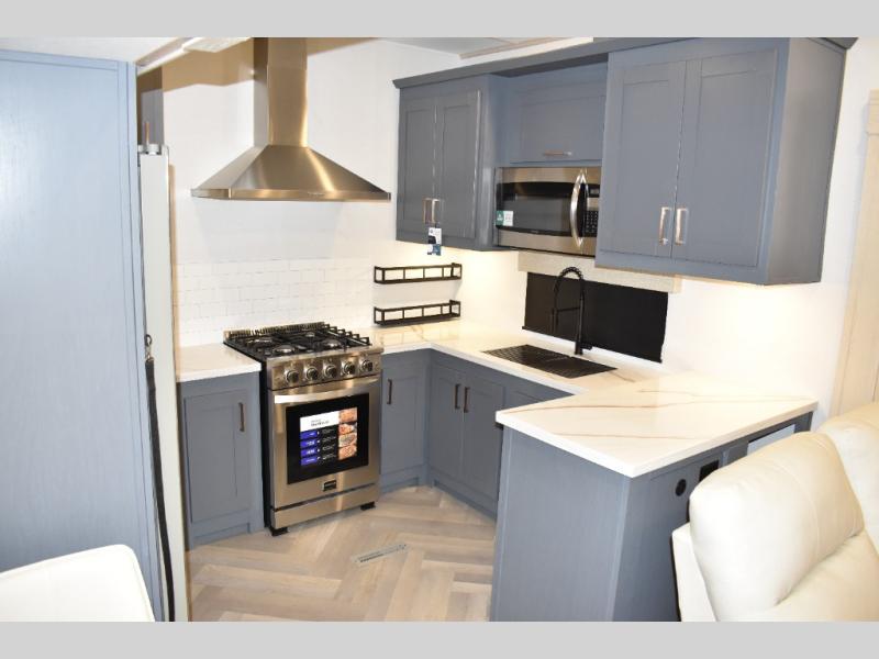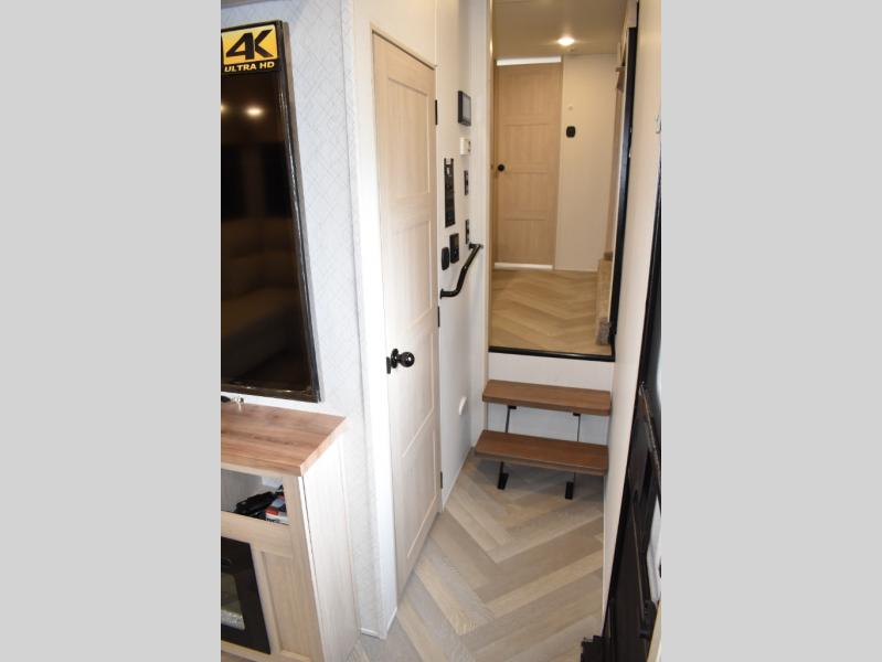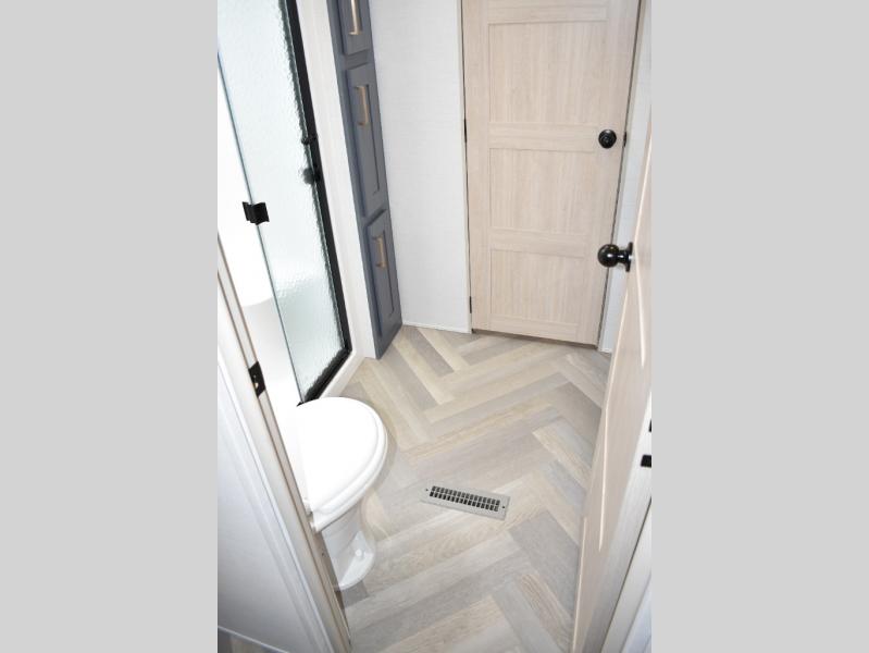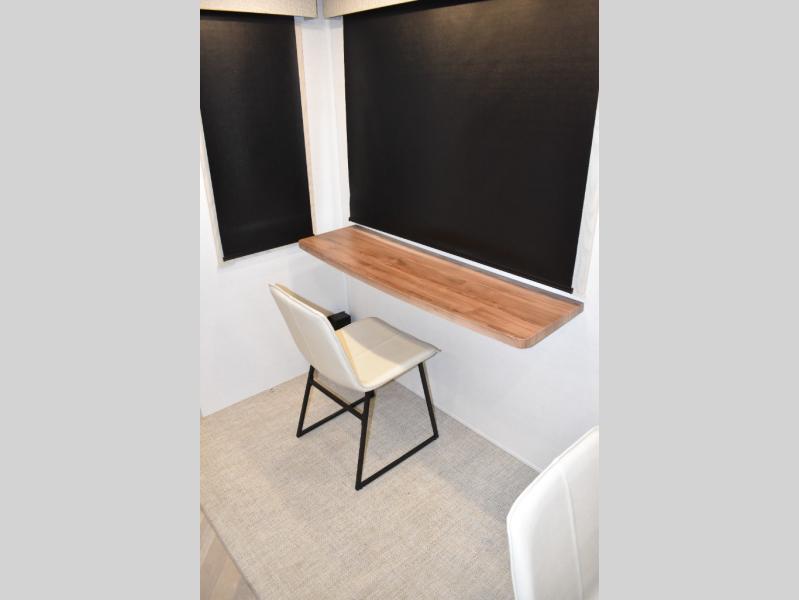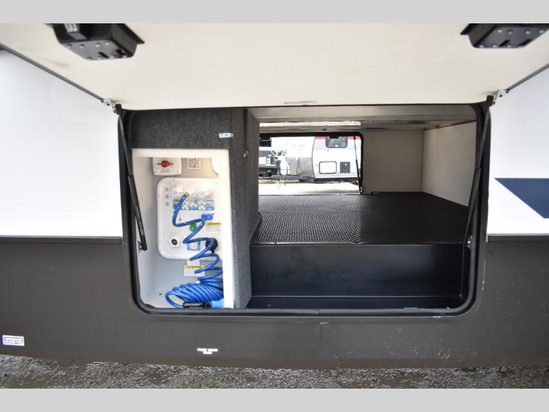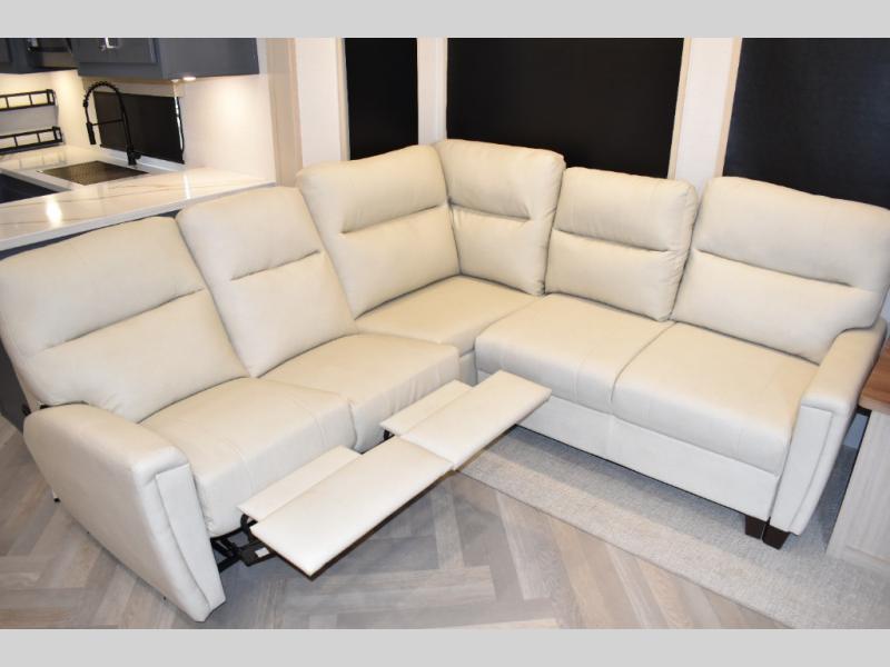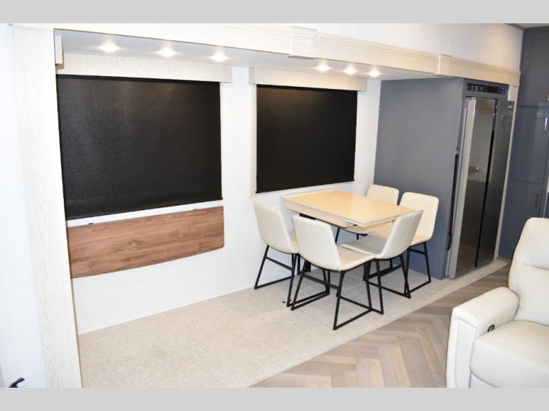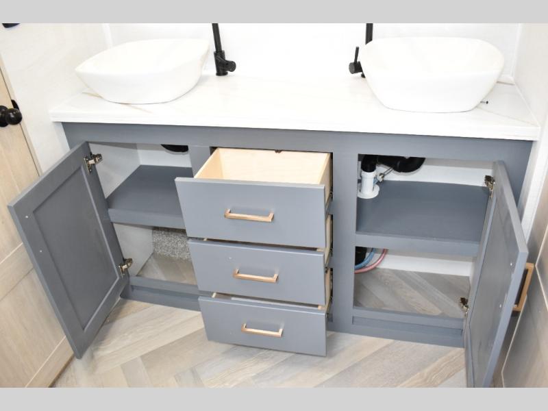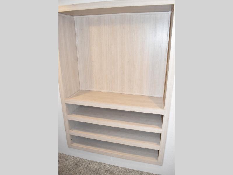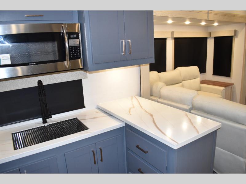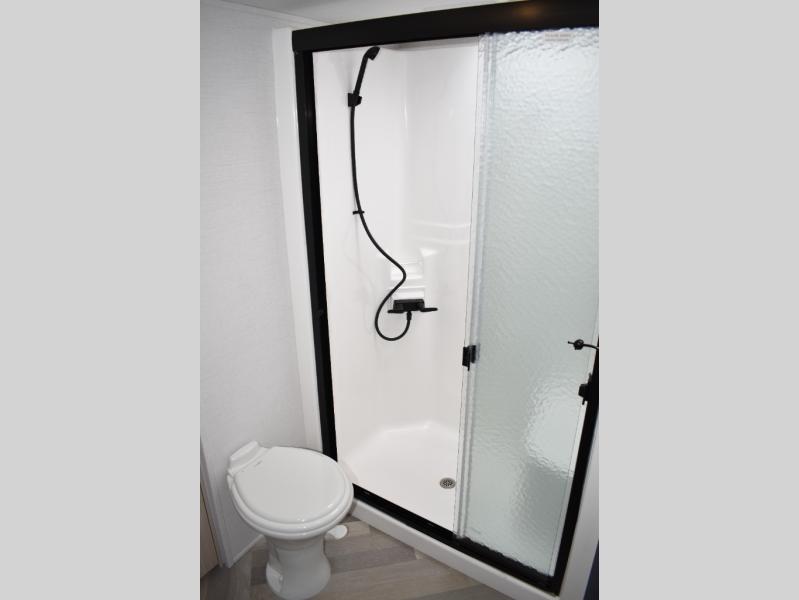 It will be so easy to enjoy extended stays or weekend trips in this spacious fifth wheel. You will love waking up in your private master bedroom that includes a king bed slide, bedroom wardrobe, and 40" TV. The front full bath includes dual bath sinks for added convenience and a large walk-in closet with clothes bars. If you have any guests stay over, they can sleep on the L-shaped easy glide sofa with a theater seat on one end. There is also a free-standing dinette with four chairs and a desk with a chair if you need to get some work done. The chef of your group will love the rear kitchen with a u-shaped counter, two kitchen pantries, and a 16 cu. ft. refrigerator for food storage. This model also includes a mid-coach half bath with washer and dryer prep if you choose to add those appliances!