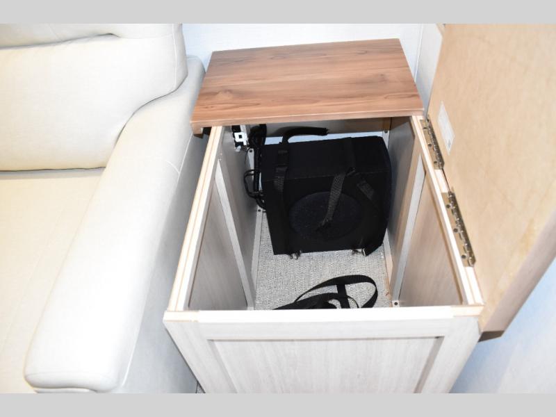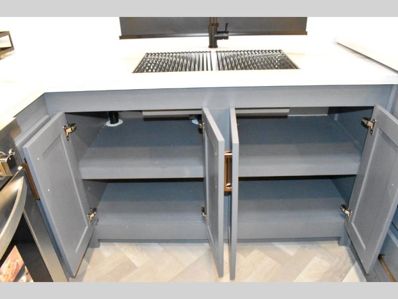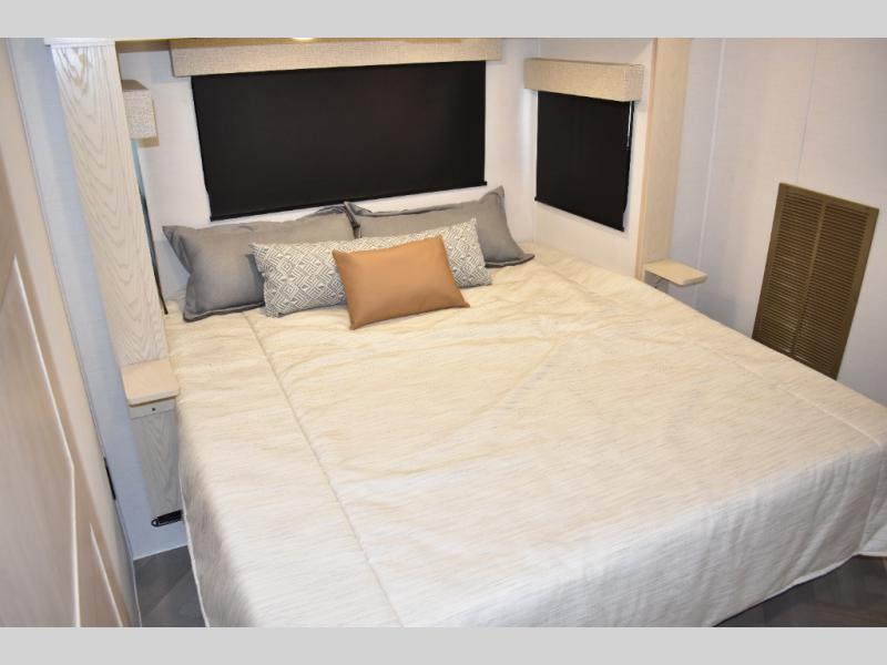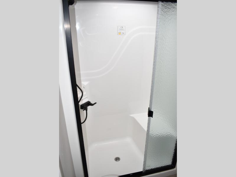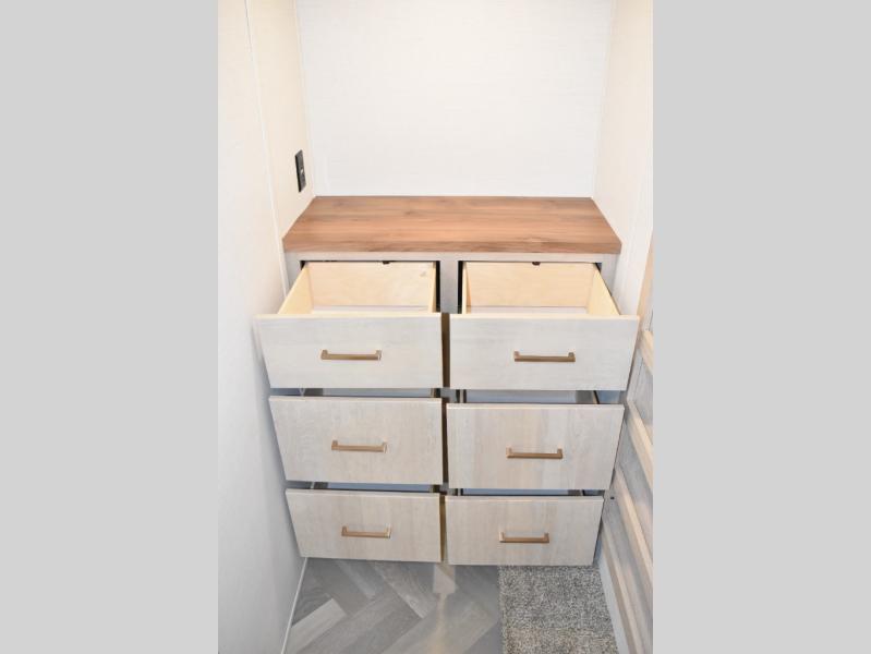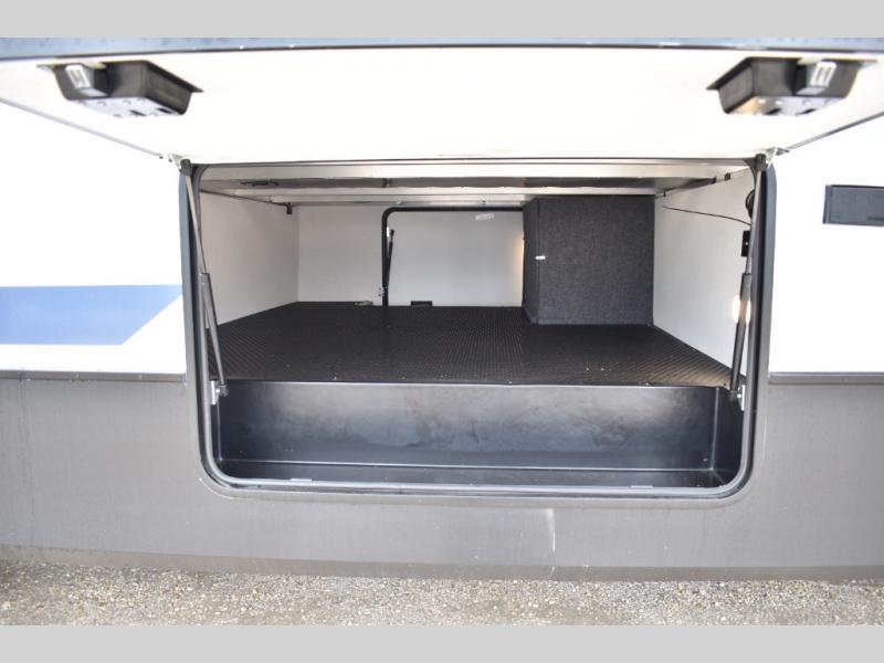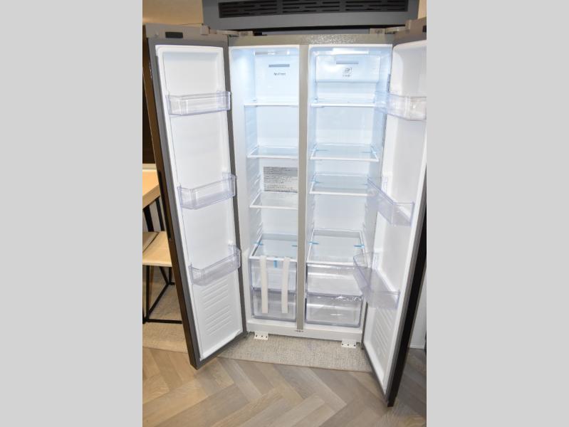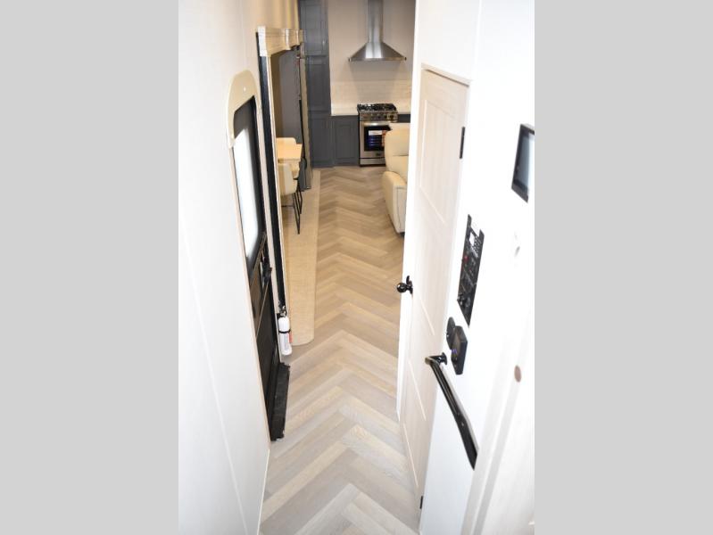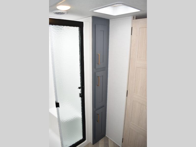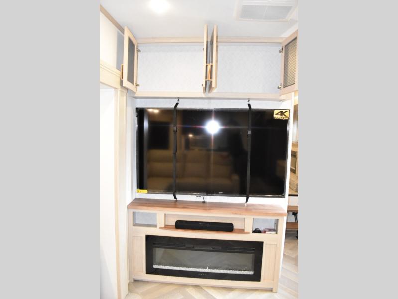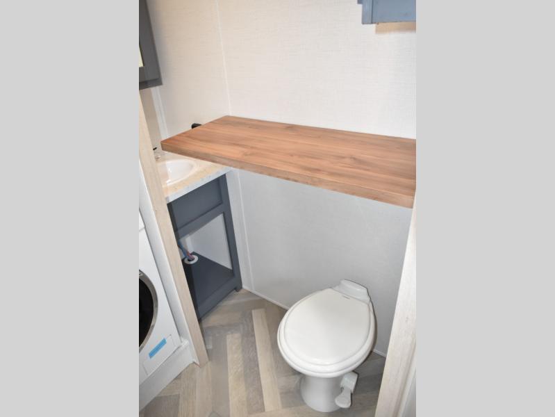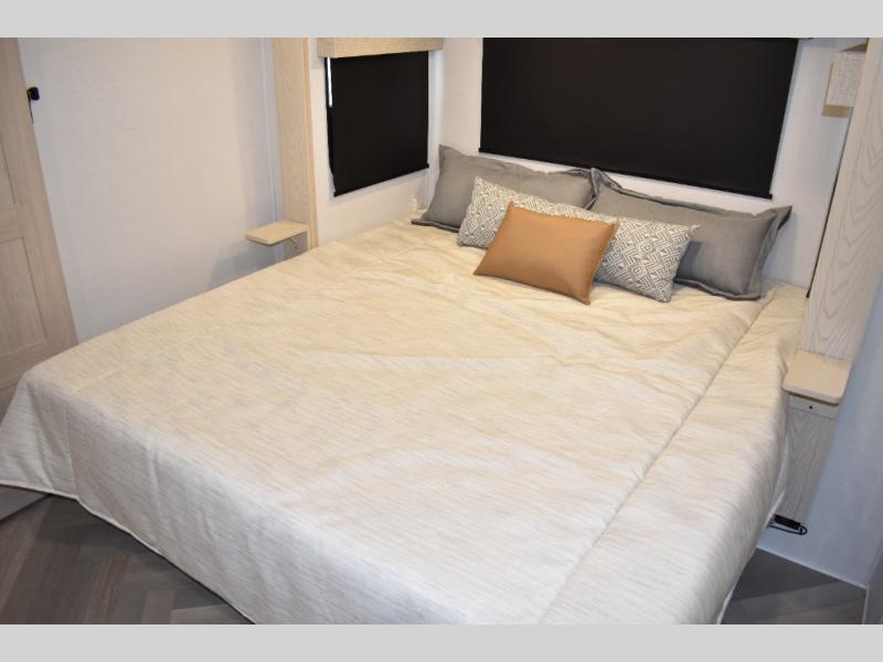 It will be so easy to enjoy extended stays or weekend trips in this spacious fifth wheel. You will love waking up in your private master bedroom that includes a king bed slide, bedroom wardrobe, and 40" TV. The front full bath includes dual bath sinks for added convenience and a large walk-in closet with clothes bars. If you have any guests stay over, they can sleep on the L-shaped easy glide sofa with a theater seat on one end. There is also a free-standing dinette with four chairs and a desk with a chair if you need to get some work done. The chef of your group will love the rear kitchen with a u-shaped counter, two kitchen pantries, and a 16 cu. ft. refrigerator for food storage. This model also includes a mid-coach half bath with washer and dryer prep if you choose to add those appliances!