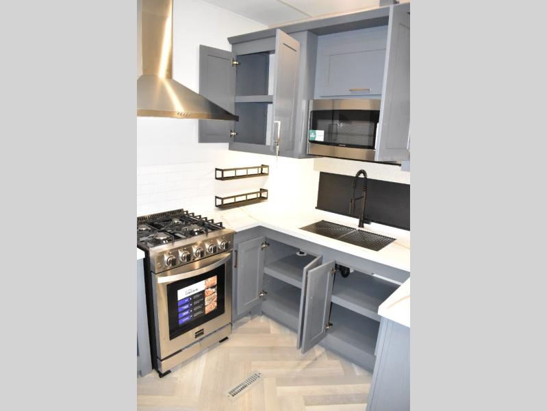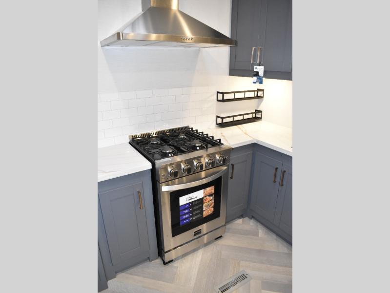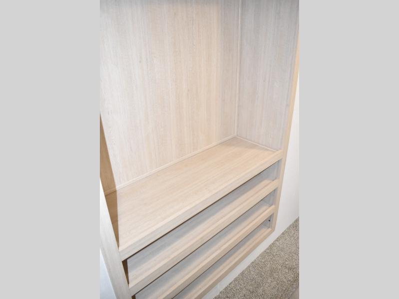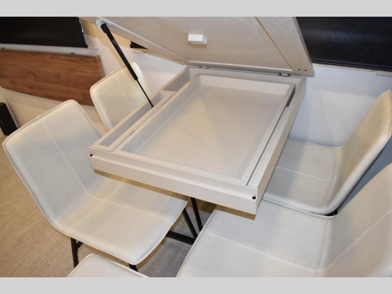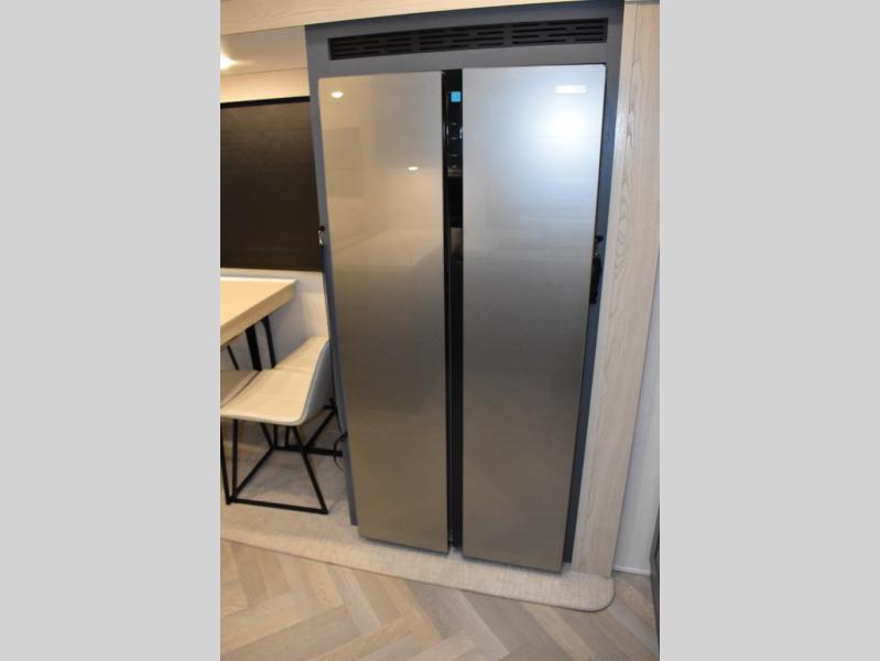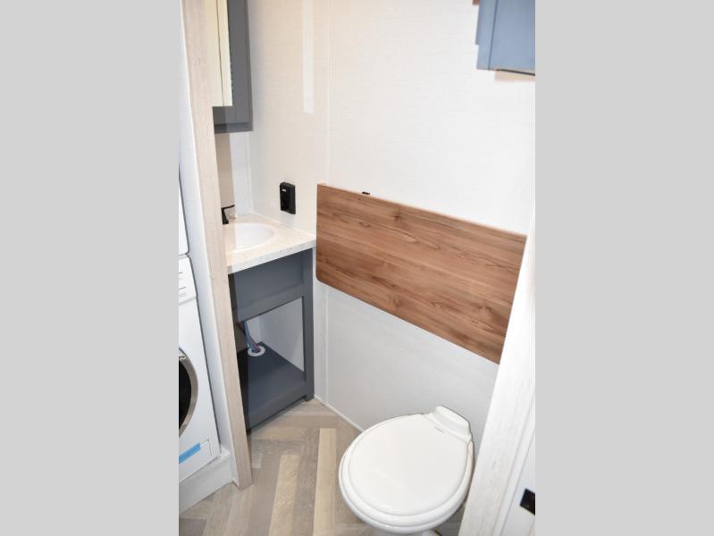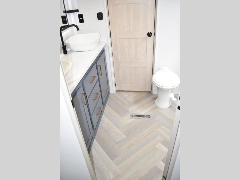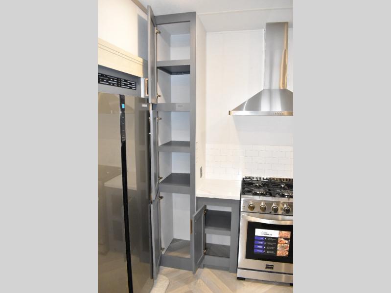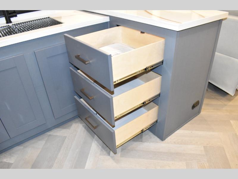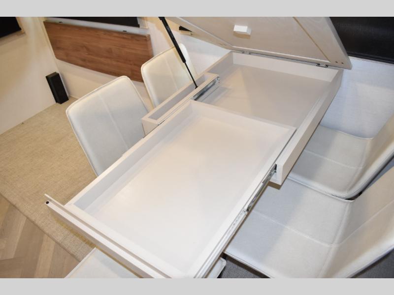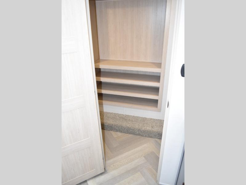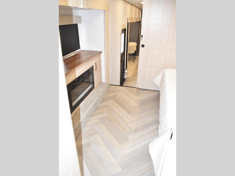 It will be so easy to enjoy extended stays or weekend trips in this spacious fifth wheel. You will love waking up in your private master bedroom that includes a king bed slide, bedroom wardrobe, and 40" TV. The front full bath includes dual bath sinks for added convenience and a large walk-in closet with clothes bars. If you have any guests stay over, they can sleep on the L-shaped easy glide sofa with a theater seat on one end. There is also a free-standing dinette with four chairs and a desk with a chair if you need to get some work done. The chef of your group will love the rear kitchen with a u-shaped counter, two kitchen pantries, and a 16 cu. ft. refrigerator for food storage. This model also includes a mid-coach half bath with washer and dryer prep if you choose to add those appliances!