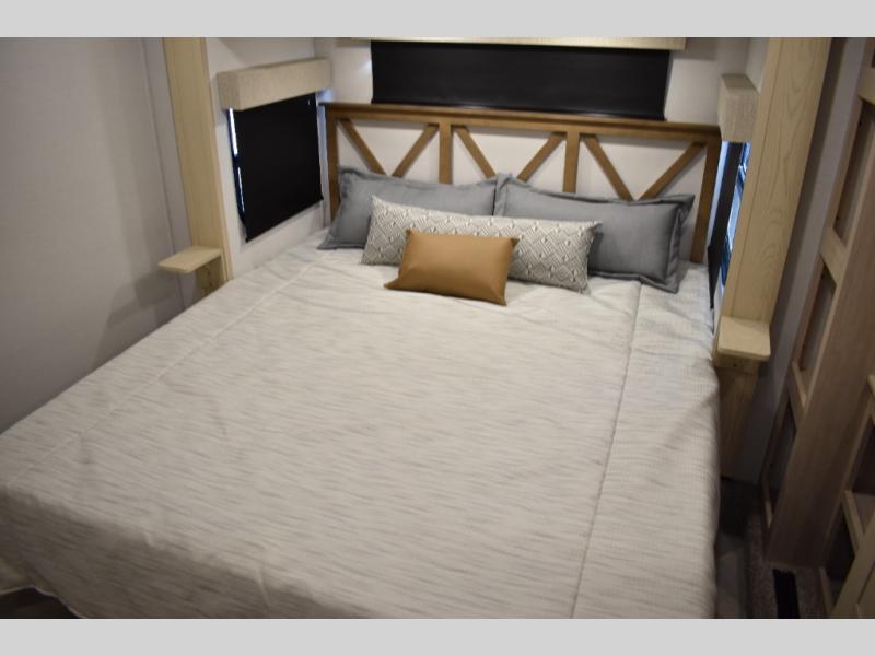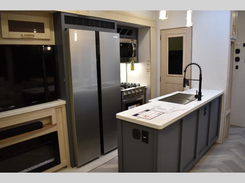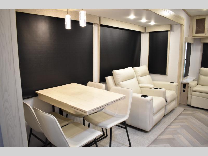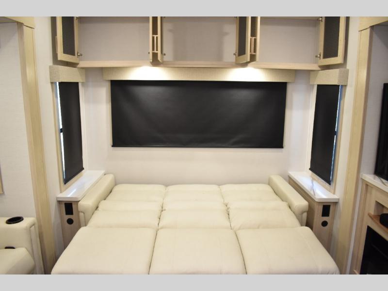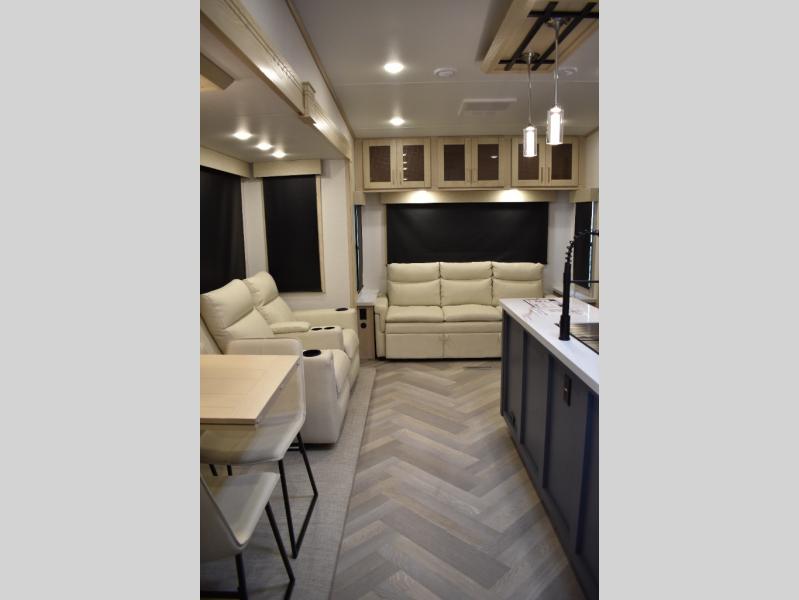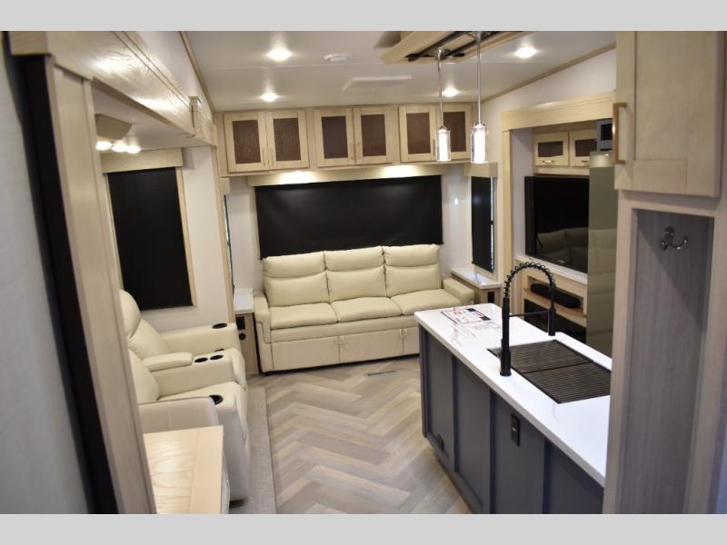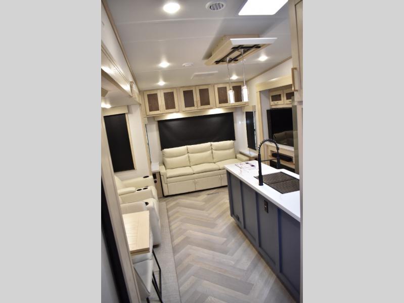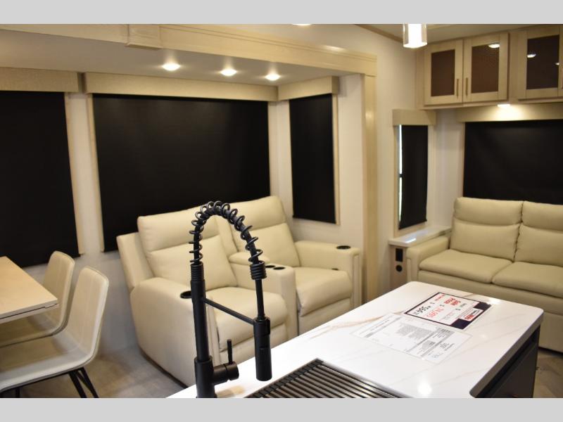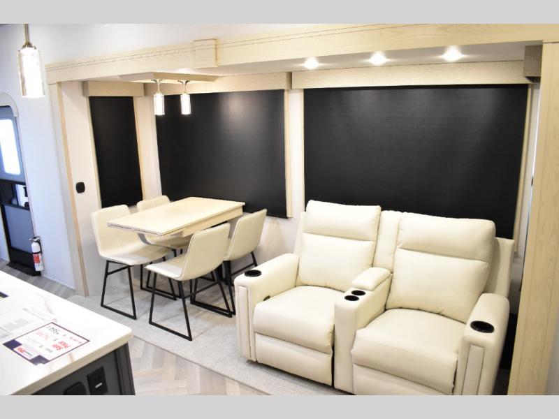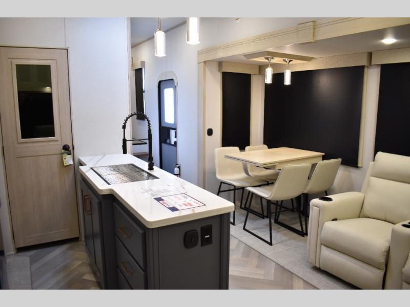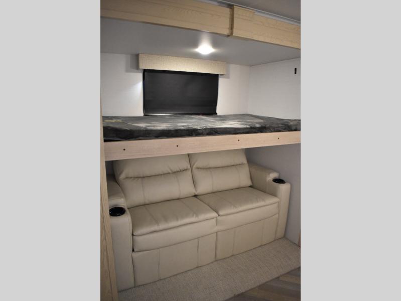 This fifth wheel has plenty of room for the whole family or friends to join in on the fun! Your guests will have the mid-bunk room all to themselves with a jackknife sofa and a flip-up bunk above, a dresser for their clothes, and a convenient half bath. The loft with a 60" x 80" bunk mat is sure to be a fun addition for the kids, and you and your spouse will enjoy the front private bedroom with a king bed slide for your comfort. Everyone can meet in the rear living area that includes an EZ glide couch, 65" theater seating, and a legless dinette for game night. The chef of the family will have plenty of counter space for prepping meals on the island peninsula, and the four burner cooktop can heat up any casseroles they have prepared. If the weather is nice, you may just want to head outdoors to cook dinner on the outside grill, and the two electric awnings with LED lights will provide protection from the sun rays!