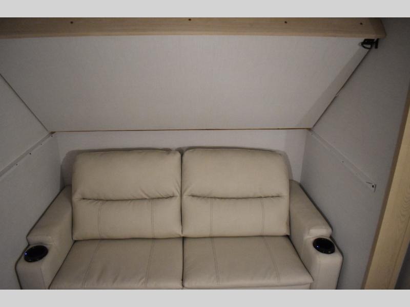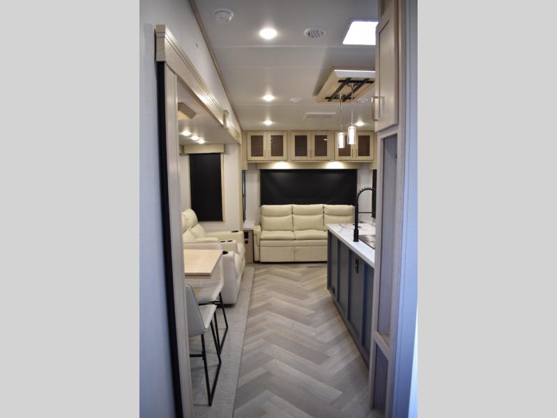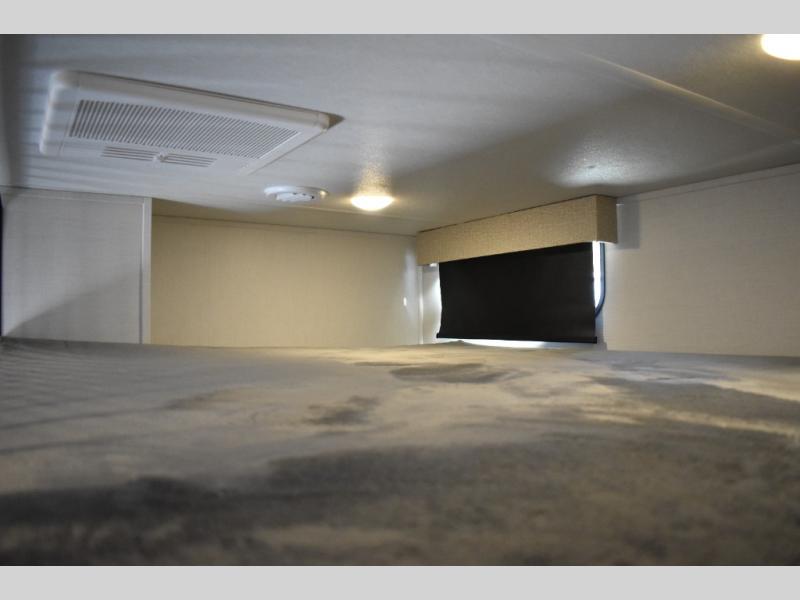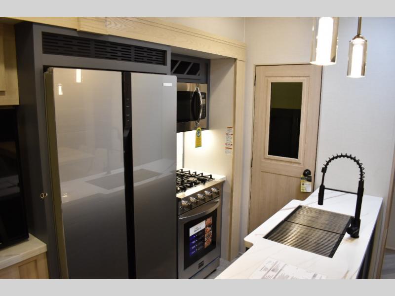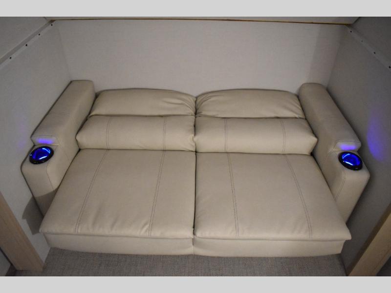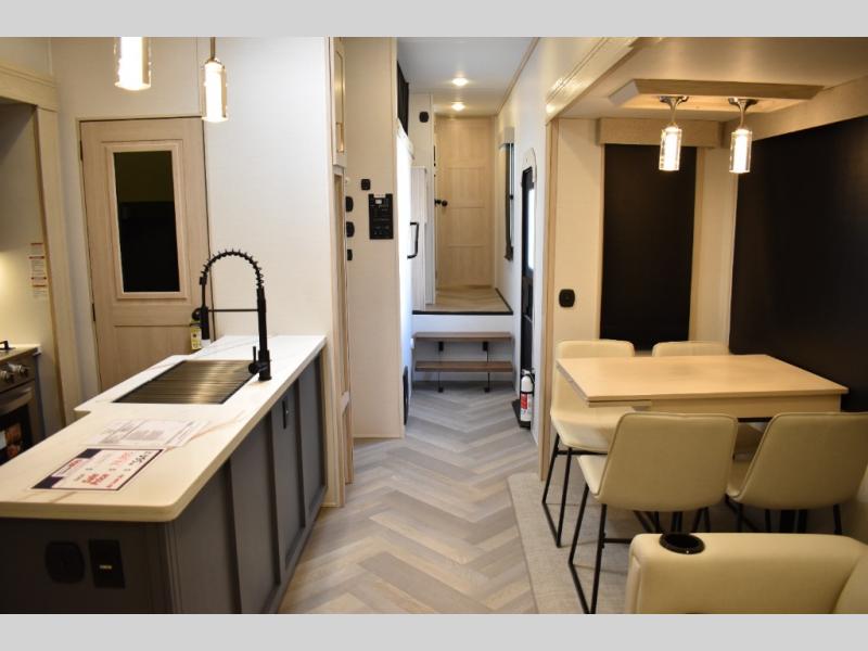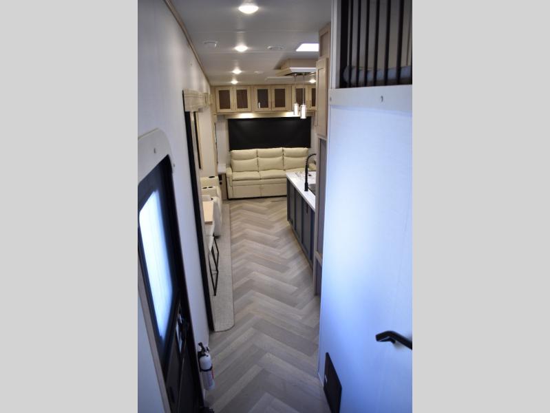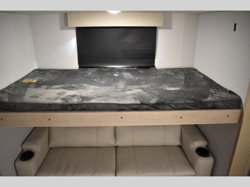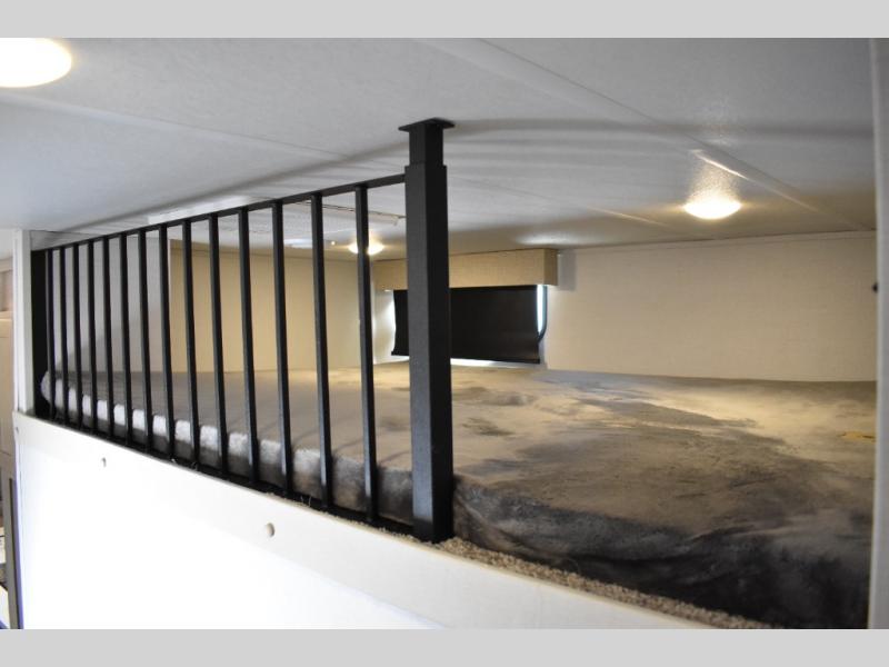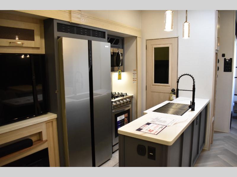 This fifth wheel has plenty of room for the whole family or friends to join in on the fun! Your guests will have the mid-bunk room all to themselves with a jackknife sofa and a flip-up bunk above, a dresser for their clothes, and a convenient half bath. The loft with a 60" x 80" bunk mat is sure to be a fun addition for the kids, and you and your spouse will enjoy the front private bedroom with a king bed slide for your comfort. Everyone can meet in the rear living area that includes an EZ glide couch, 65" theater seating, and a legless dinette for game night. The chef of the family will have plenty of counter space for prepping meals on the island peninsula, and the four burner cooktop can heat up any casseroles they have prepared. If the weather is nice, you may just want to head outdoors to cook dinner on the outside grill, and the two electric awnings with LED lights will provide protection from the sun rays!