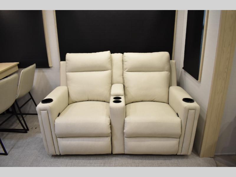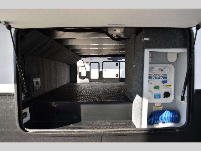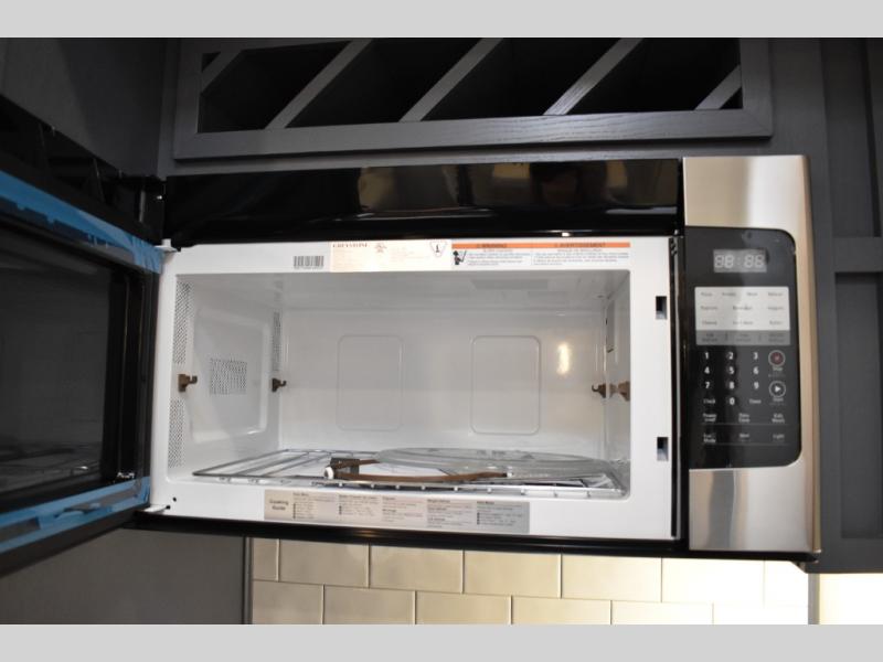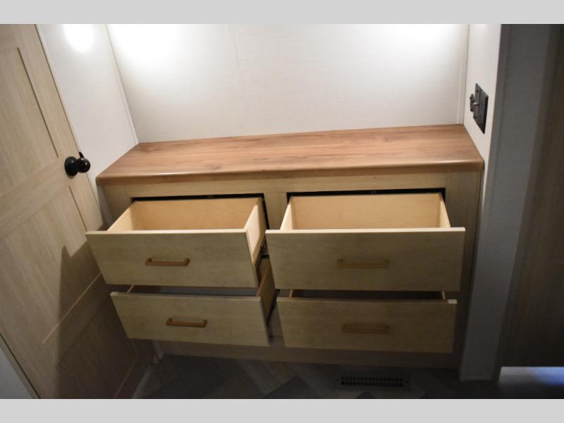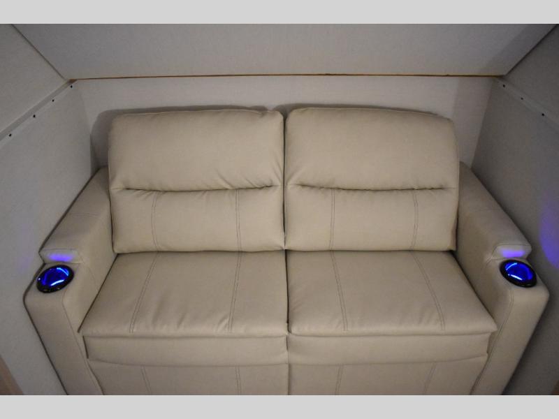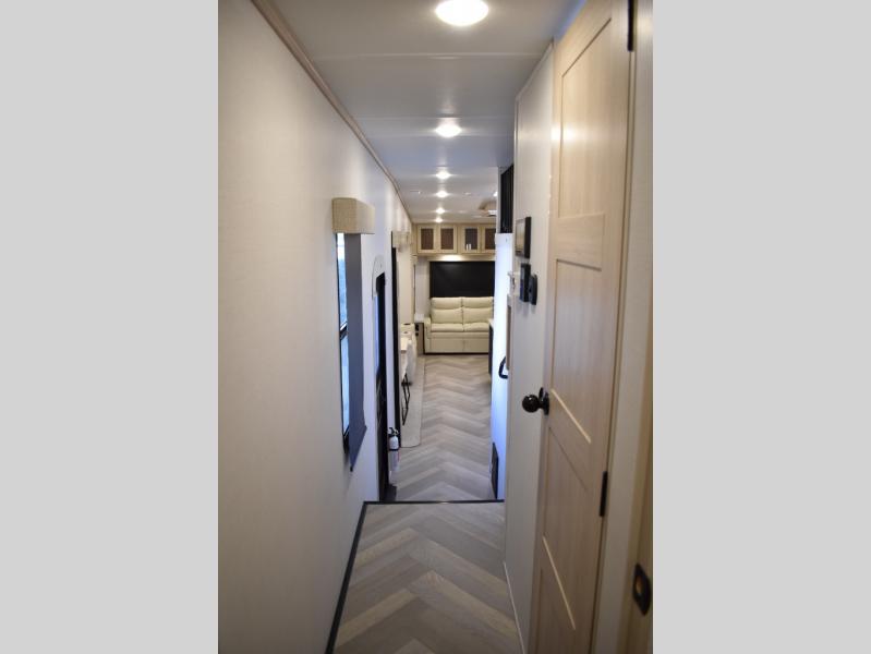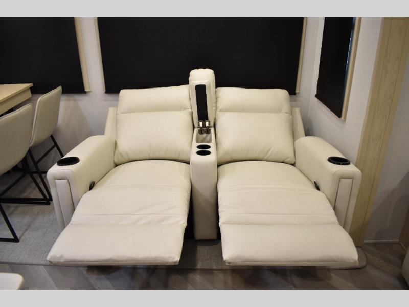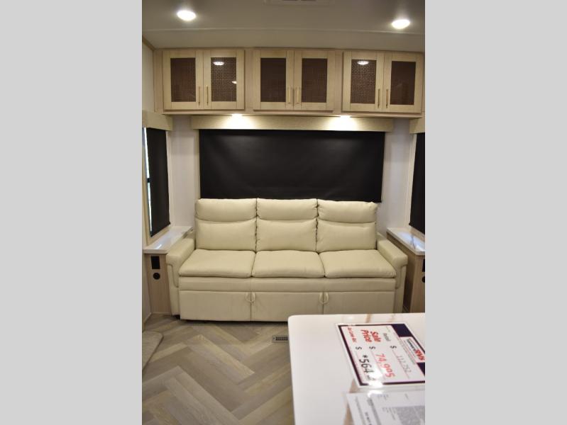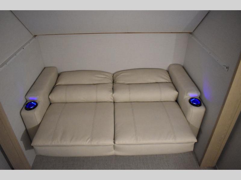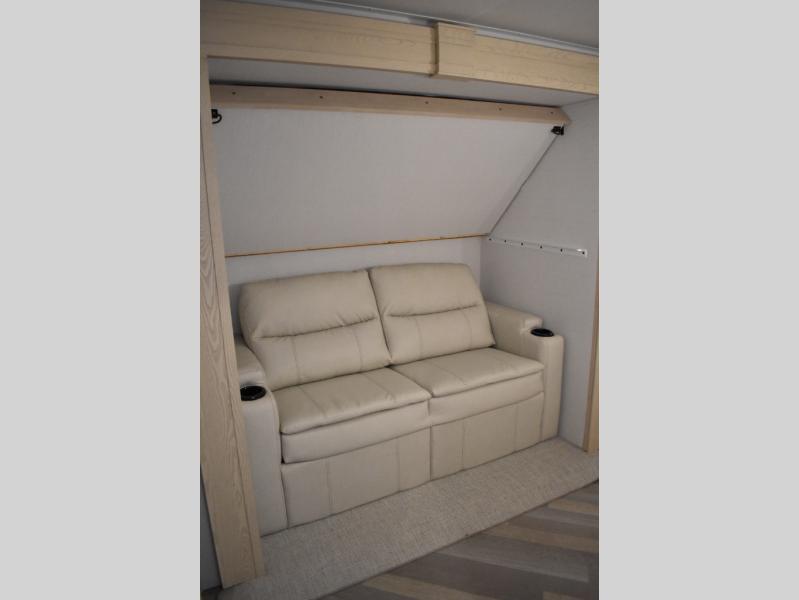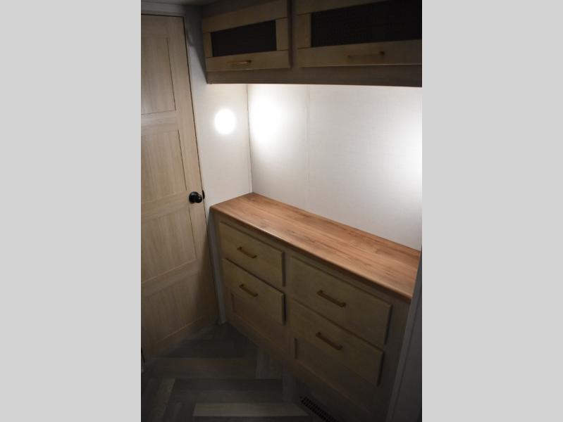 This fifth wheel has plenty of room for the whole family or friends to join in on the fun! Your guests will have the mid-bunk room all to themselves with a jackknife sofa and a flip-up bunk above, a dresser for their clothes, and a convenient half bath. The loft with a 60" x 80" bunk mat is sure to be a fun addition for the kids, and you and your spouse will enjoy the front private bedroom with a king bed slide for your comfort. Everyone can meet in the rear living area that includes an EZ glide couch, 65" theater seating, and a legless dinette for game night. The chef of the family will have plenty of counter space for prepping meals on the island peninsula, and the four burner cooktop can heat up any casseroles they have prepared. If the weather is nice, you may just want to head outdoors to cook dinner on the outside grill, and the two electric awnings with LED lights will provide protection from the sun rays!