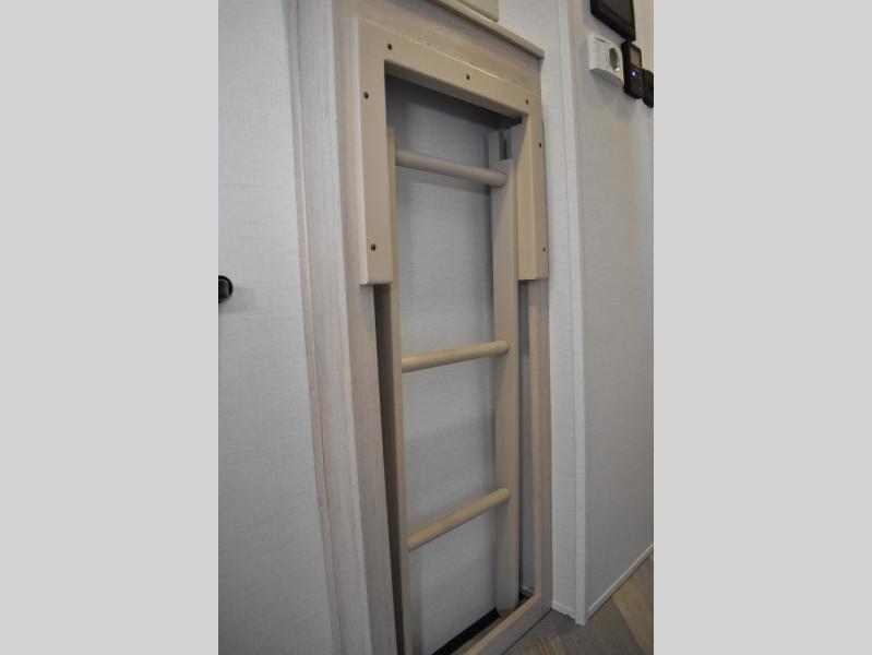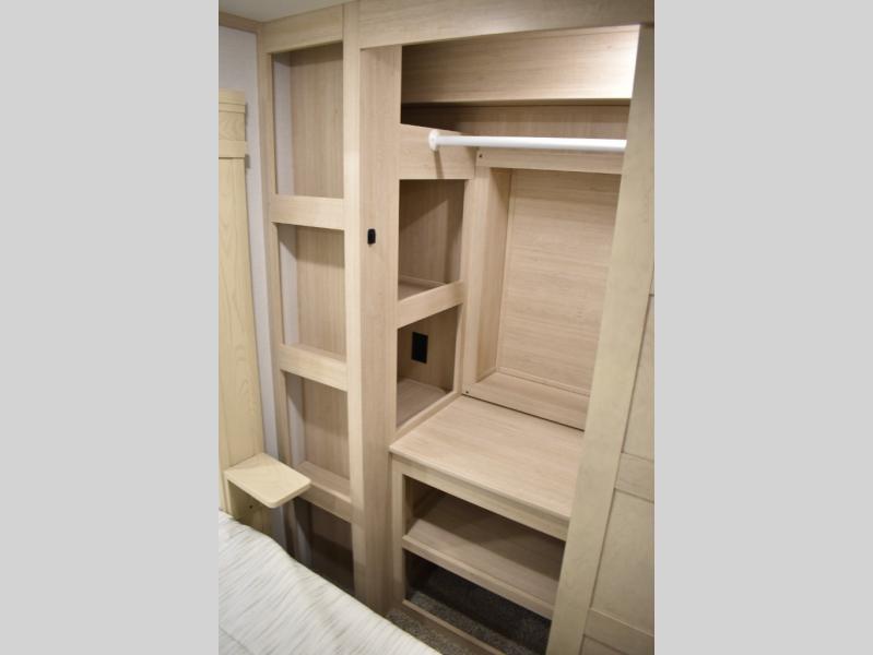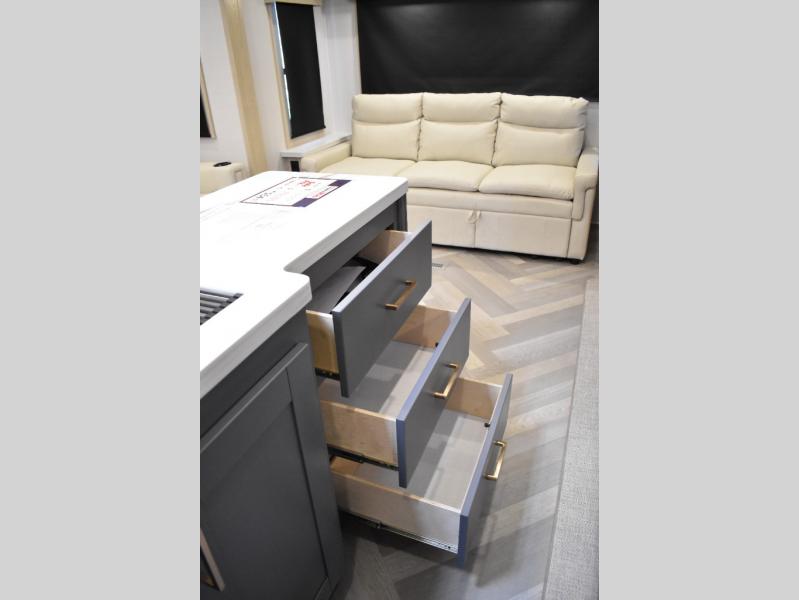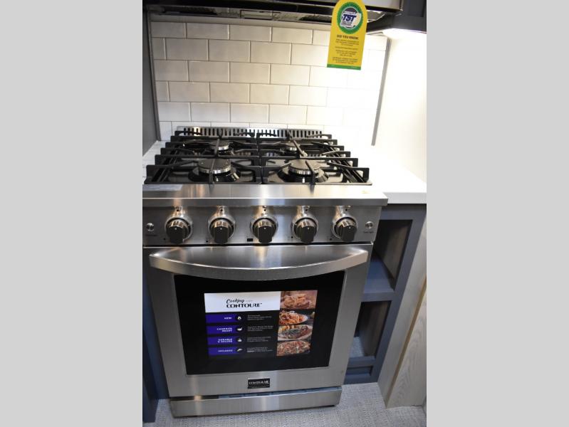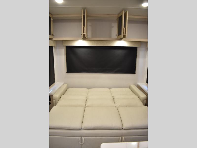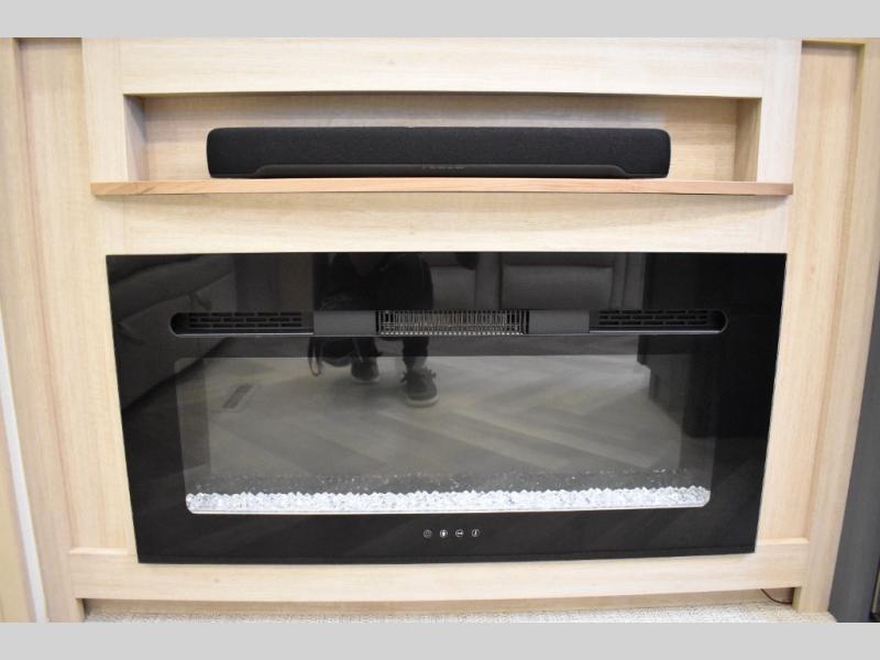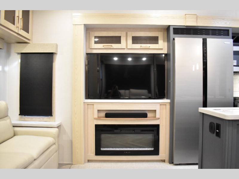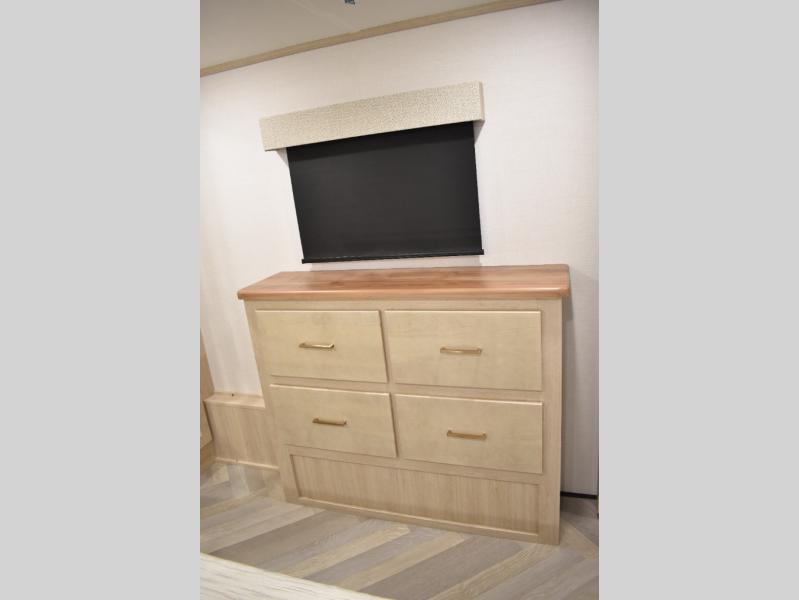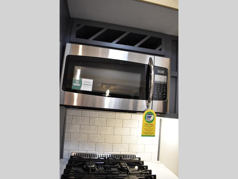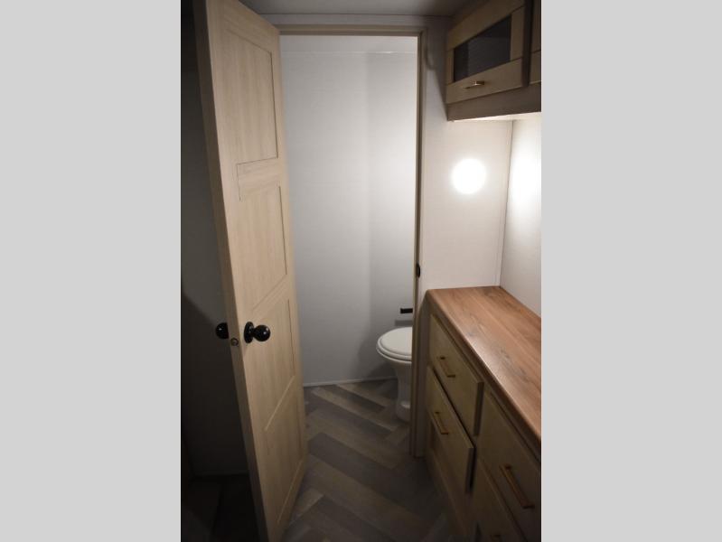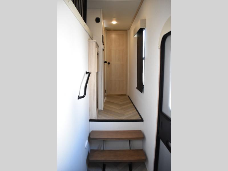 This fifth wheel has plenty of room for the whole family or friends to join in on the fun! Your guests will have the mid-bunk room all to themselves with a jackknife sofa and a flip-up bunk above, a dresser for their clothes, and a convenient half bath. The loft with a 60" x 80" bunk mat is sure to be a fun addition for the kids, and you and your spouse will enjoy the front private bedroom with a king bed slide for your comfort. Everyone can meet in the rear living area that includes an EZ glide couch, 65" theater seating, and a legless dinette for game night. The chef of the family will have plenty of counter space for prepping meals on the island peninsula, and the four burner cooktop can heat up any casseroles they have prepared. If the weather is nice, you may just want to head outdoors to cook dinner on the outside grill, and the two electric awnings with LED lights will provide protection from the sun rays!