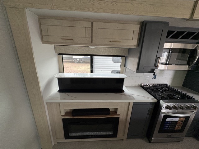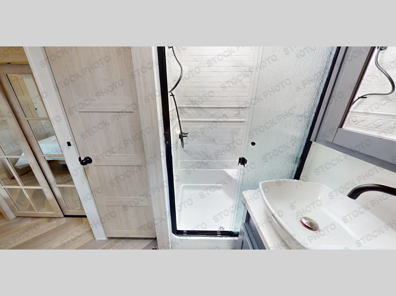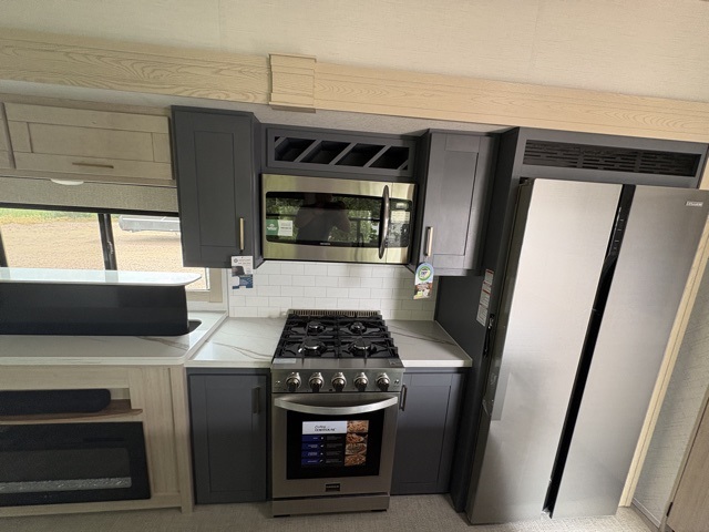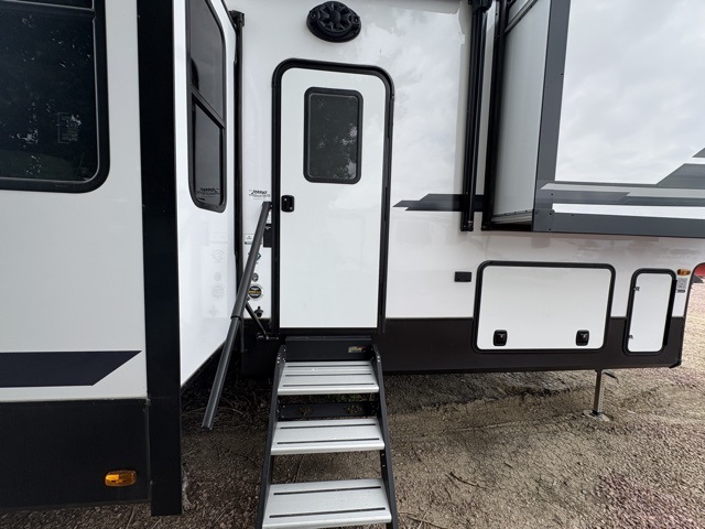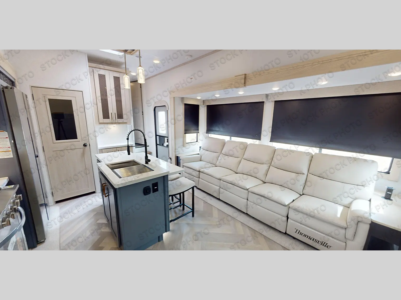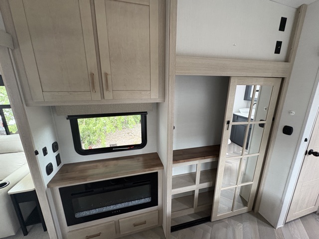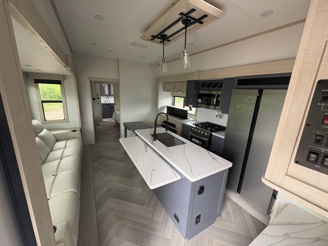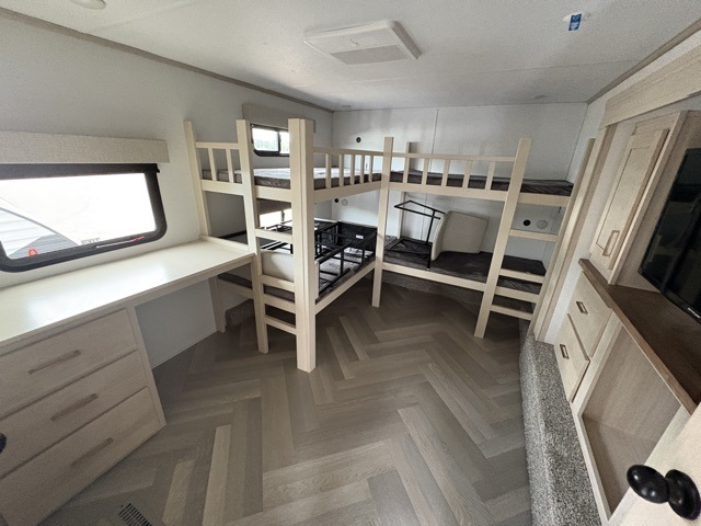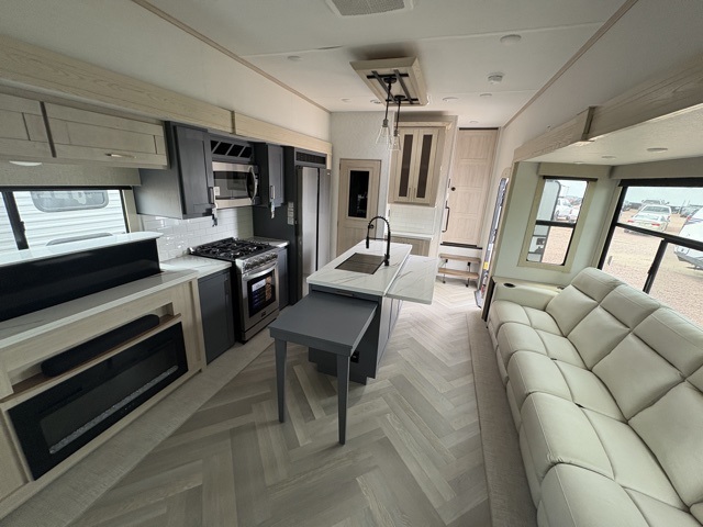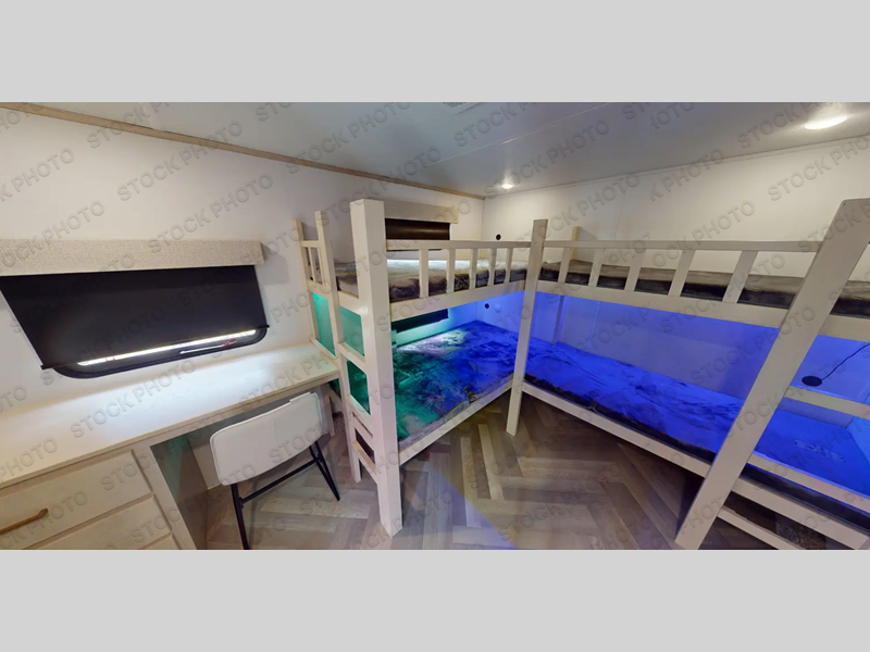 Camping with friends and family just got easier in this spacious fifth wheel that can sleep eight each night. There is a full rear bath, complete with dual bath sinks, a linen closet, plus a second linen closet with washer/dryer prep for added convenience. The half bath is in the front bunkhouse suite, where your guest will also enjoy four bunk beds, a 40" TV, a large wardrobe, plus a desk if they need to get some work done. The combined middle kitchen and living area includes a kitchen island with a flip-up countertop and a hidden dinette the chef of your group is sure to love, plus there is a large pantry for food, a hutch to store nice dishes, and a 16 cu. ft. French door 12V refrigerator for perishables. And everyone will love relaxing on the large sofa across from the pop-up LED Smart TV and fireplace!