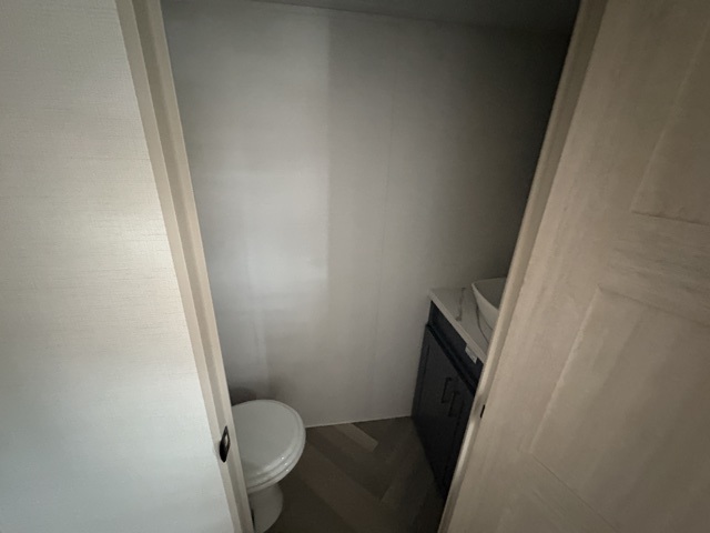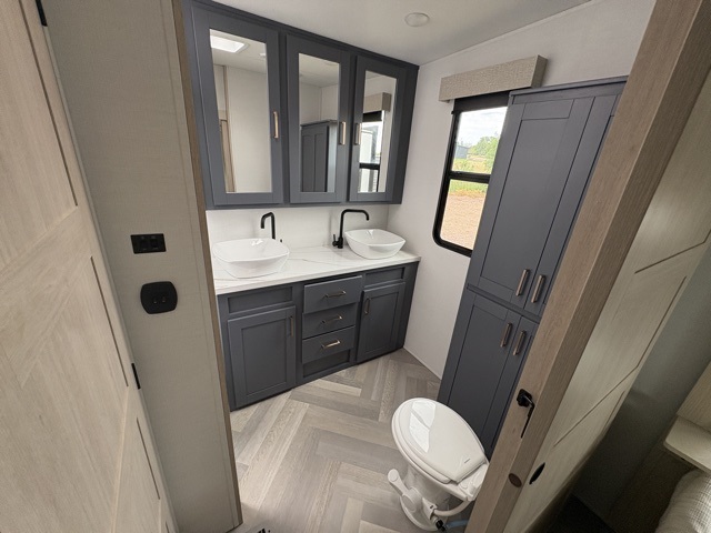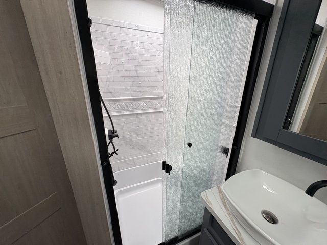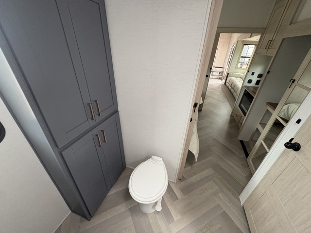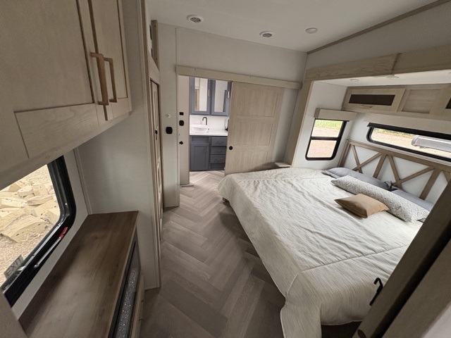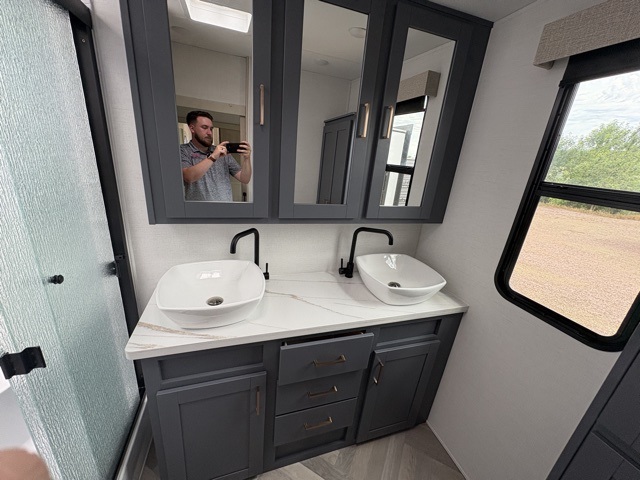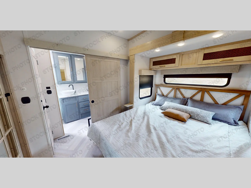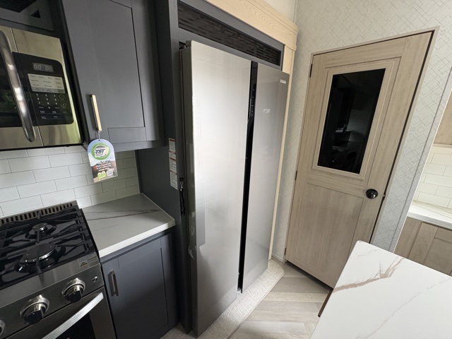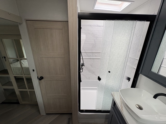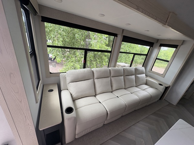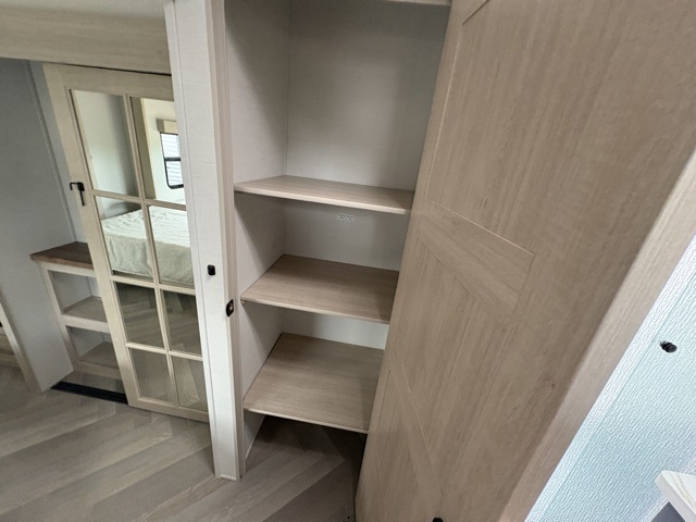 Camping with friends and family just got easier in this spacious fifth wheel that can sleep eight each night. There is a full rear bath, complete with dual bath sinks, a linen closet, plus a second linen closet with washer/dryer prep for added convenience. The half bath is in the front bunkhouse suite, where your guest will also enjoy four bunk beds, a 40" TV, a large wardrobe, plus a desk if they need to get some work done. The combined middle kitchen and living area includes a kitchen island with a flip-up countertop and a hidden dinette the chef of your group is sure to love, plus there is a large pantry for food, a hutch to store nice dishes, and a 16 cu. ft. French door 12V refrigerator for perishables. And everyone will love relaxing on the large sofa across from the pop-up LED Smart TV and fireplace!