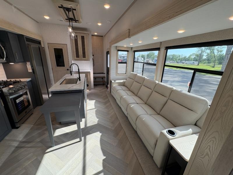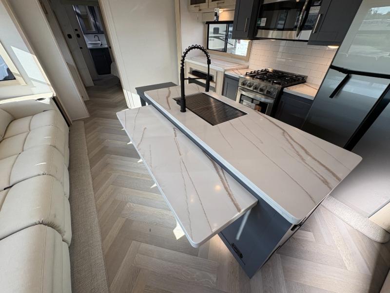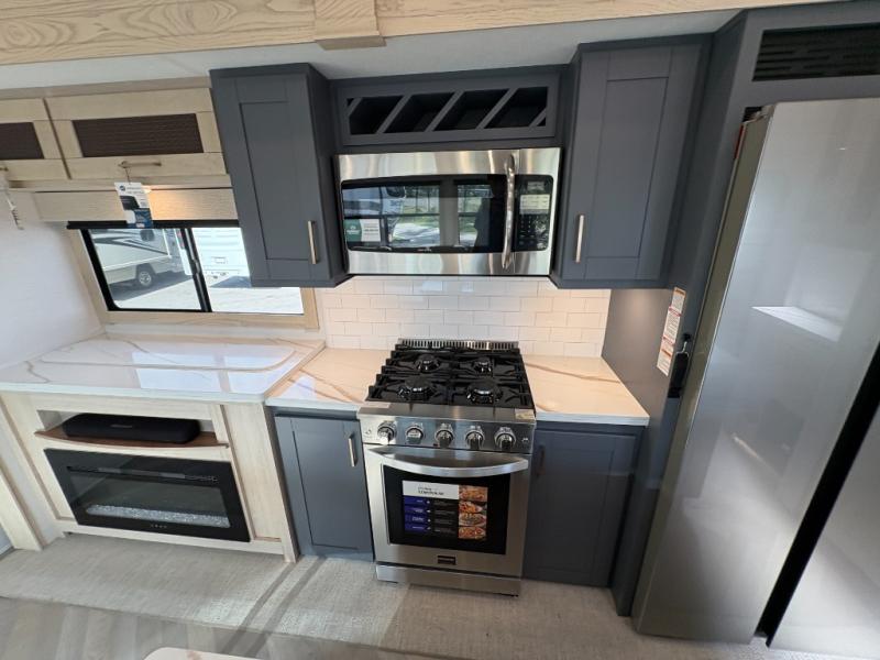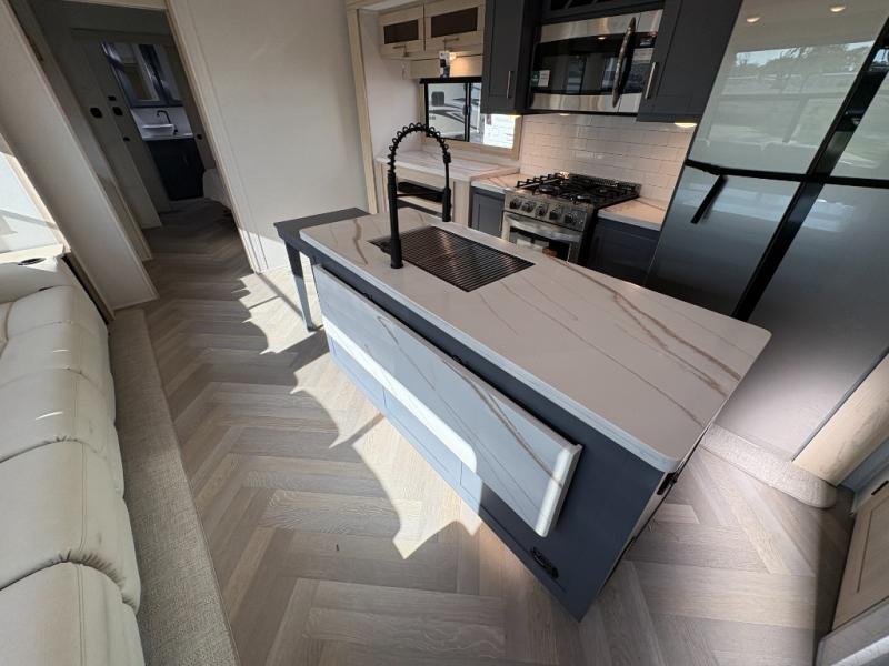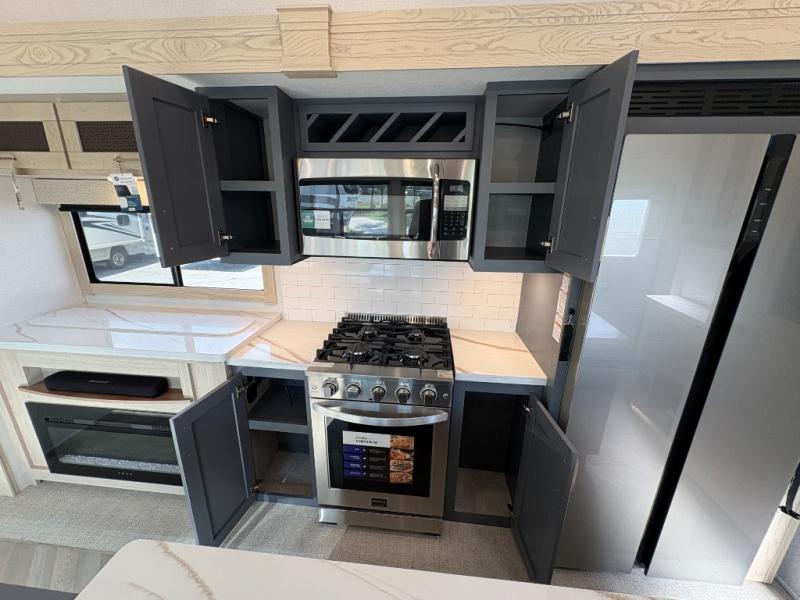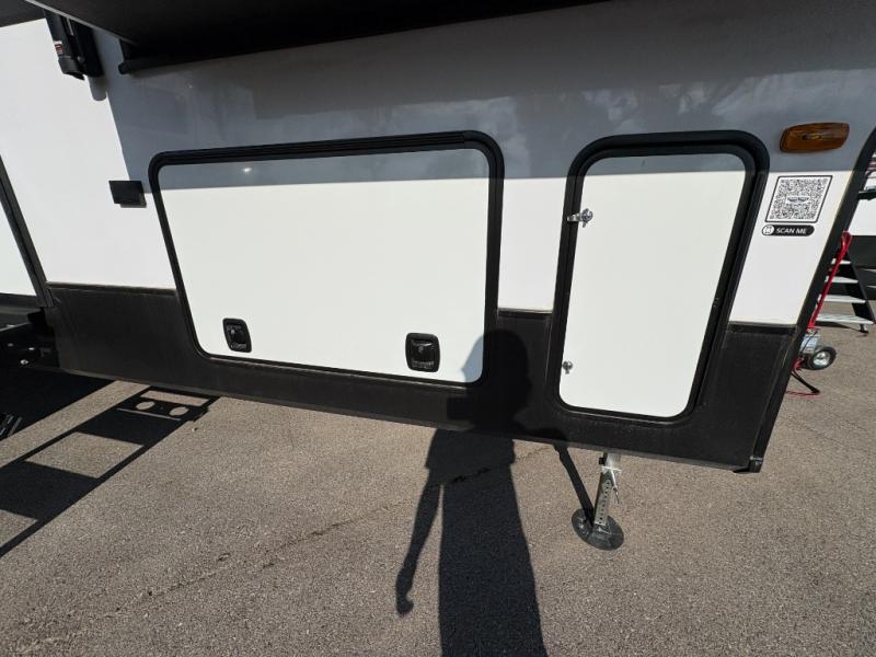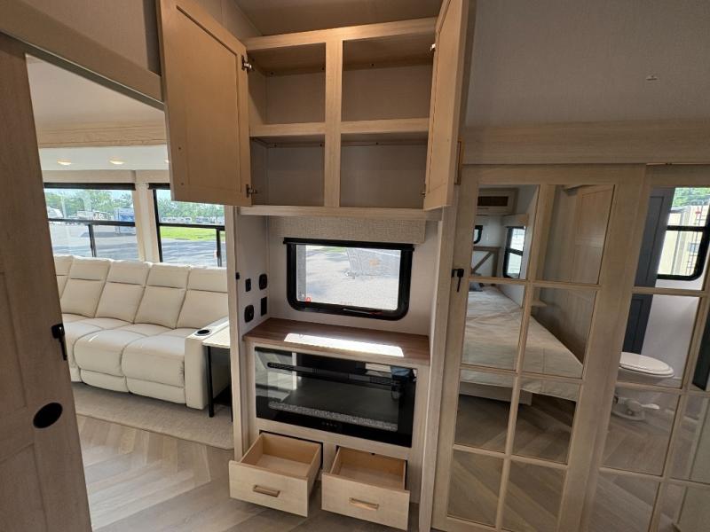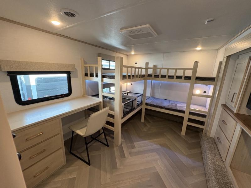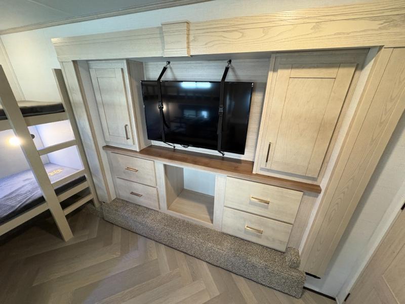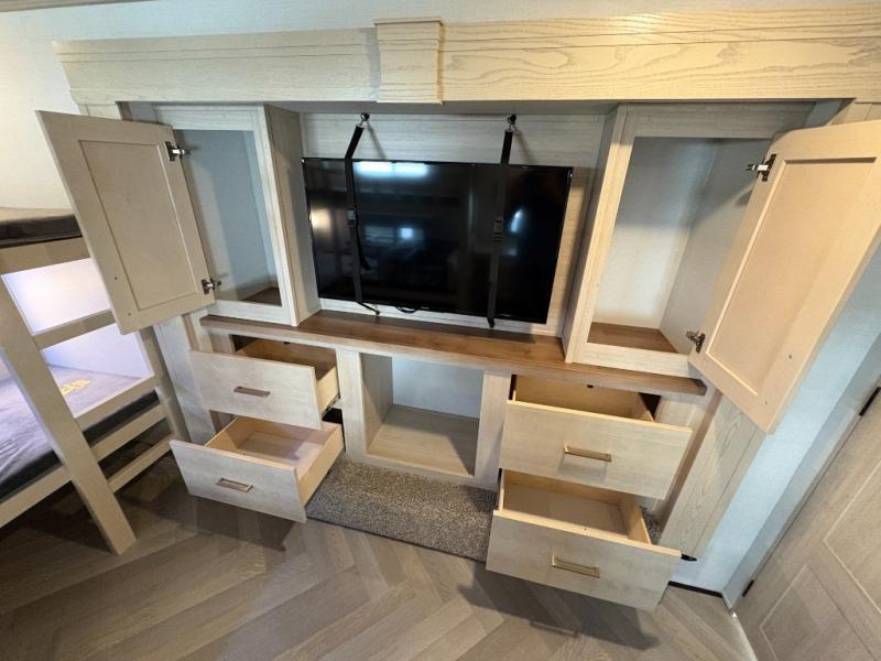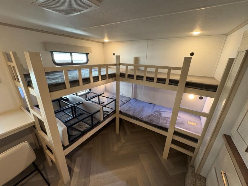 Camping with friends and family just got easier in this spacious fifth wheel that can sleep eight each night. There is a full rear bath, complete with dual bath sinks, a linen closet, plus a second linen closet with washer/dryer prep for added convenience. The half bath is in the front bunkhouse suite, where your guest will also enjoy four bunk beds, a 40" TV, a large wardrobe, plus a desk if they need to get some work done. The combined middle kitchen and living area includes a kitchen island with a flip-up countertop and a hidden dinette the chef of your group is sure to love, plus there is a large pantry for food, a hutch to store nice dishes, and a 16 cu. ft. French door 12V refrigerator for perishables. And everyone will love relaxing on the large sofa across from the pop-up LED Smart TV and fireplace!