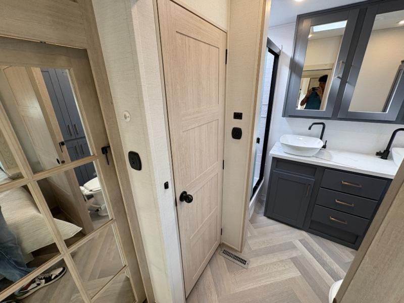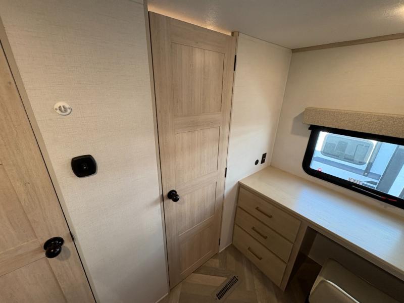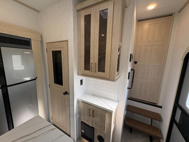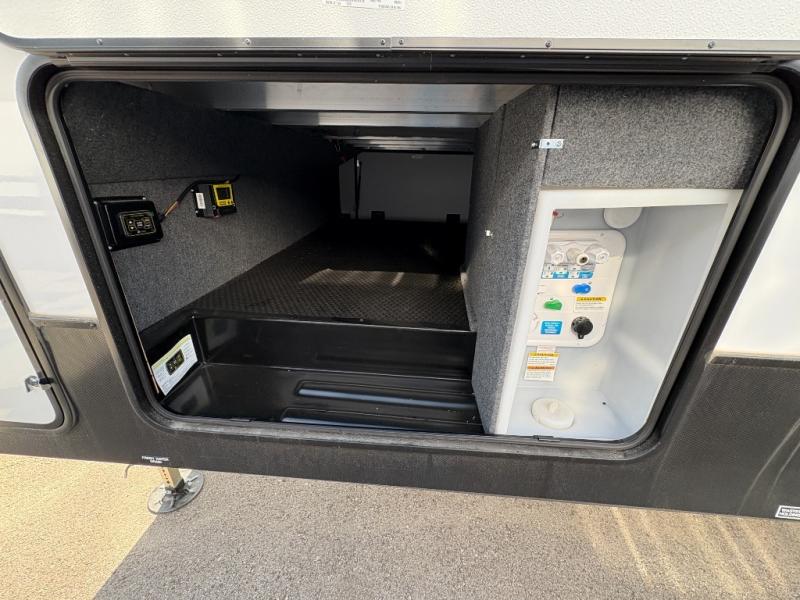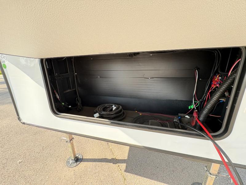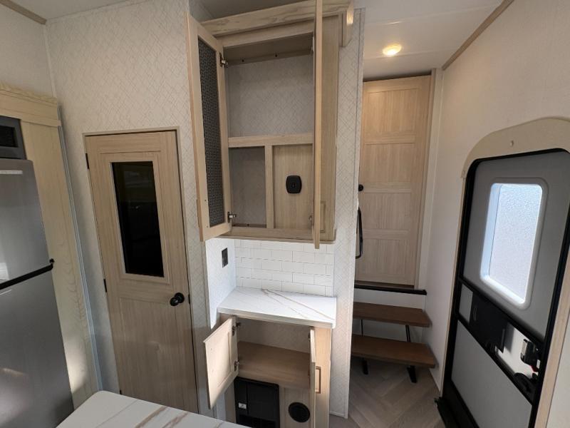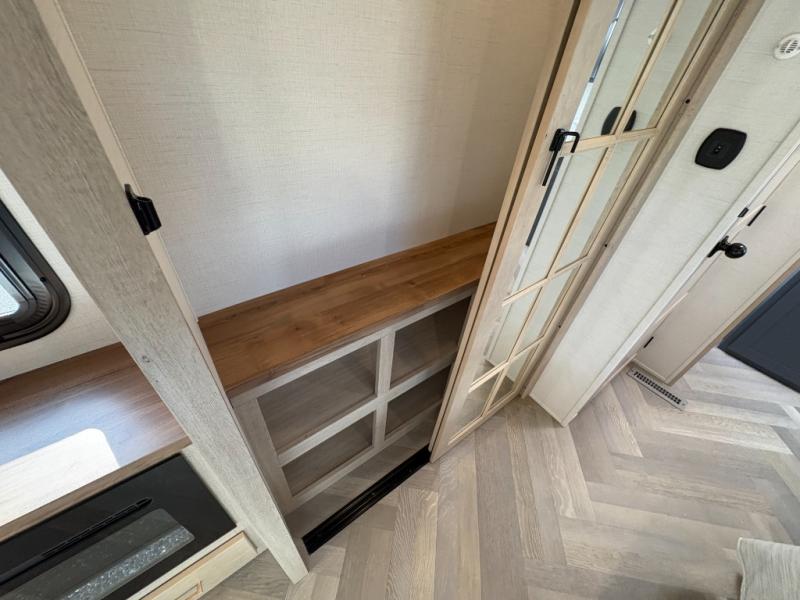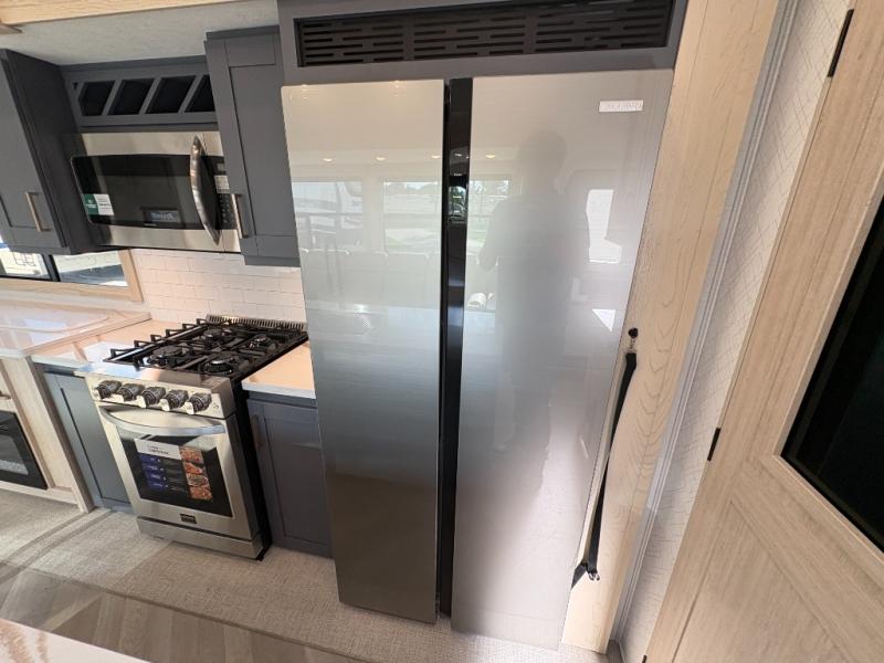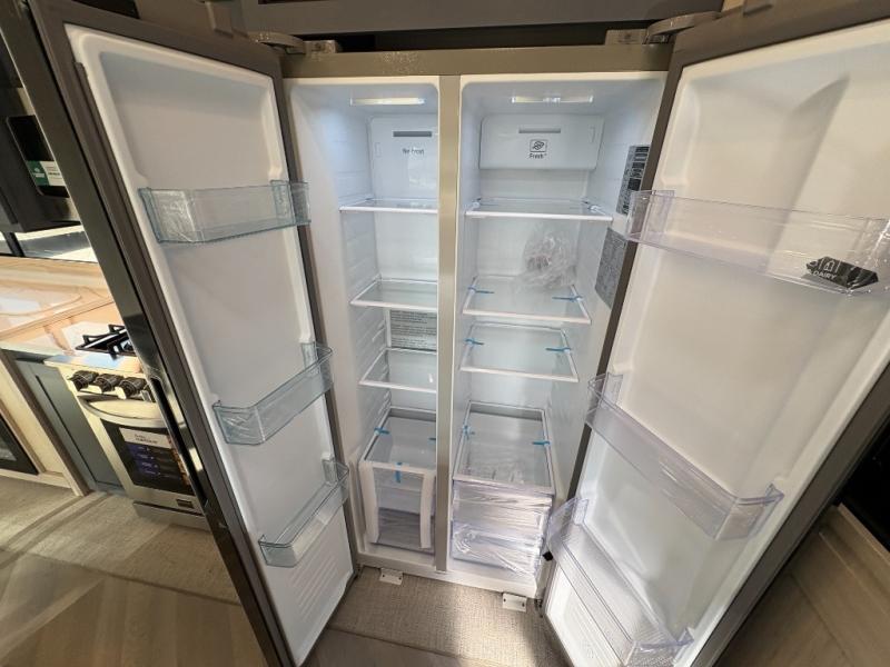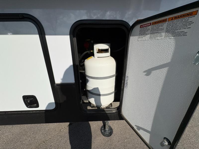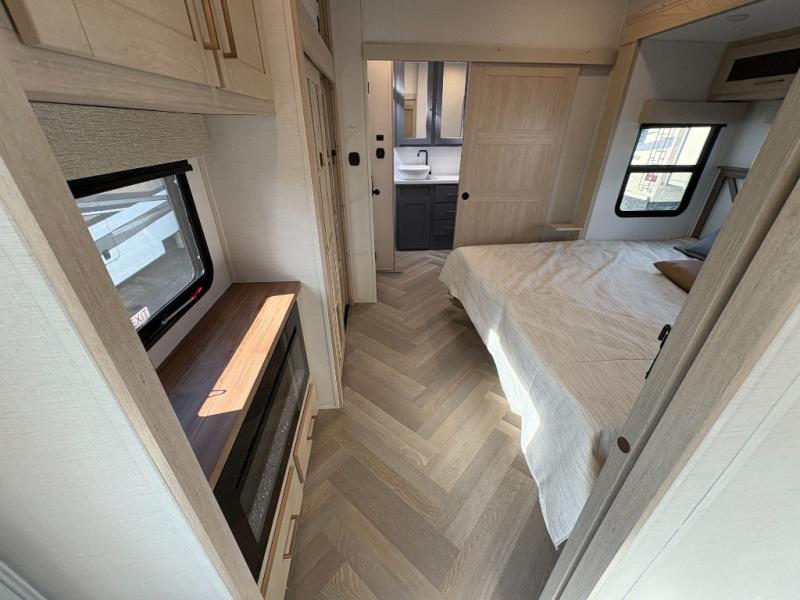 Camping with friends and family just got easier in this spacious fifth wheel that can sleep eight each night. There is a full rear bath, complete with dual bath sinks, a linen closet, plus a second linen closet with washer/dryer prep for added convenience. The half bath is in the front bunkhouse suite, where your guest will also enjoy four bunk beds, a 40" TV, a large wardrobe, plus a desk if they need to get some work done. The combined middle kitchen and living area includes a kitchen island with a flip-up countertop and a hidden dinette the chef of your group is sure to love, plus there is a large pantry for food, a hutch to store nice dishes, and a 16 cu. ft. French door 12V refrigerator for perishables. And everyone will love relaxing on the large sofa across from the pop-up LED Smart TV and fireplace!