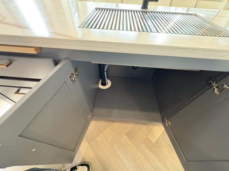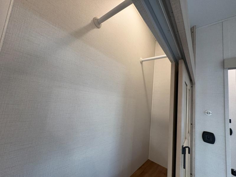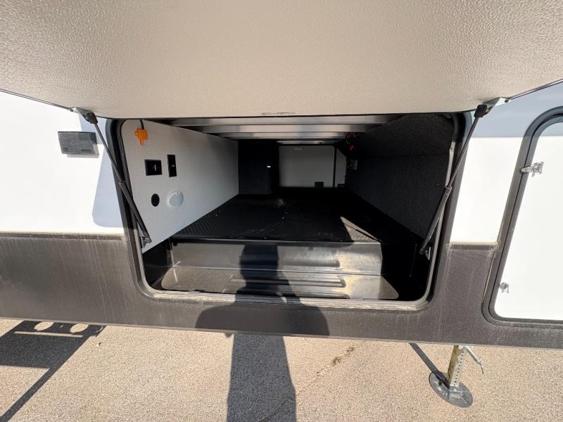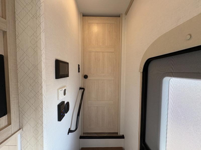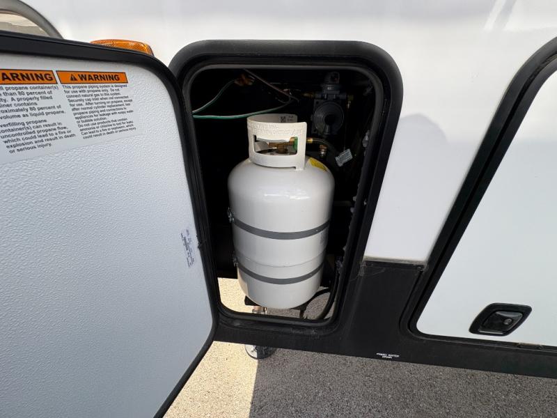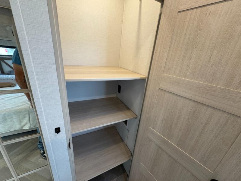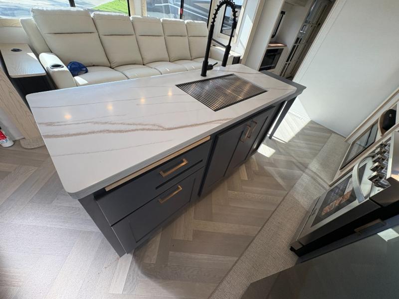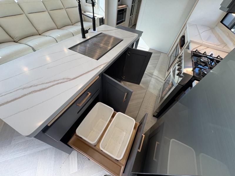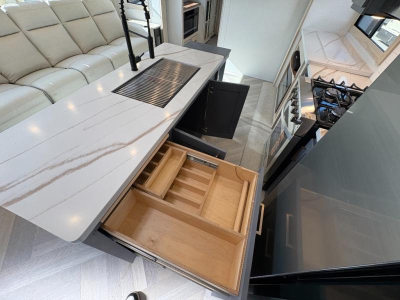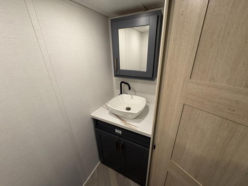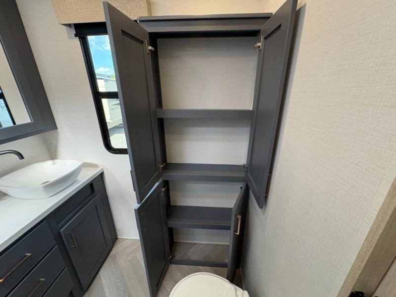 Camping with friends and family just got easier in this spacious fifth wheel that can sleep eight each night. There is a full rear bath, complete with dual bath sinks, a linen closet, plus a second linen closet with washer/dryer prep for added convenience. The half bath is in the front bunkhouse suite, where your guest will also enjoy four bunk beds, a 40" TV, a large wardrobe, plus a desk if they need to get some work done. The combined middle kitchen and living area includes a kitchen island with a flip-up countertop and a hidden dinette the chef of your group is sure to love, plus there is a large pantry for food, a hutch to store nice dishes, and a 16 cu. ft. French door 12V refrigerator for perishables. And everyone will love relaxing on the large sofa across from the pop-up LED Smart TV and fireplace!
