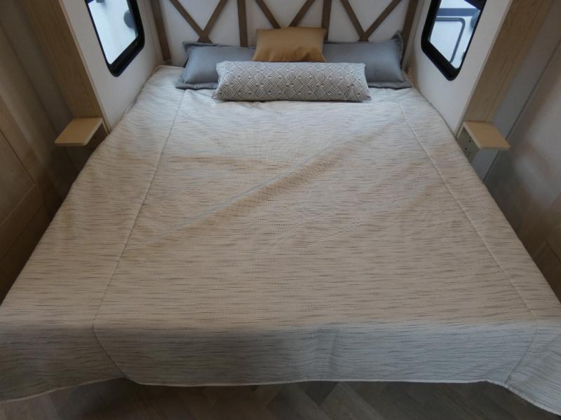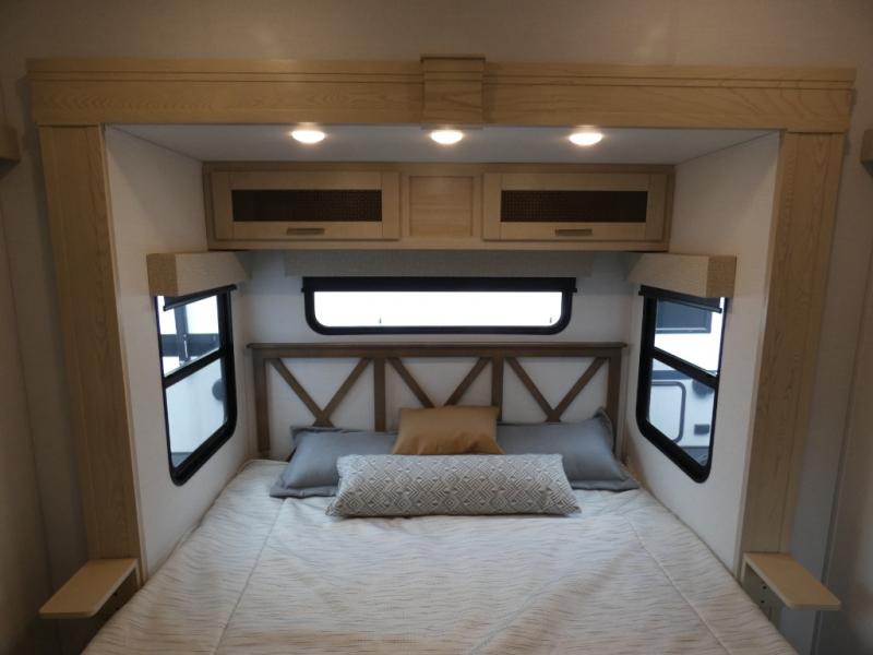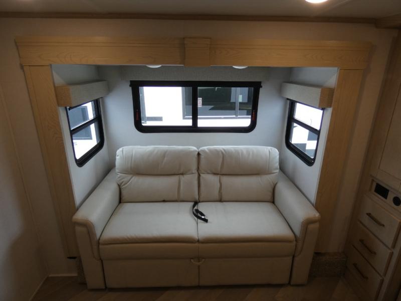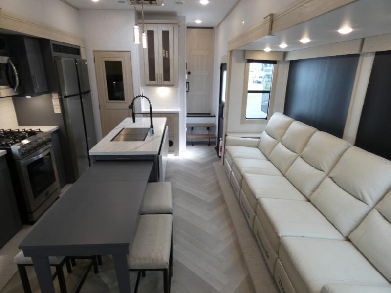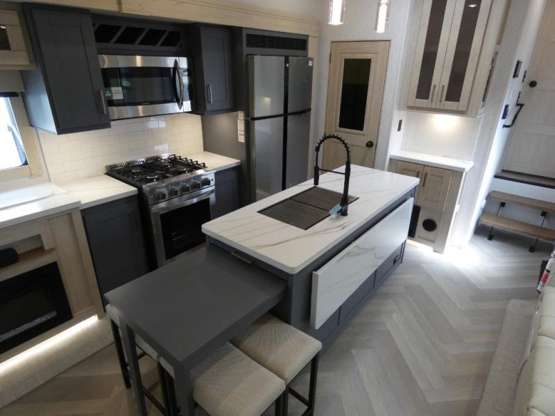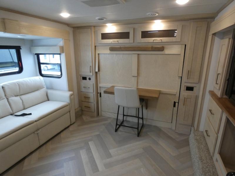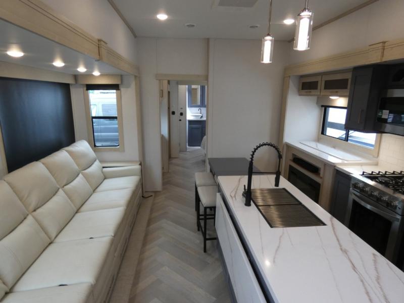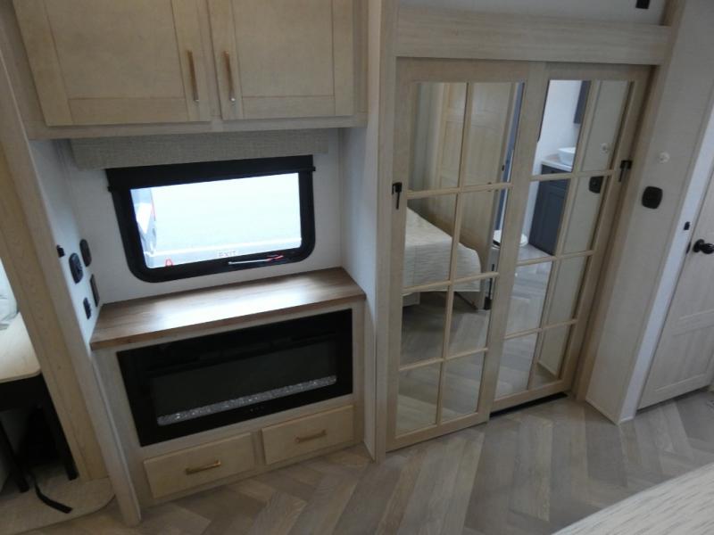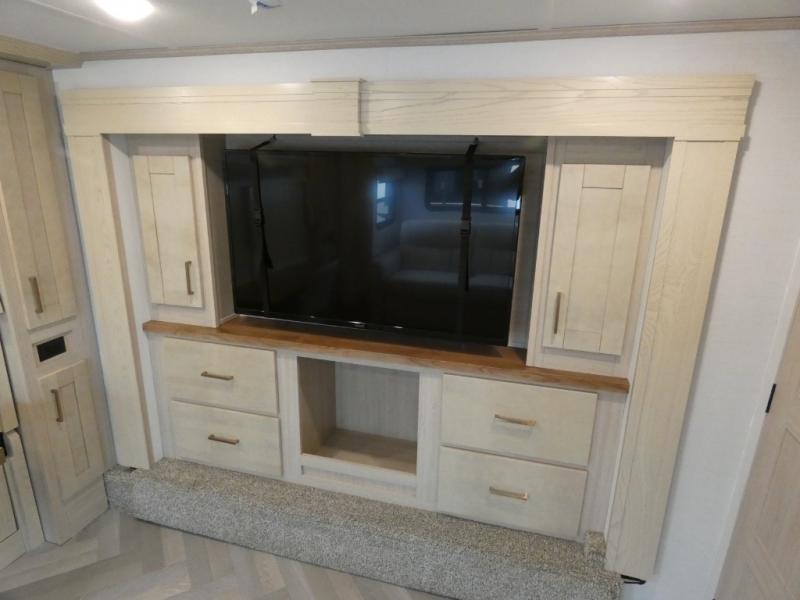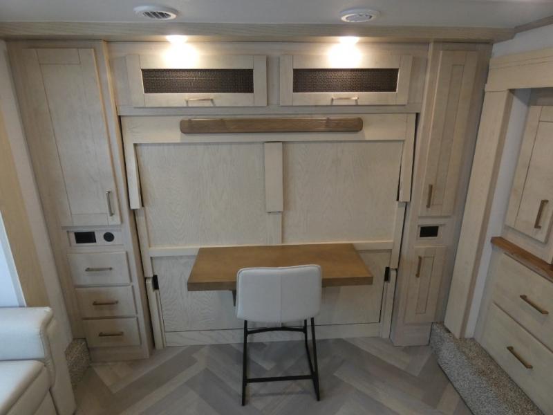 This fifth wheel is sure to wow you! You can easily invite your close neighbor friends along since there is a front den/bedroom that includes dual opposing slides, a Murphy bed/desk, a tri-fold sofa and a wardrobe, plus a full bath! You'll have the master suite towards the back all to yourselves, and here you'll find a king bed slide out, a bedroom fireplace, and a full rear bath, complete with dual bath sinks. There is even a linen closet with washer and dryer prep if you want the option to go full-time! In the morning, everyone can meet in the combined kitchen and living area as the chef whips up breakfast on the four burner cooktop. There is a gourmet island with a flip-up counter and a hidden dinette to provide everyone space to gather around. And you'll love the large sofa with pop-up chargers across from the hidden Smart TV and fireplace. Don't let this fifth wheel slip away!
