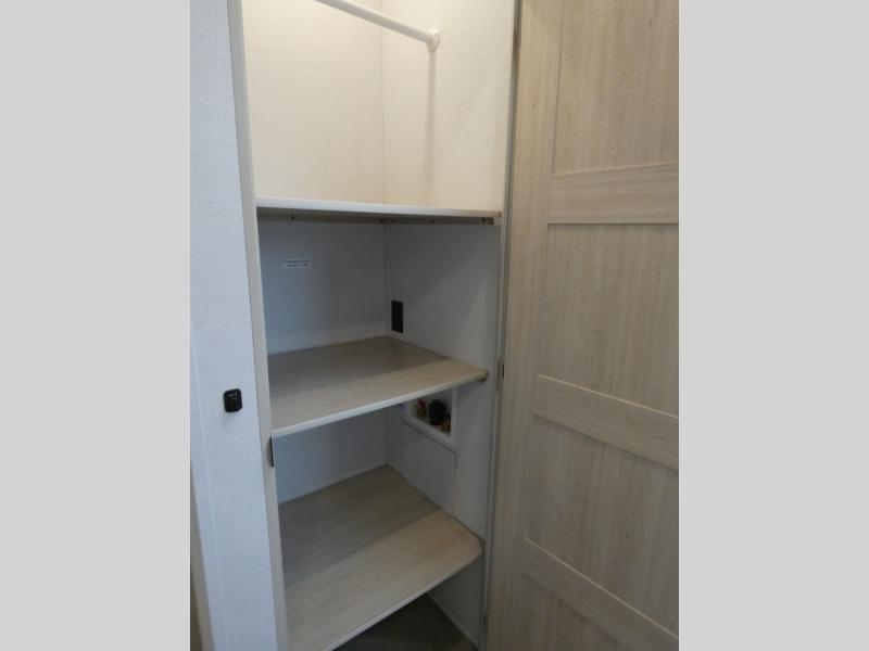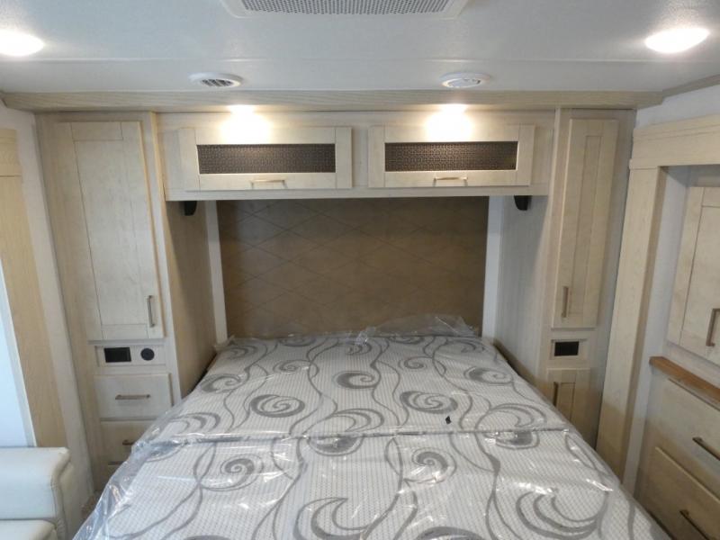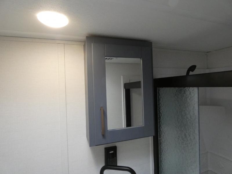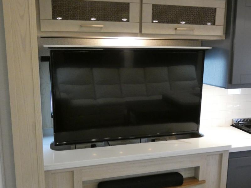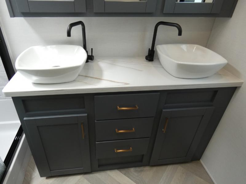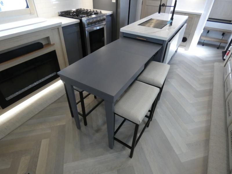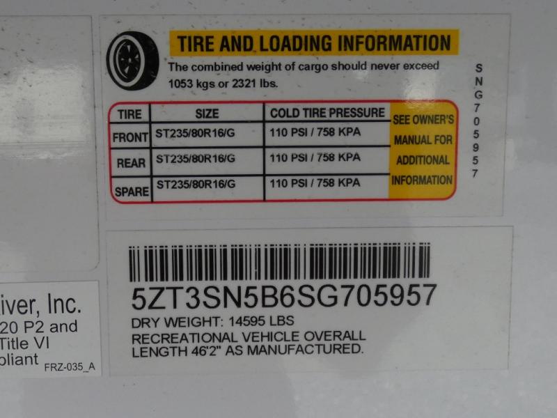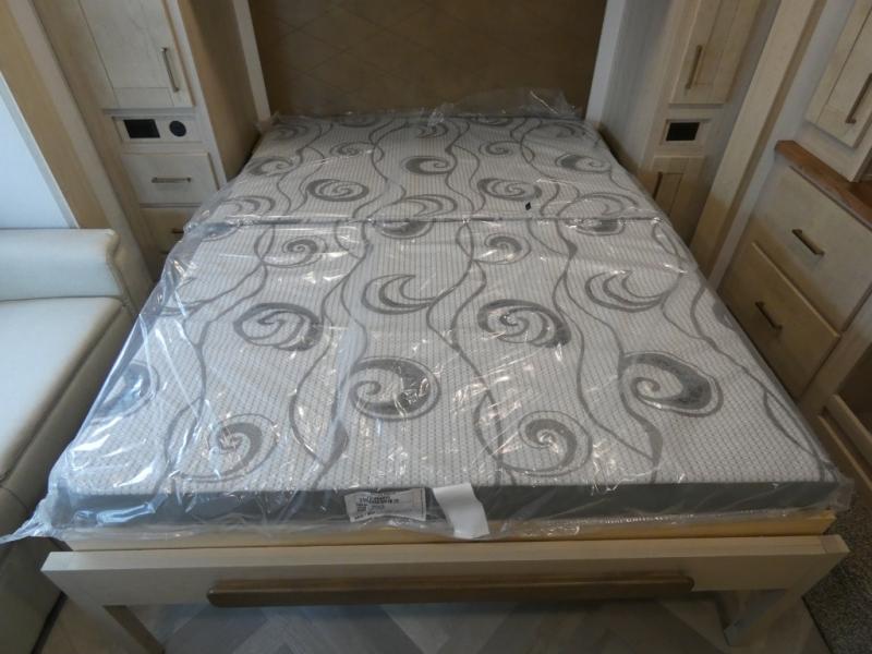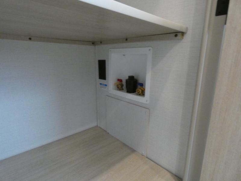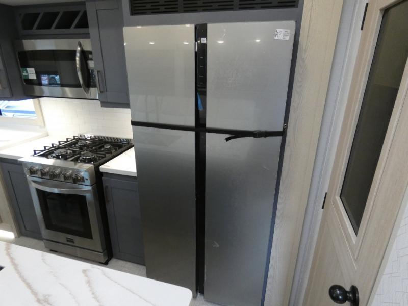 This fifth wheel is sure to wow you! You can easily invite your close neighbor friends along since there is a front den/bedroom that includes dual opposing slides, a Murphy bed/desk, a tri-fold sofa and a wardrobe, plus a full bath! You'll have the master suite towards the back all to yourselves, and here you'll find a king bed slide out, a bedroom fireplace, and a full rear bath, complete with dual bath sinks. There is even a linen closet with washer and dryer prep if you want the option to go full-time! In the morning, everyone can meet in the combined kitchen and living area as the chef whips up breakfast on the four burner cooktop. There is a gourmet island with a flip-up counter and a hidden dinette to provide everyone space to gather around. And you'll love the large sofa with pop-up chargers across from the hidden Smart TV and fireplace. Don't let this fifth wheel slip away!