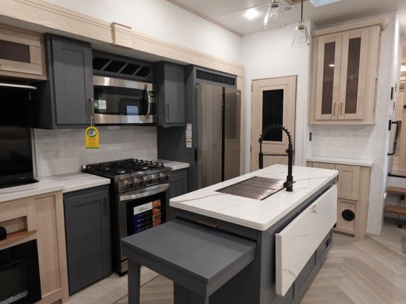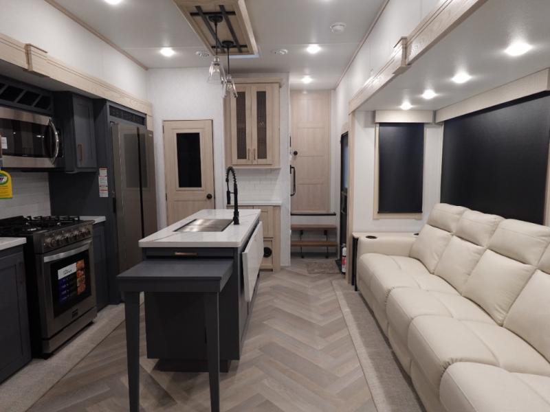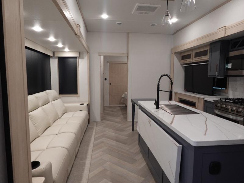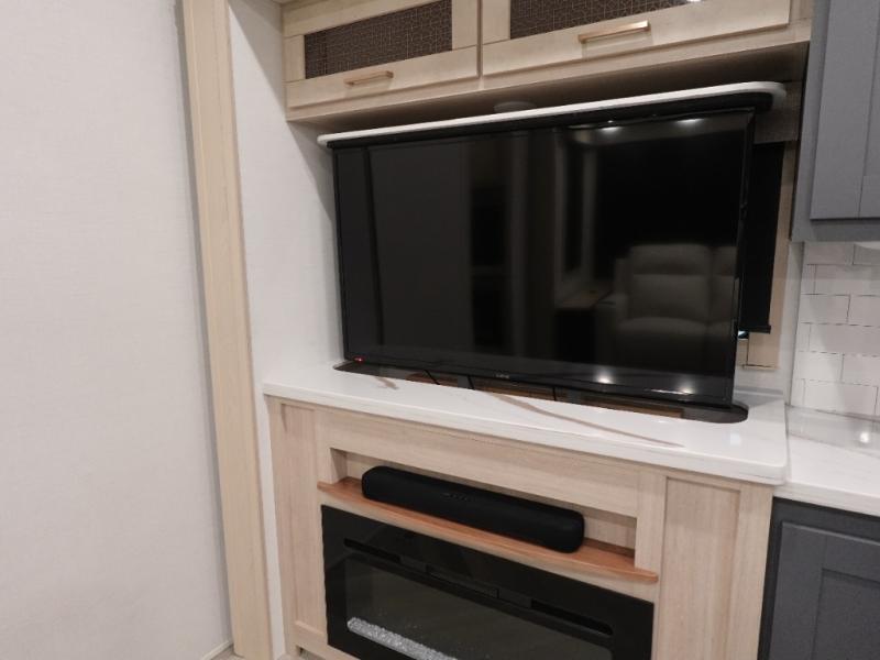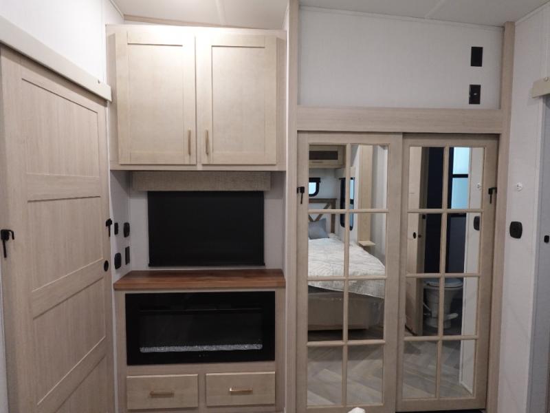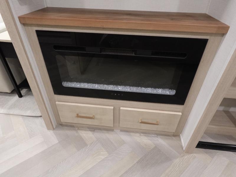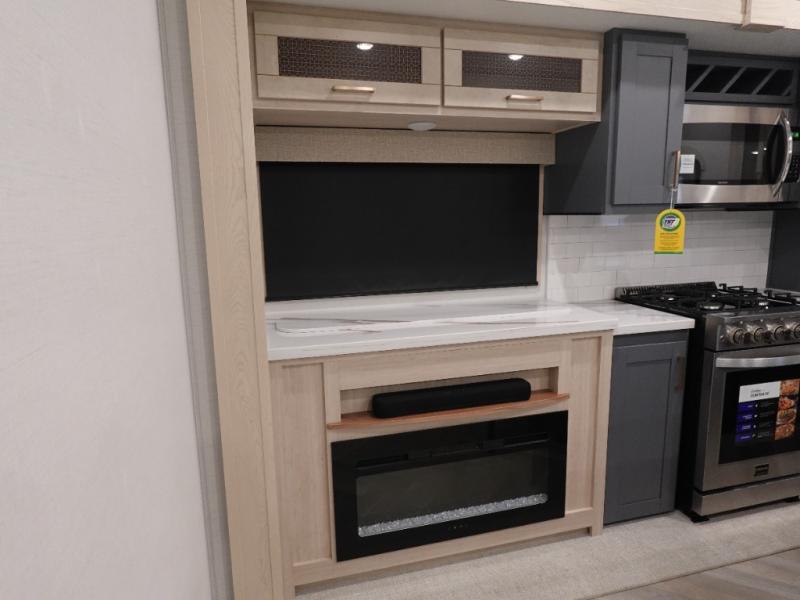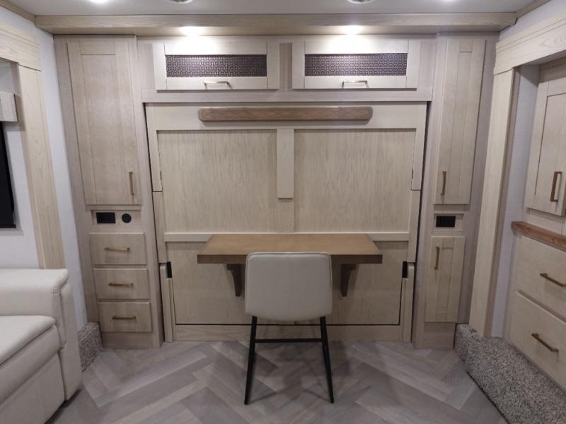 This fifth wheel is sure to wow you! You can easily invite your close neighbor friends along since there is a front den/bedroom that includes dual opposing slides, a Murphy bed/desk, a tri-fold sofa and a wardrobe, plus a full bath! You'll have the master suite towards the back all to yourselves, and here you'll find a king bed slide out, a bedroom fireplace, and a full rear bath, complete with dual bath sinks. There is even a linen closet with washer and dryer prep if you want the option to go full-time! In the morning, everyone can meet in the combined kitchen and living area as the chef whips up breakfast on the four burner cooktop. There is a gourmet island with a flip-up counter and a hidden dinette to provide everyone space to gather around. And you'll love the large sofa with pop-up chargers across from the hidden Smart TV and fireplace. Don't let this fifth wheel slip away!