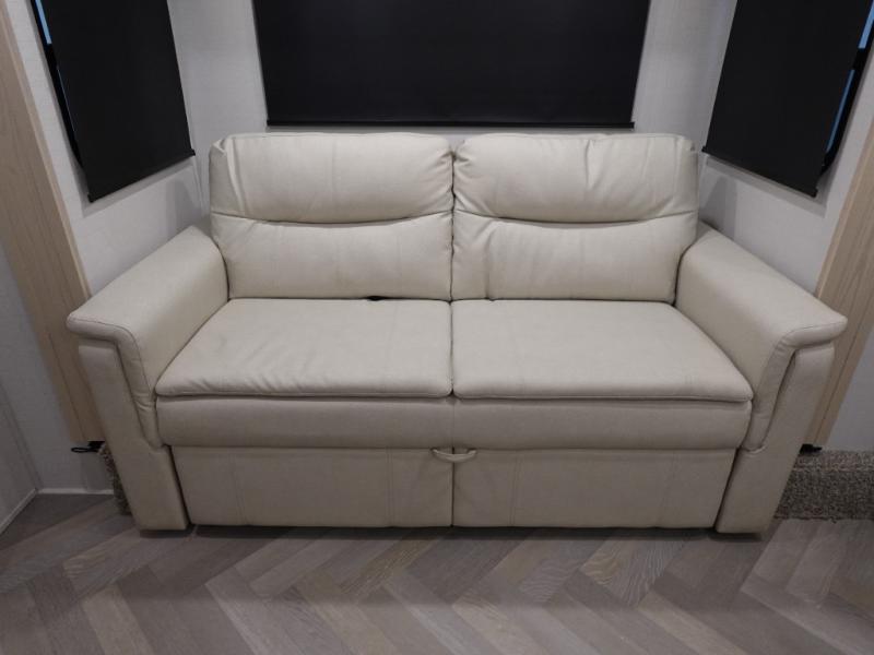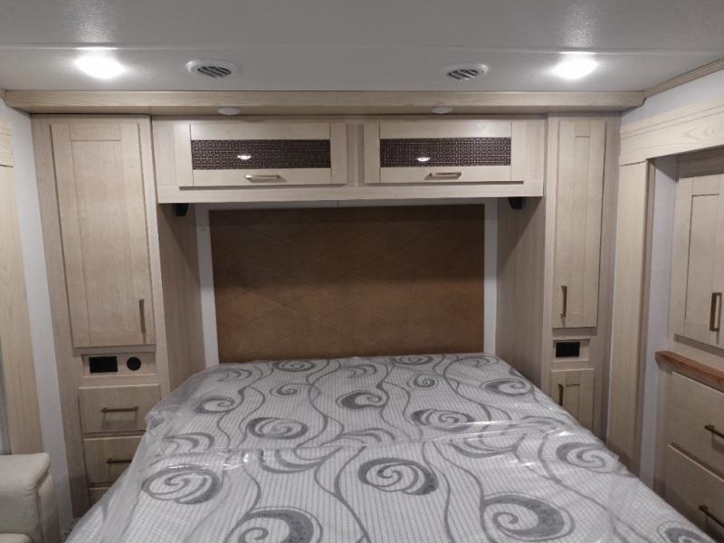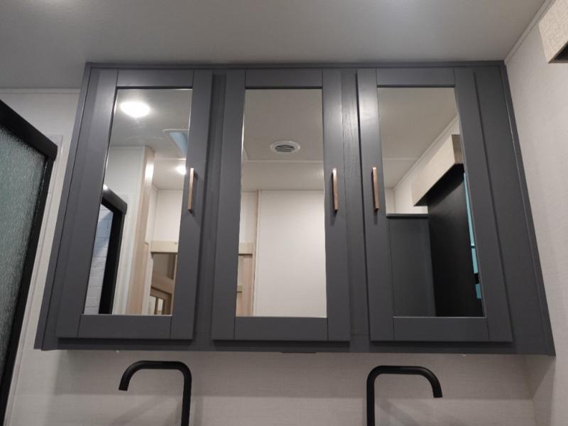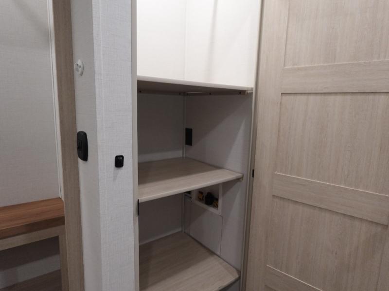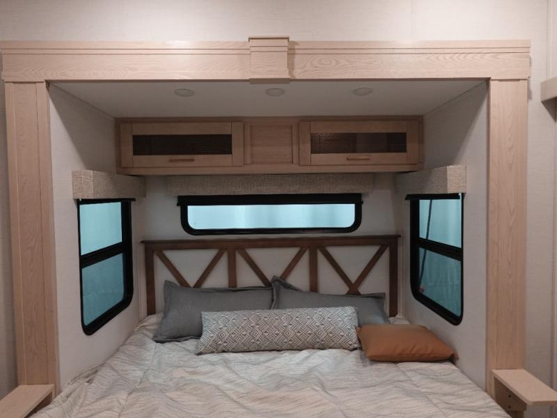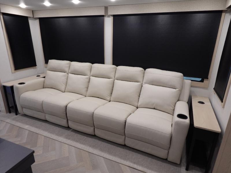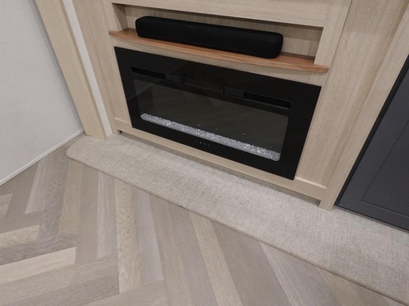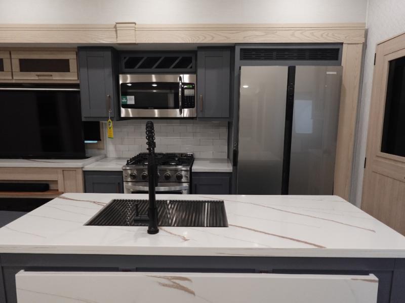 This fifth wheel is sure to wow you! You can easily invite your close neighbor friends along since there is a front den/bedroom that includes dual opposing slides, a Murphy bed/desk, a tri-fold sofa and a wardrobe, plus a full bath! You'll have the master suite towards the back all to yourselves, and here you'll find a king bed slide out, a bedroom fireplace, and a full rear bath, complete with dual bath sinks. There is even a linen closet with washer and dryer prep if you want the option to go full-time! In the morning, everyone can meet in the combined kitchen and living area as the chef whips up breakfast on the four burner cooktop. There is a gourmet island with a flip-up counter and a hidden dinette to provide everyone space to gather around. And you'll love the large sofa with pop-up chargers across from the hidden Smart TV and fireplace. Don't let this fifth wheel slip away!