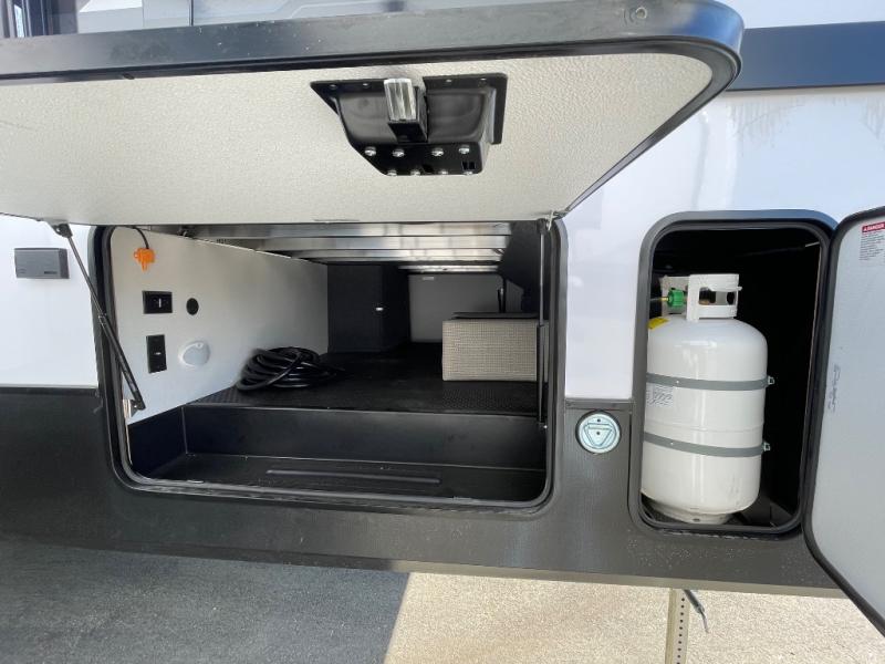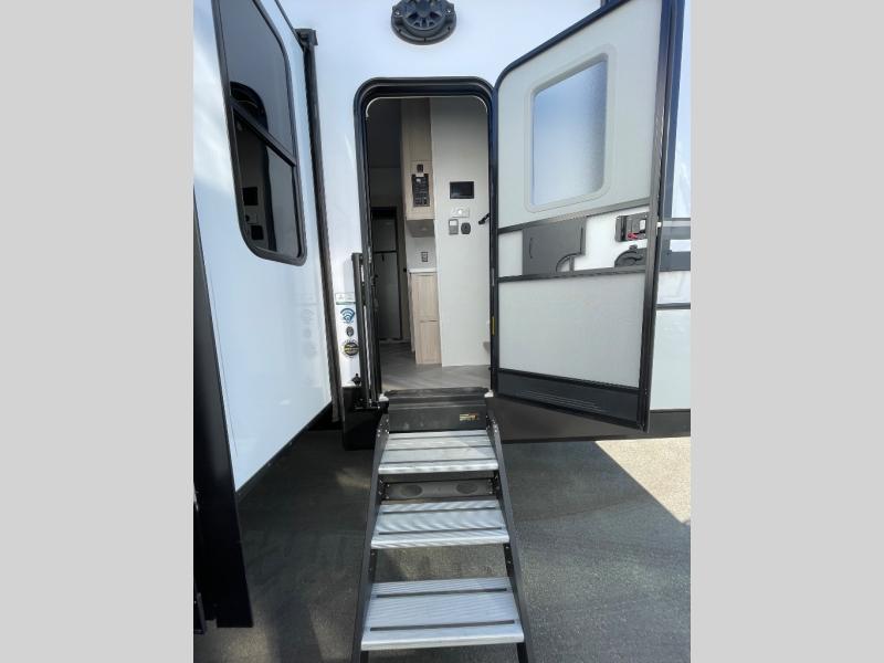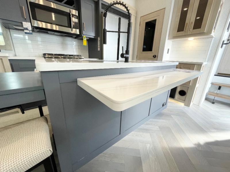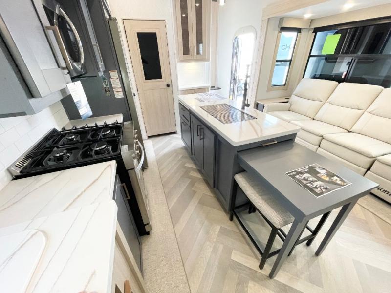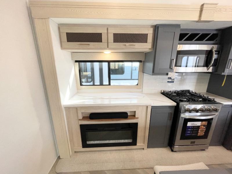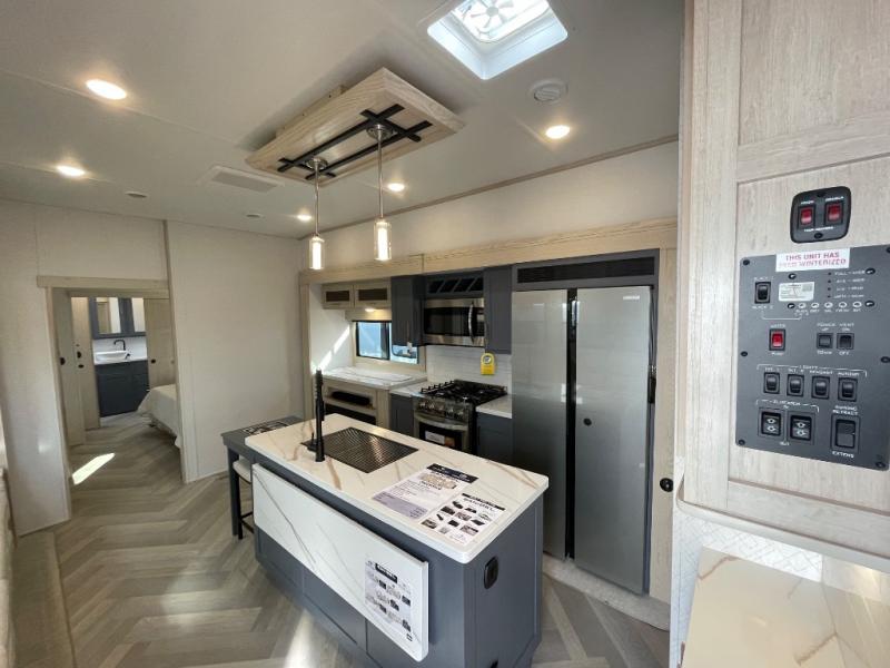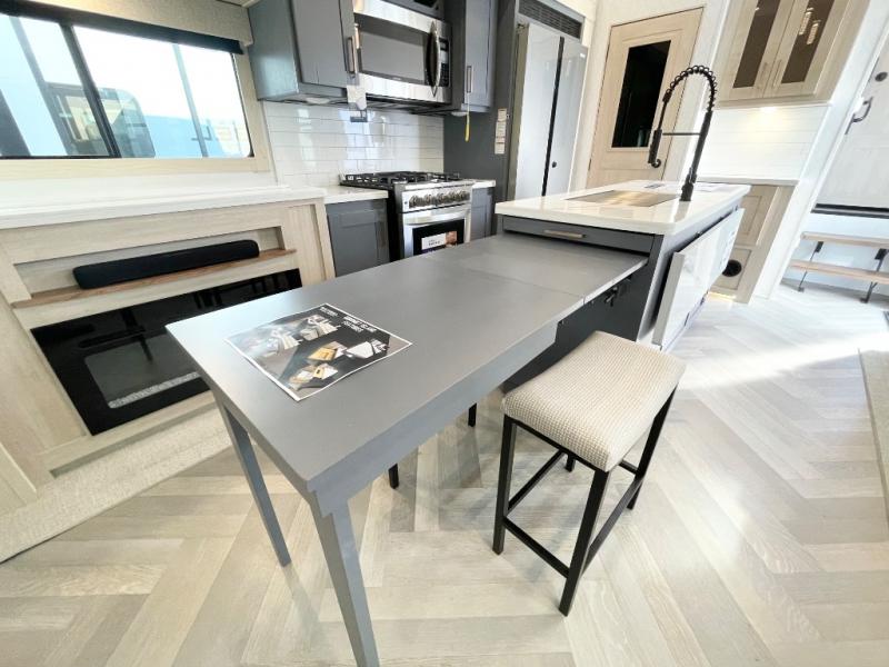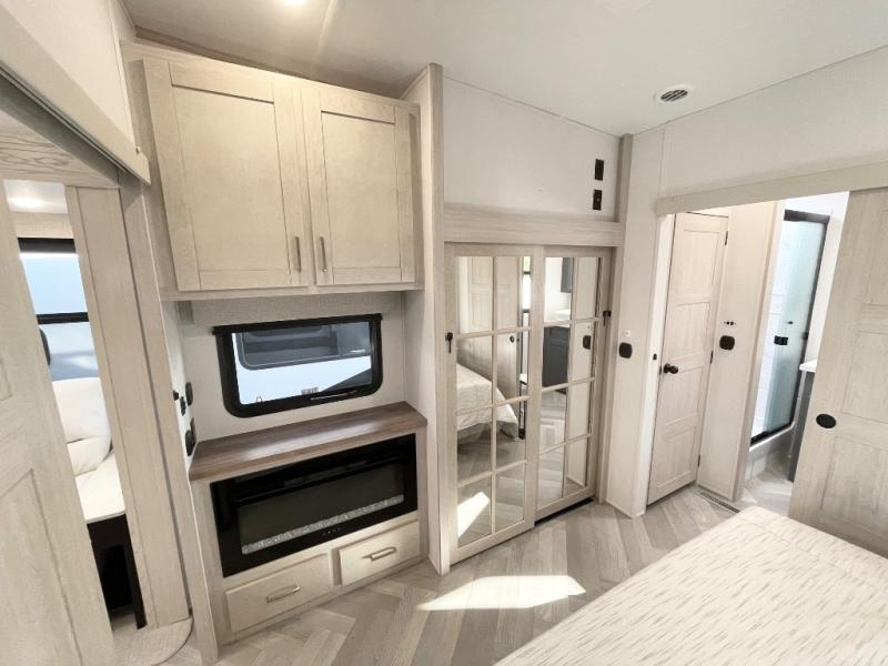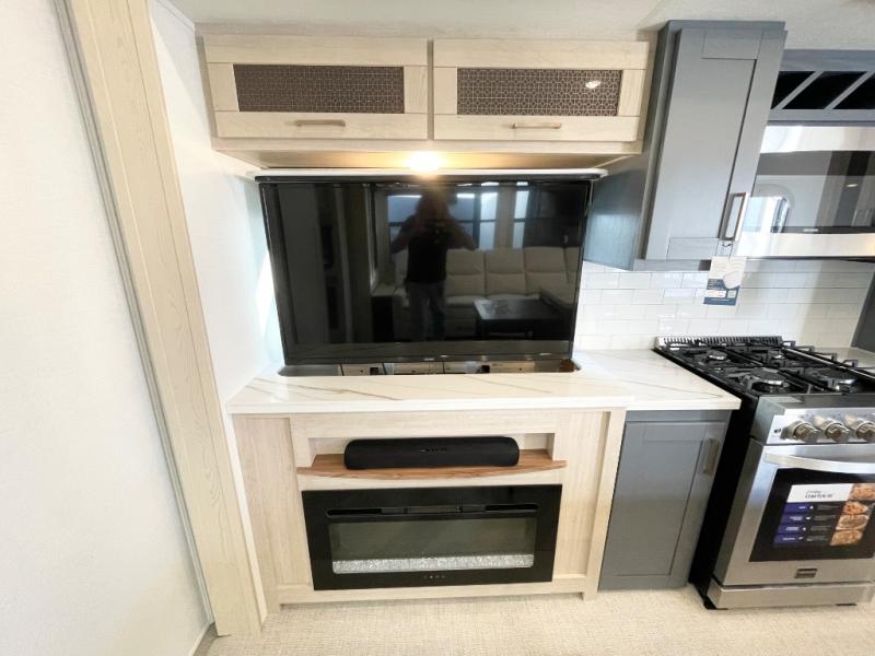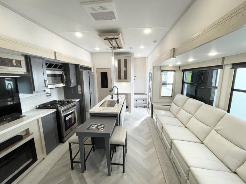 This fifth wheel is sure to wow you! You can easily invite your close neighbor friends along since there is a front den/bedroom that includes dual opposing slides, a Murphy bed/desk, a tri-fold sofa and a wardrobe, plus a full bath! You'll have the master suite towards the back all to yourselves, and here you'll find a king bed slide out, a bedroom fireplace, and a full rear bath, complete with dual bath sinks. There is even a linen closet with washer and dryer prep if you want the option to go full-time! In the morning, everyone can meet in the combined kitchen and living area as the chef whips up breakfast on the four burner cooktop. There is a gourmet island with a flip-up counter and a hidden dinette to provide everyone space to gather around. And you'll love the large sofa with pop-up chargers across from the hidden Smart TV and fireplace. Don't let this fifth wheel slip away!