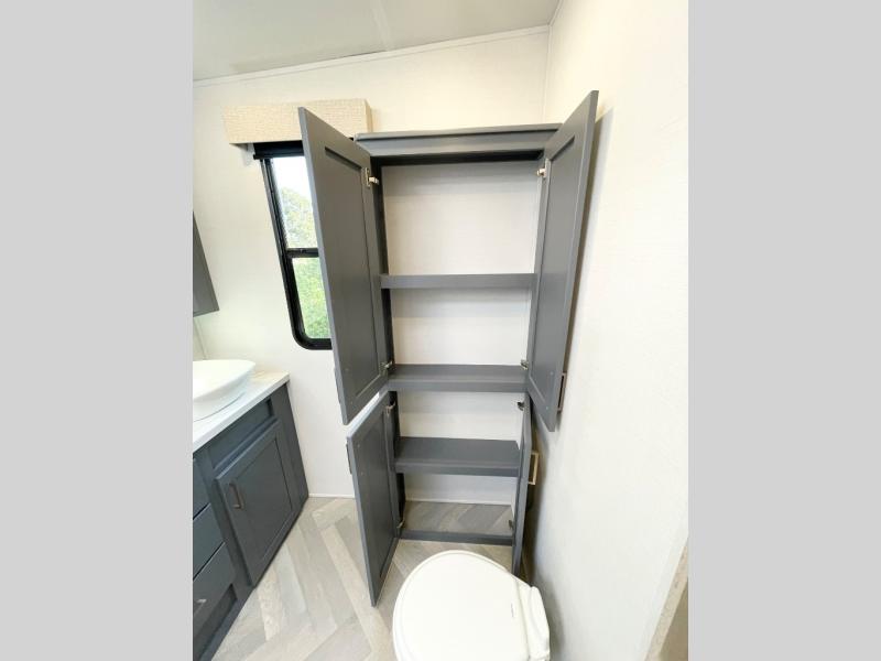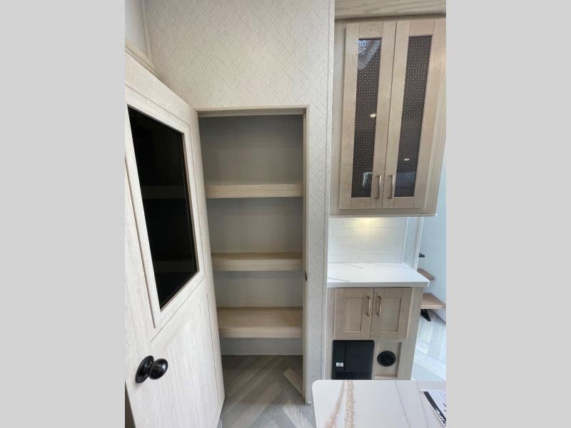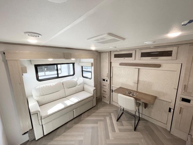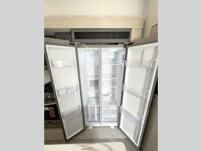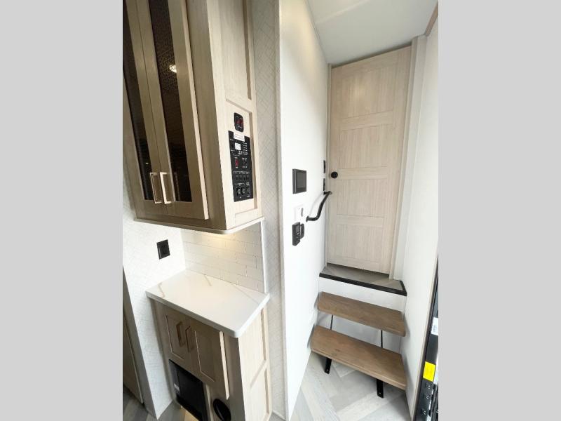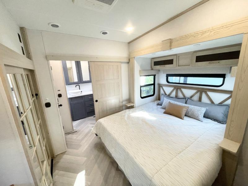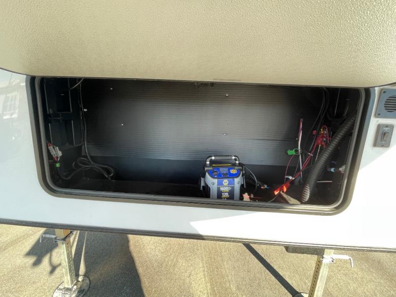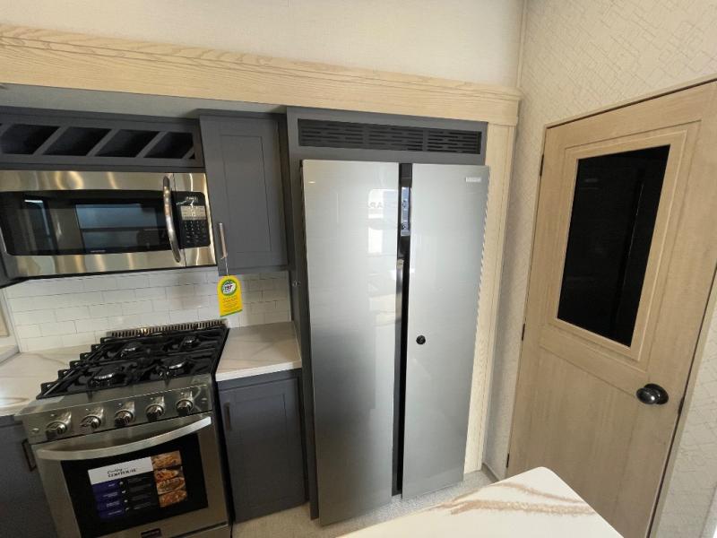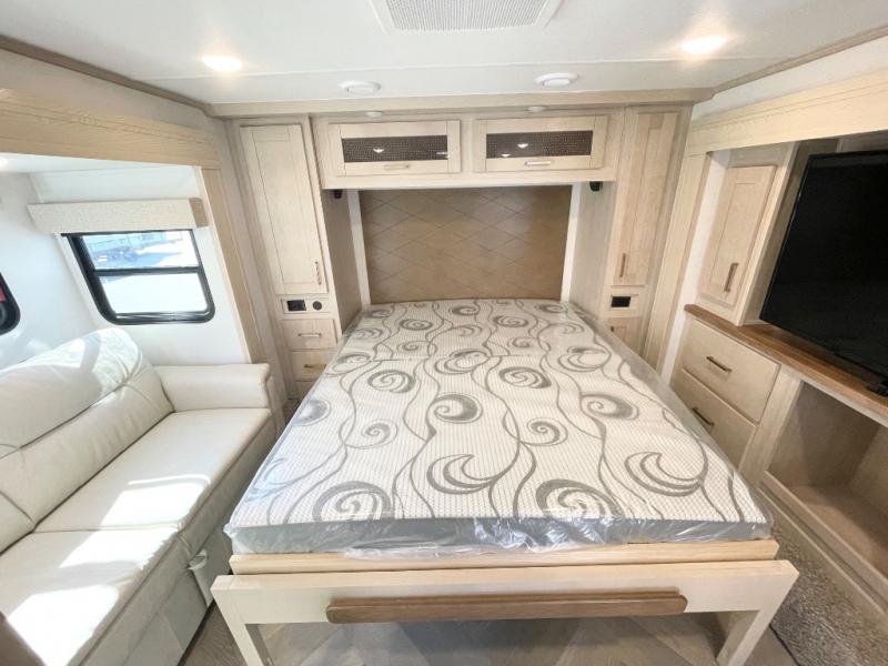 This fifth wheel is sure to wow you! You can easily invite your close neighbor friends along since there is a front den/bedroom that includes dual opposing slides, a Murphy bed/desk, a tri-fold sofa and a wardrobe, plus a full bath! You'll have the master suite towards the back all to yourselves, and here you'll find a king bed slide out, a bedroom fireplace, and a full rear bath, complete with dual bath sinks. There is even a linen closet with washer and dryer prep if you want the option to go full-time! In the morning, everyone can meet in the combined kitchen and living area as the chef whips up breakfast on the four burner cooktop. There is a gourmet island with a flip-up counter and a hidden dinette to provide everyone space to gather around. And you'll love the large sofa with pop-up chargers across from the hidden Smart TV and fireplace. Don't let this fifth wheel slip away!