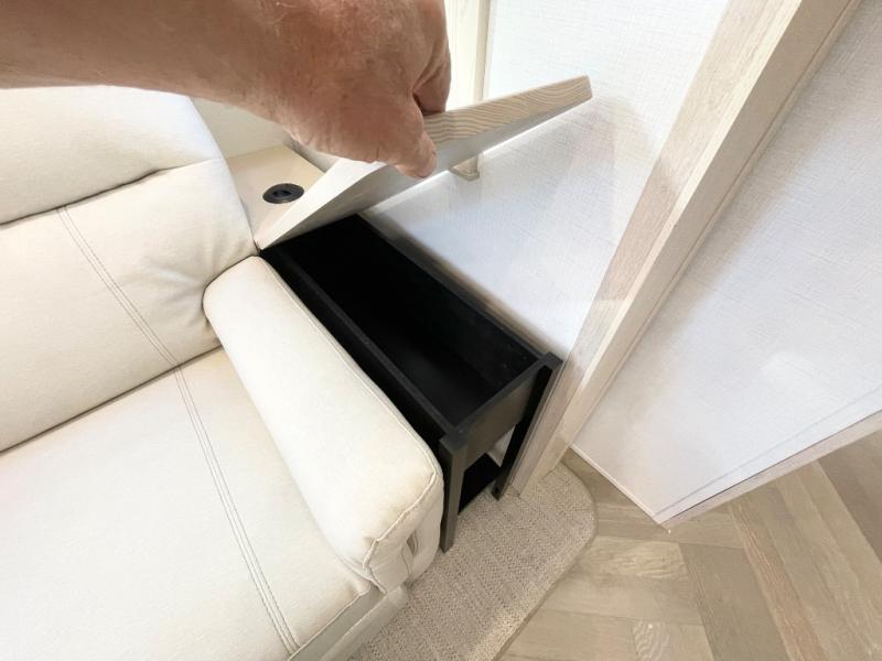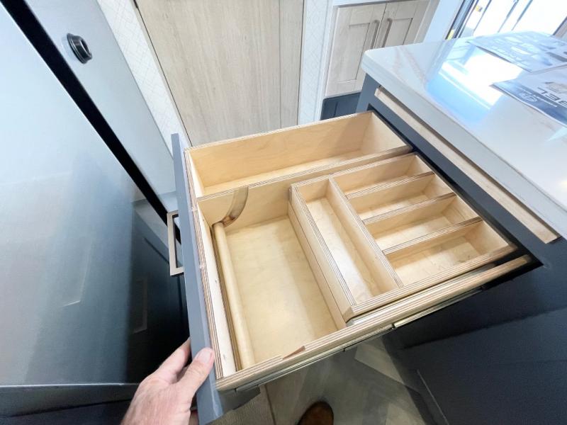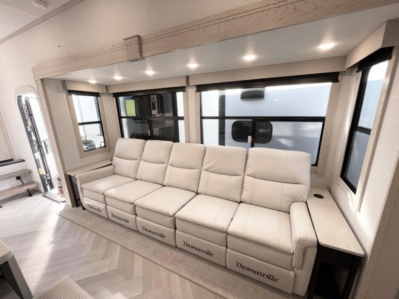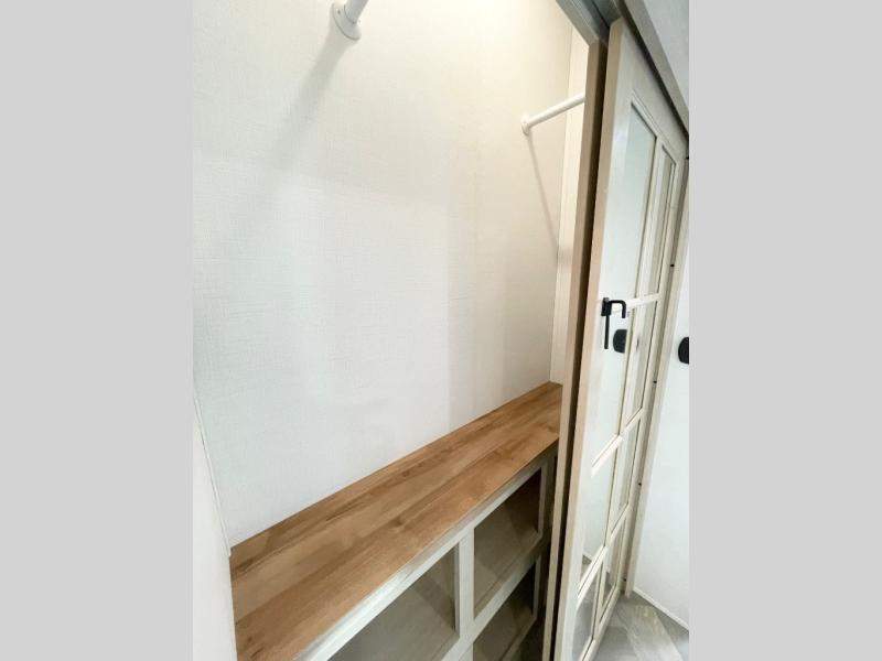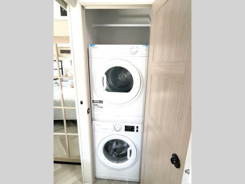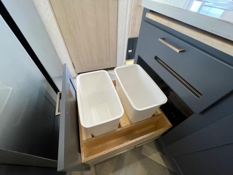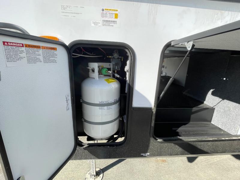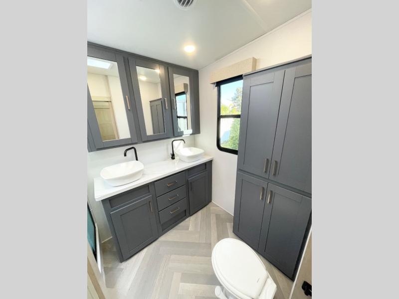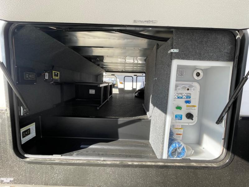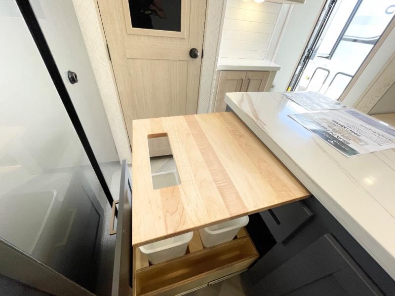 This fifth wheel is sure to wow you! You can easily invite your close neighbor friends along since there is a front den/bedroom that includes dual opposing slides, a Murphy bed/desk, a tri-fold sofa and a wardrobe, plus a full bath! You'll have the master suite towards the back all to yourselves, and here you'll find a king bed slide out, a bedroom fireplace, and a full rear bath, complete with dual bath sinks. There is even a linen closet with washer and dryer prep if you want the option to go full-time! In the morning, everyone can meet in the combined kitchen and living area as the chef whips up breakfast on the four burner cooktop. There is a gourmet island with a flip-up counter and a hidden dinette to provide everyone space to gather around. And you'll love the large sofa with pop-up chargers across from the hidden Smart TV and fireplace. Don't let this fifth wheel slip away!