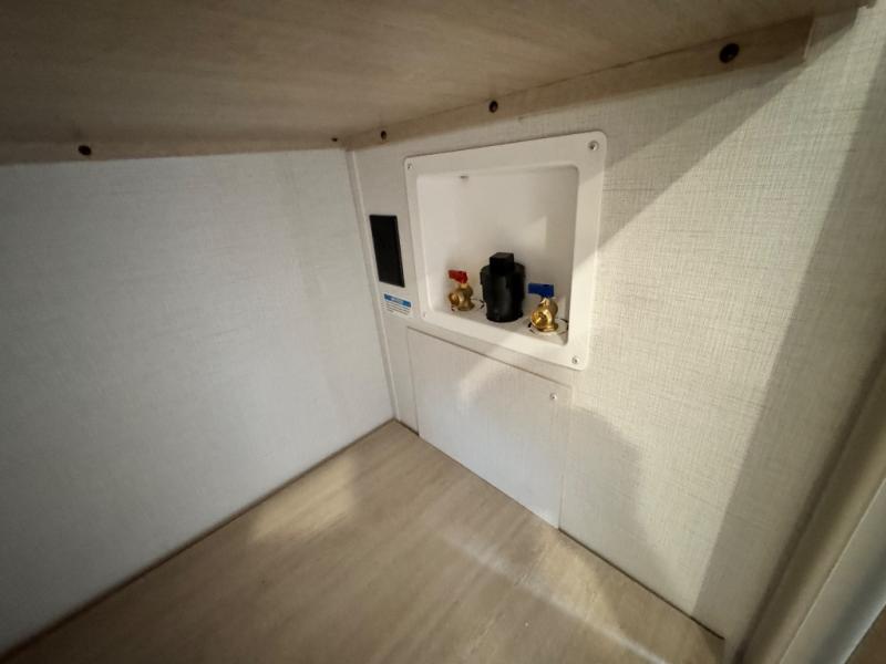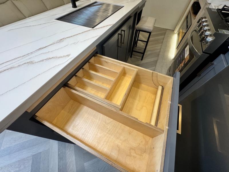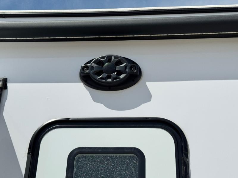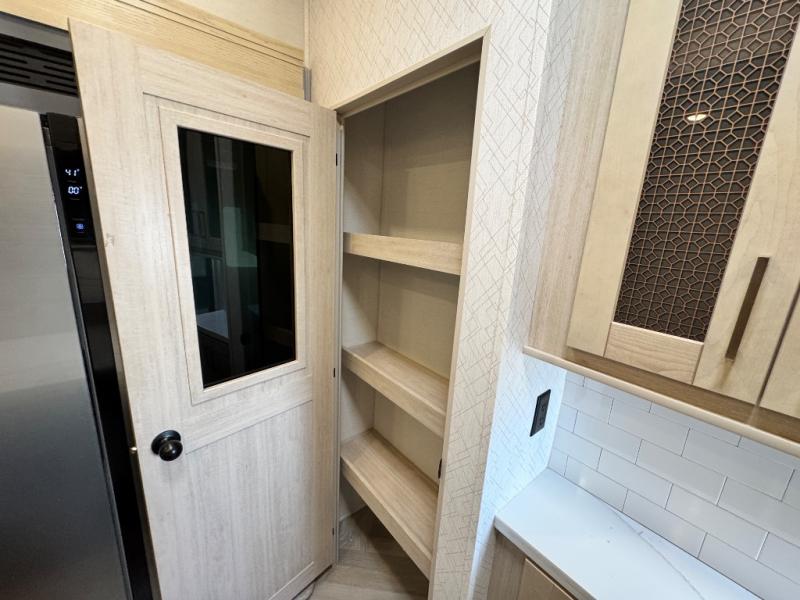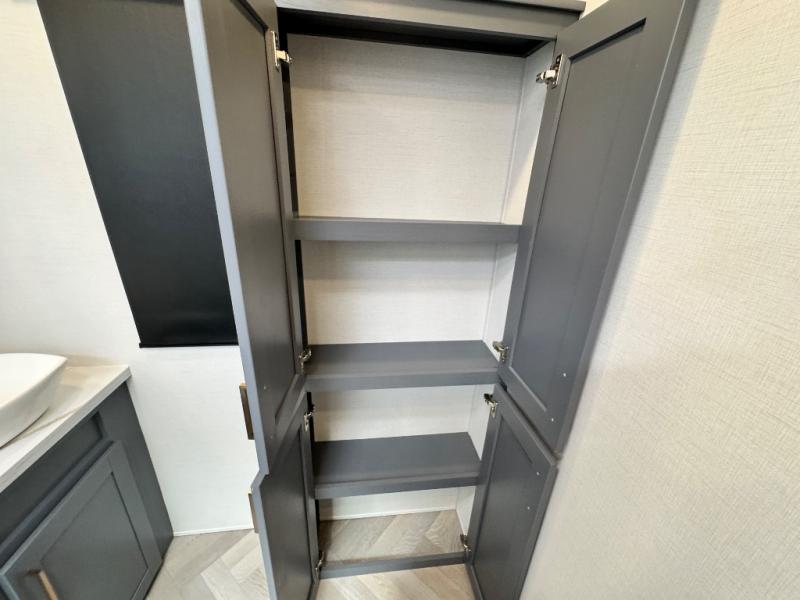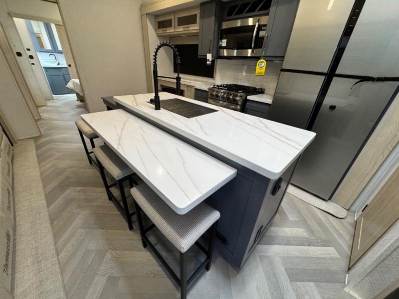 This fifth wheel is sure to wow you! You can easily invite your close neighbor friends along since there is a front den/bedroom that includes dual opposing slides, a Murphy bed/desk, a tri-fold sofa and a wardrobe, plus a full bath! You'll have the master suite towards the back all to yourselves, and here you'll find a king bed slide out, a bedroom fireplace, and a full rear bath, complete with dual bath sinks. There is even a linen closet with washer and dryer prep if you want the option to go full-time! In the morning, everyone can meet in the combined kitchen and living area as the chef whips up breakfast on the four burner cooktop. There is a gourmet island with a flip-up counter and a hidden dinette to provide everyone space to gather around. And you'll love the large sofa with pop-up chargers across from the hidden Smart TV and fireplace. Don't let this fifth wheel slip away!