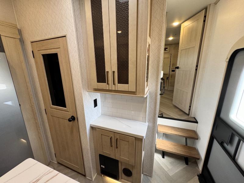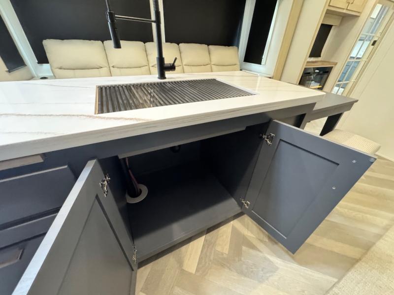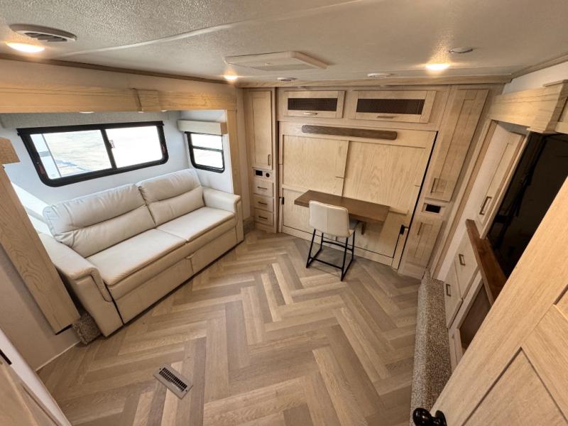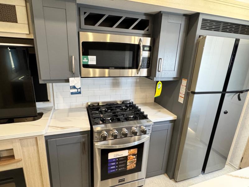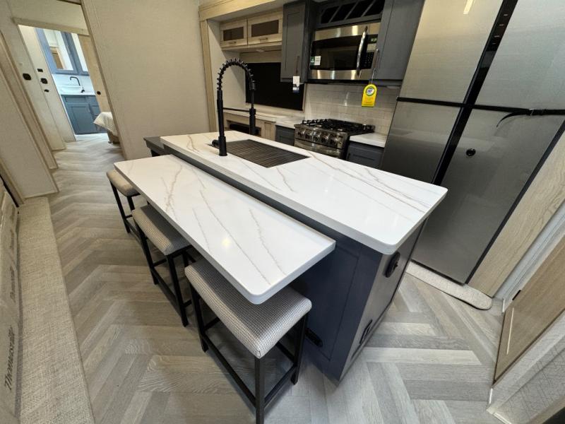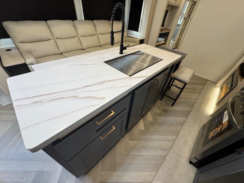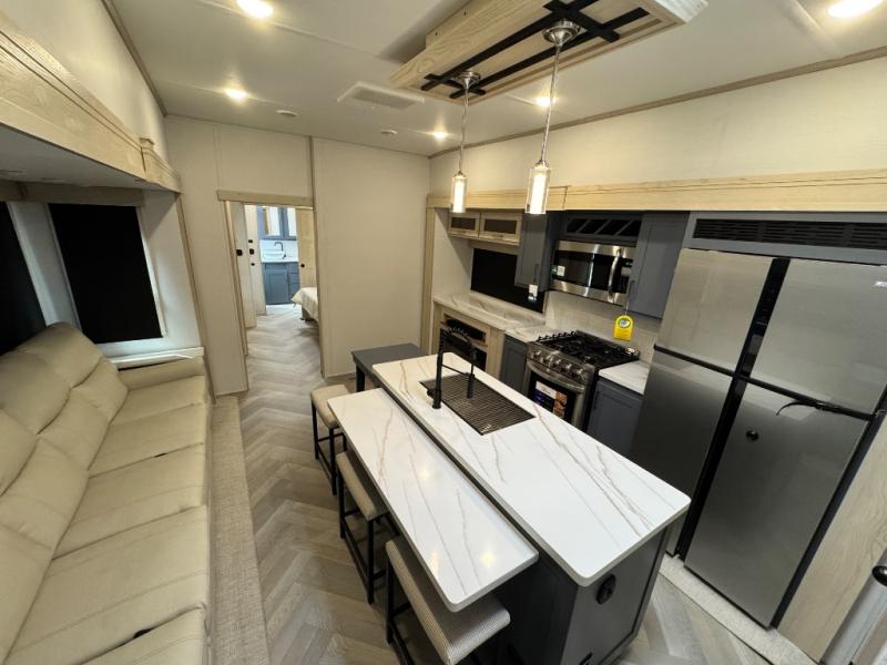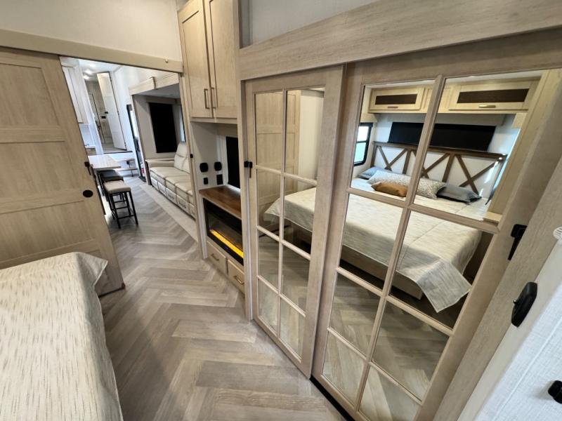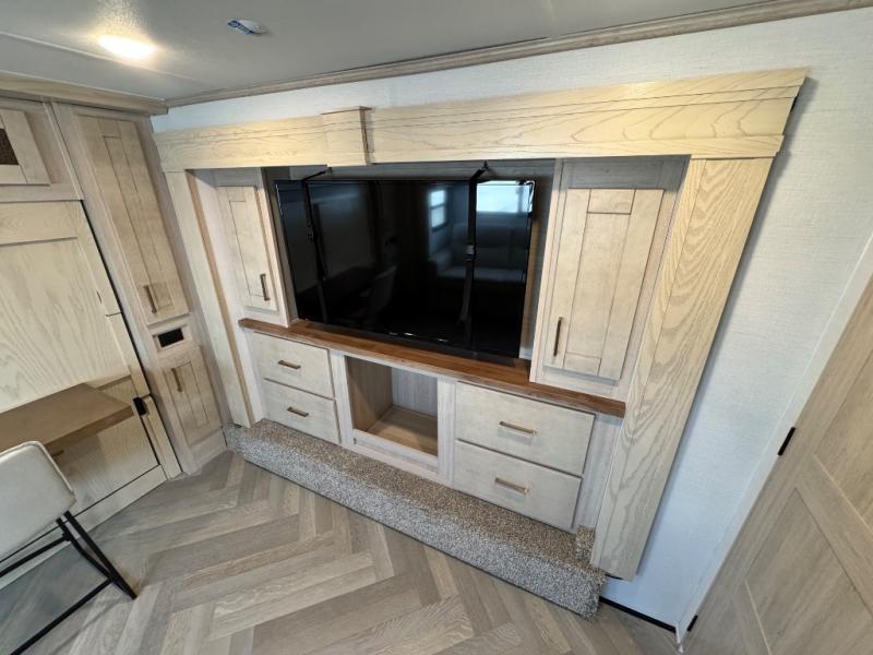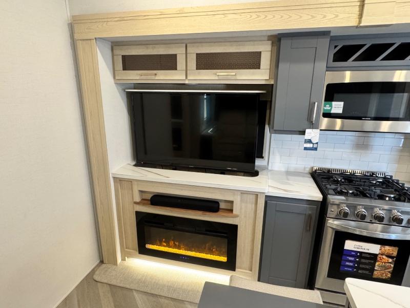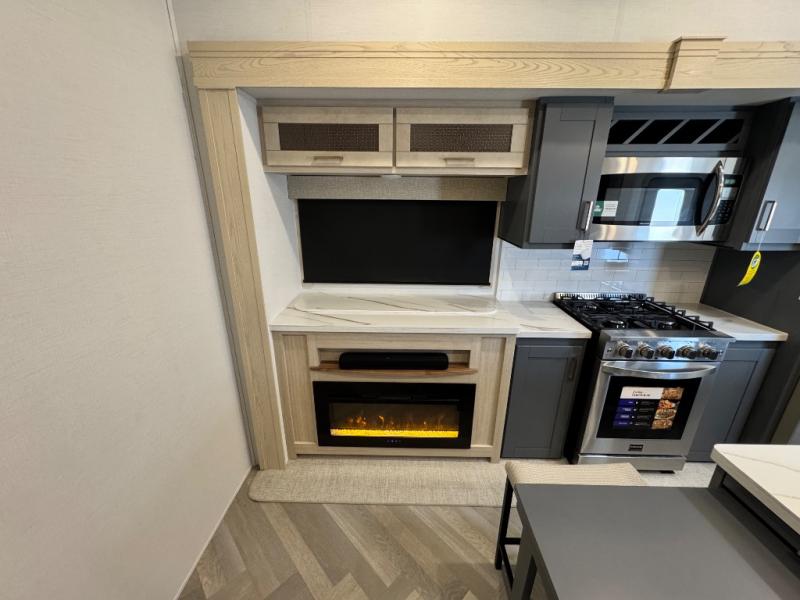 This fifth wheel is sure to wow you! You can easily invite your close neighbor friends along since there is a front den/bedroom that includes dual opposing slides, a Murphy bed/desk, a tri-fold sofa and a wardrobe, plus a full bath! You'll have the master suite towards the back all to yourselves, and here you'll find a king bed slide out, a bedroom fireplace, and a full rear bath, complete with dual bath sinks. There is even a linen closet with washer and dryer prep if you want the option to go full-time! In the morning, everyone can meet in the combined kitchen and living area as the chef whips up breakfast on the four burner cooktop. There is a gourmet island with a flip-up counter and a hidden dinette to provide everyone space to gather around. And you'll love the large sofa with pop-up chargers across from the hidden Smart TV and fireplace. Don't let this fifth wheel slip away!